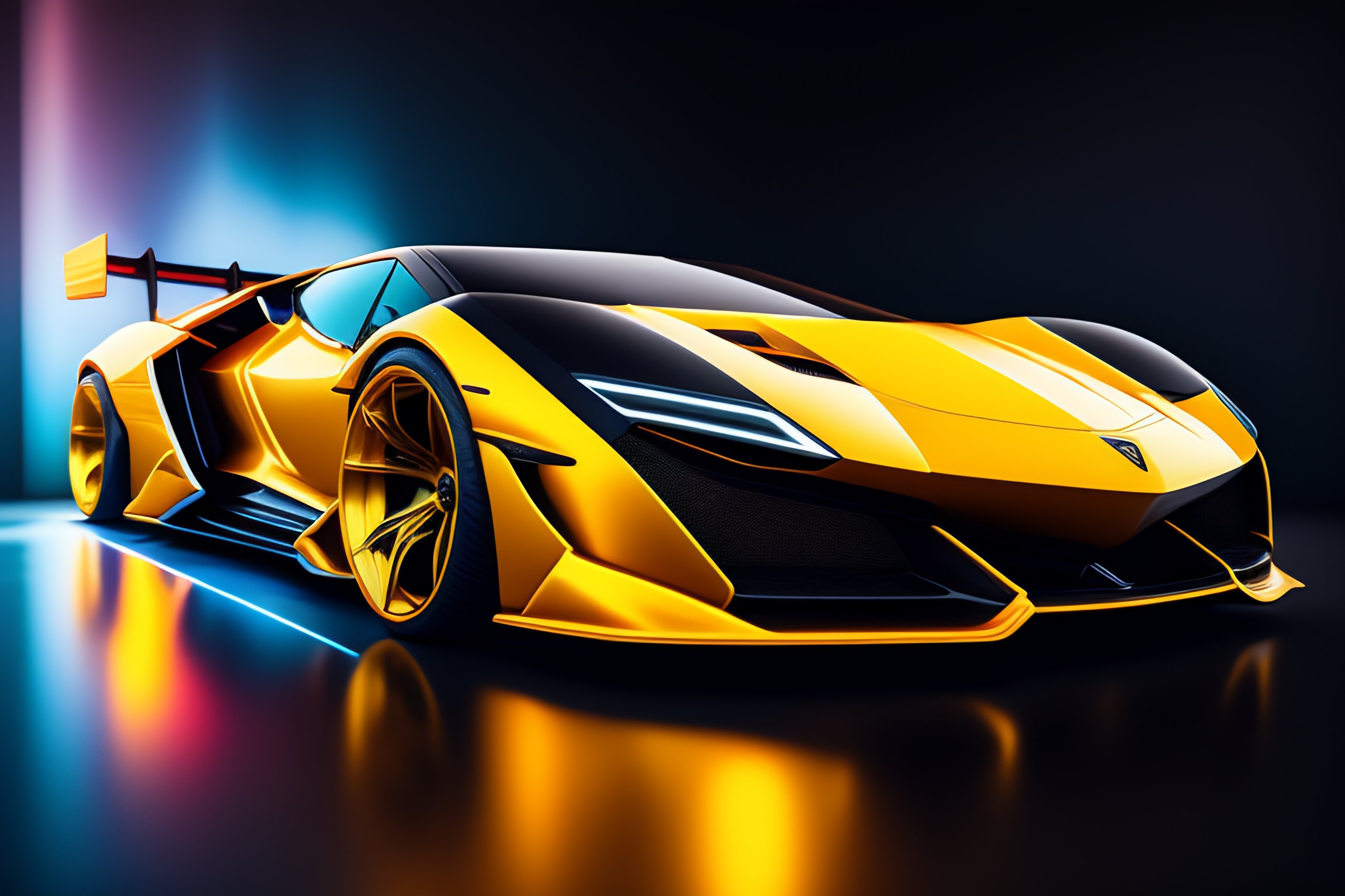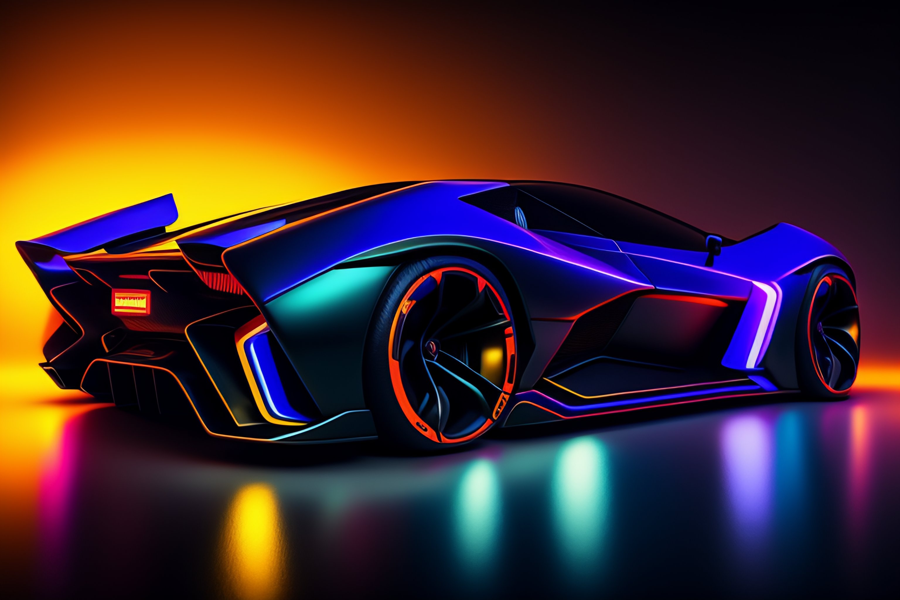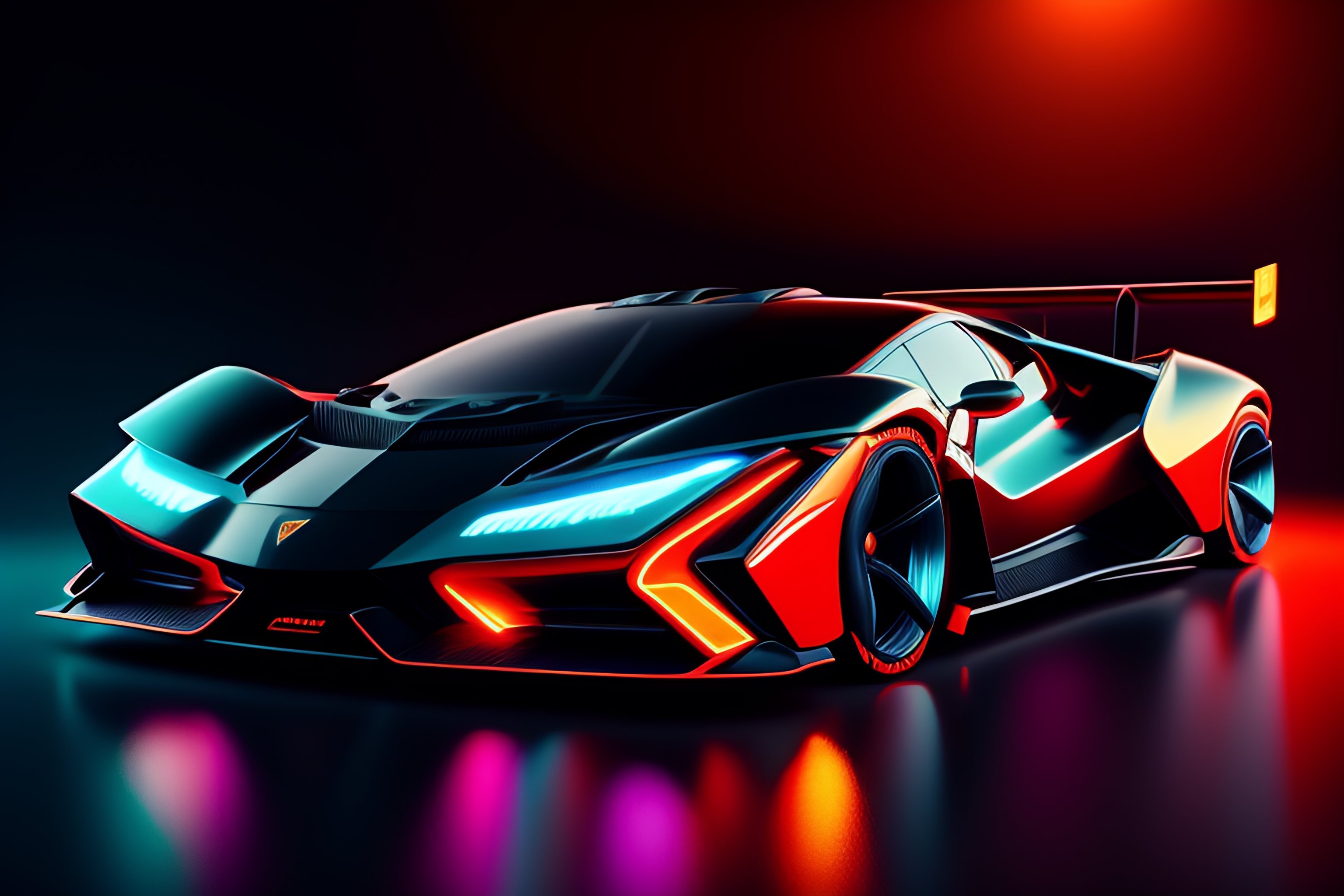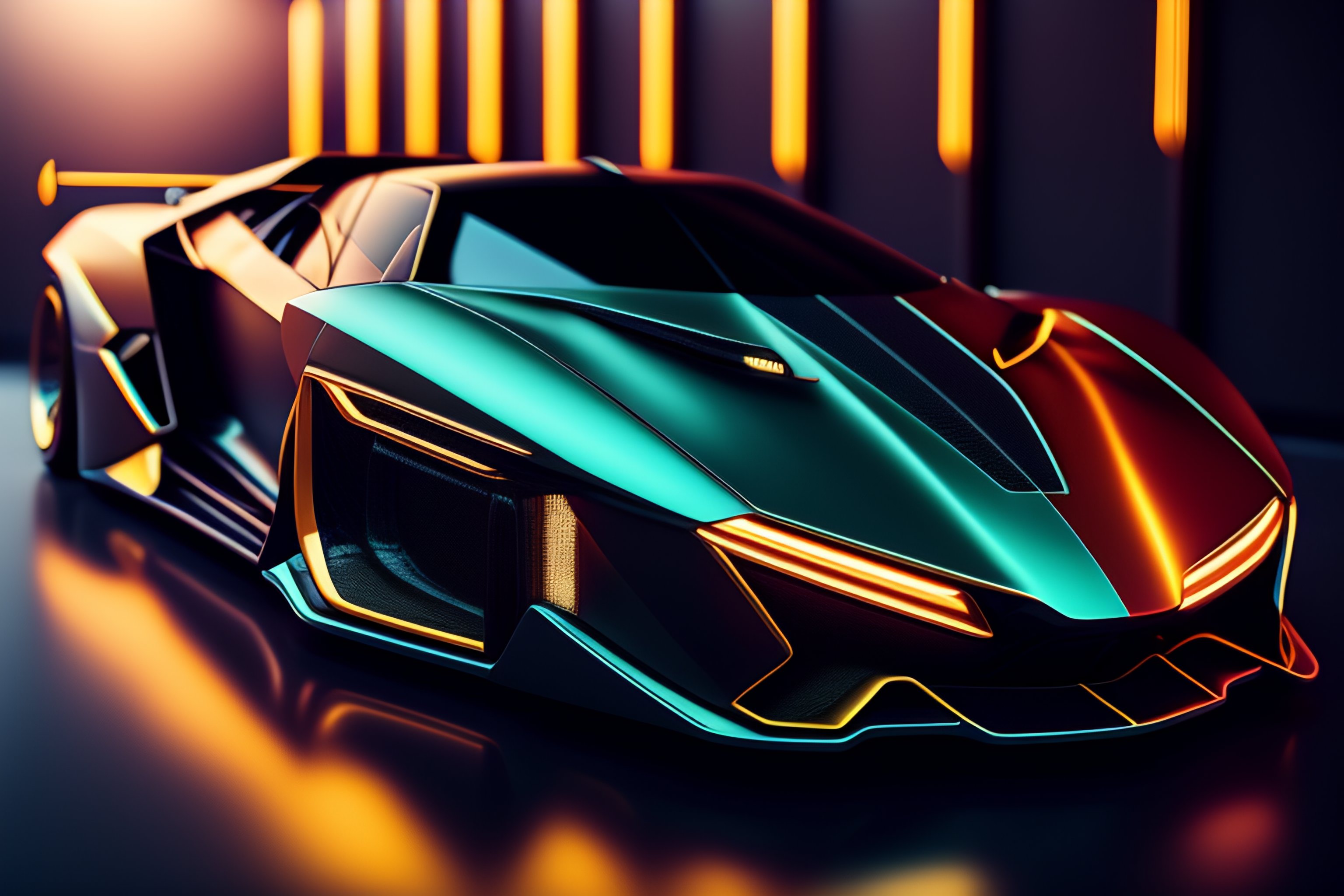 Closeup!! isometric macro photo of concept lamborghini futuristic super car on a reflective black floor, synthwave, tron, hyper detailed, smooth, high contrast, volumetric lighting, golden ratio, octane, jim lee, giorgetto giugiaro, craig mullins, ian callum!, vibrant rich deep color