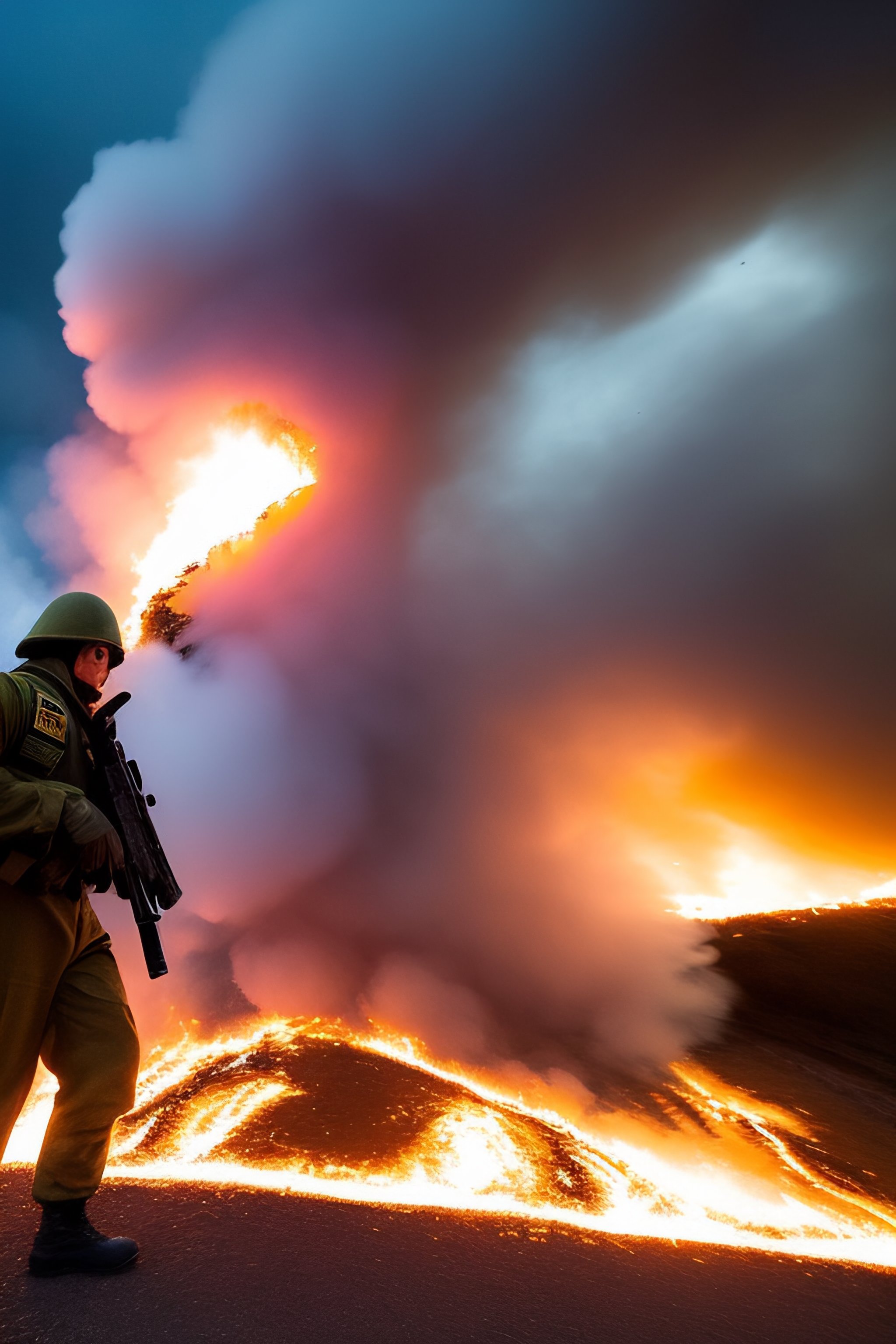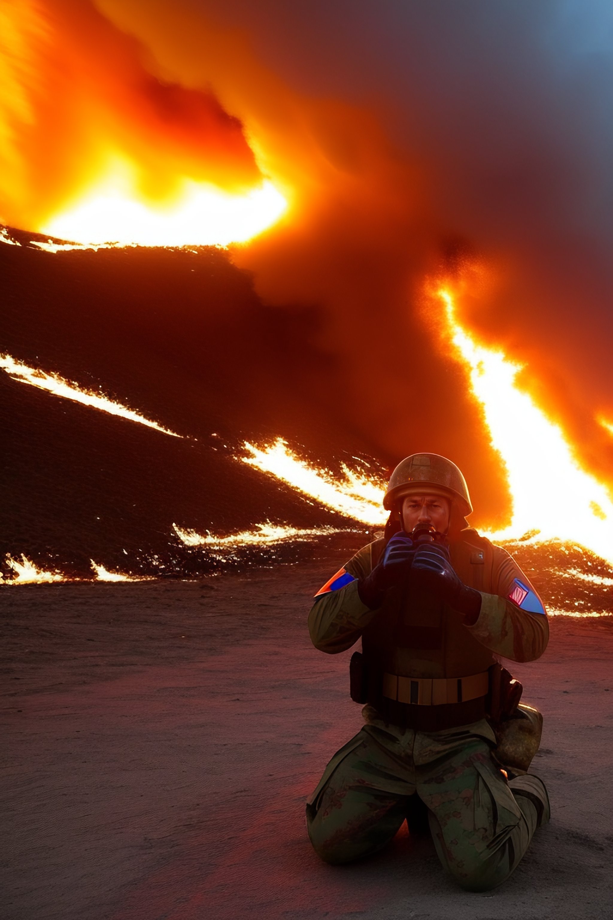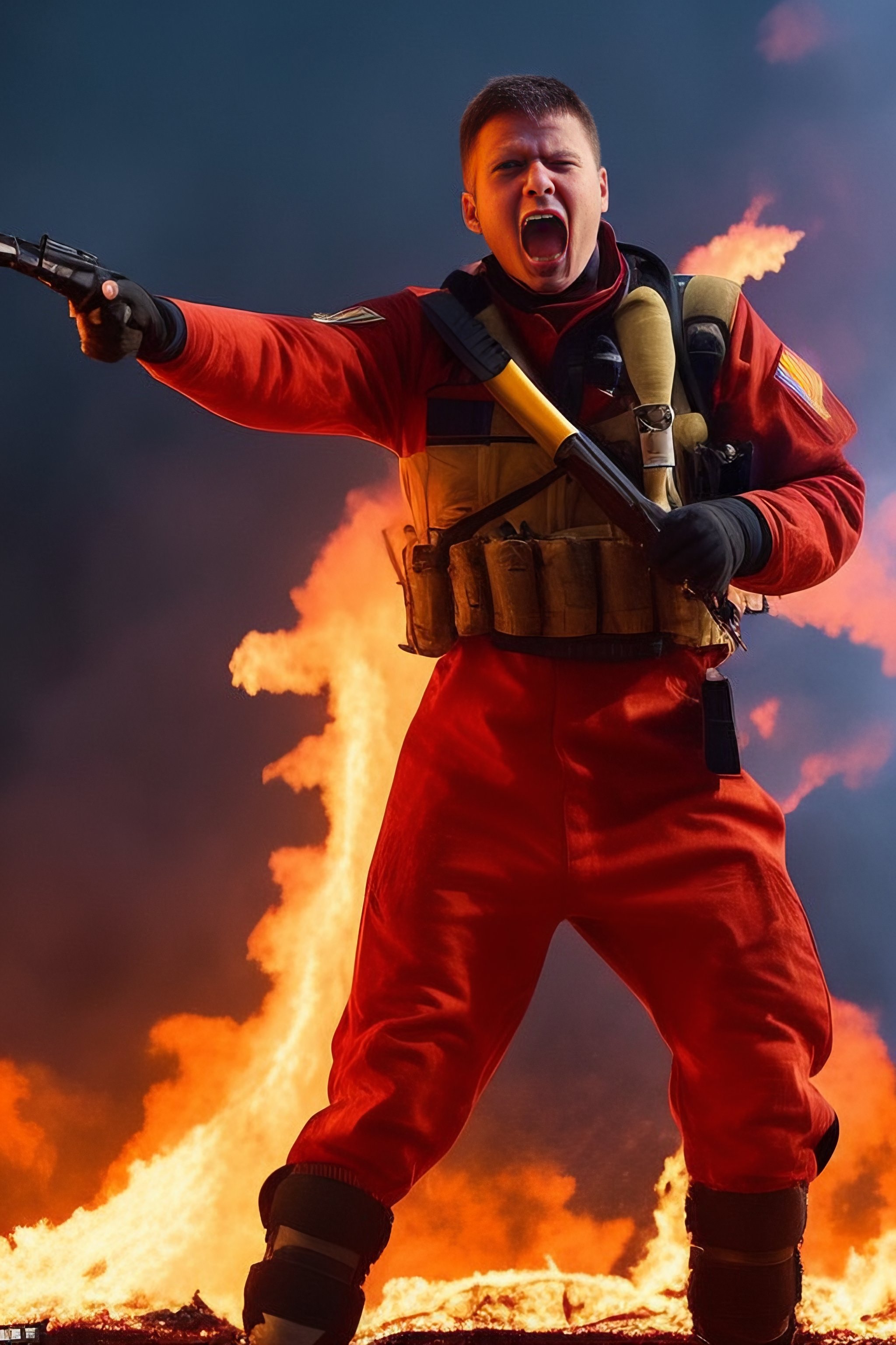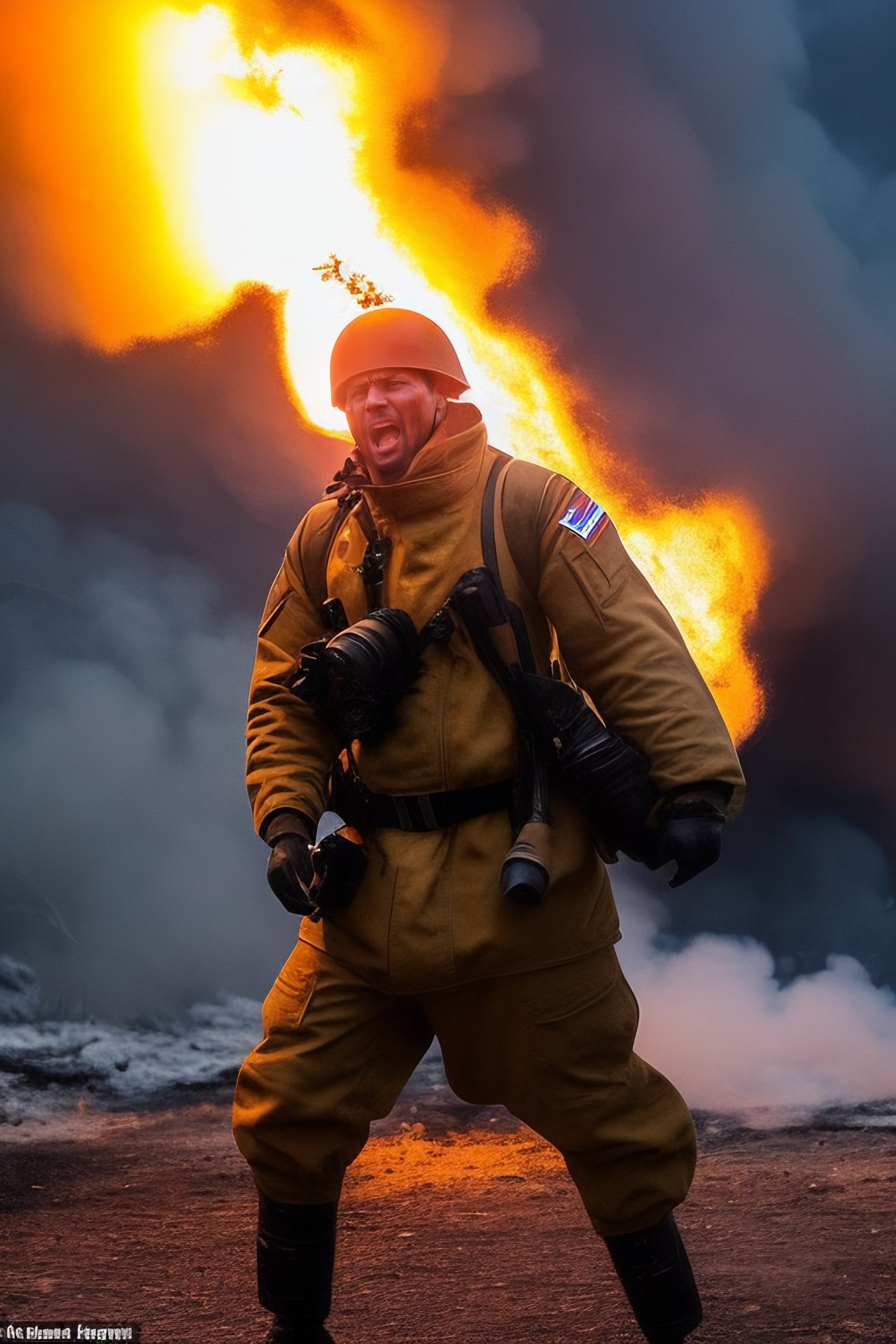 Amputee russian soldier screaming and fully covered in fire, high resolsution, hyper realistic, battlefield scene, loner, one leg