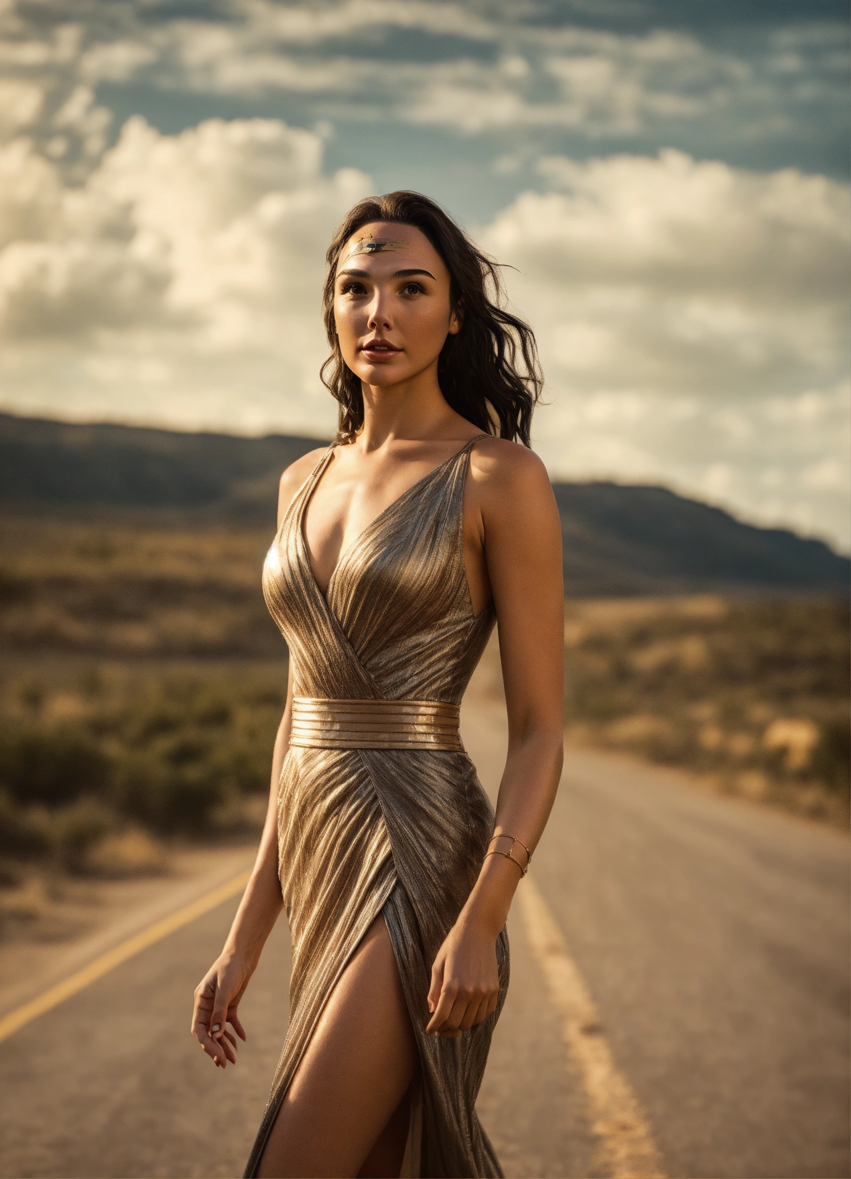A beautiful gal gadot lookalike in a double slit dress walking on the open road, with no item on her forehead