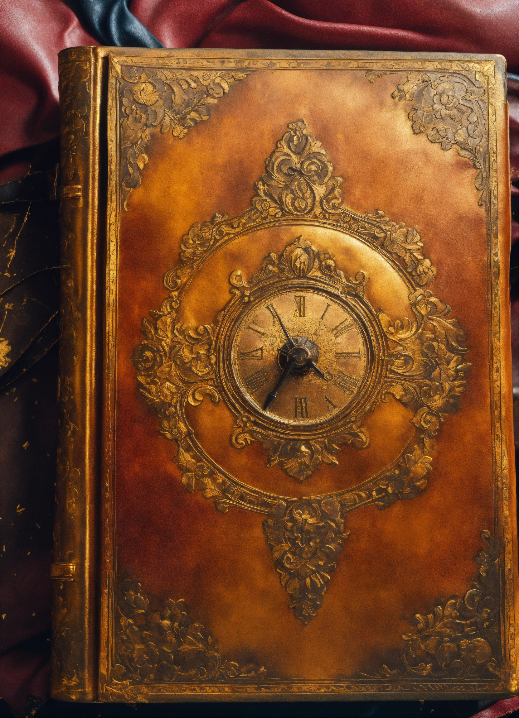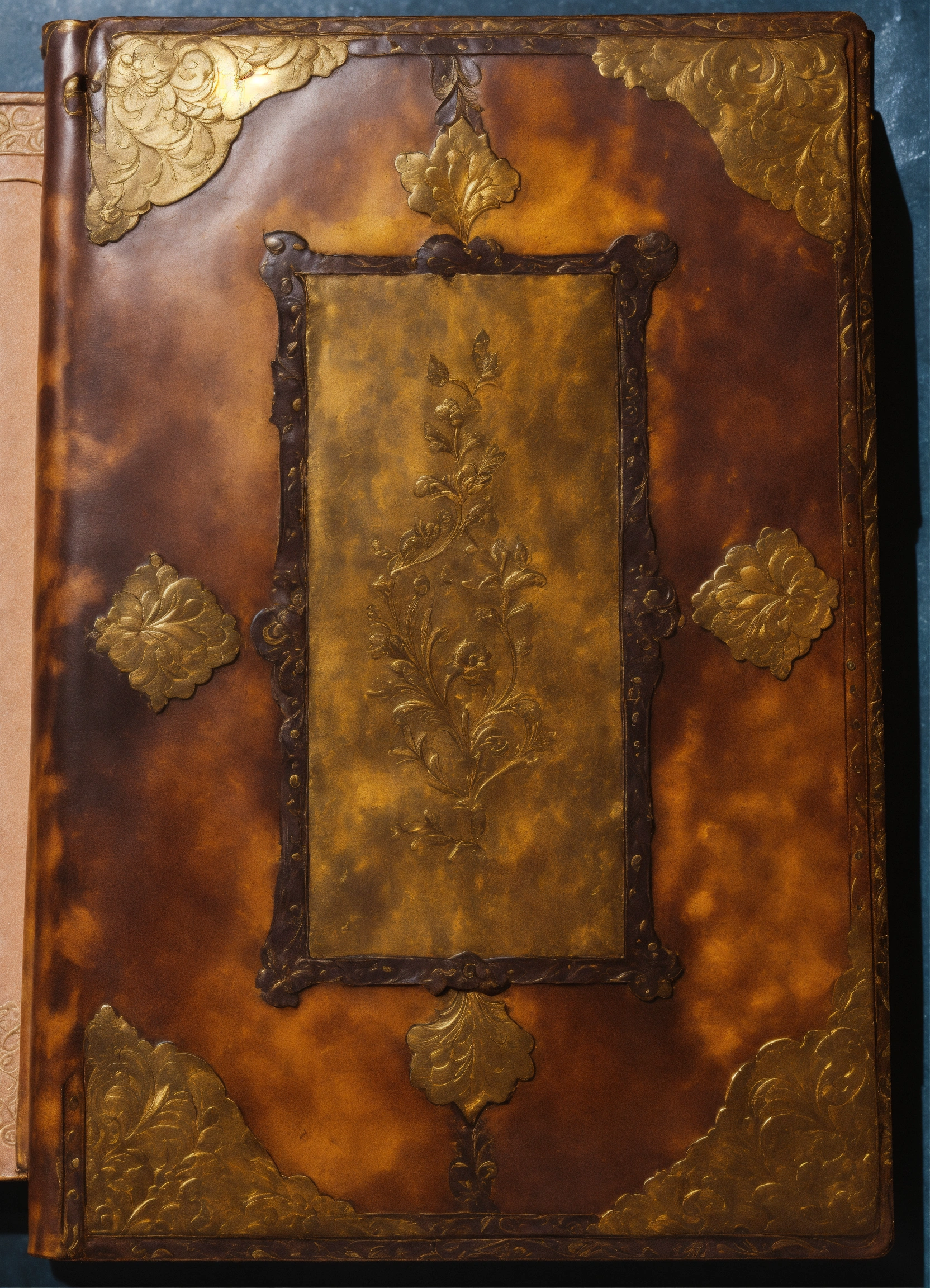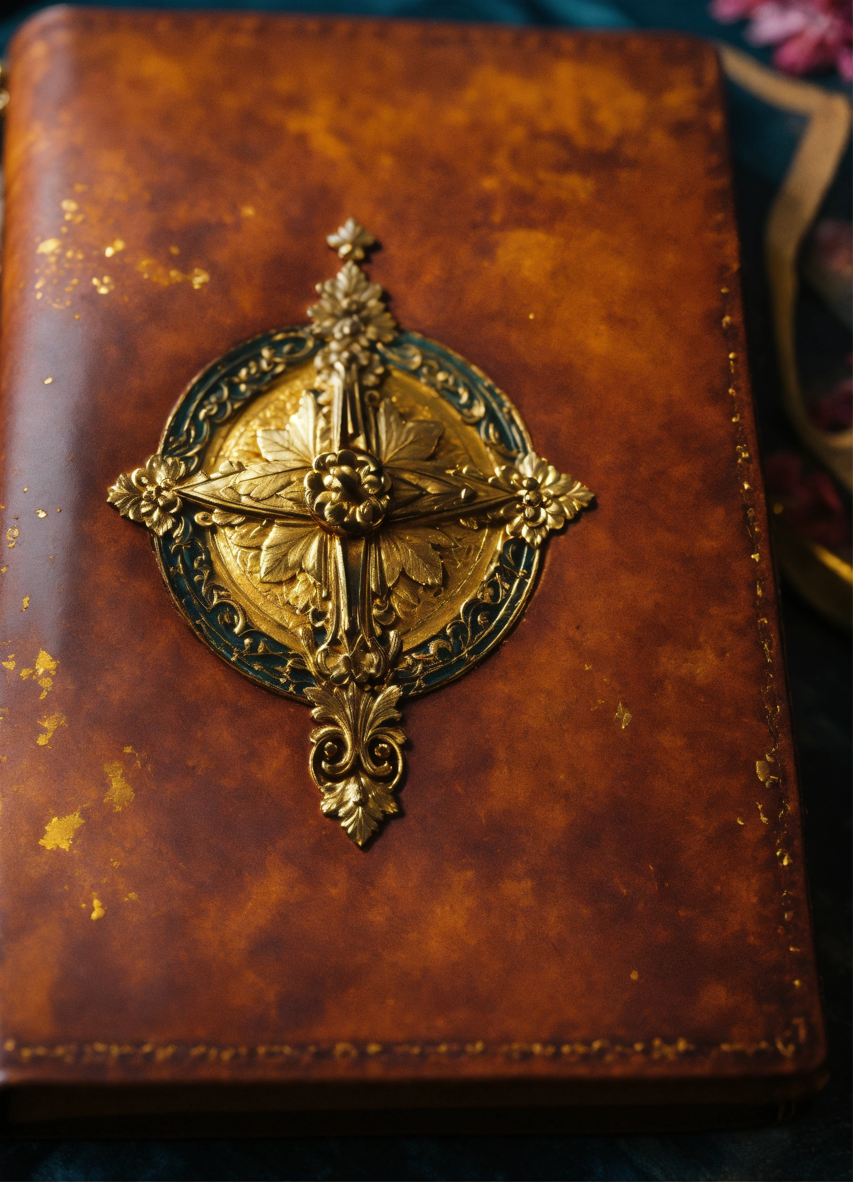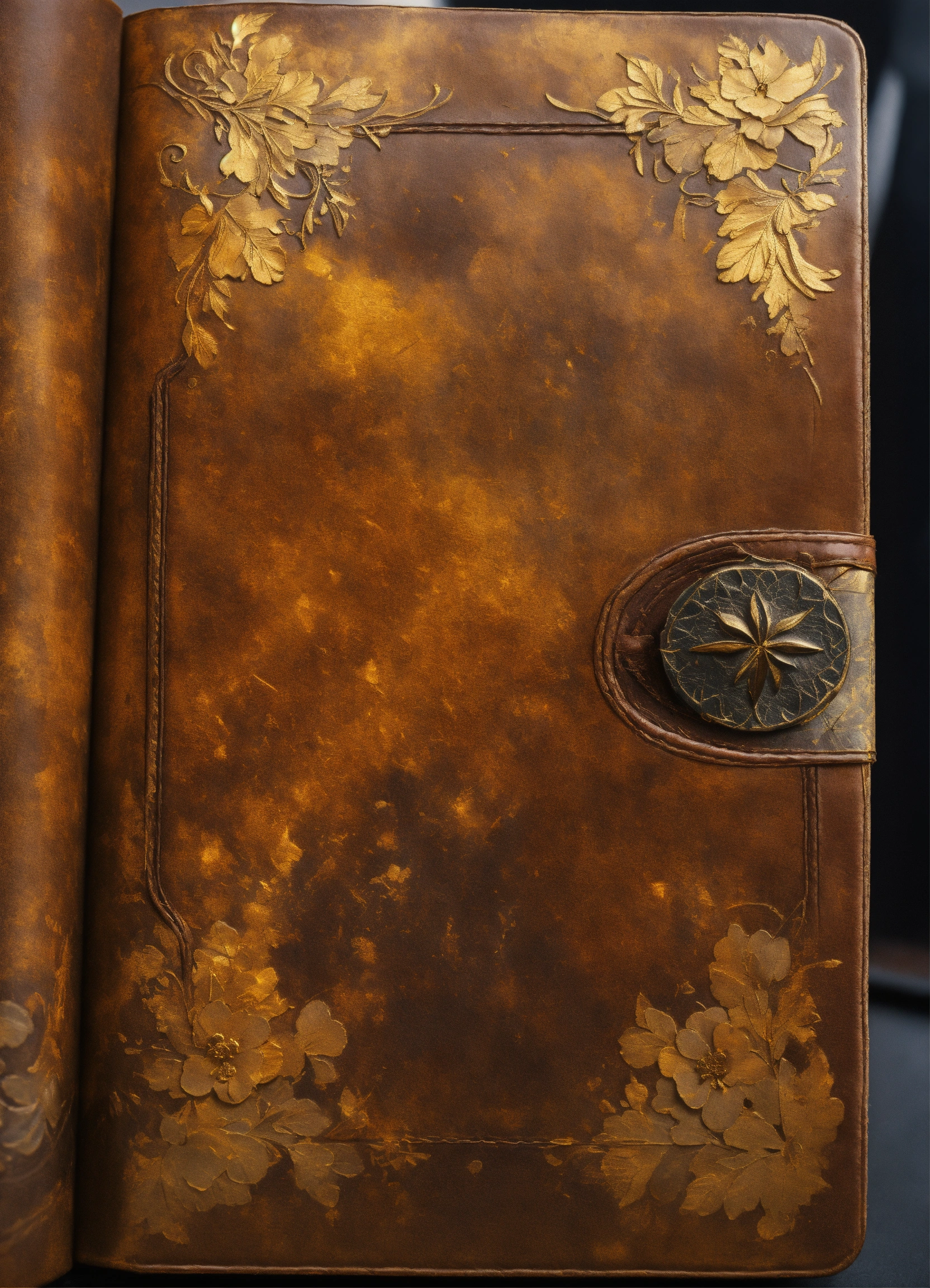 A close-up of the diary's cover, highlighting the aged leather, faded gold leaf accents, and the hint of secrets hidden within. stunning 8k matte oil painting
