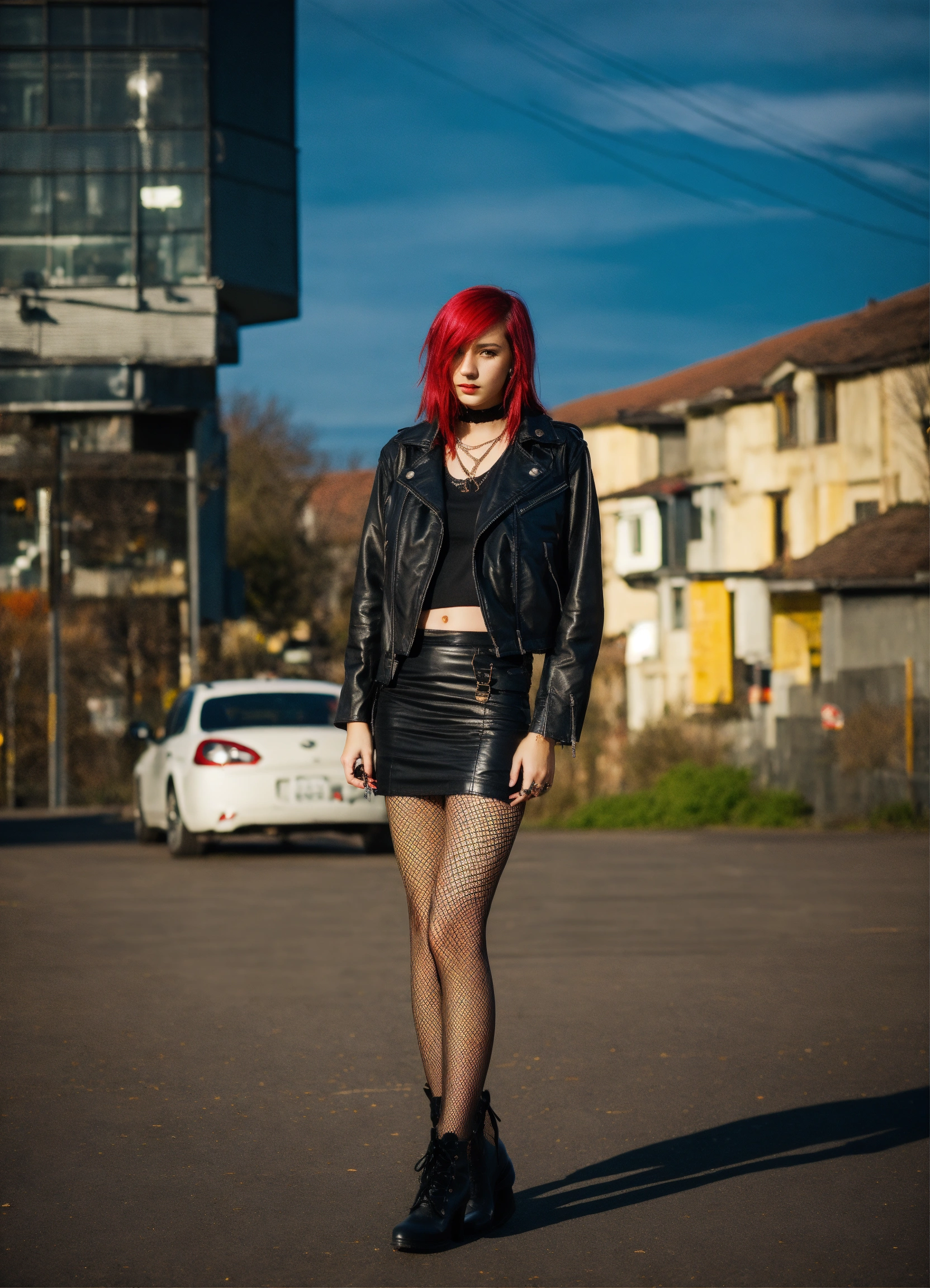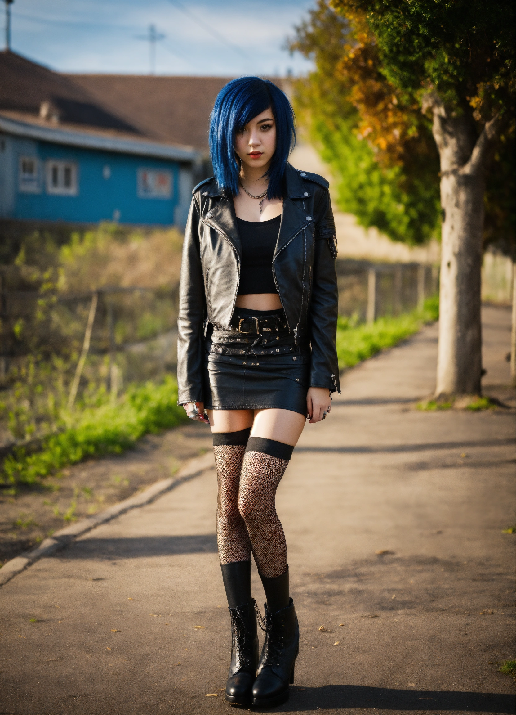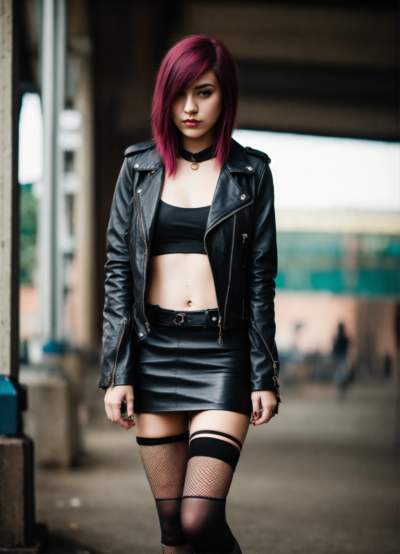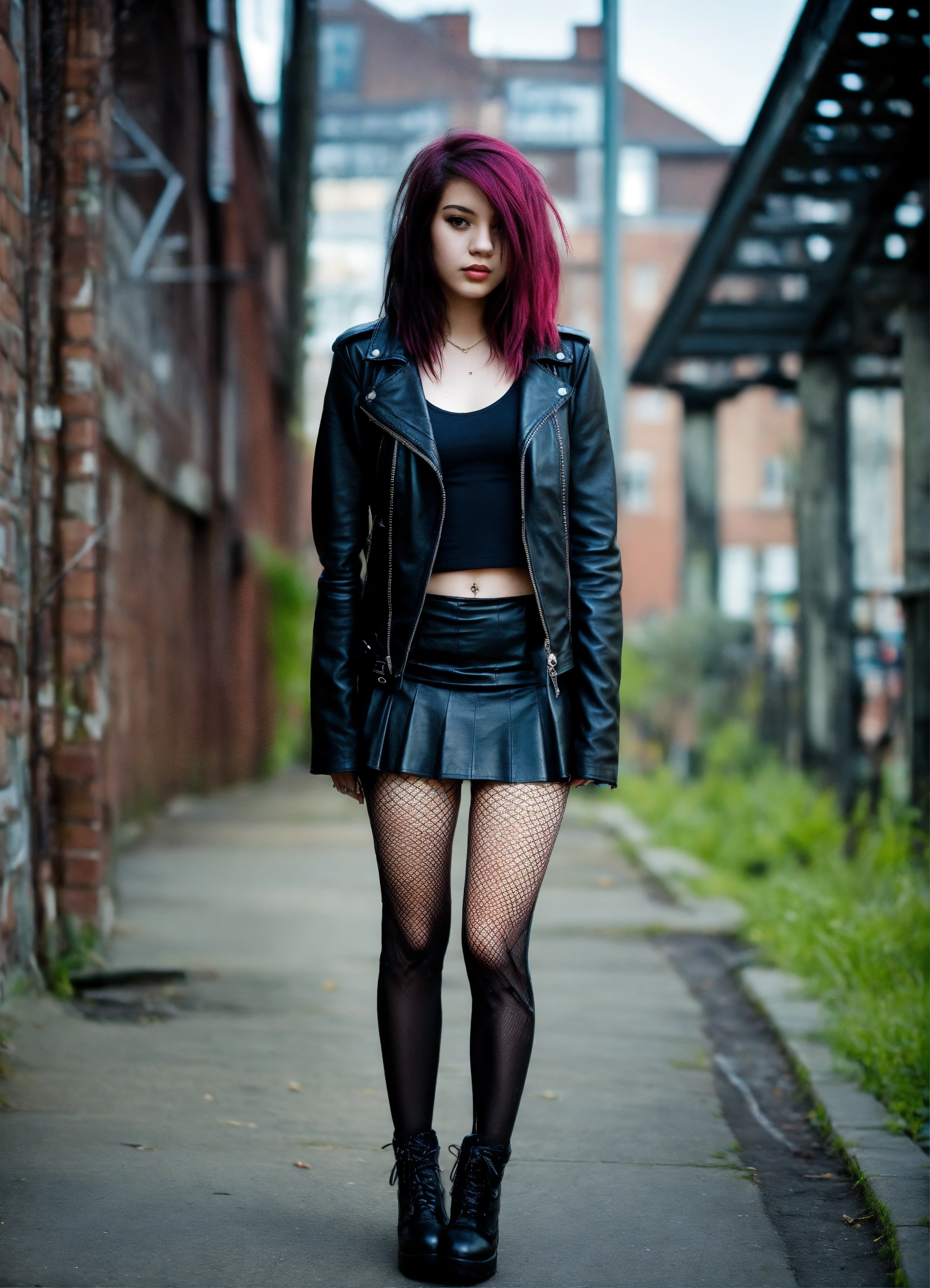 20 year old emo girl wearing a black leather jacket skirt and fishnet stockings