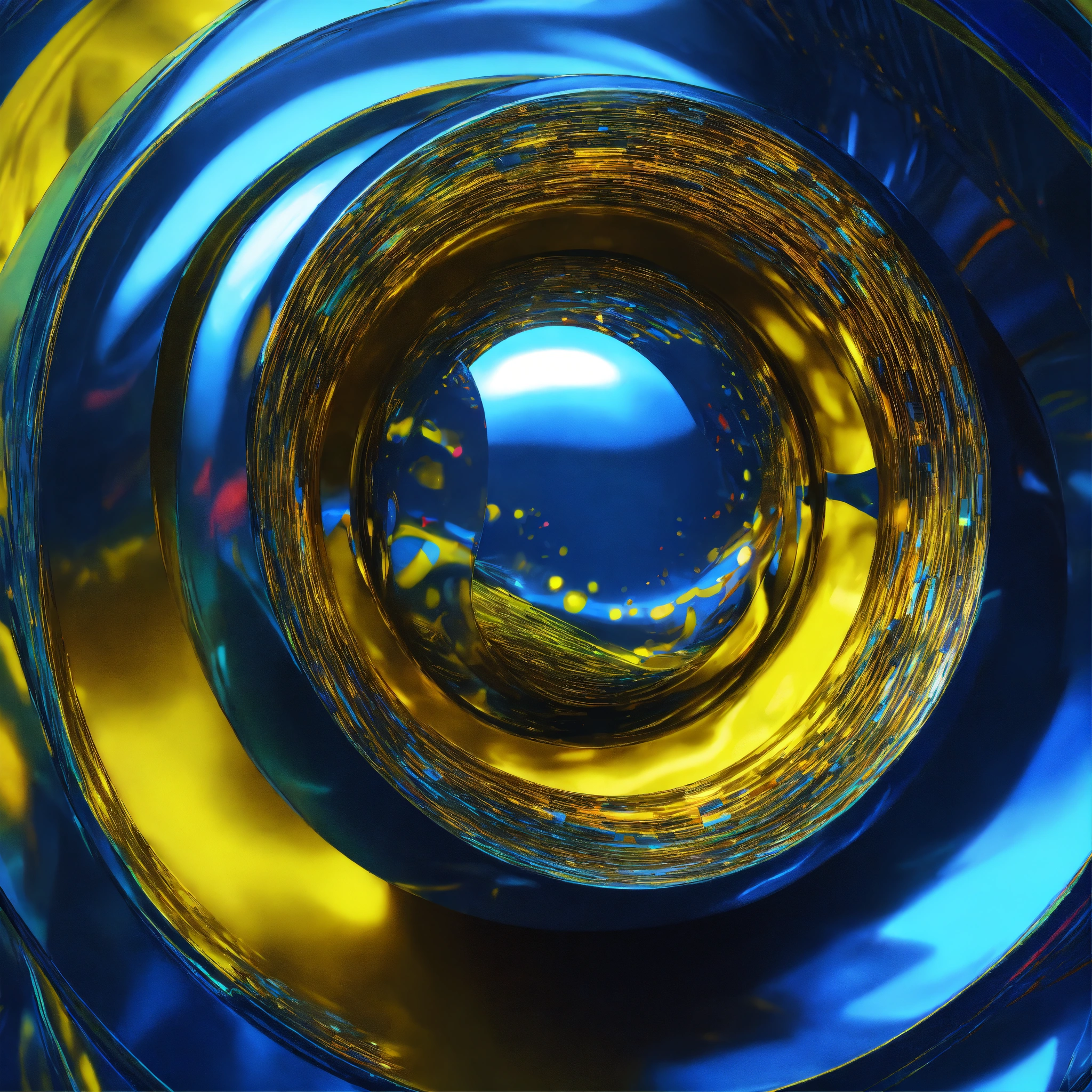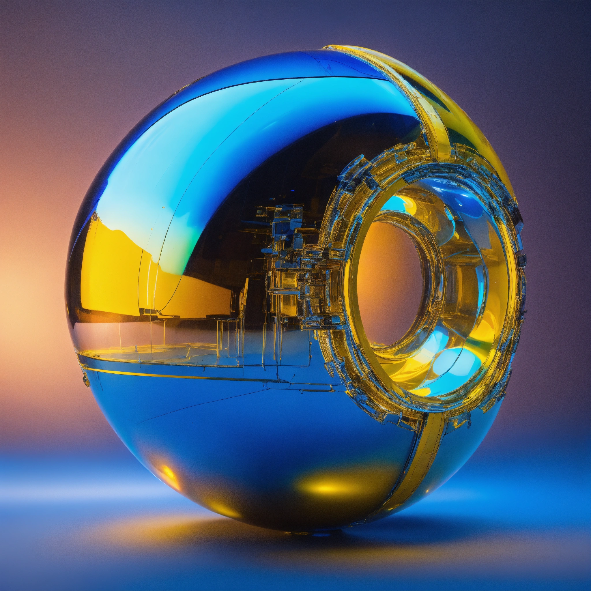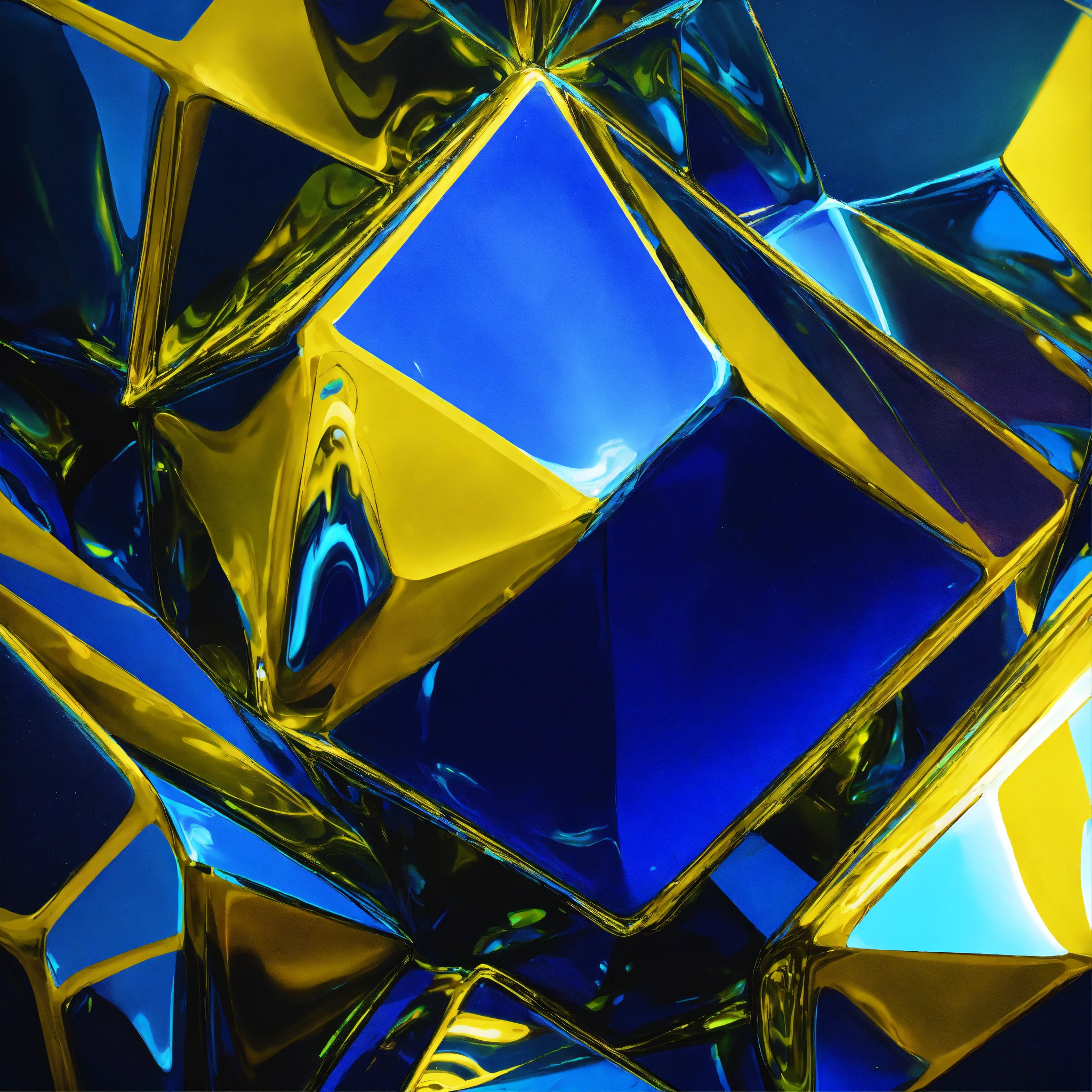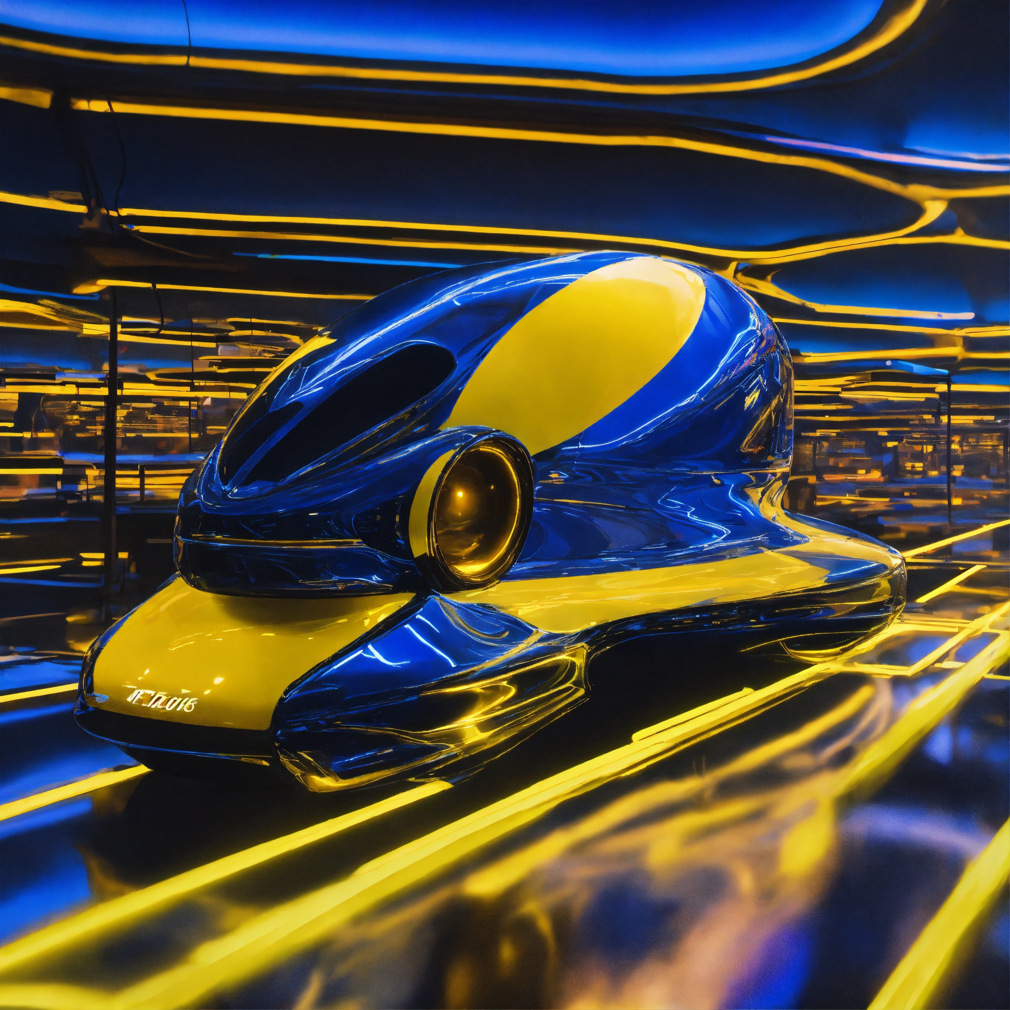 Metallic and glassy surface, vivid tones of blue and yellow, surreal futuristic neat object, heavenly light and intense neon lights, an enormous mass that defies perception. one abstract representative object floating --ar 169 --s 1000 --c 15