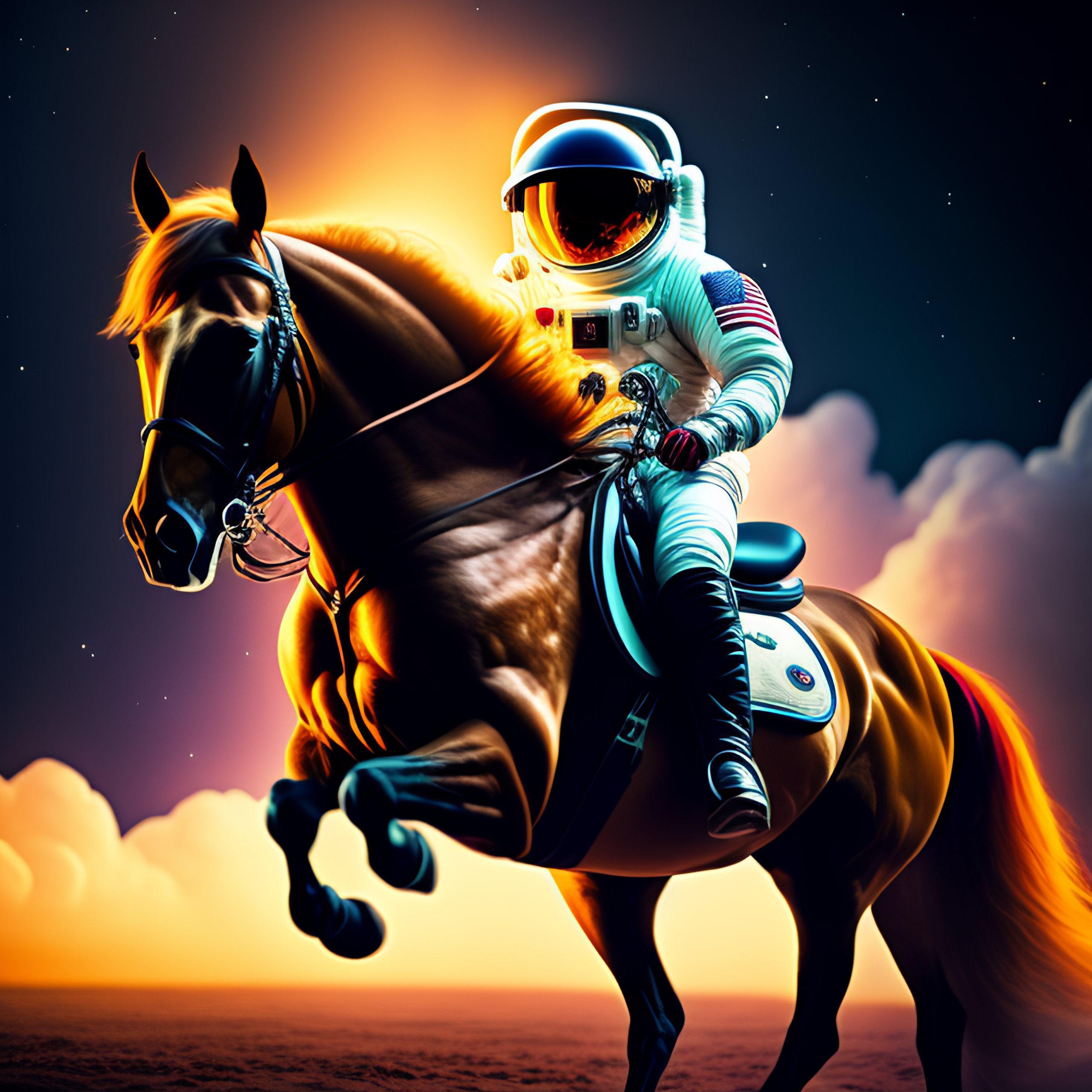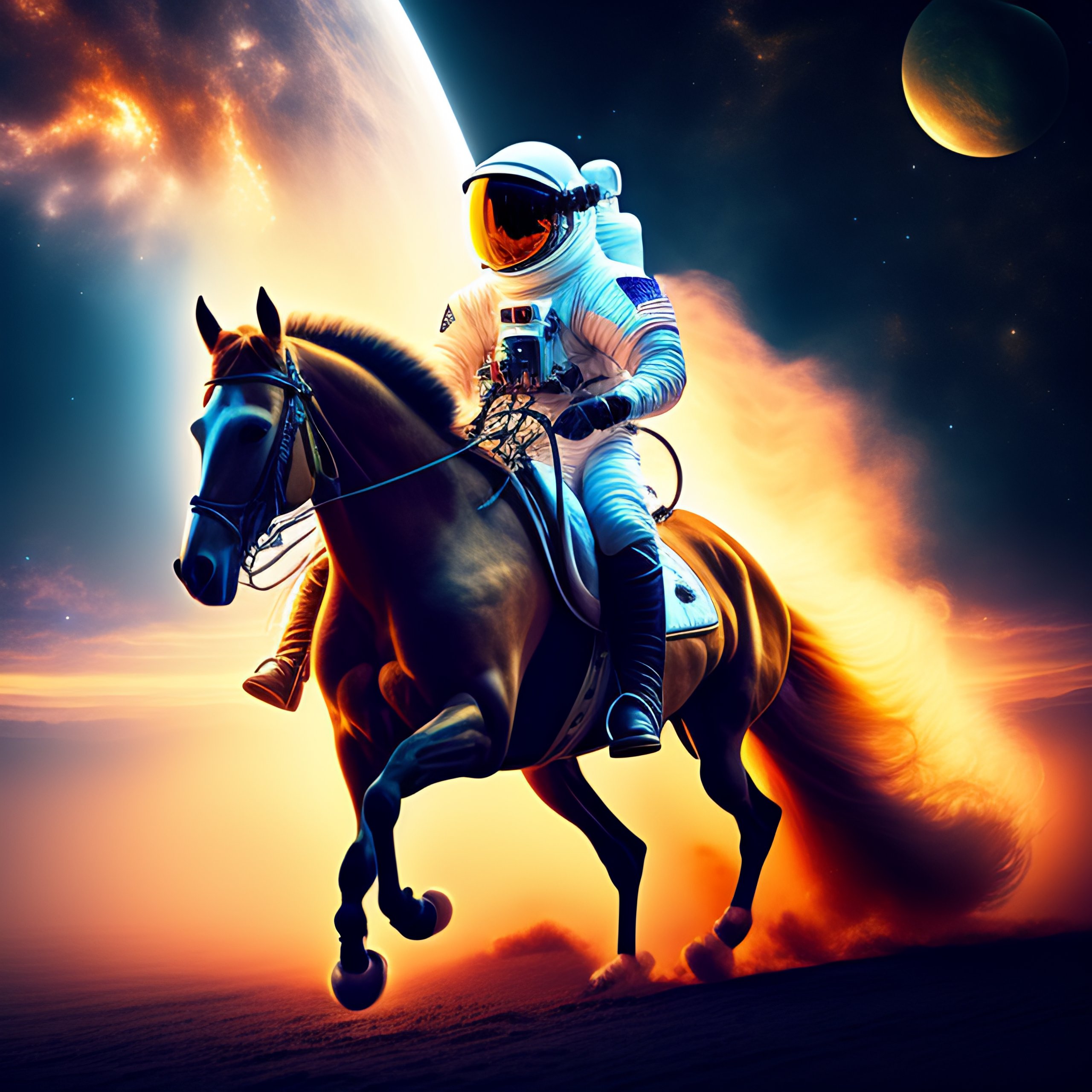 An astronaut riding horse in space, space, interplanetary, so real, unreal, amazing lighting, cinematic, intense, detailed