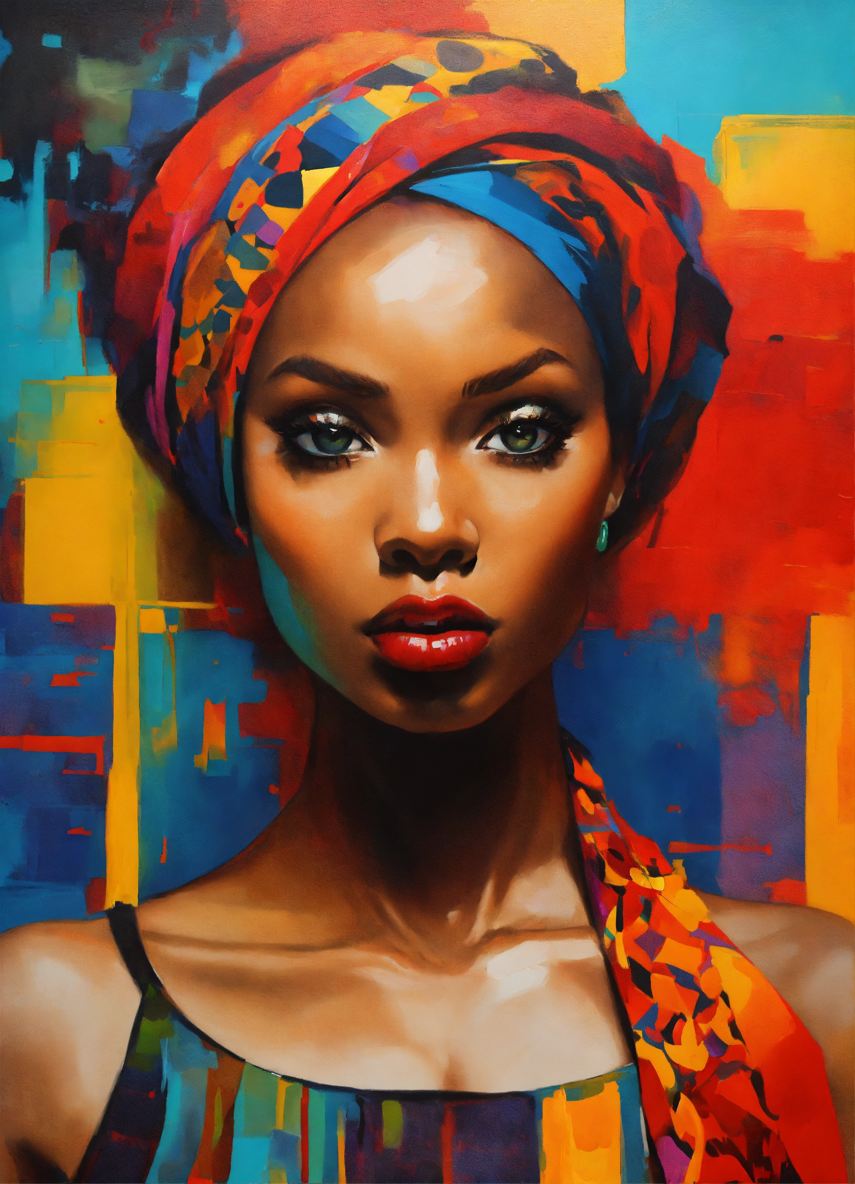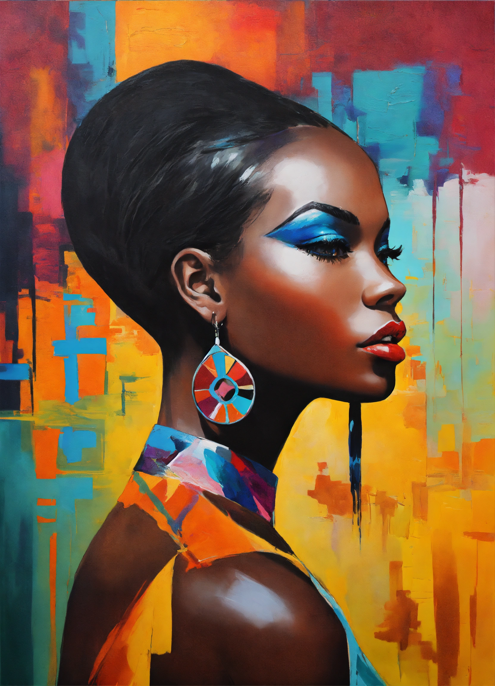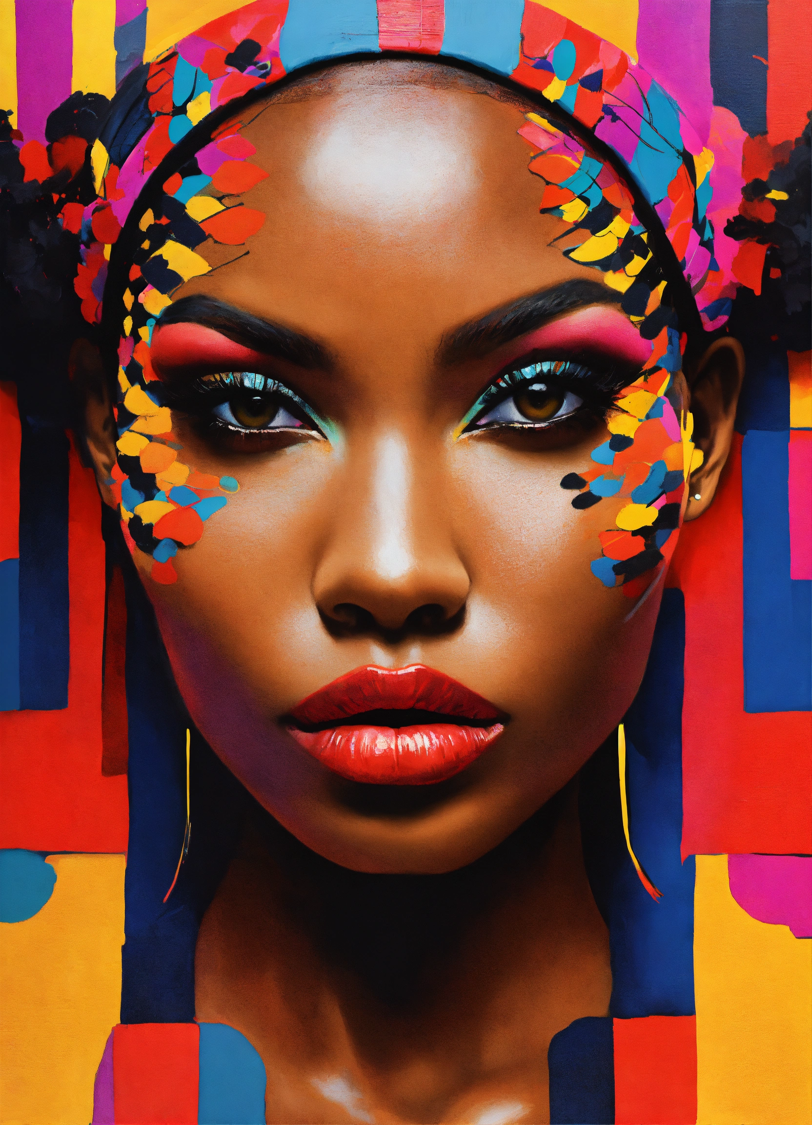 Abstract canvas painting of a fierce black model with abstract pattern in vibrant colors