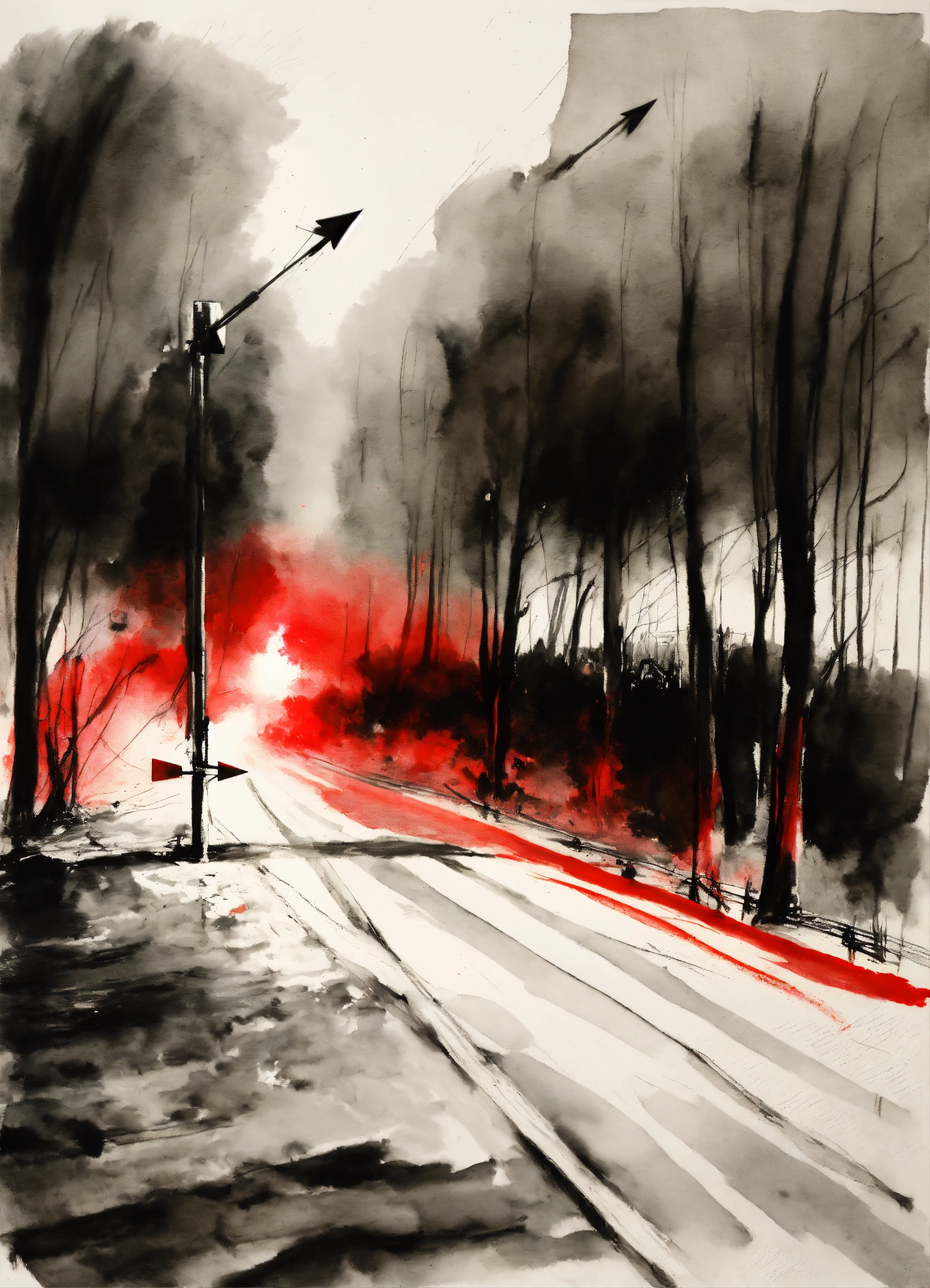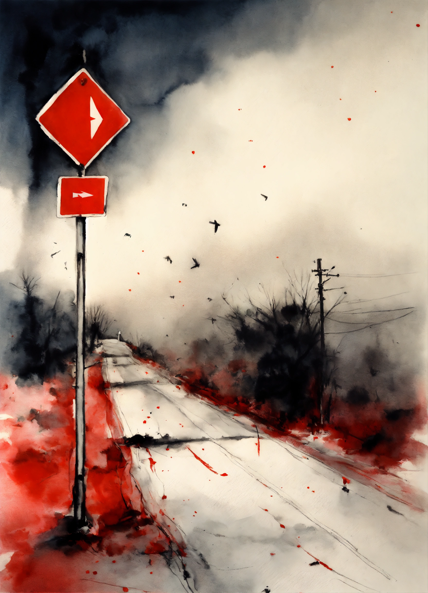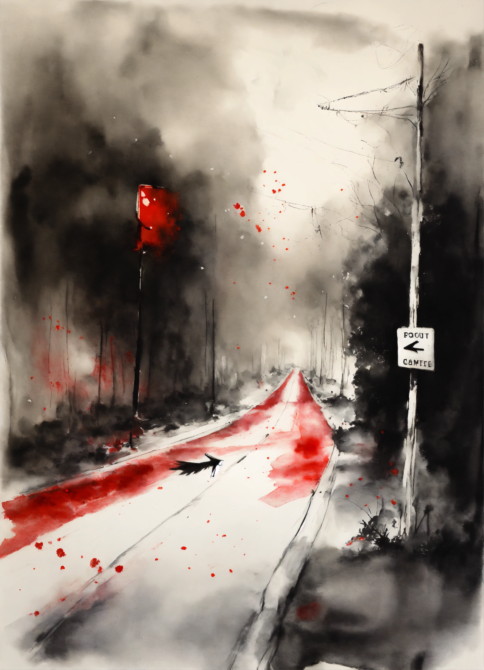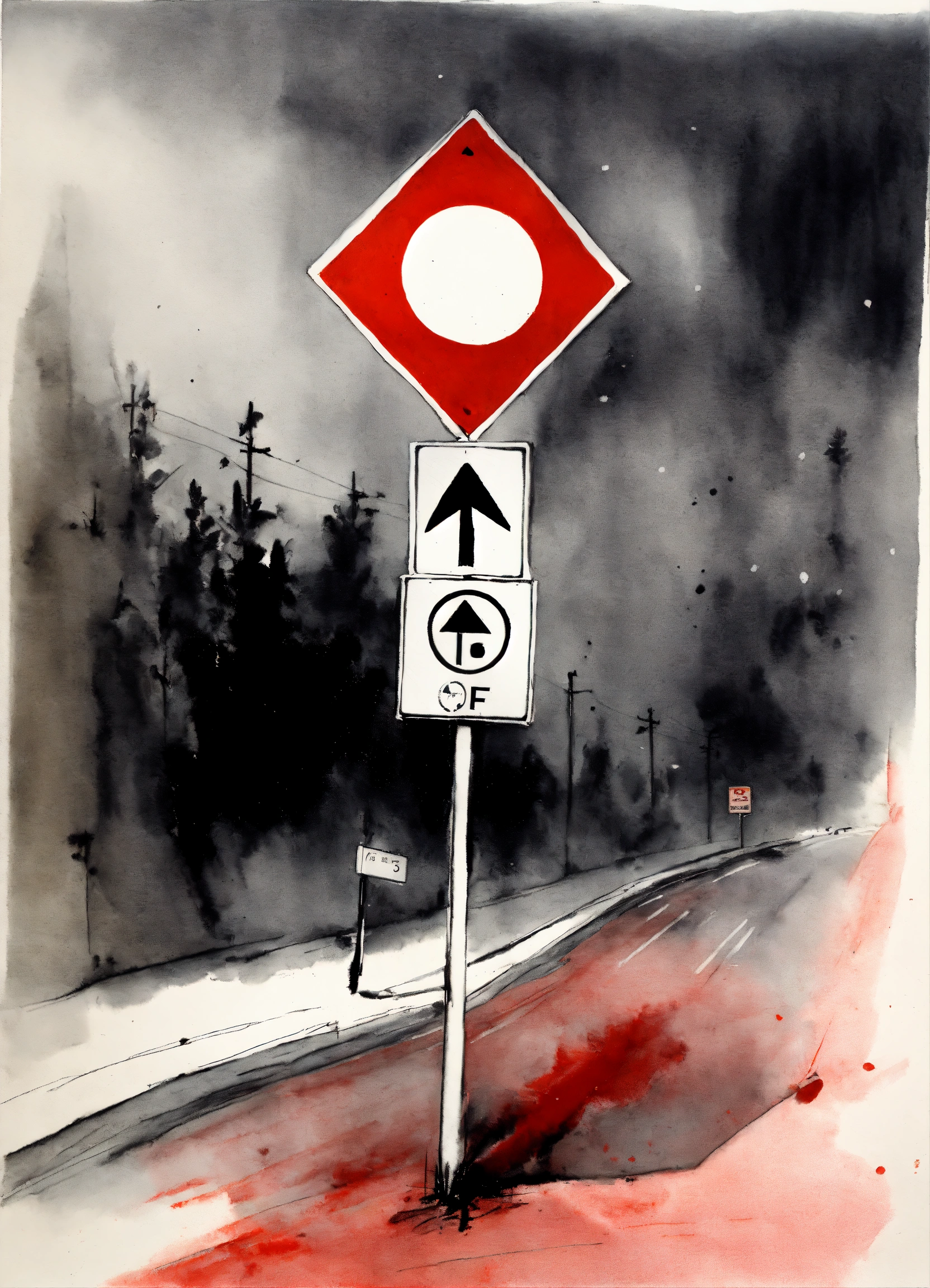 Stephen gammell style, dessin, aquarelle, aquarelles, noir et blanc et rouge, de marais, de sombres créatures, dégoulinant, an arrow indicating to turn around on a traffic sign on the road