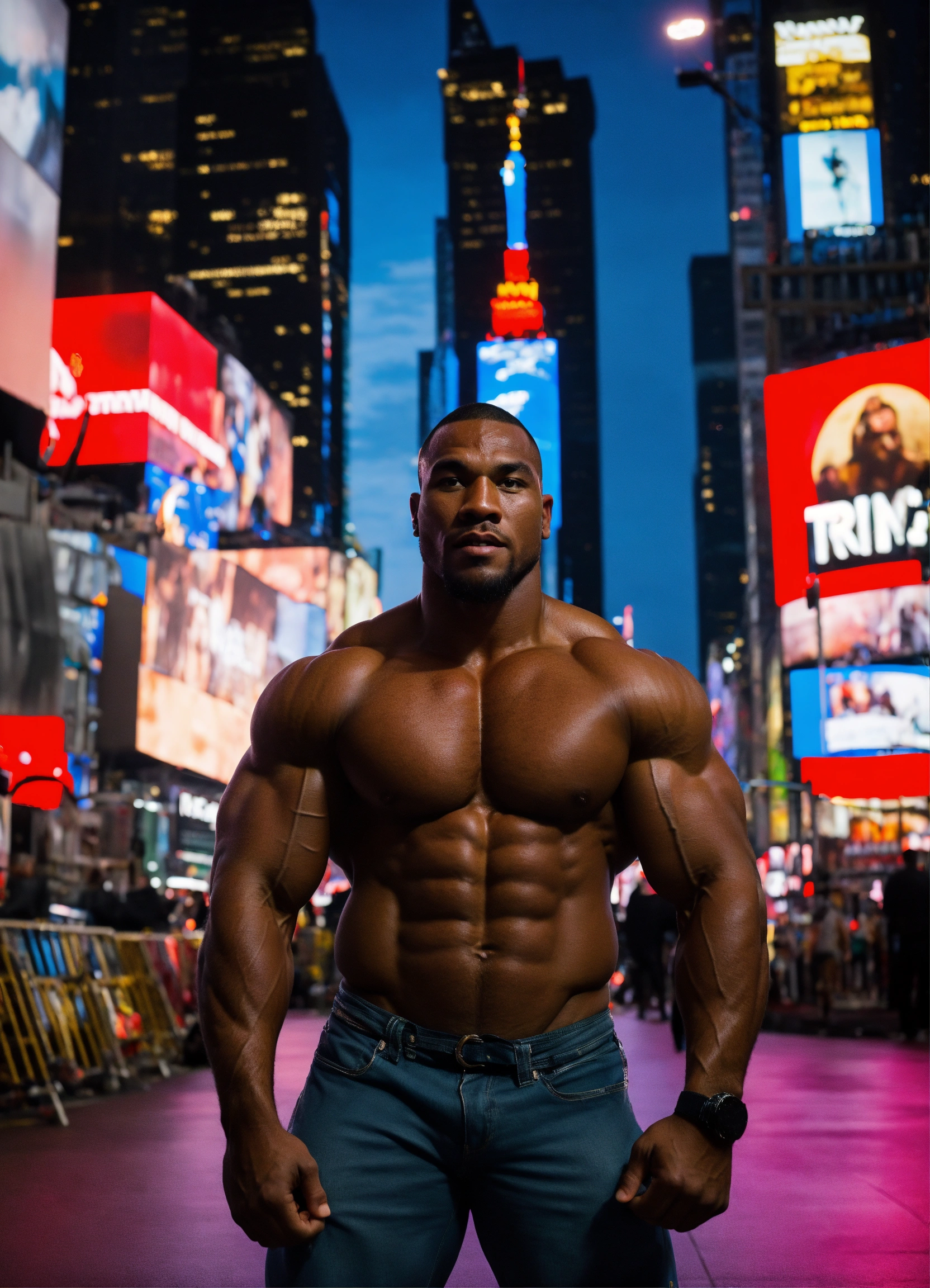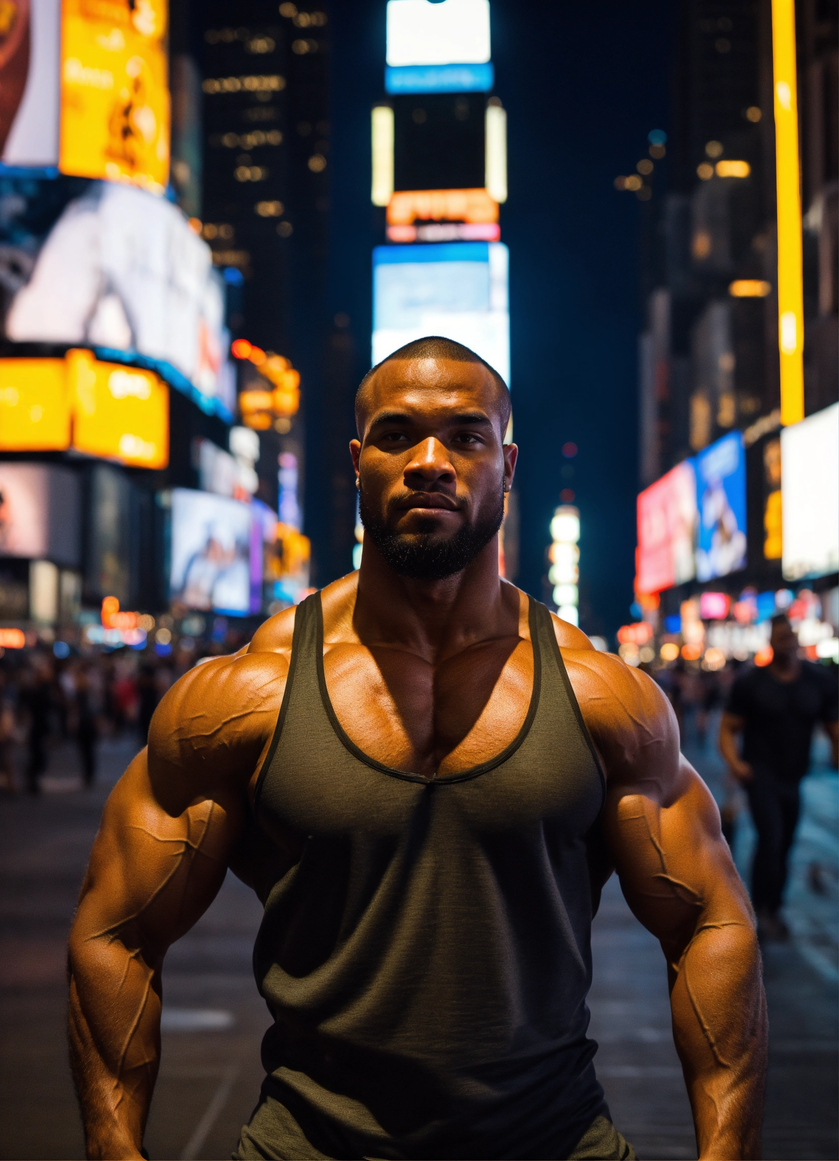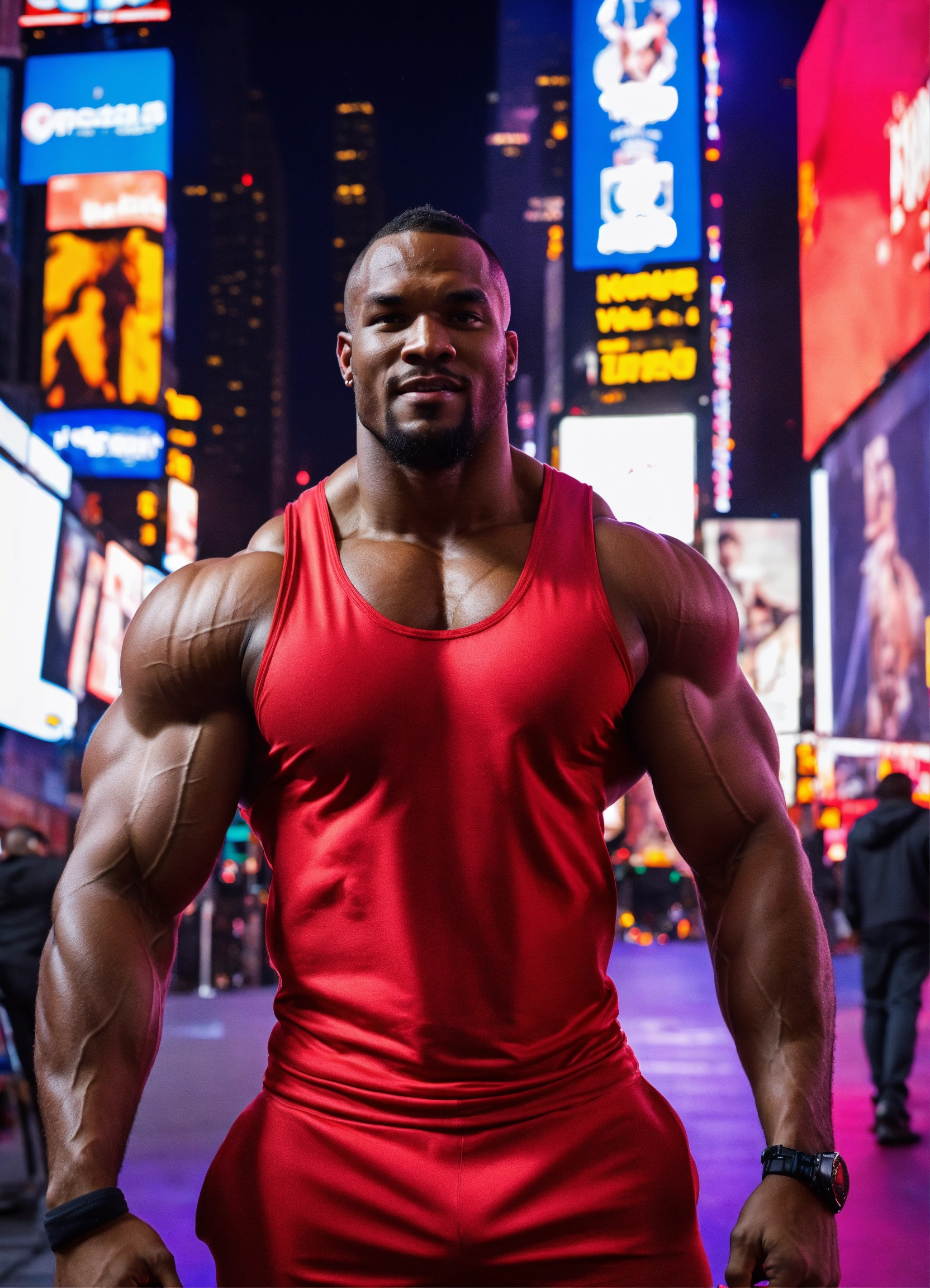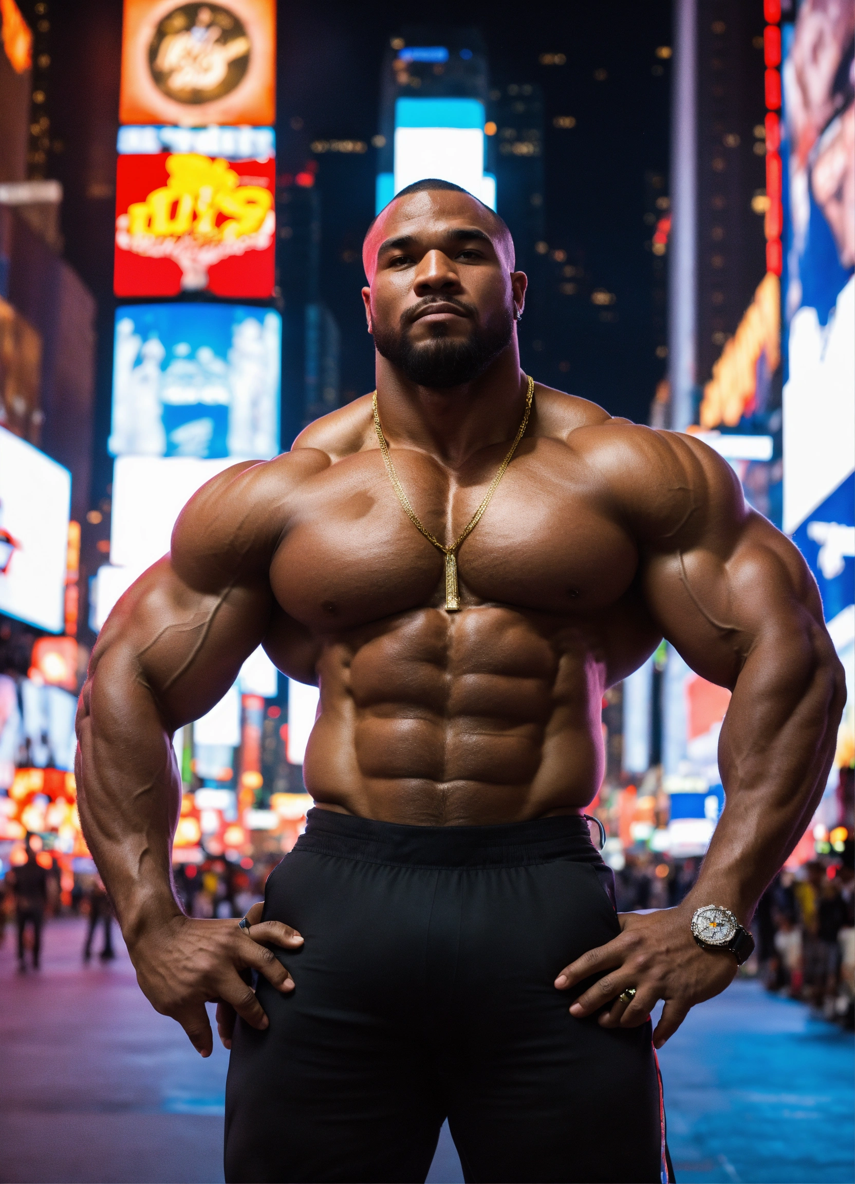 30-year-old man with big muscles, kano, big bodybuilder, body like a wrestler, in times square at night