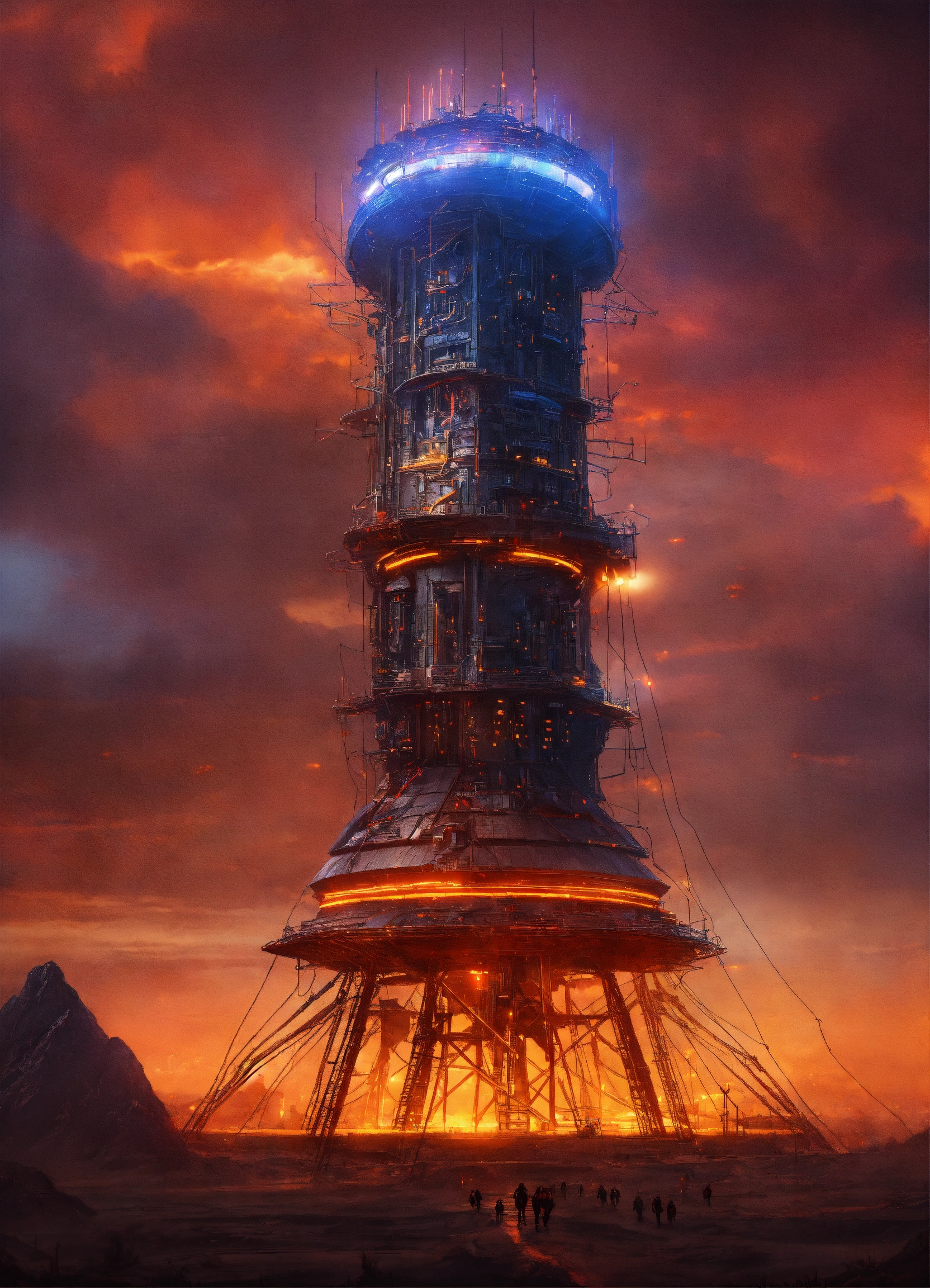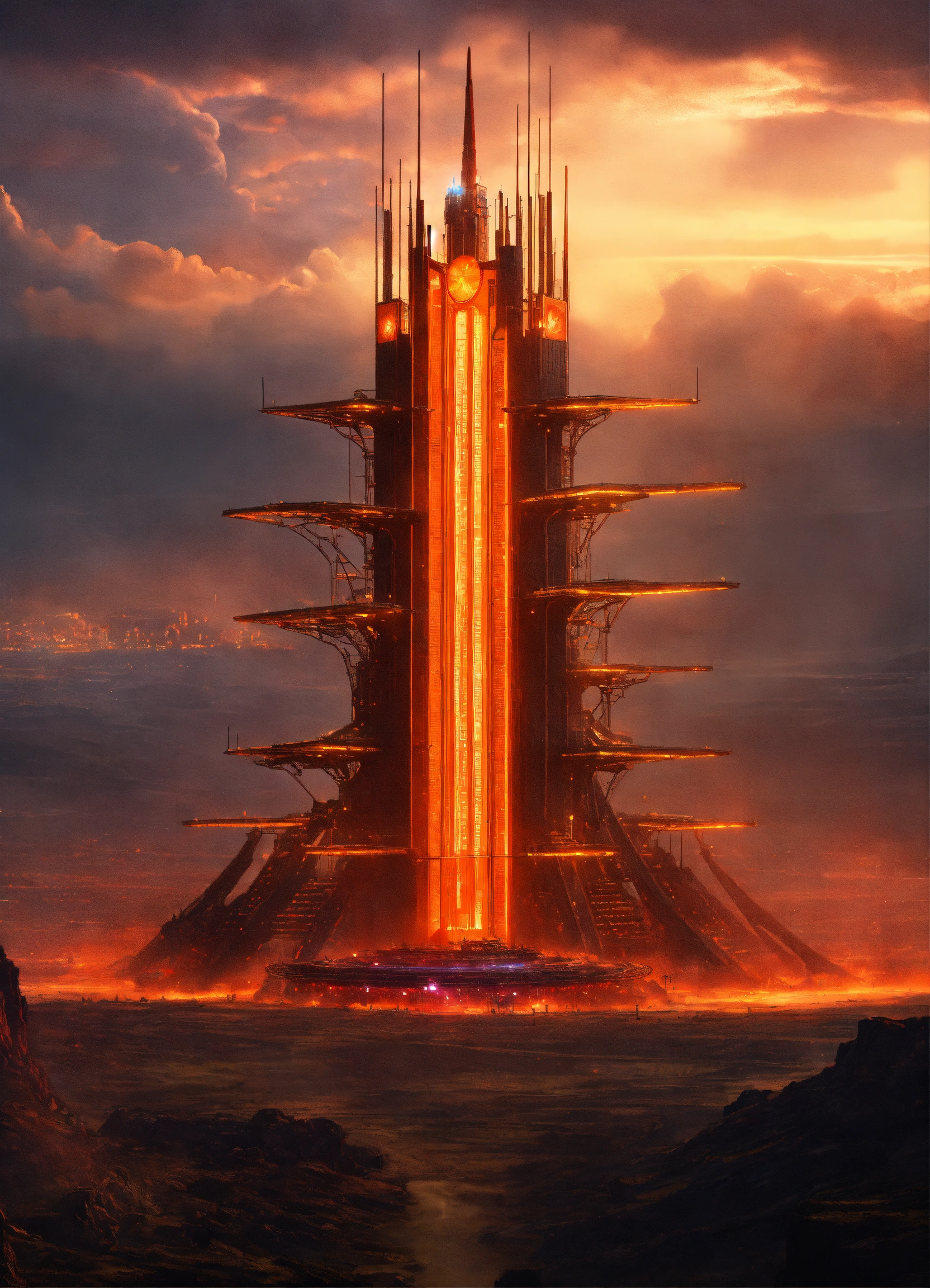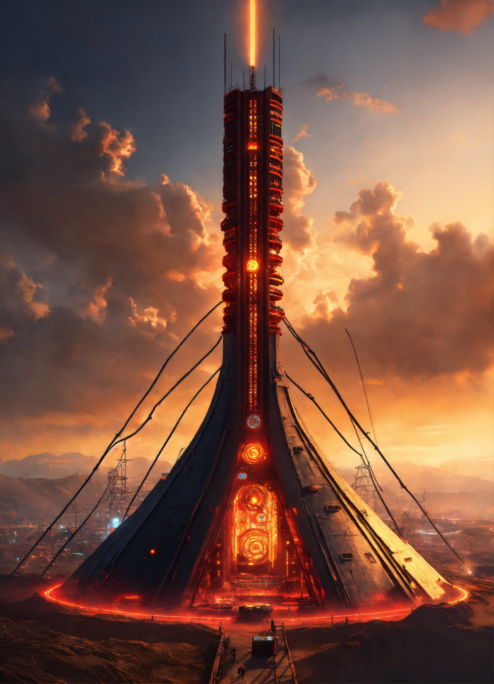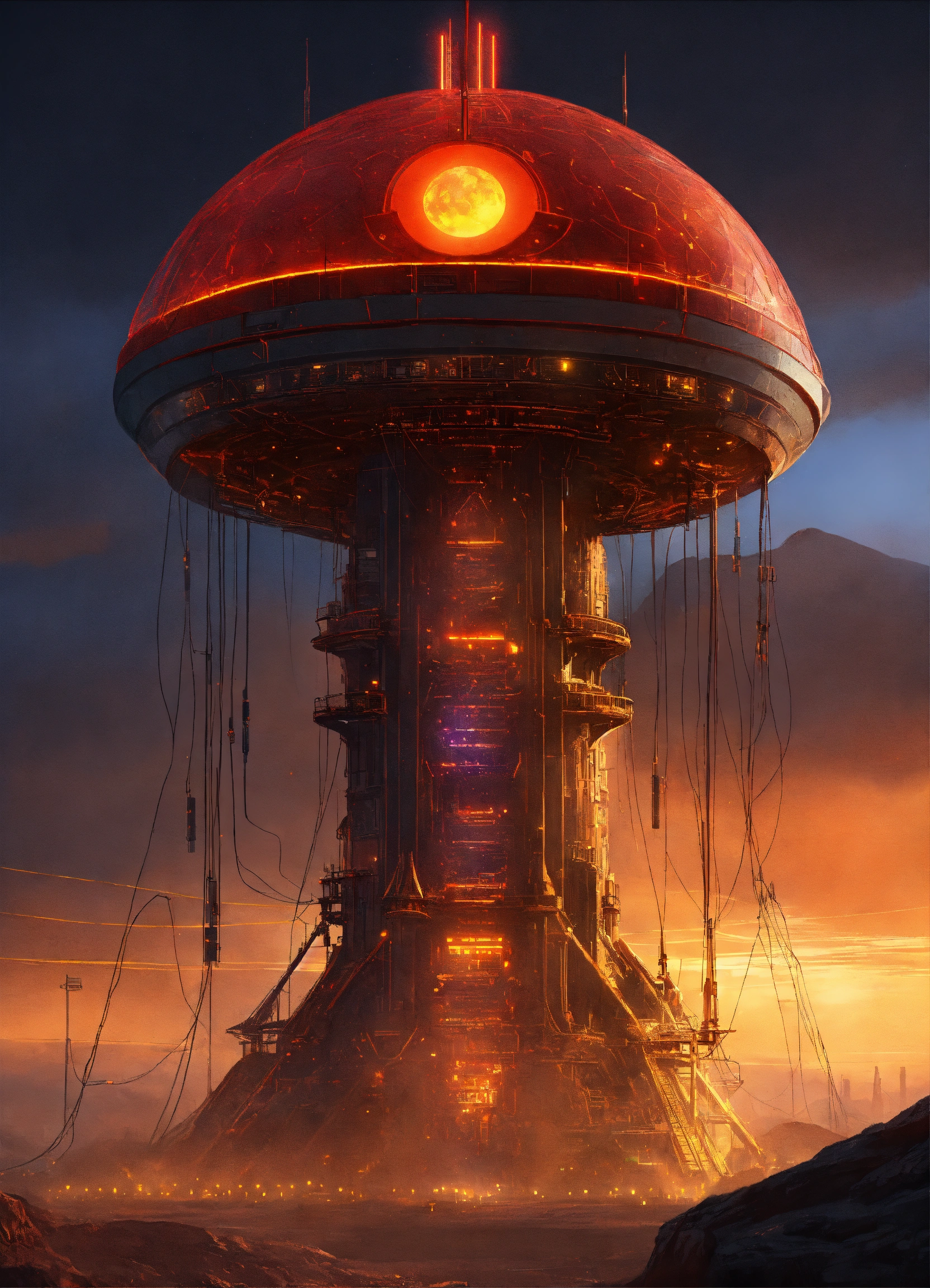 Dark alien tower of sauron is a towering fortress with digital circuit lines going up the structure with energy field blasting through the top to creat a dome forcefield, illuminated with red and yellow buttons, circuits, and energy coils, tron, looks like music equipment with meter bridges, speakers, and transmission towers soundwave, in the middle of a wasteland, 8k realistic, pixar, disney, sci-fi