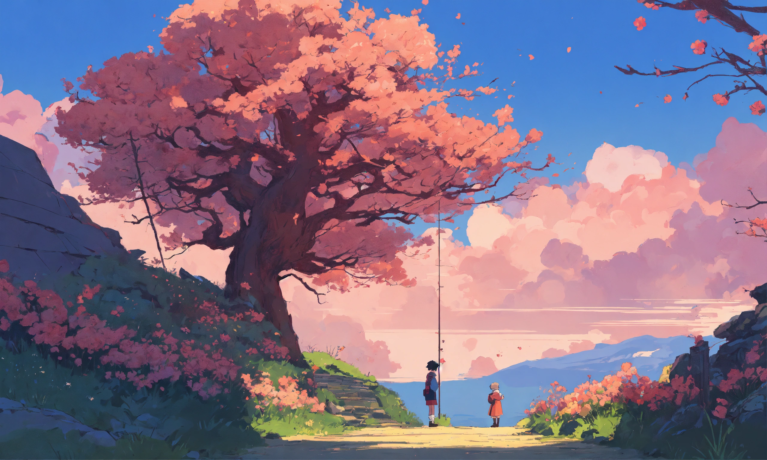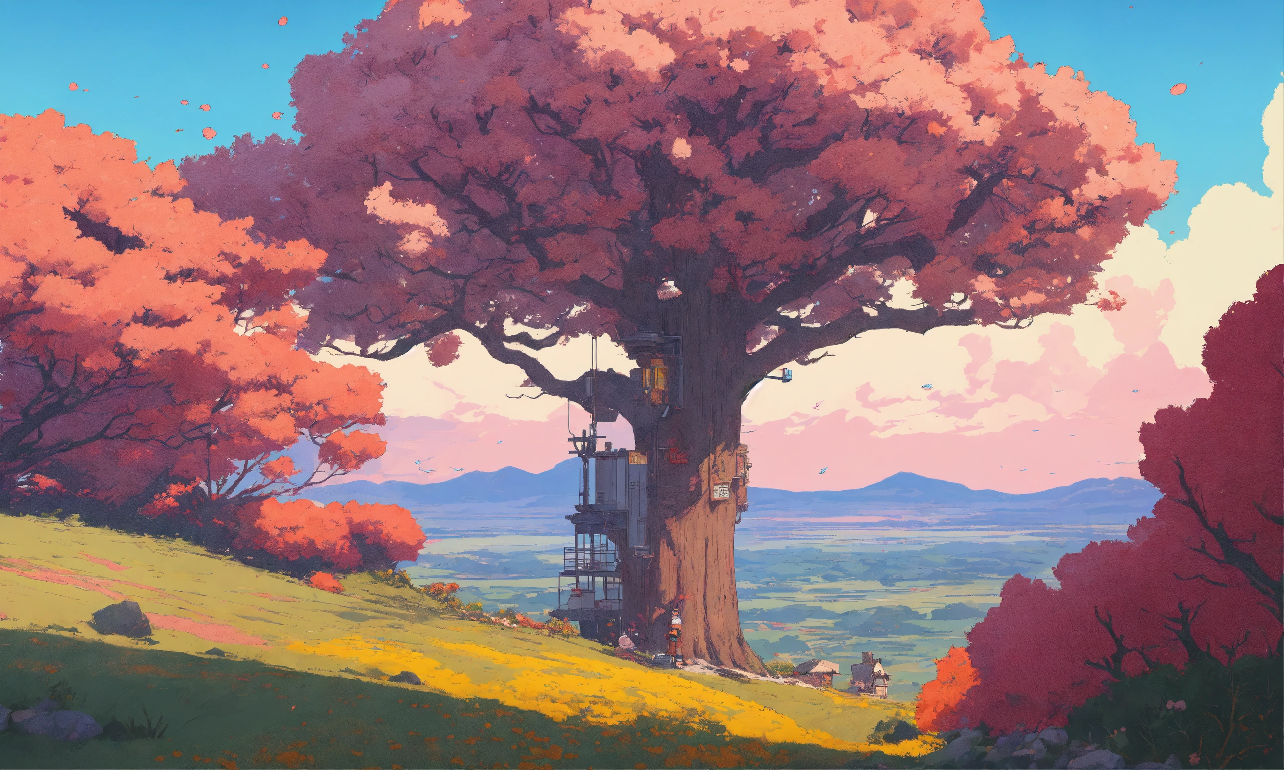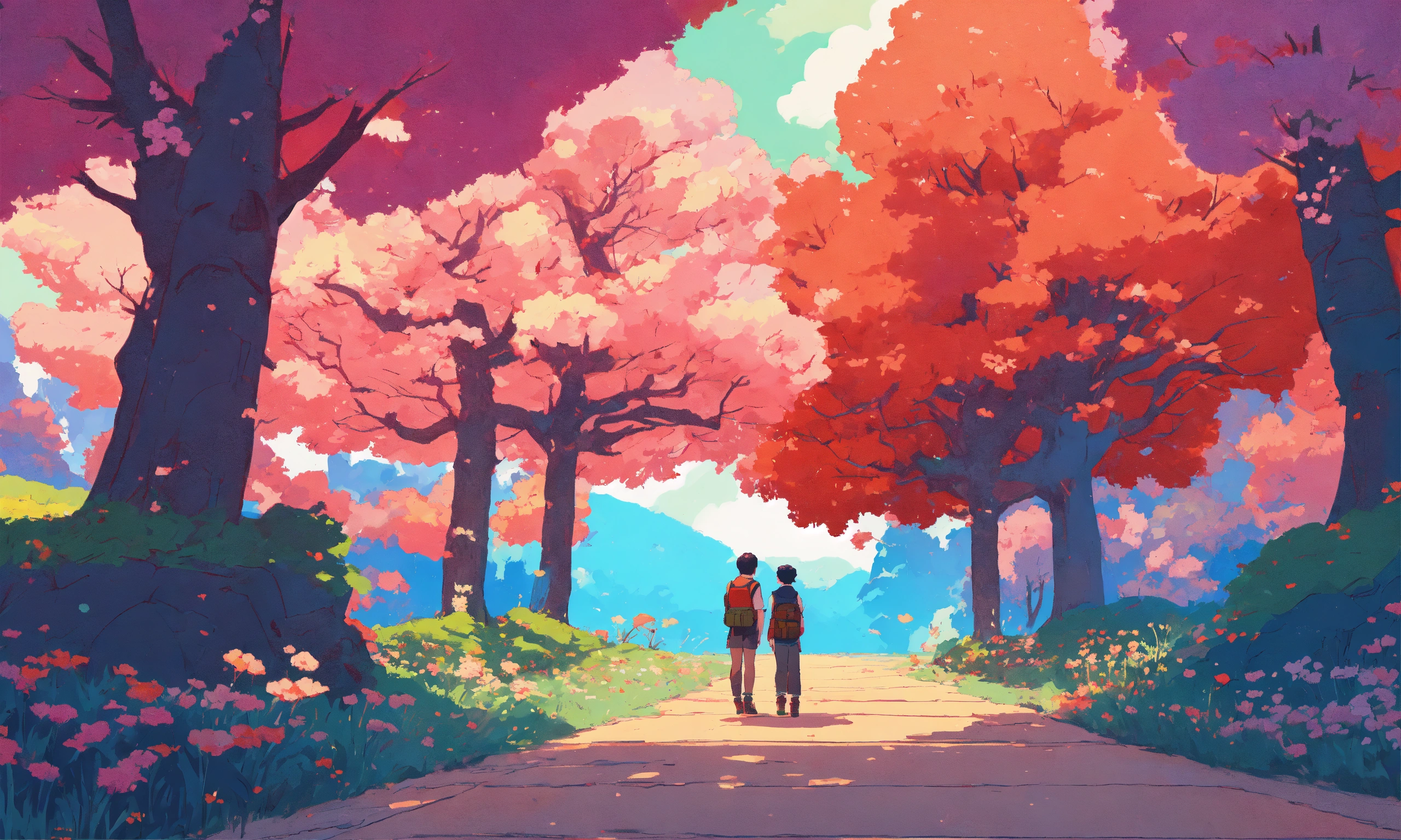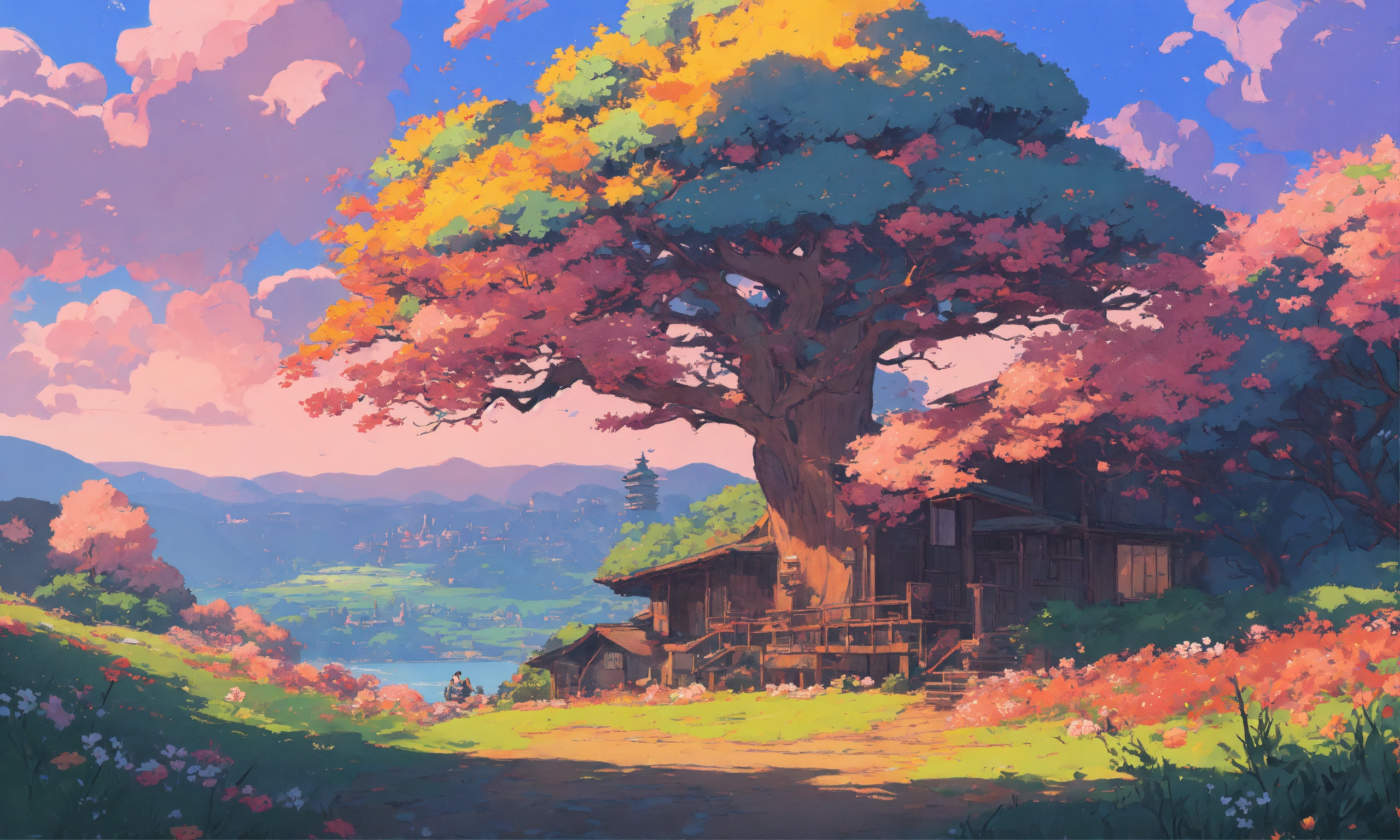 Digital art of a barren tree and a tree with flowers side by side, cartoony style of laurie greasley, studio ghibli, akira toriyama, james gilleard, genshin impact, trending pixiv fanbox, acrylic palette knife, 4k, vibrant colors, devinart, trending on artstation, low details