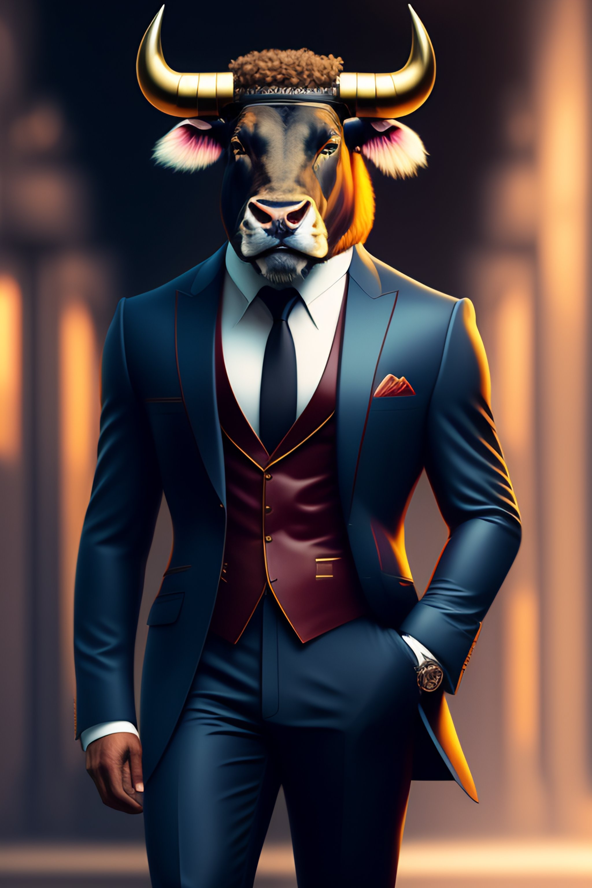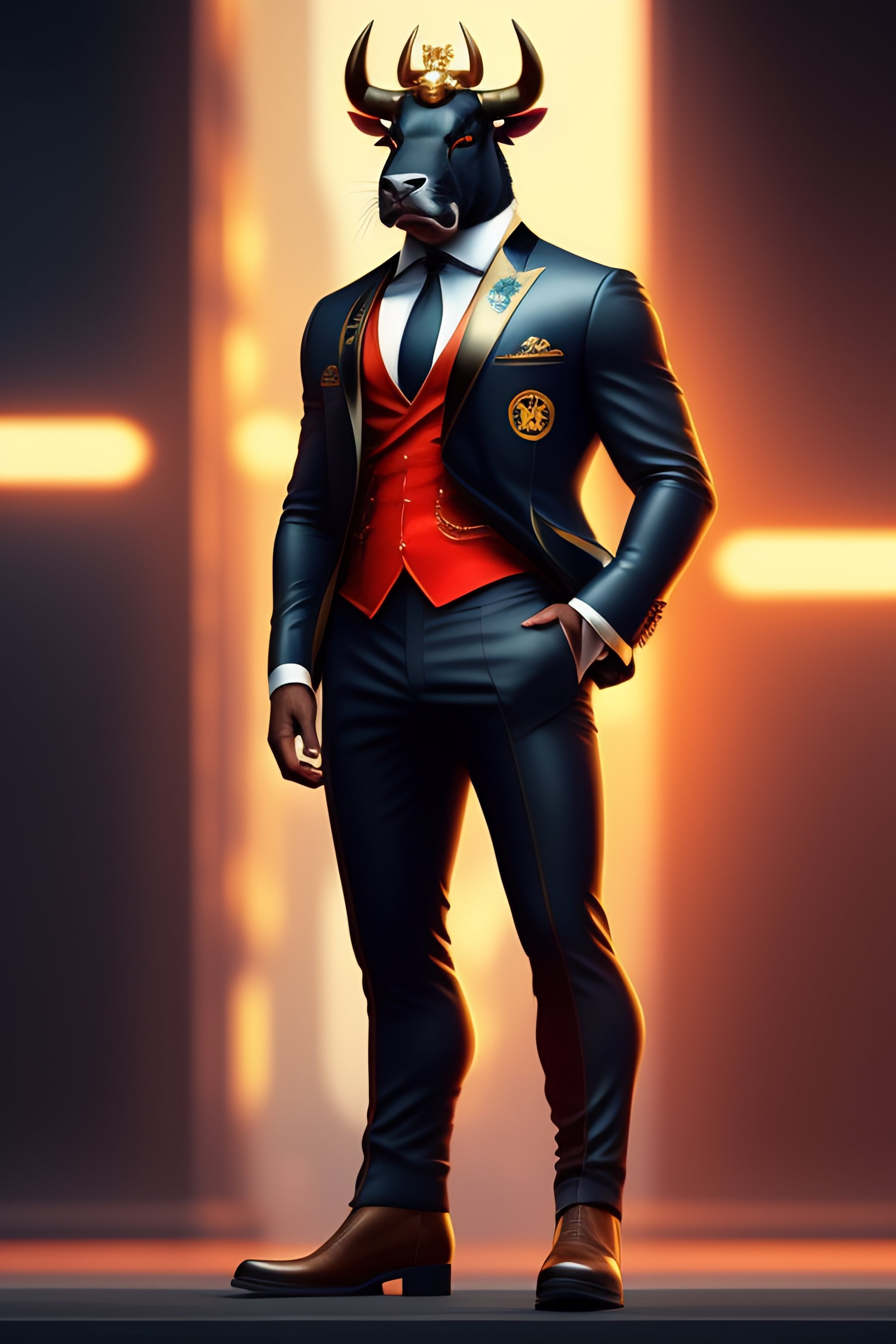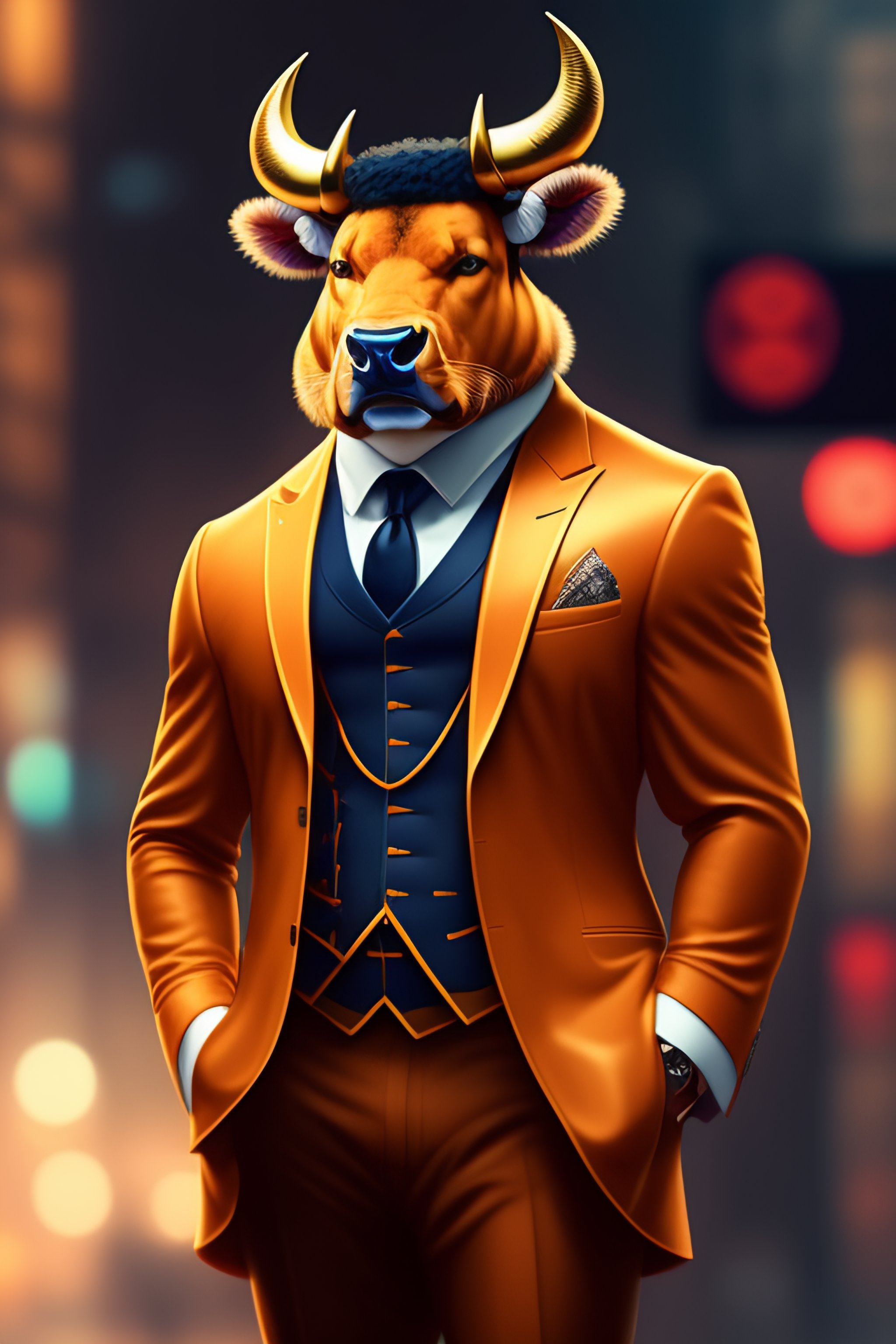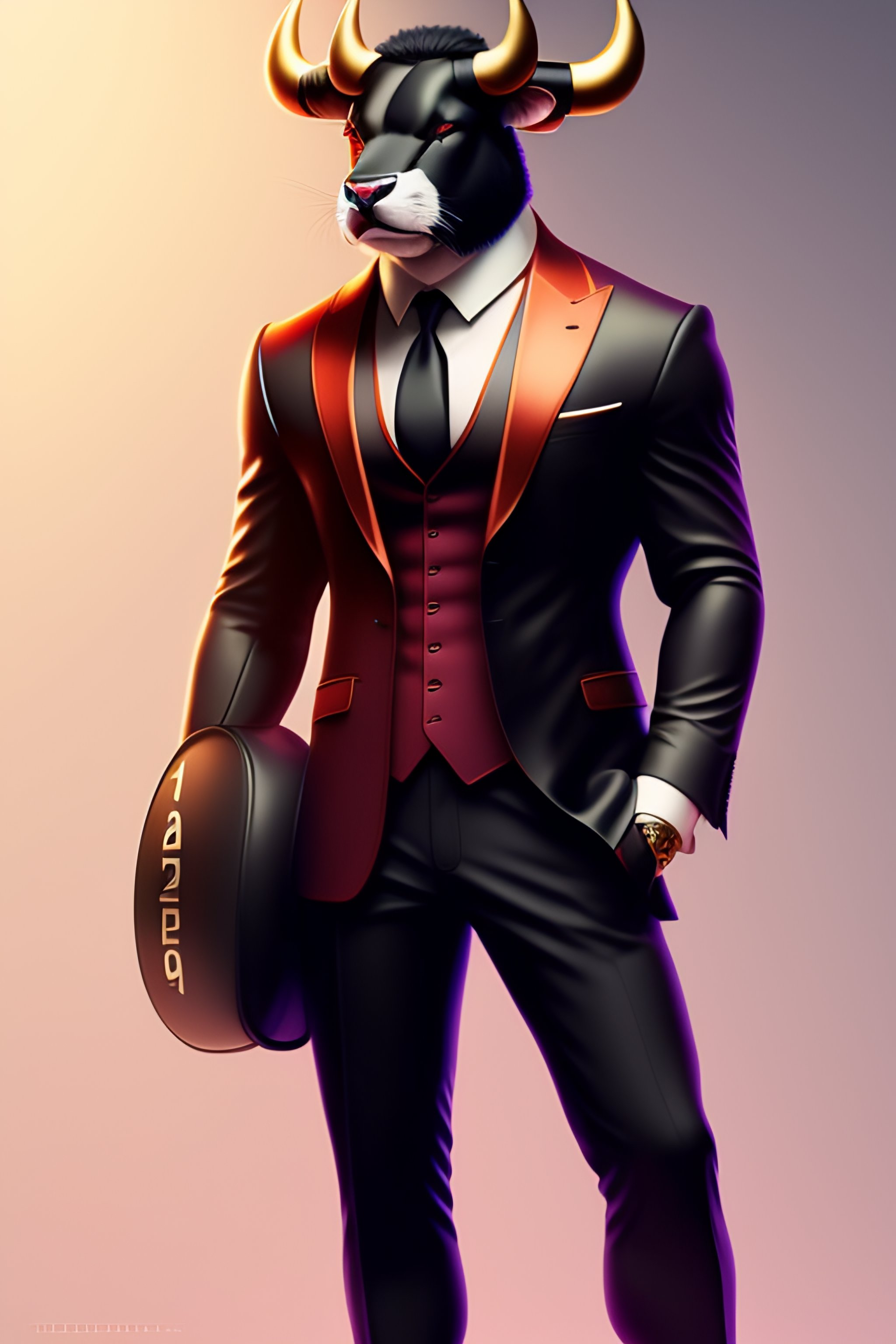 Anthro furry humanoid bull, three piece suit, checking watch, character concept design, painting, detailed, vivid, trending on artstation, crypto style, bitcoin logo