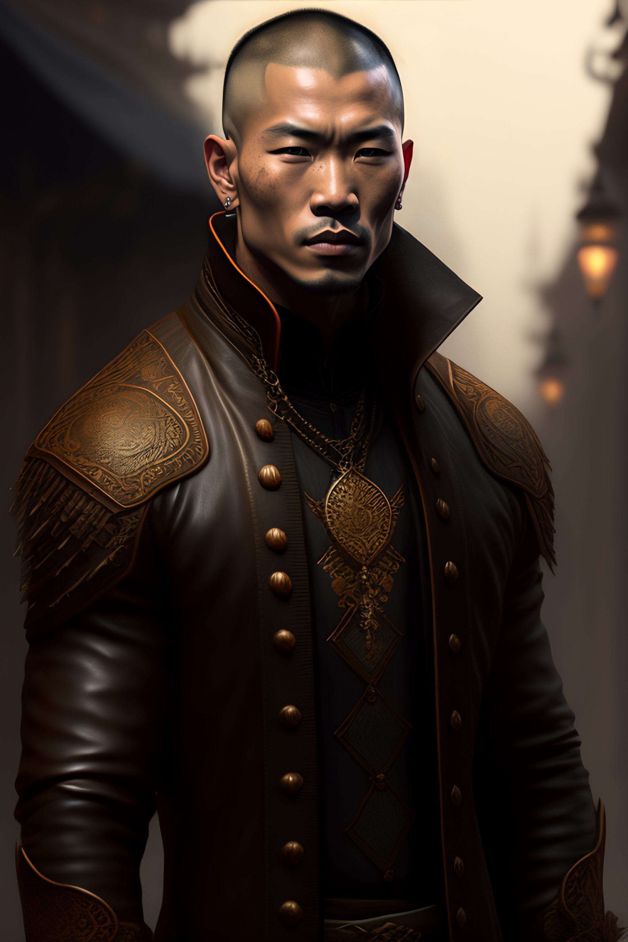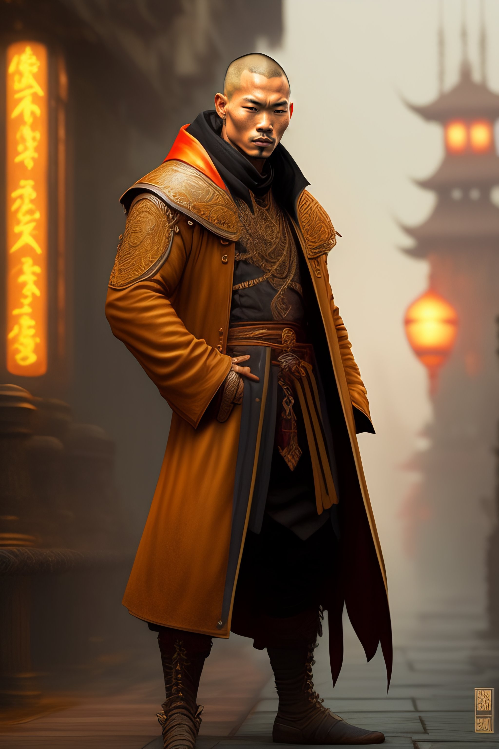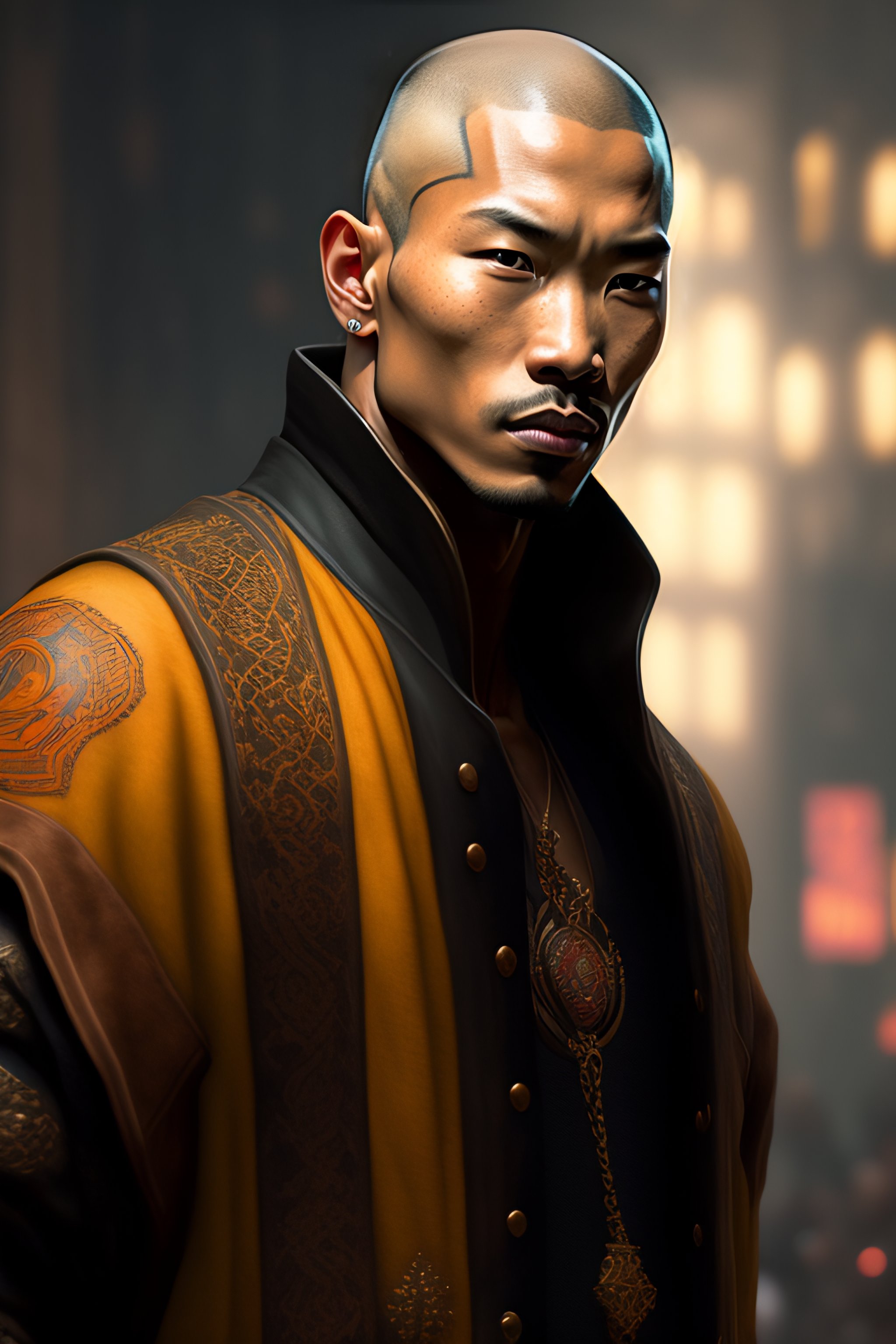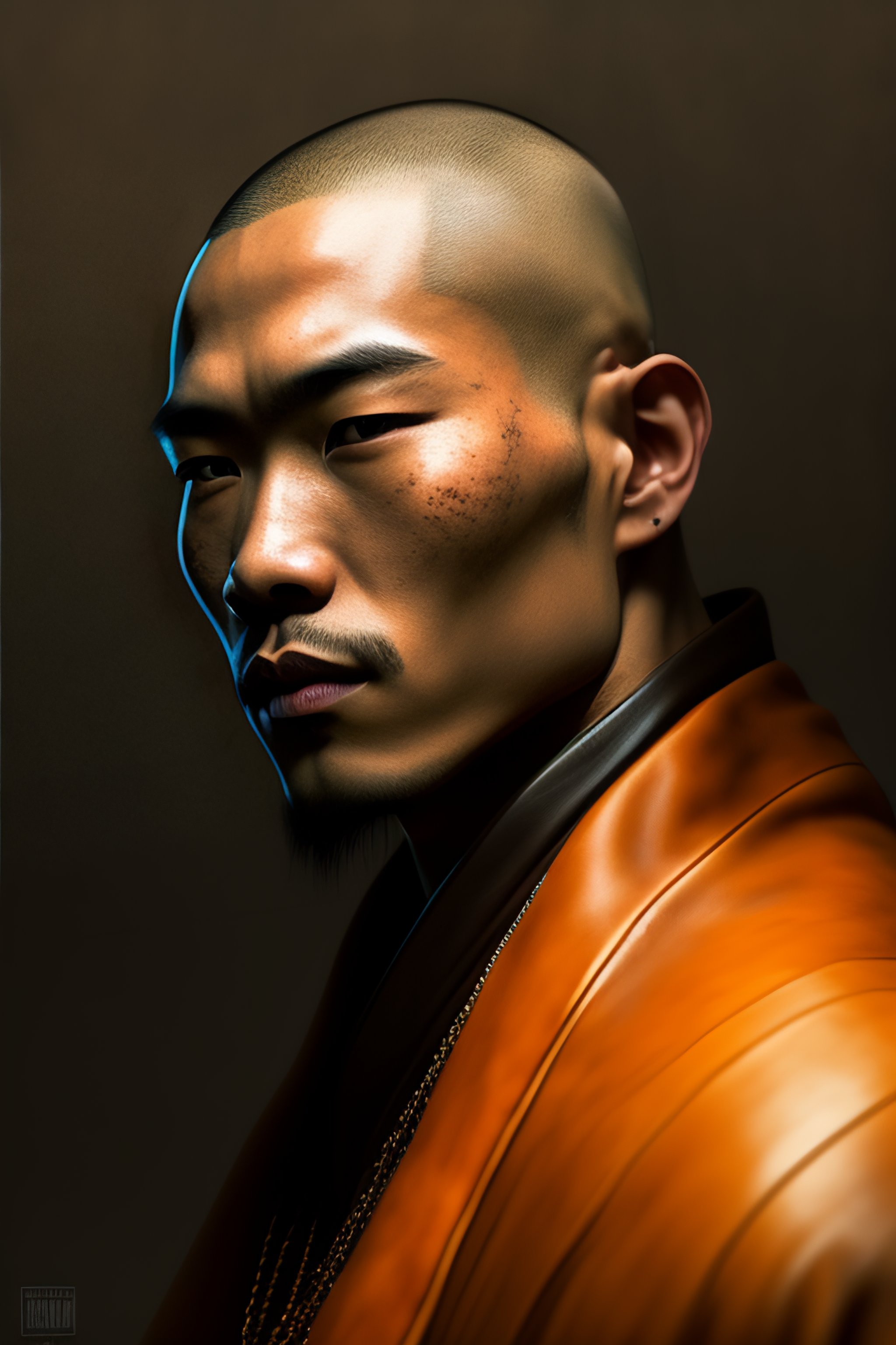 A shaolin monk, shaved head, punk, tattered leather coat, intricate, elegant, dramatic lighting, highly detailed, lifelike, photorealistic, digital painting, artstation, illustration, concept art, smooth, sharp focus, art by john collier and albert aublet and krenz cushart and artem demura and alphonse mucha