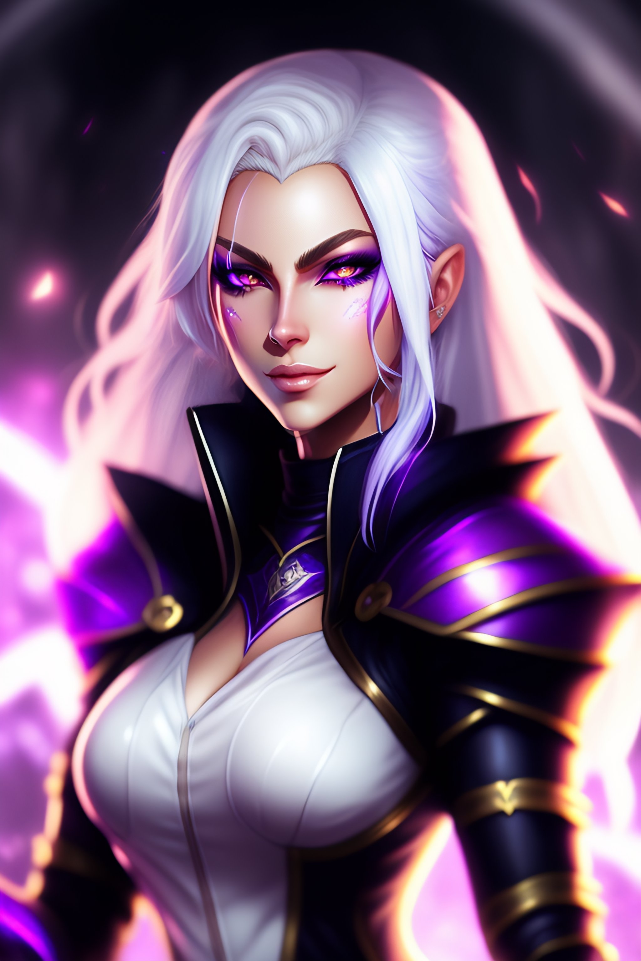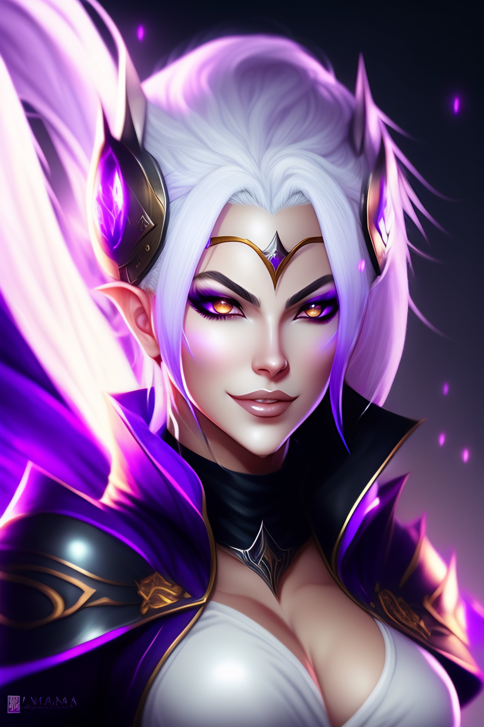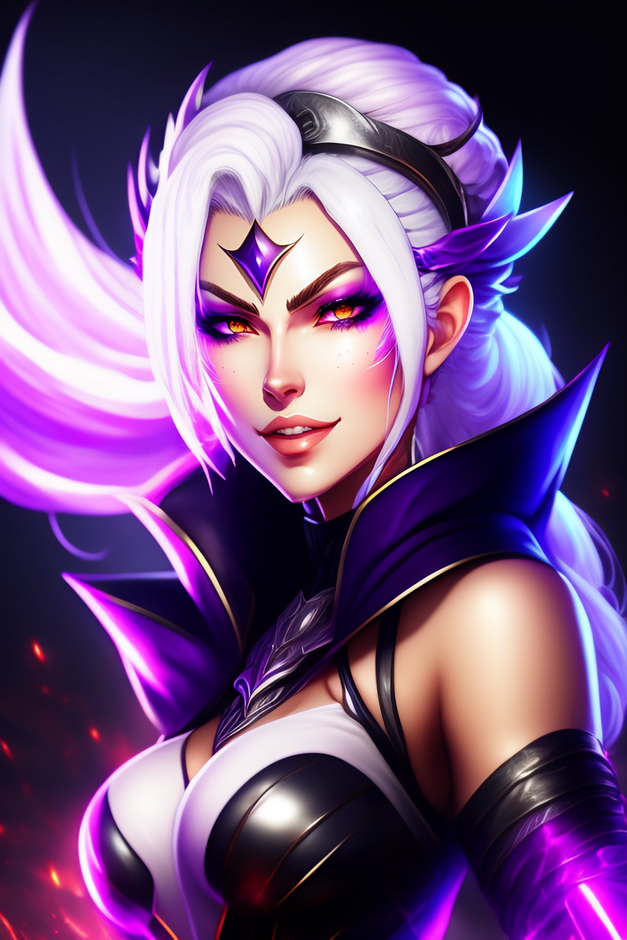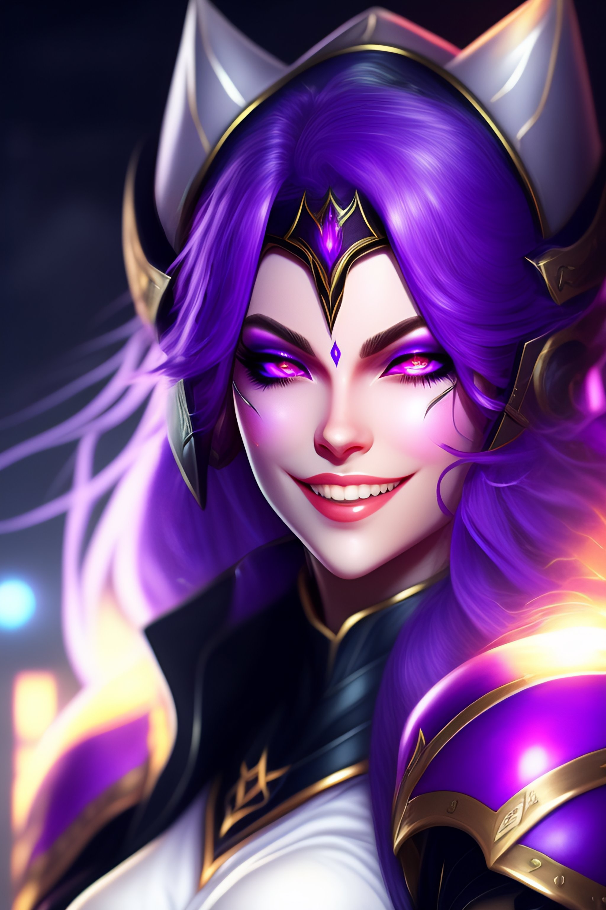 ((((anime style)))), cinematic light, crazy girl with white hair, evil grin, syndra, league of legends, lol, woman with dark crown haired, dark violet destruction background, ((glowing violet eyes)), (thin face), ((((dark crown helmet)))), white hair, ((dark helmet)), black cap