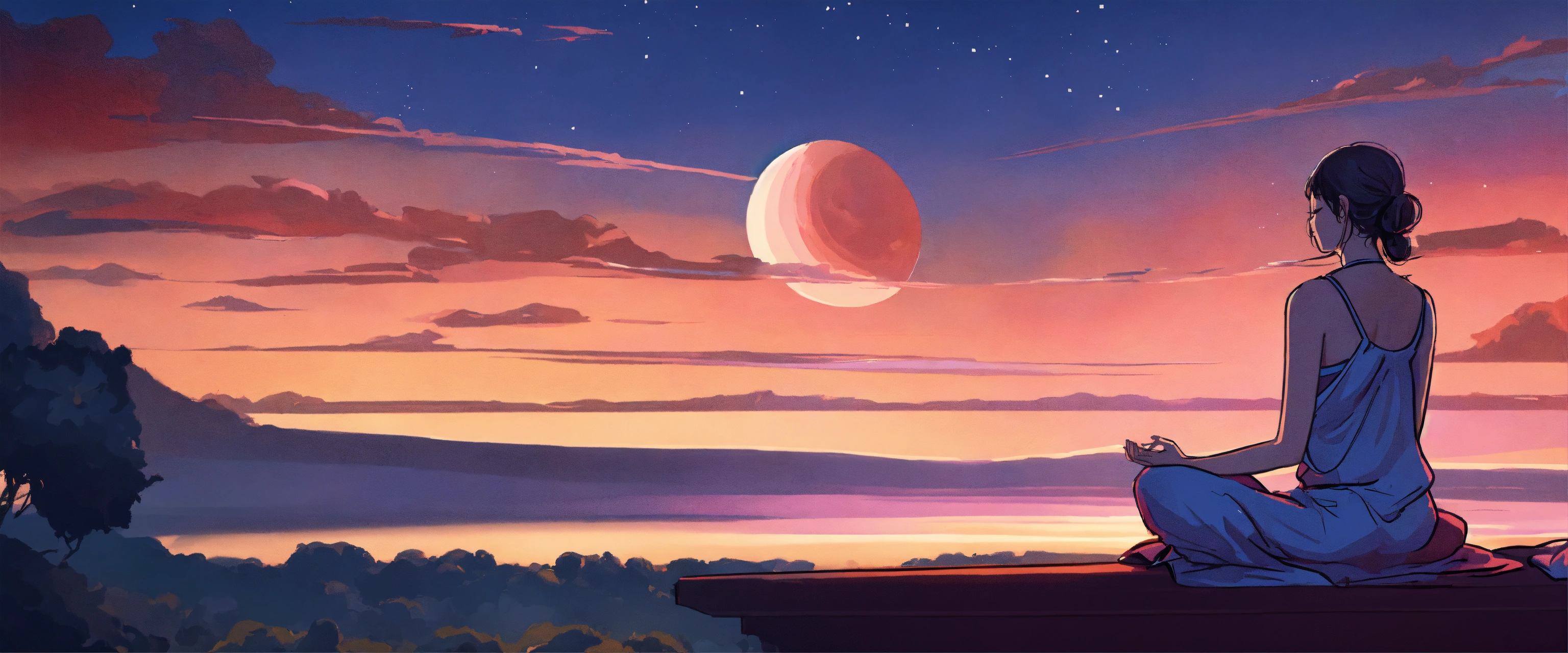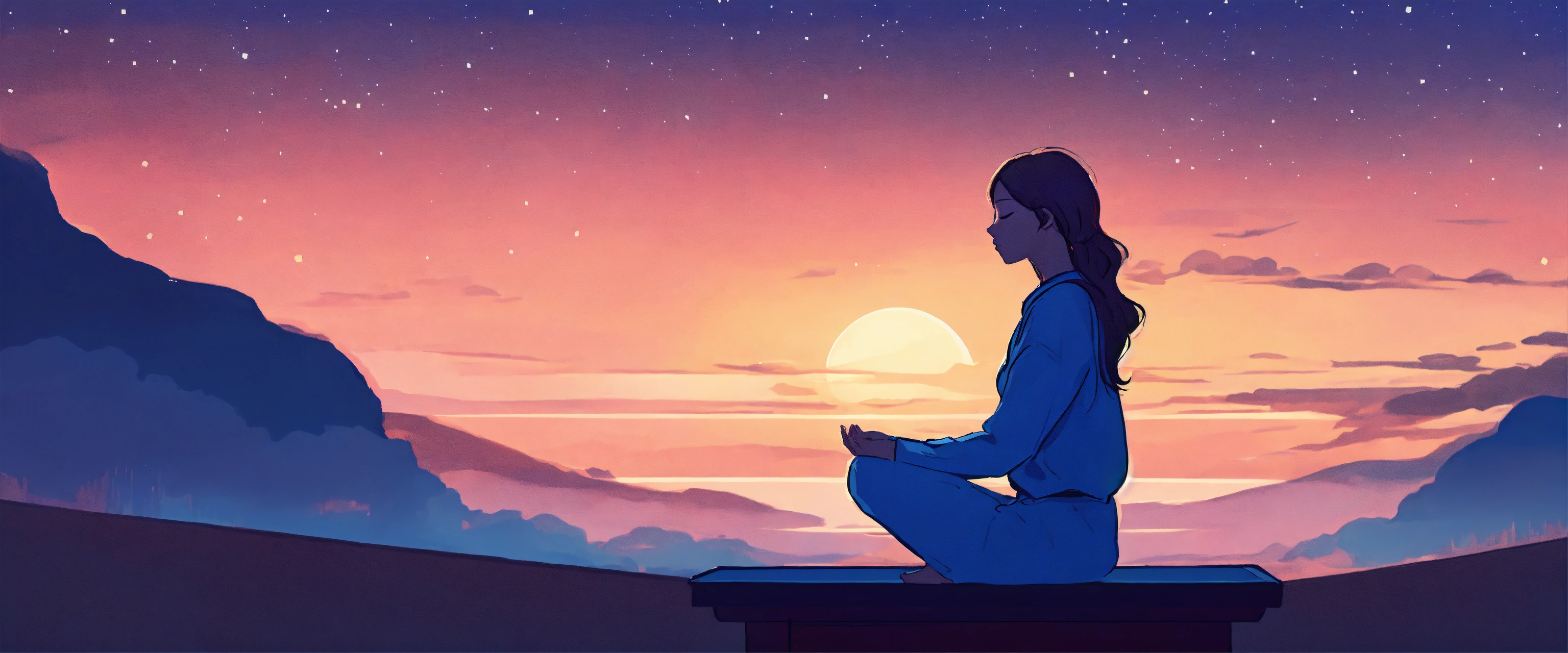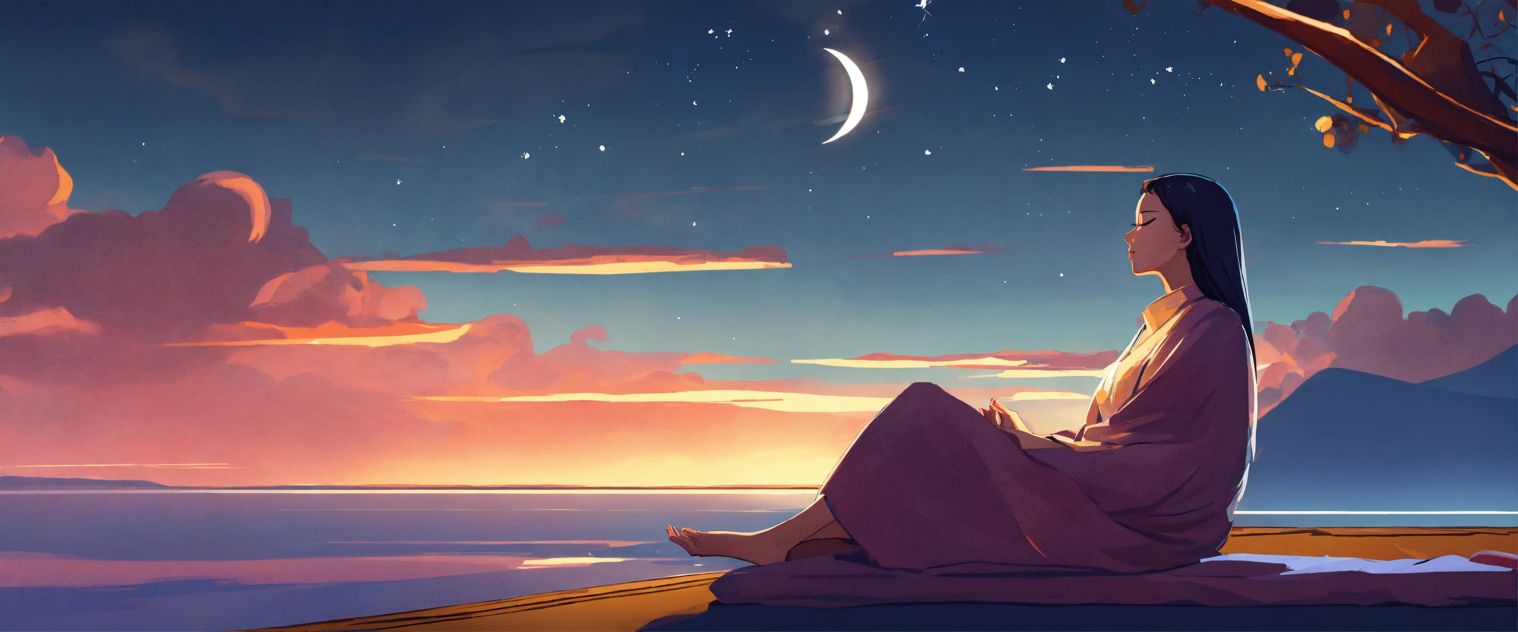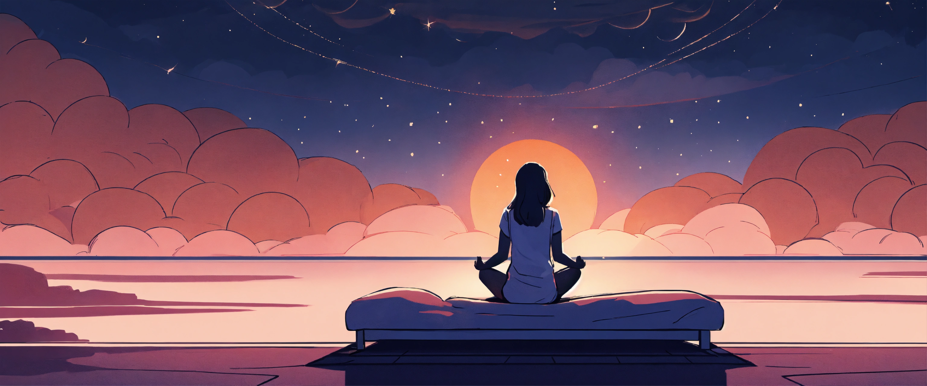 Beautiful painting of female sitting on her bed and meditating with closed eyes sky night, illustration, simple, smooth and clean vector illustration, no jagged lines, vector art, smooth, artstation