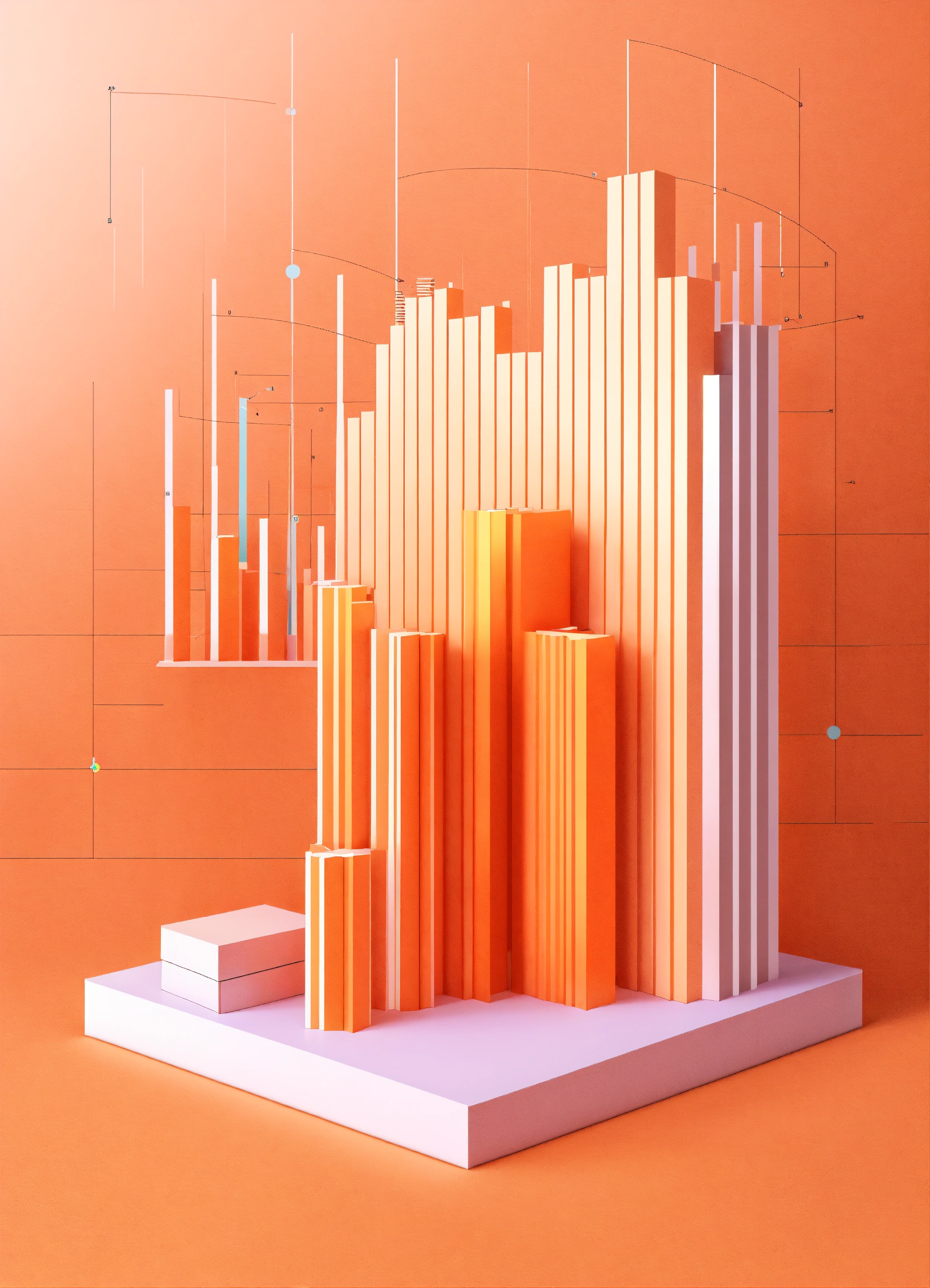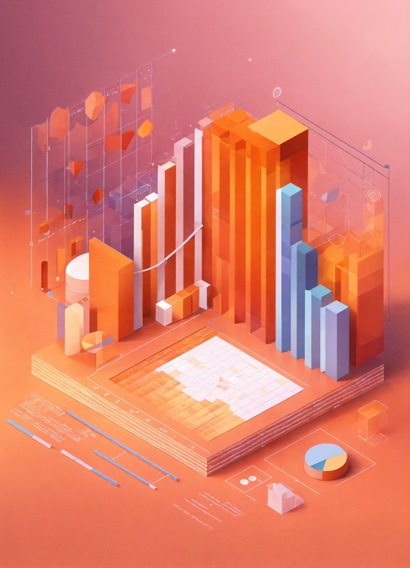 A vector style graph concept in 3d, light colours, light orange colour, soft, pastel, bar charts, pie charts, visualization, line graph