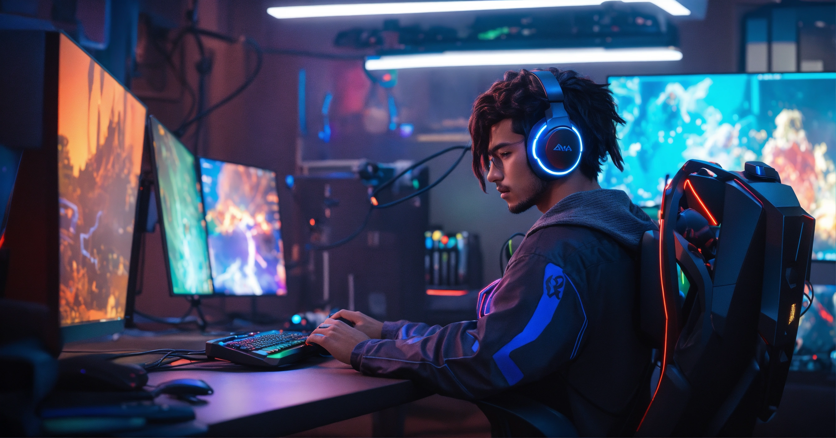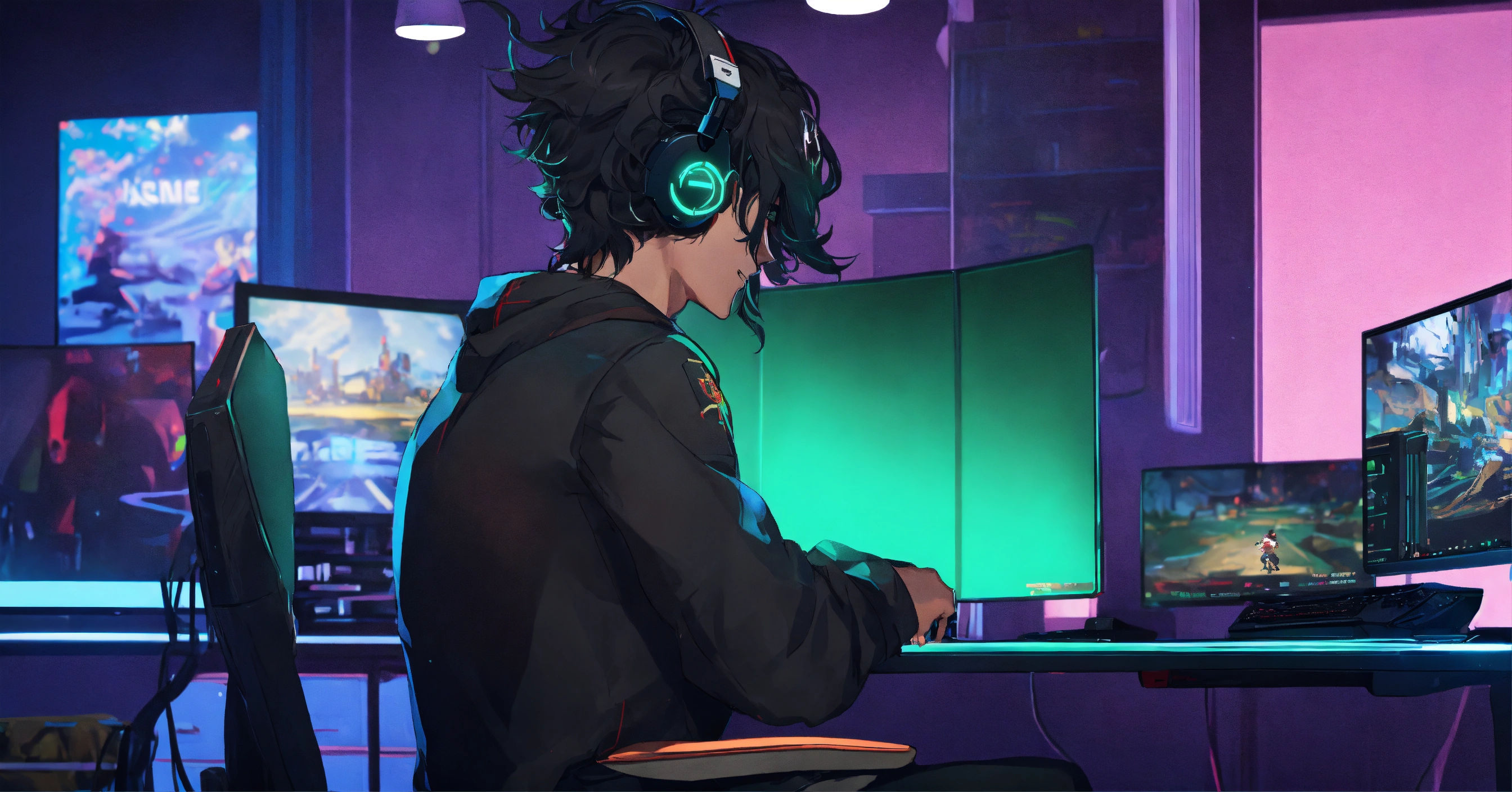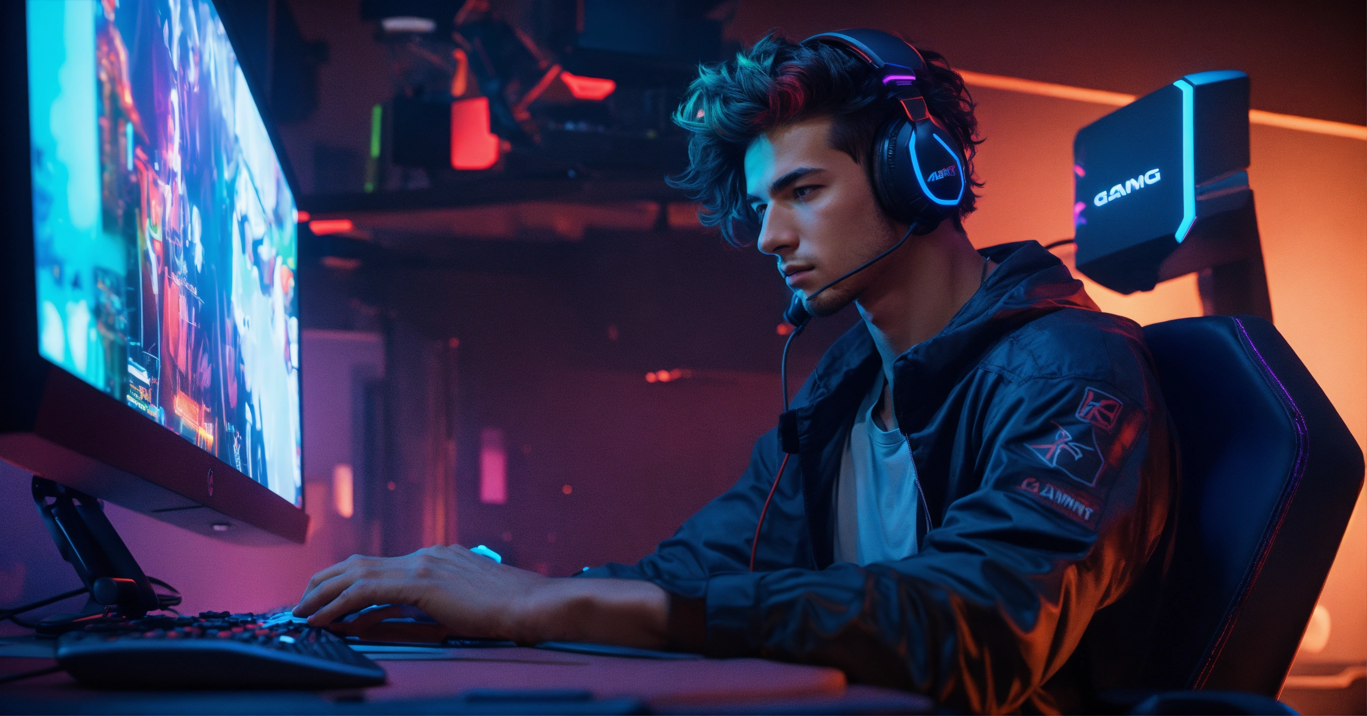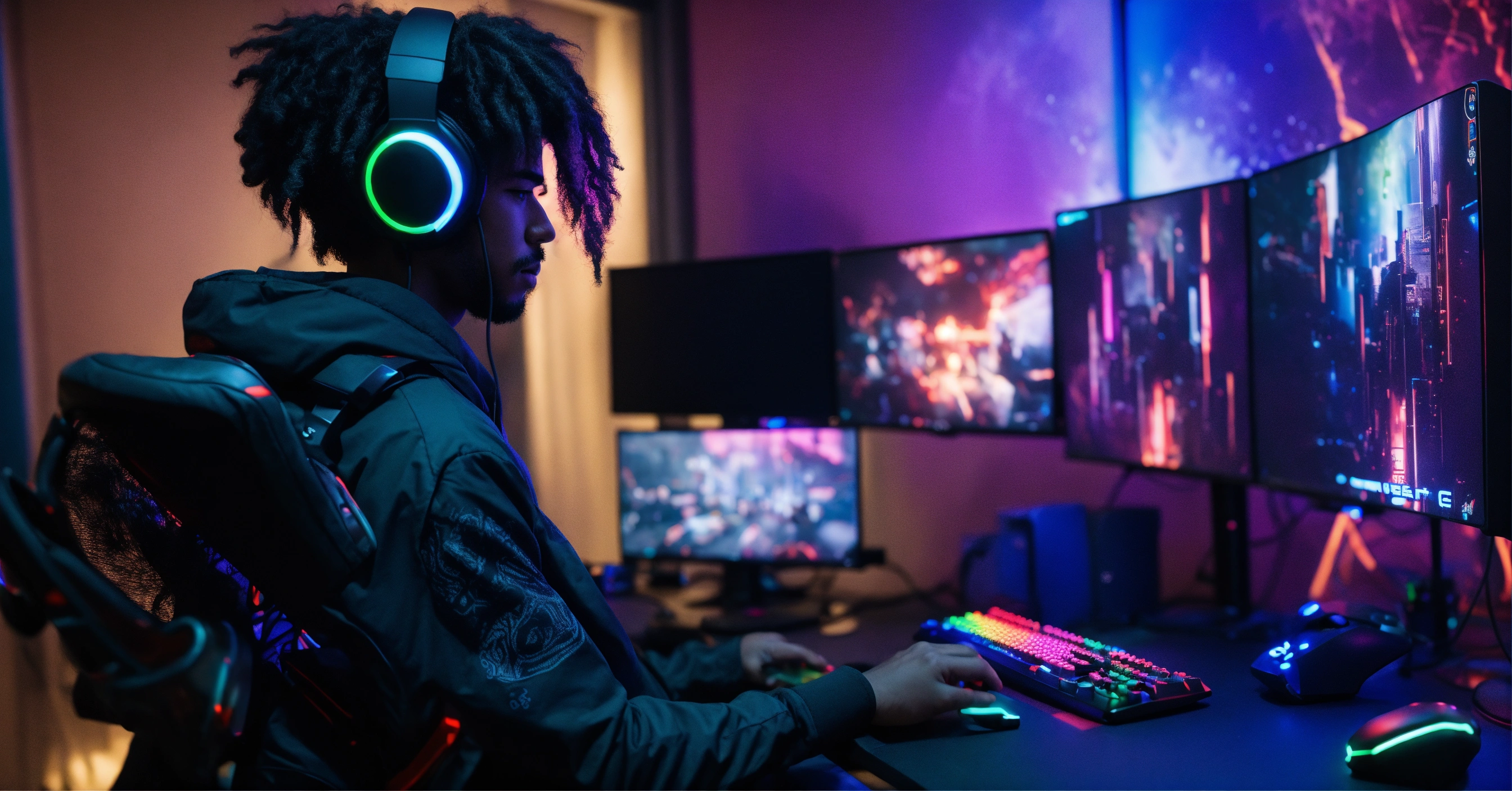 Un jeune homme noir métisser avec des cheveux long nattés, gamer assit devant son bureau gaming rgb en réalité augmentée anime