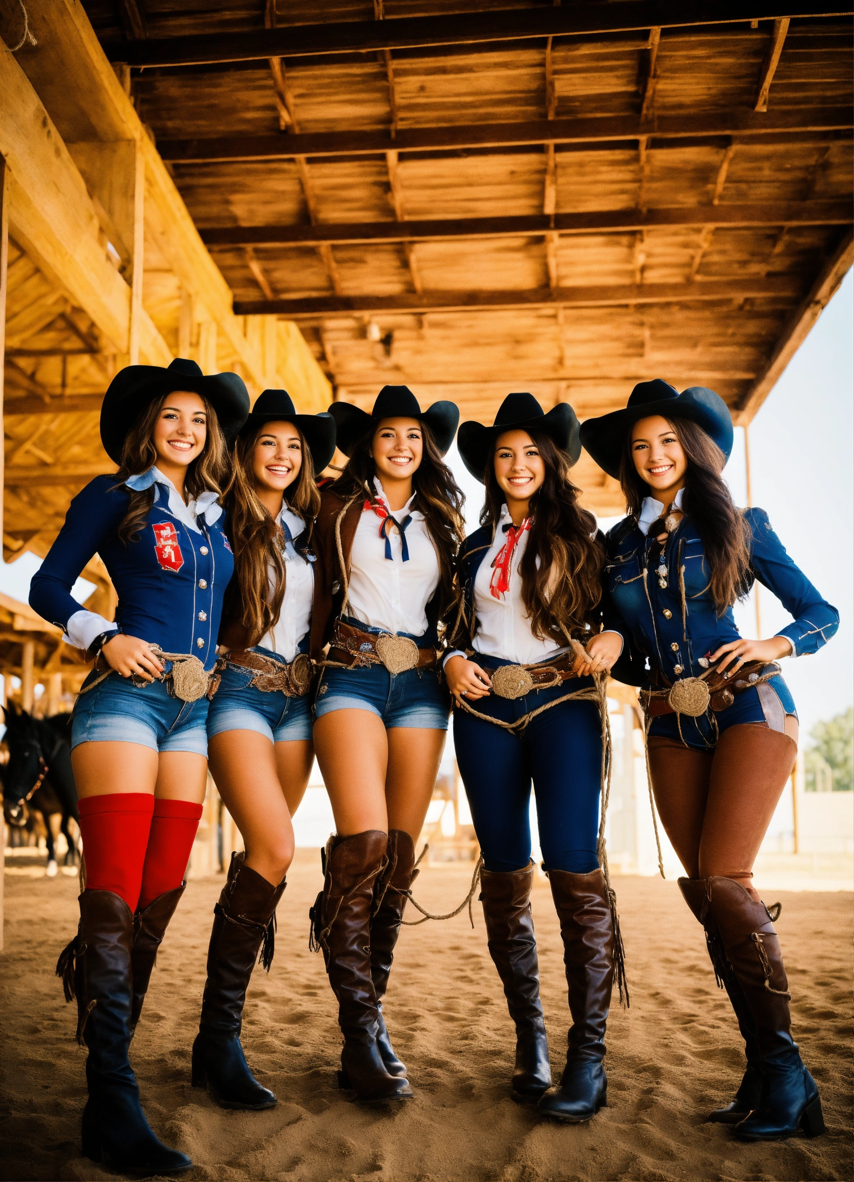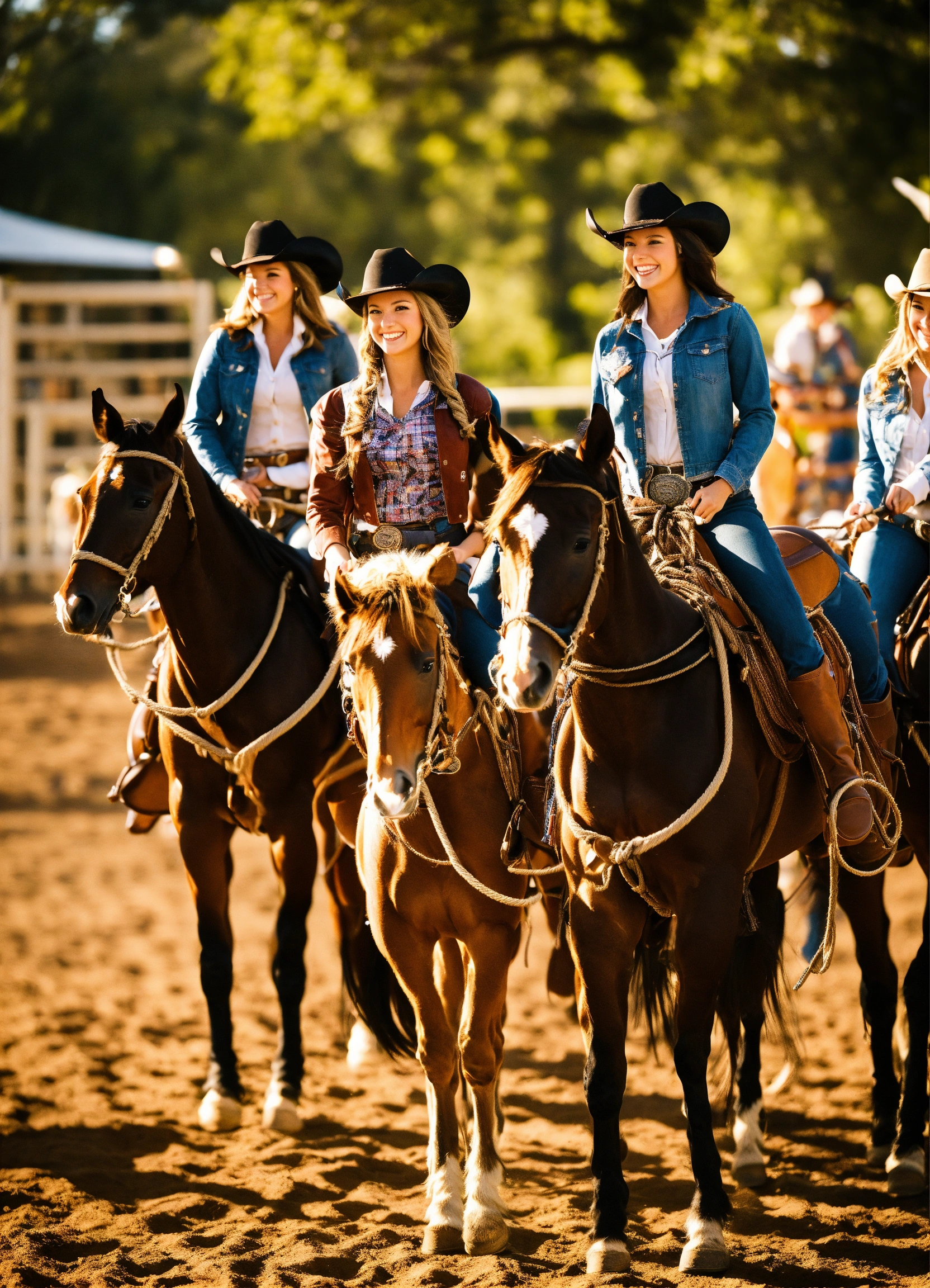 Group of chic college girls, 19, female, shiny rubber cowgirl costumes, horseback, from a low angle, grins, rodeo ring, holding lassos, ropes, riding