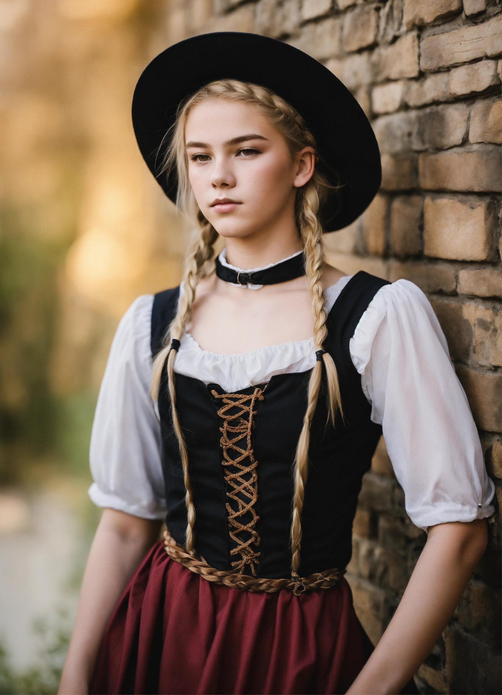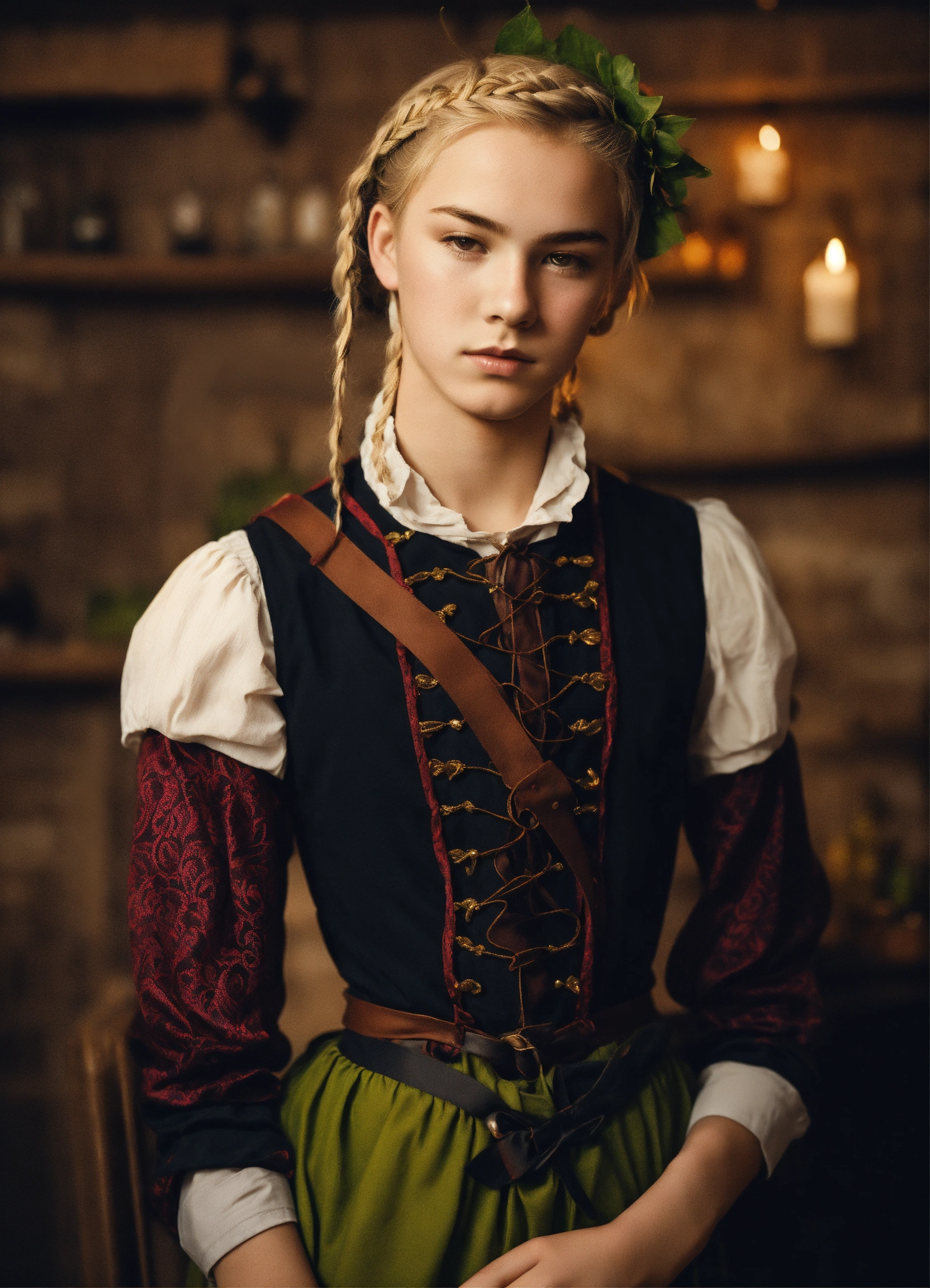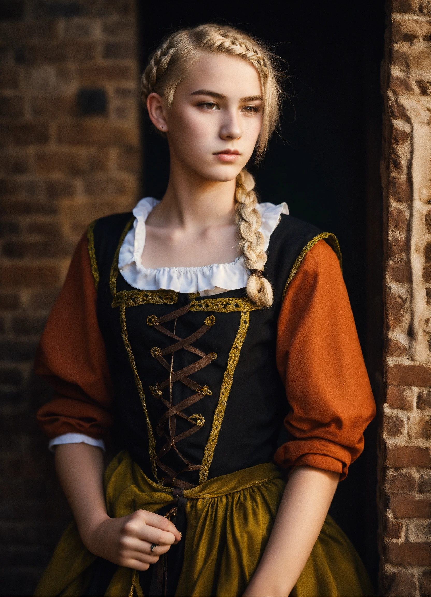 A slender genderqueer 15-year-old boy wearing a medieval barmaid oufit, feminine features, curvacious silhouette, graceful posture, makeup, braided blonde hair