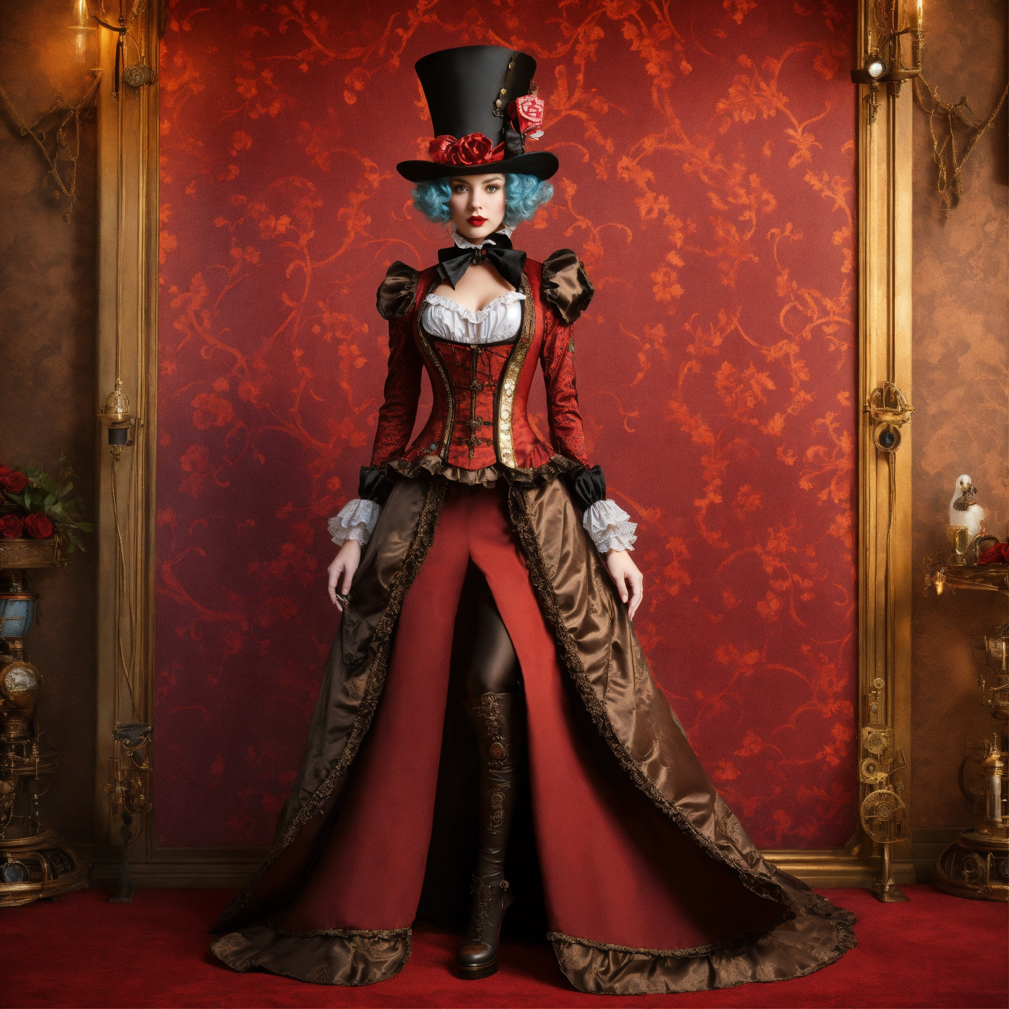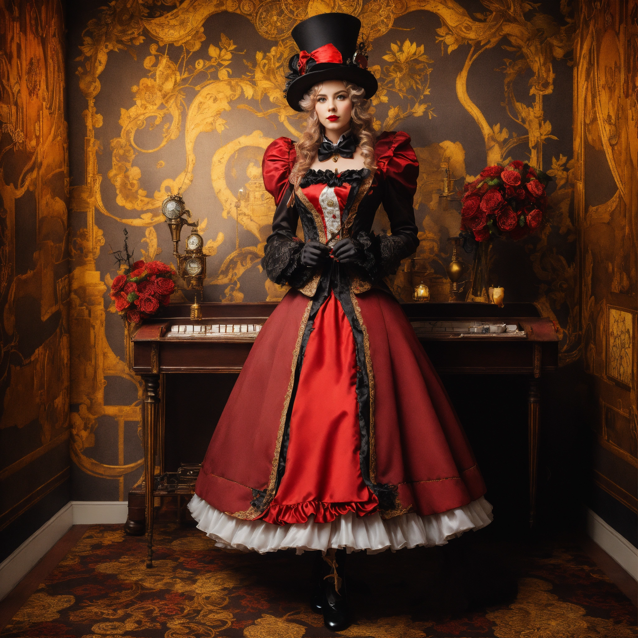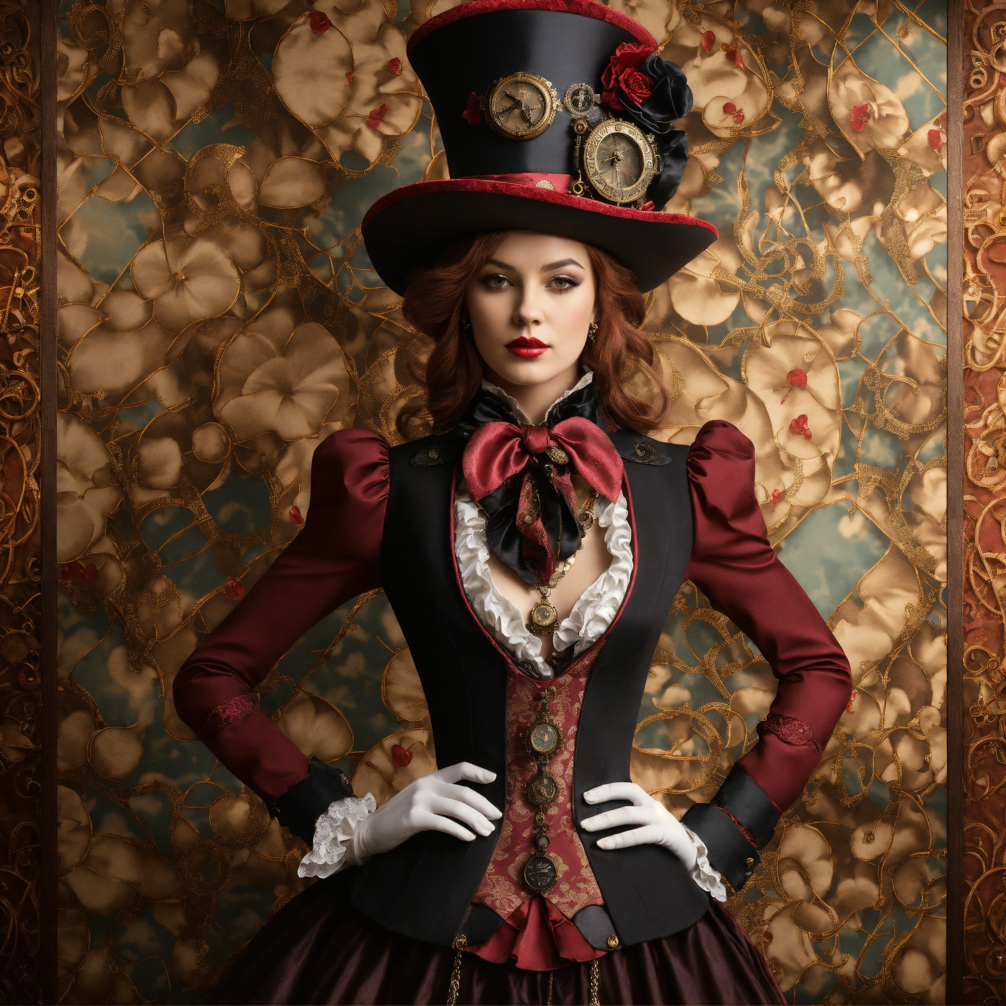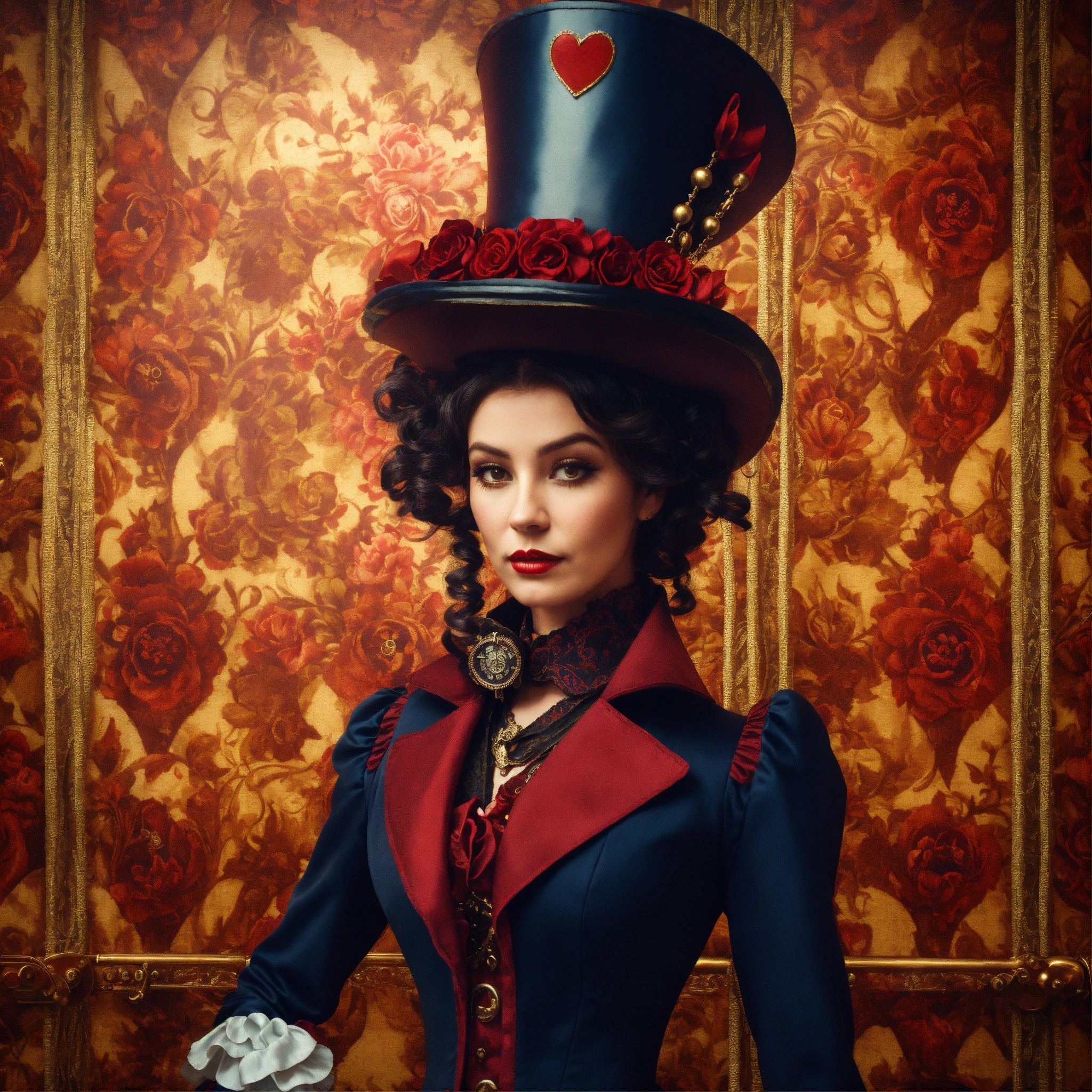 Antagonist queen of hearts with an elegant and intricate steampunk mad hatter's yea party costume, victorian background with patterned wallpaper, 3d, 32k, photorealistic and details.