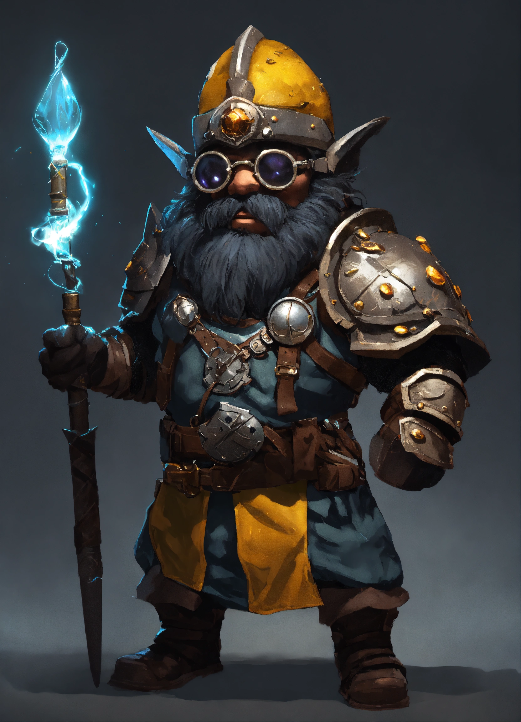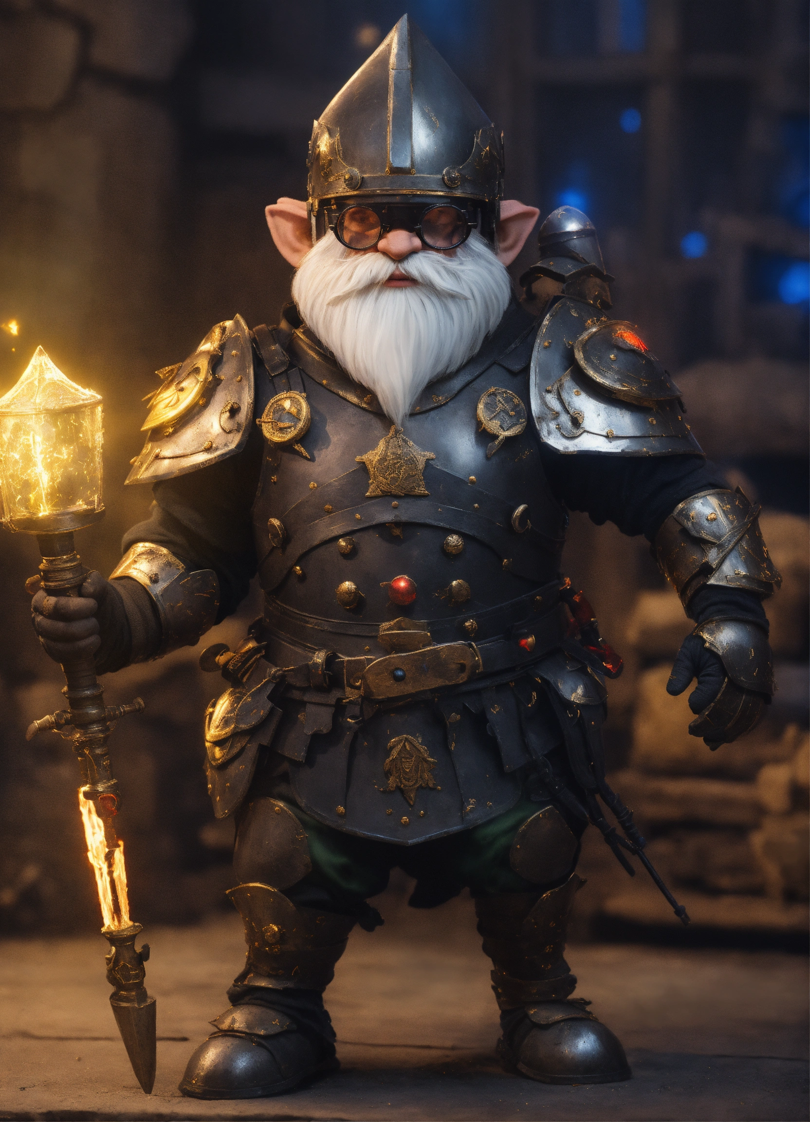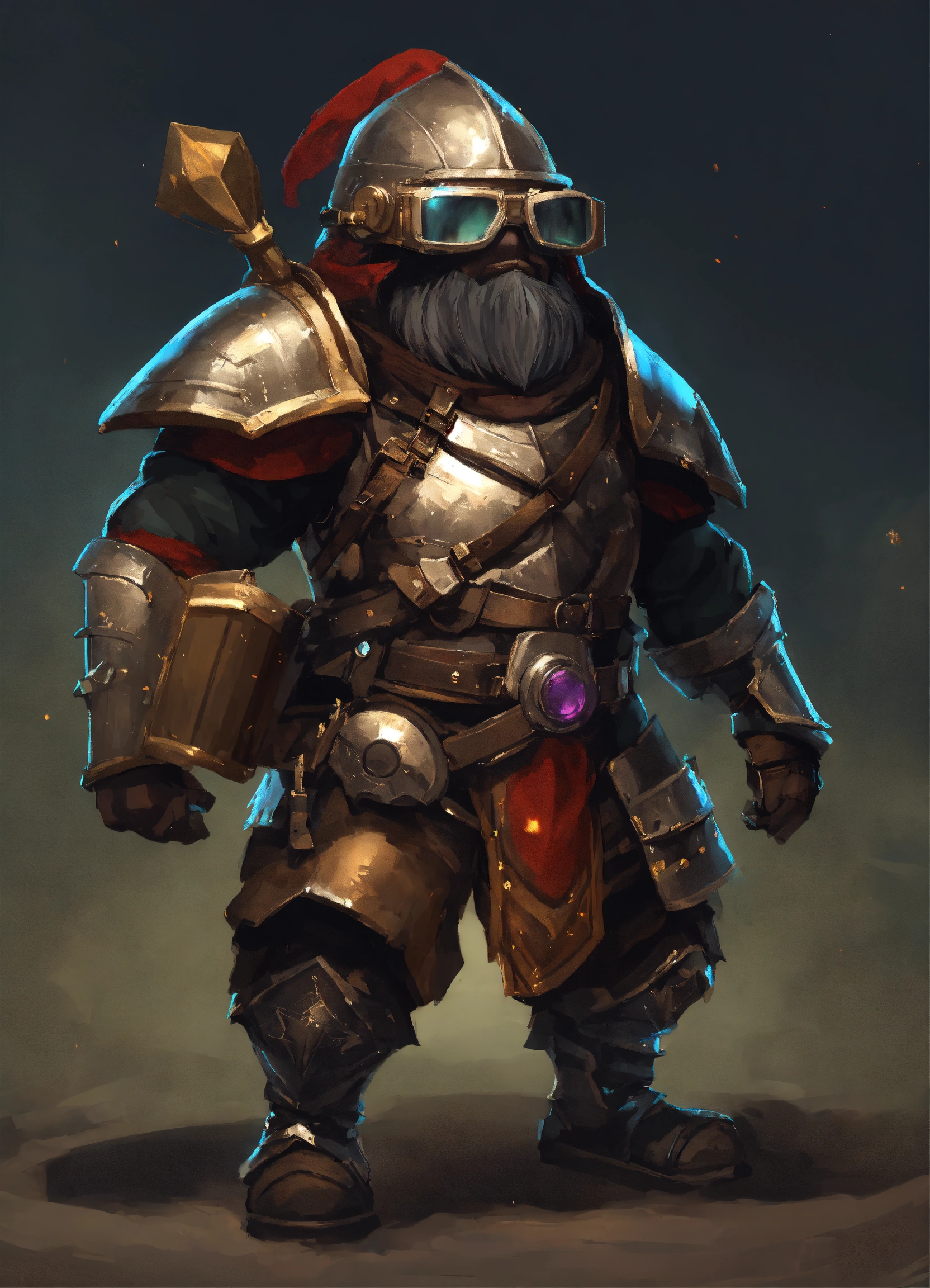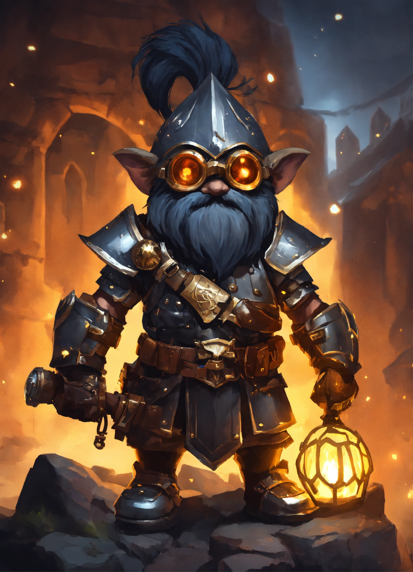 Armorer artificer rock gnome with big dark head and glasses with black skin, on a heavy dark magical homemade armor, magic pulsing through the armor, wearing black medieval visor on a helmet, combat breastplate, heavy armor like a medieval exoskeleton, empty handed with electric gauntlets, boxer pose, gauntlet with electricity