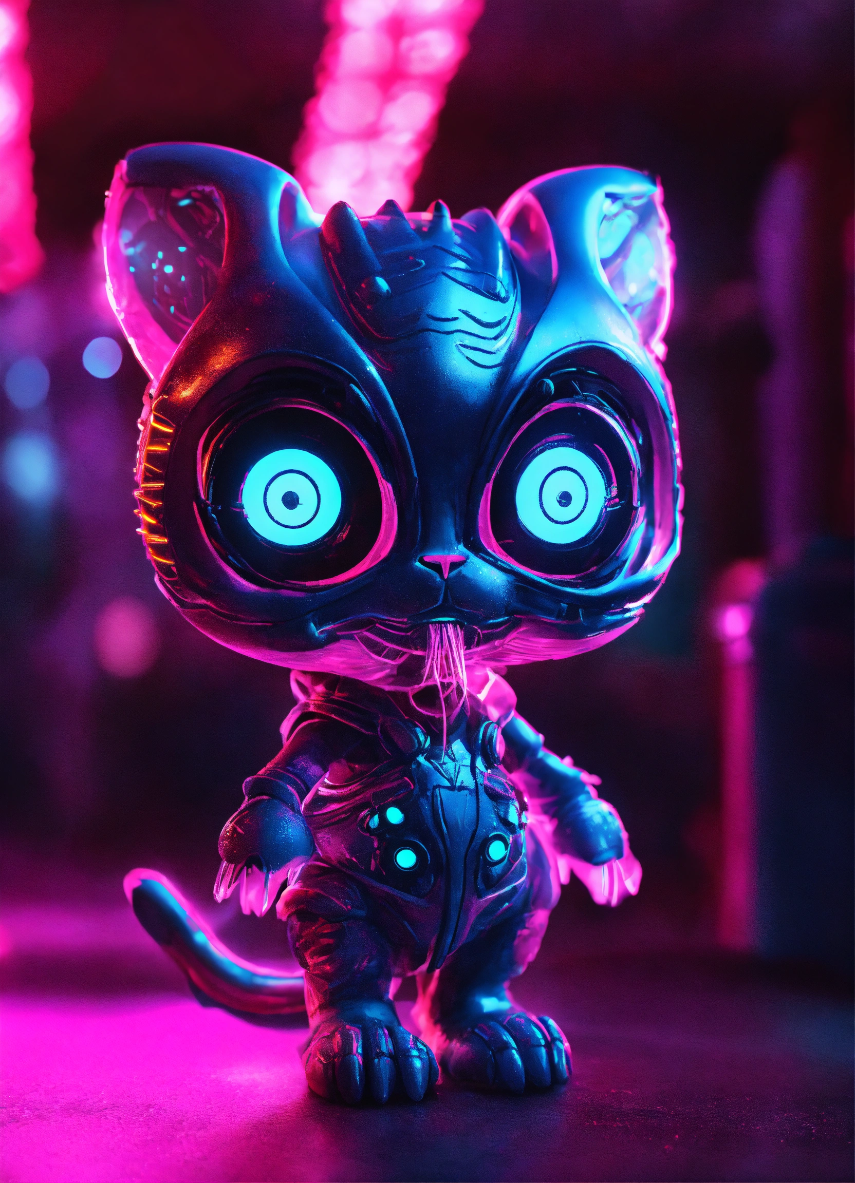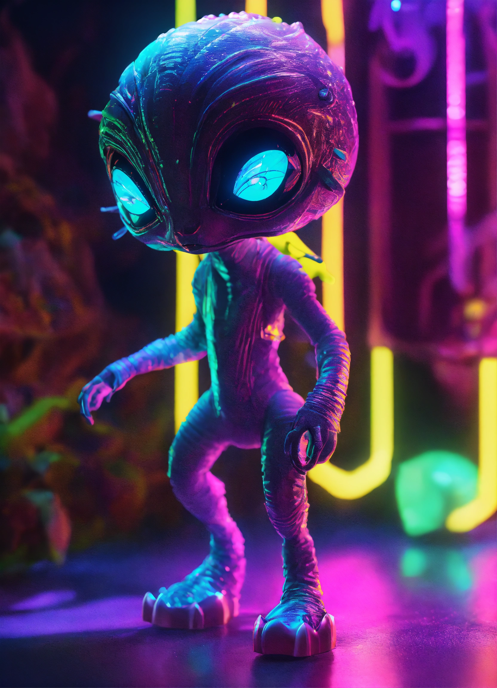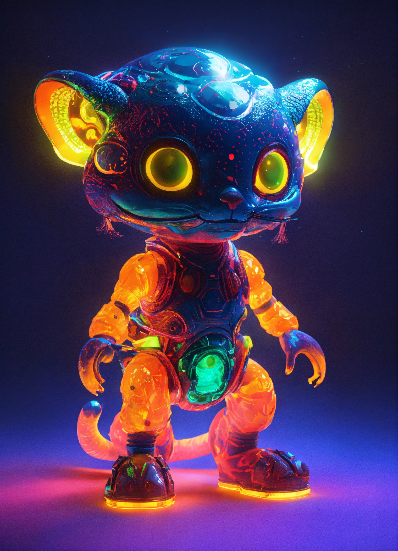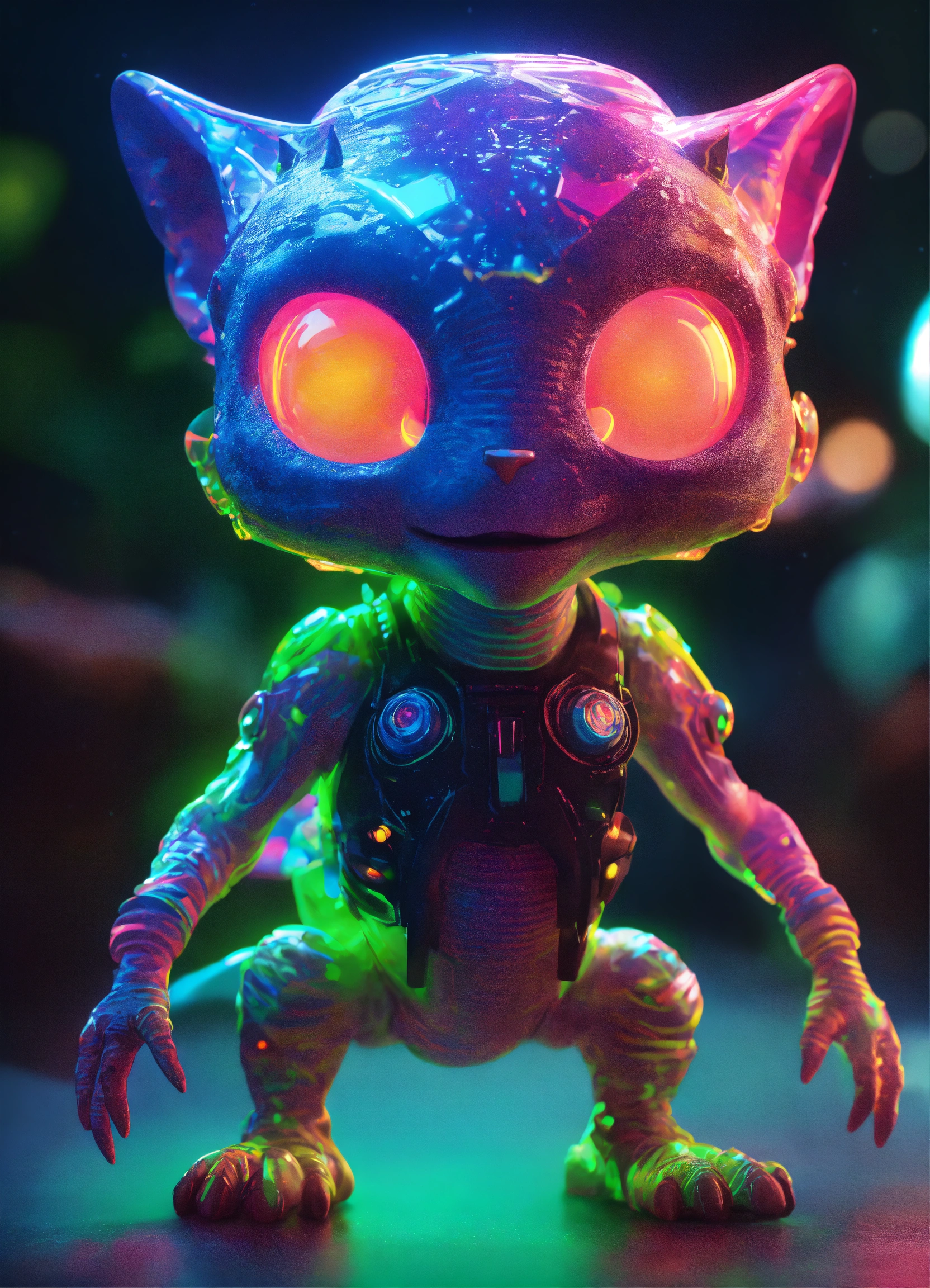 Gelly cute alien monster, full-body, neon glow colors, highly intricate details, 3d, cgi, realistic light, trending on cgsociety, glowing eyes, facing camera, neon details, ultra realistic details, portrait, sci fi atmosphere, global illumination, shadows, octane render, 8 k, ultra sharp, cat skulp, no whiskas, no fur, friendly
