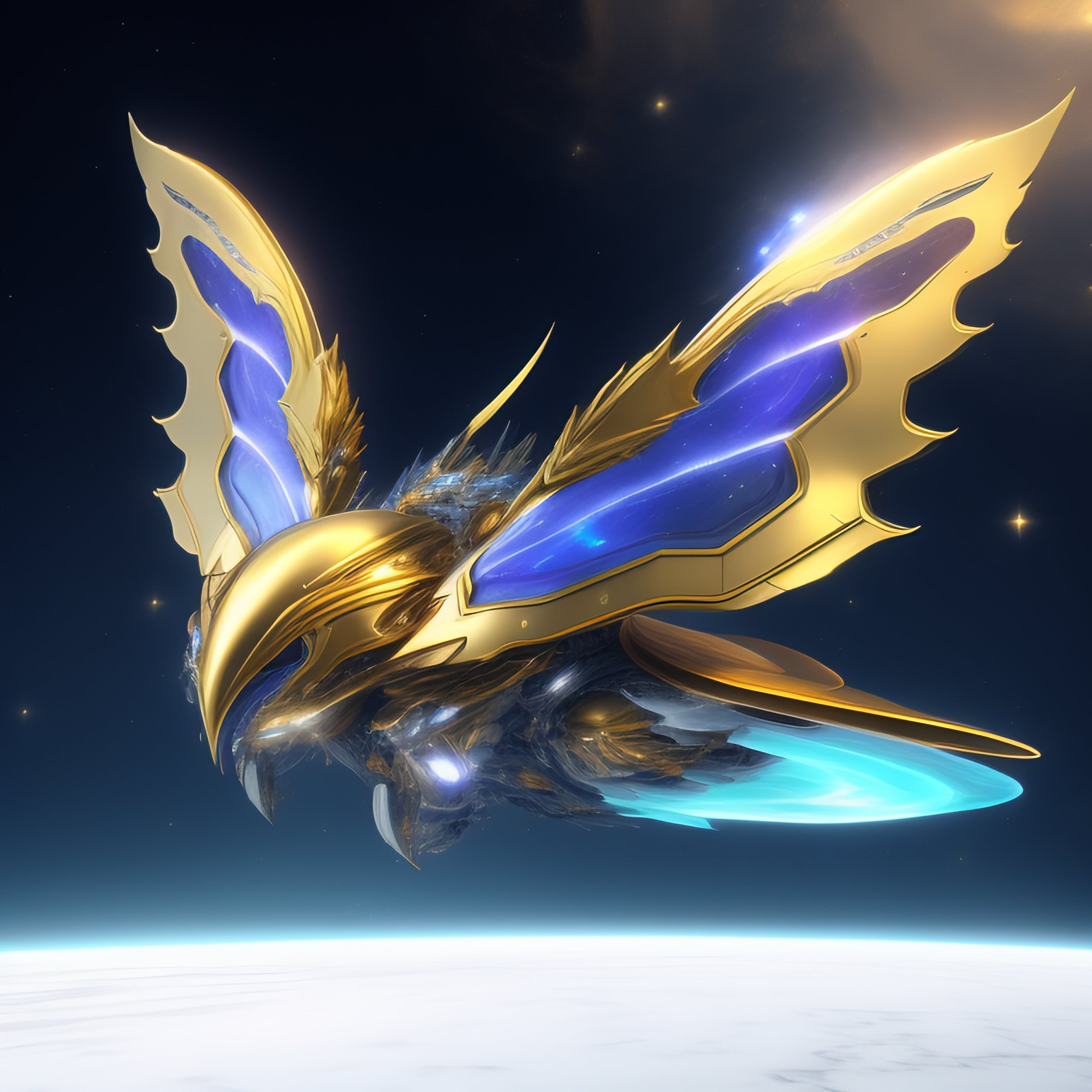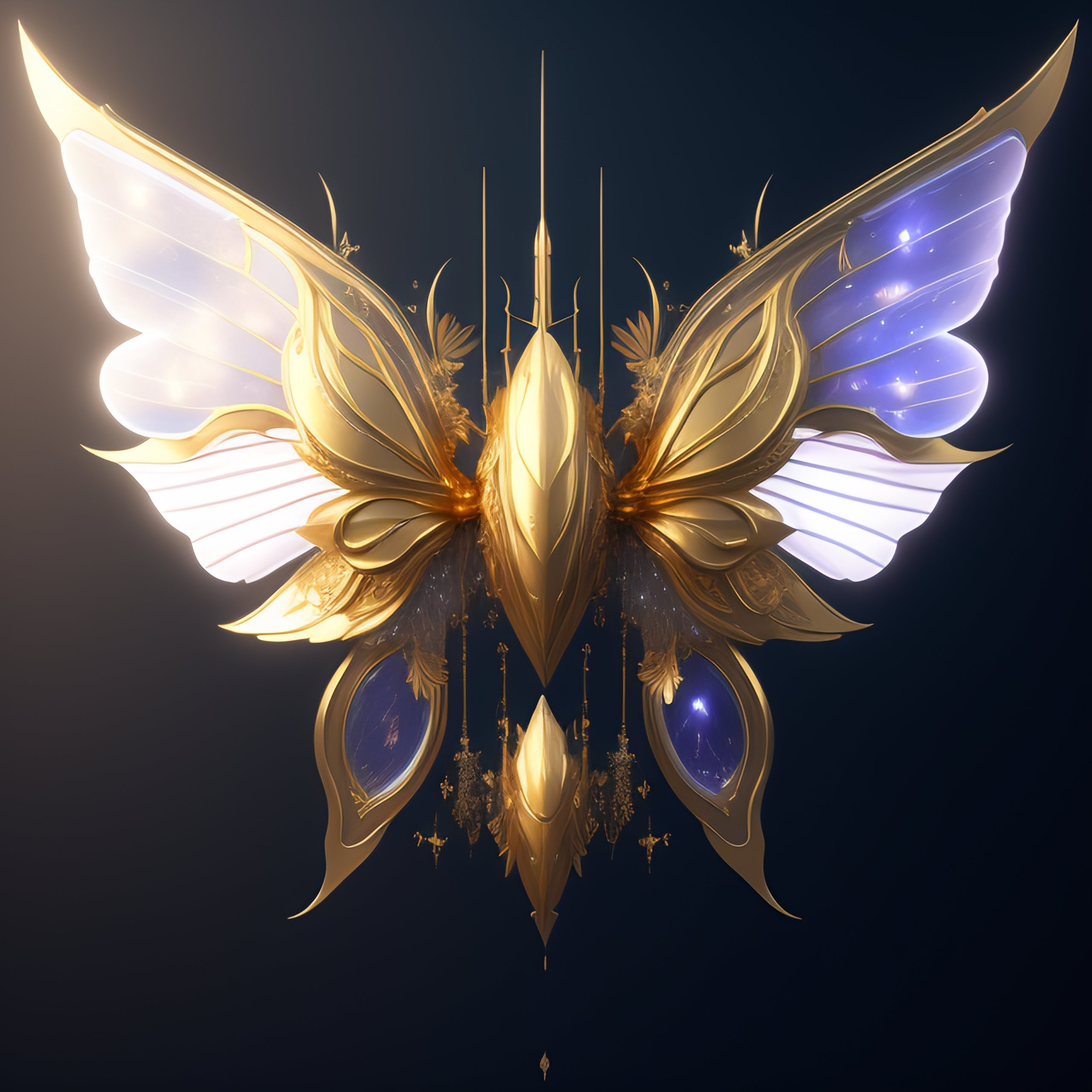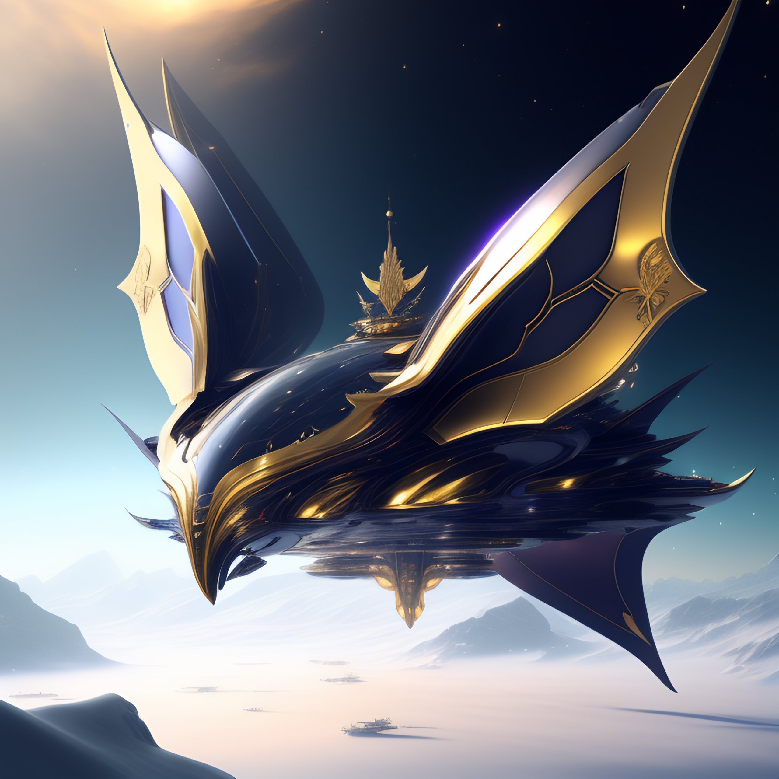 A giant spaceship with butterfly wings made of ice and gold floating in space by warframe orokin