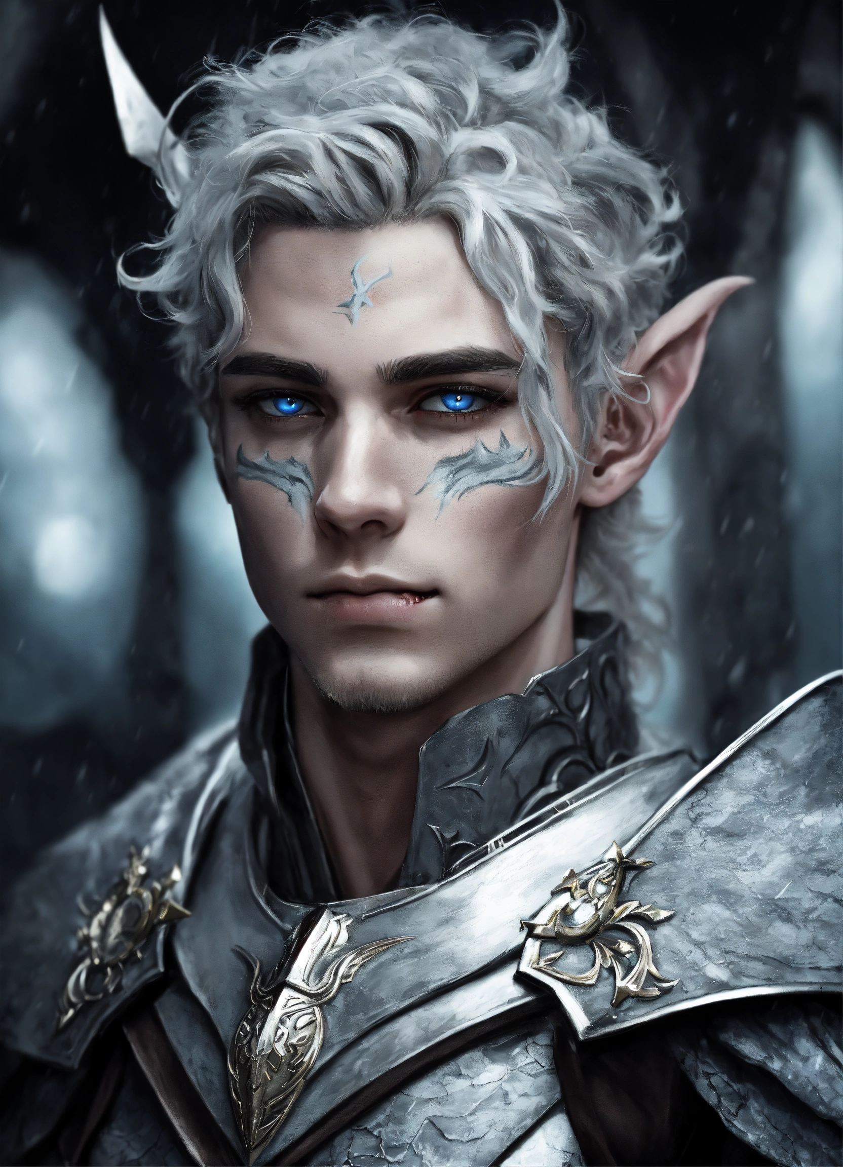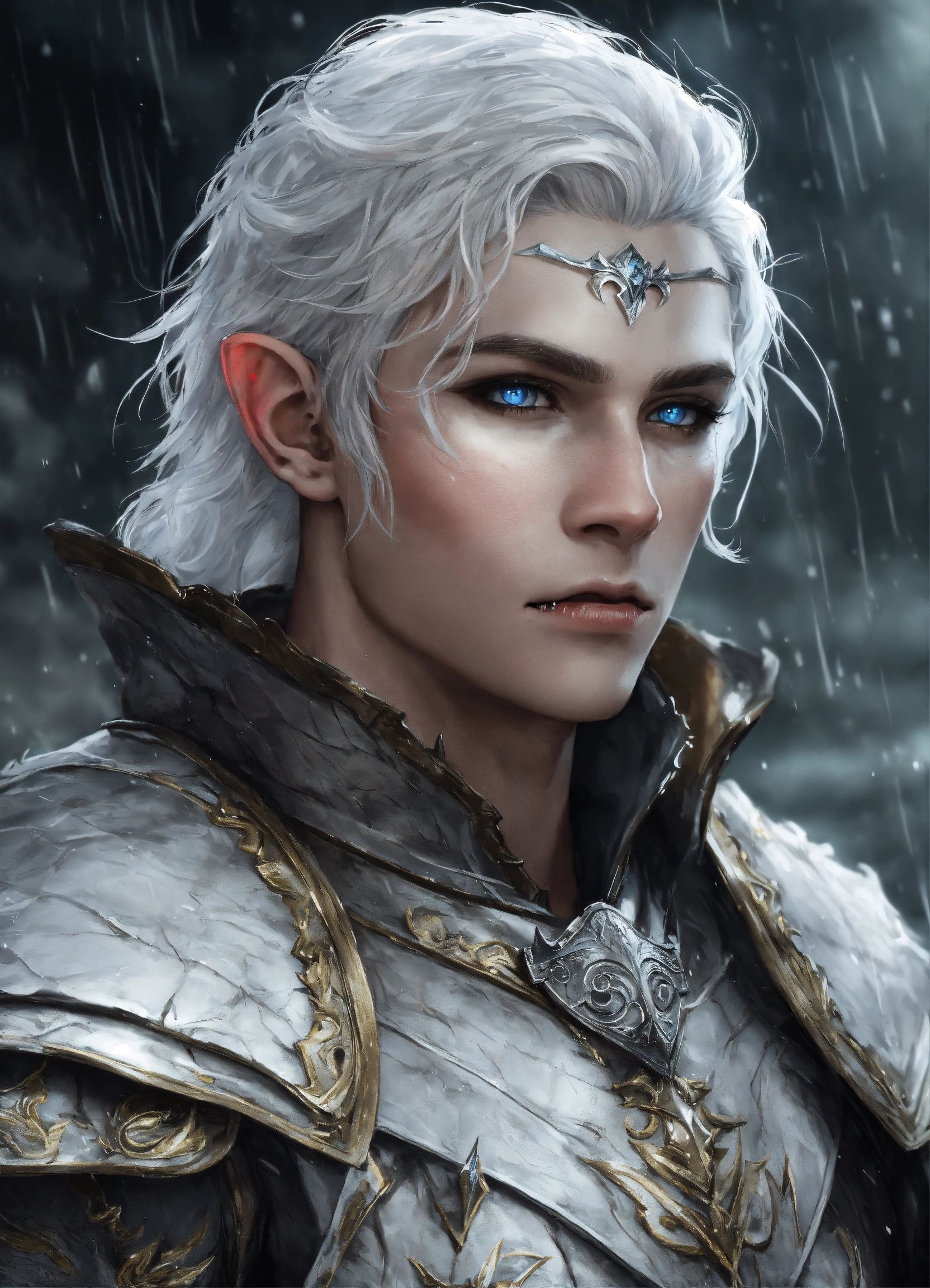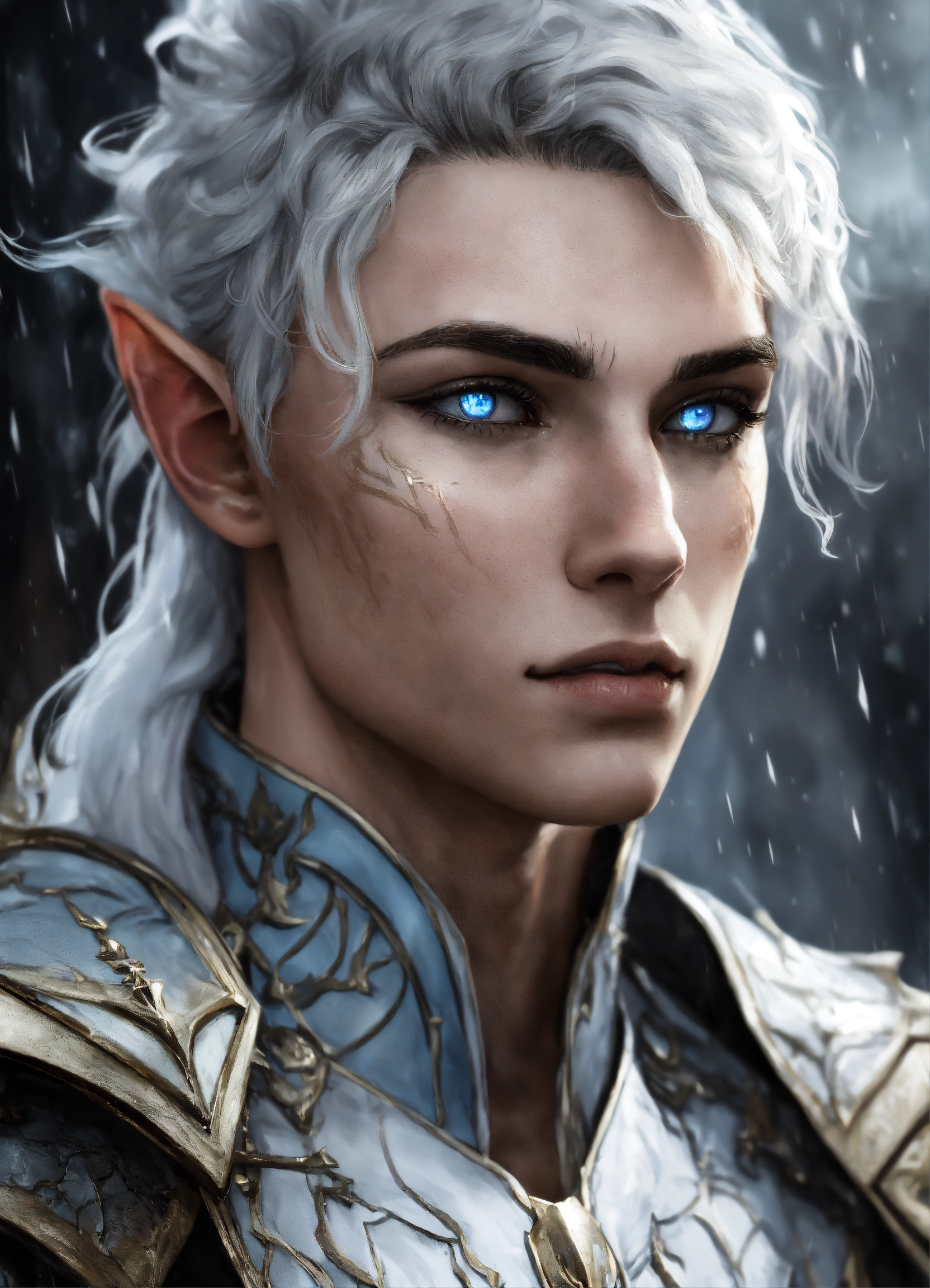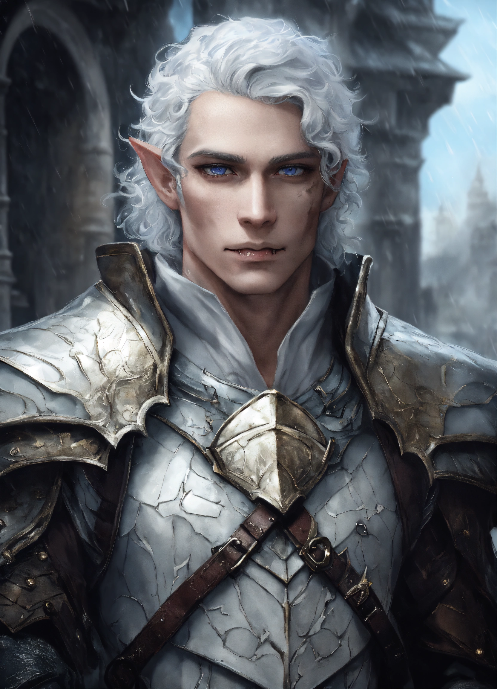 Fantasy portrait of a ash-grey skinned elf, masculine, androgynous, white sorecerer, white rogue armor, black cracks throughout the face, black facial scars, asymmetrical features, pale blue eyes, sharp features, sad expression, fangs, soft smile, glowing white curly hair, rainy castle background, ultra detailed