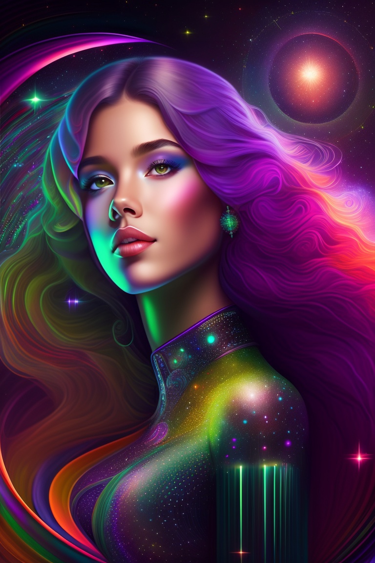 Dmt. entering the fifth dimension. illustration. masterpiece.beautiful girl. she greeted me as i fell in and was laughing. space, stars and planets. colors mainly green, purple, red. in the matrix. fractals, doodles lines