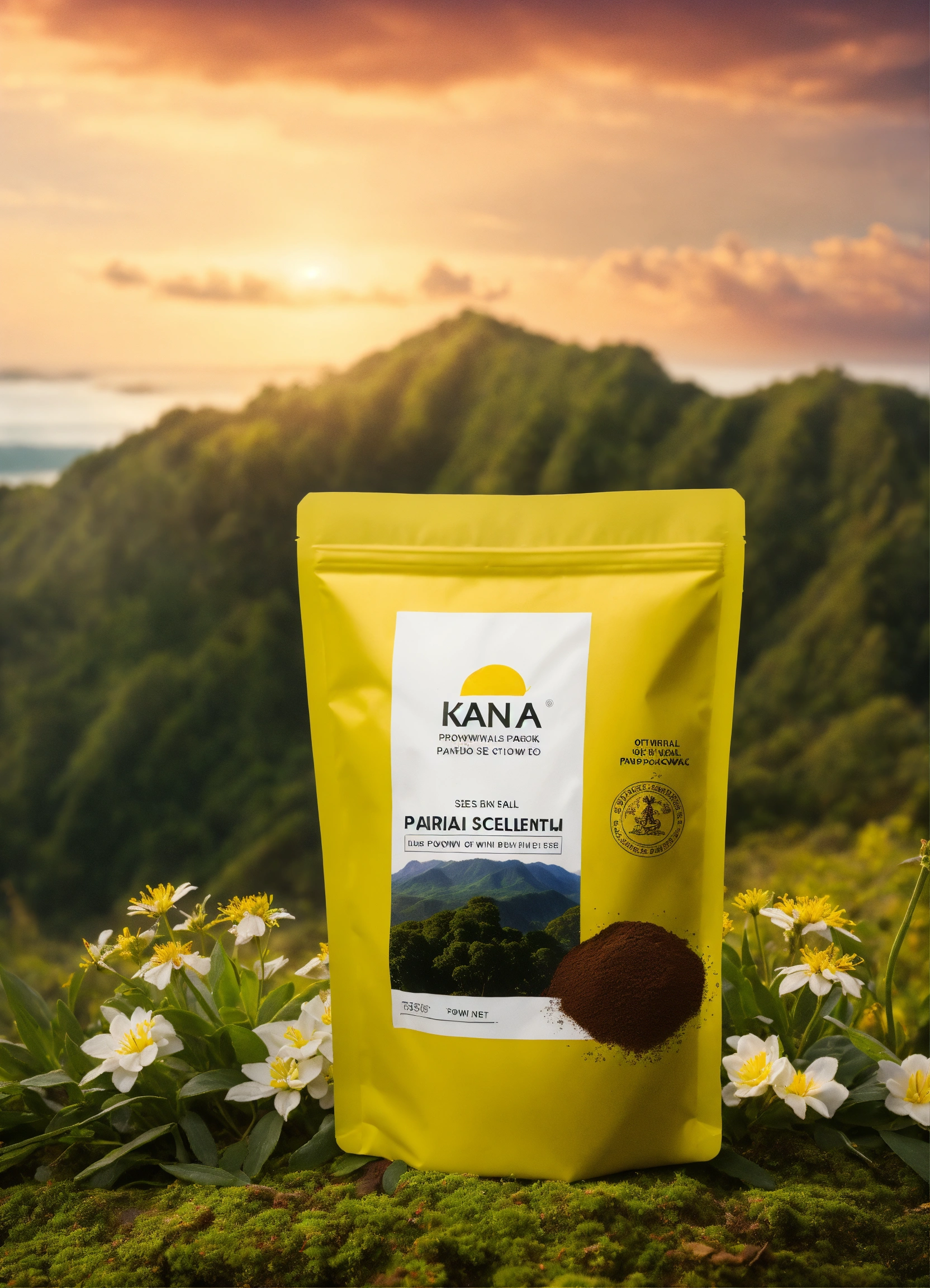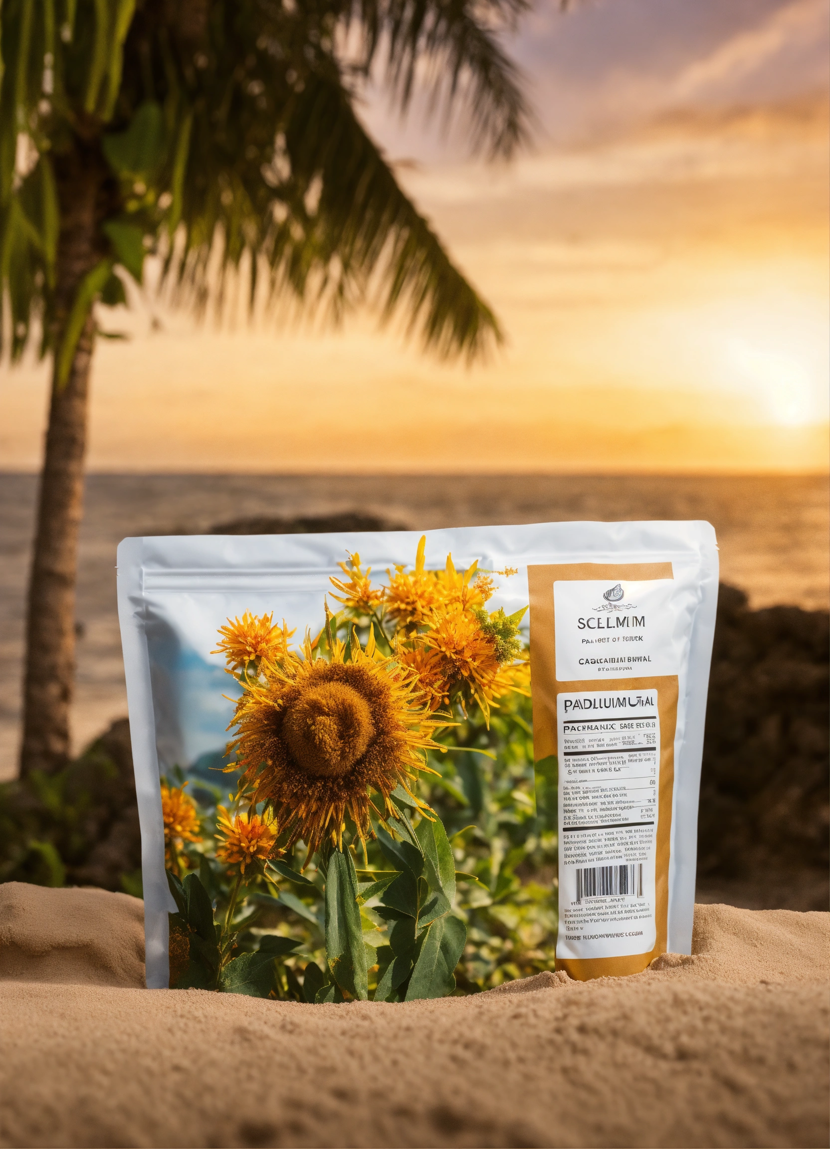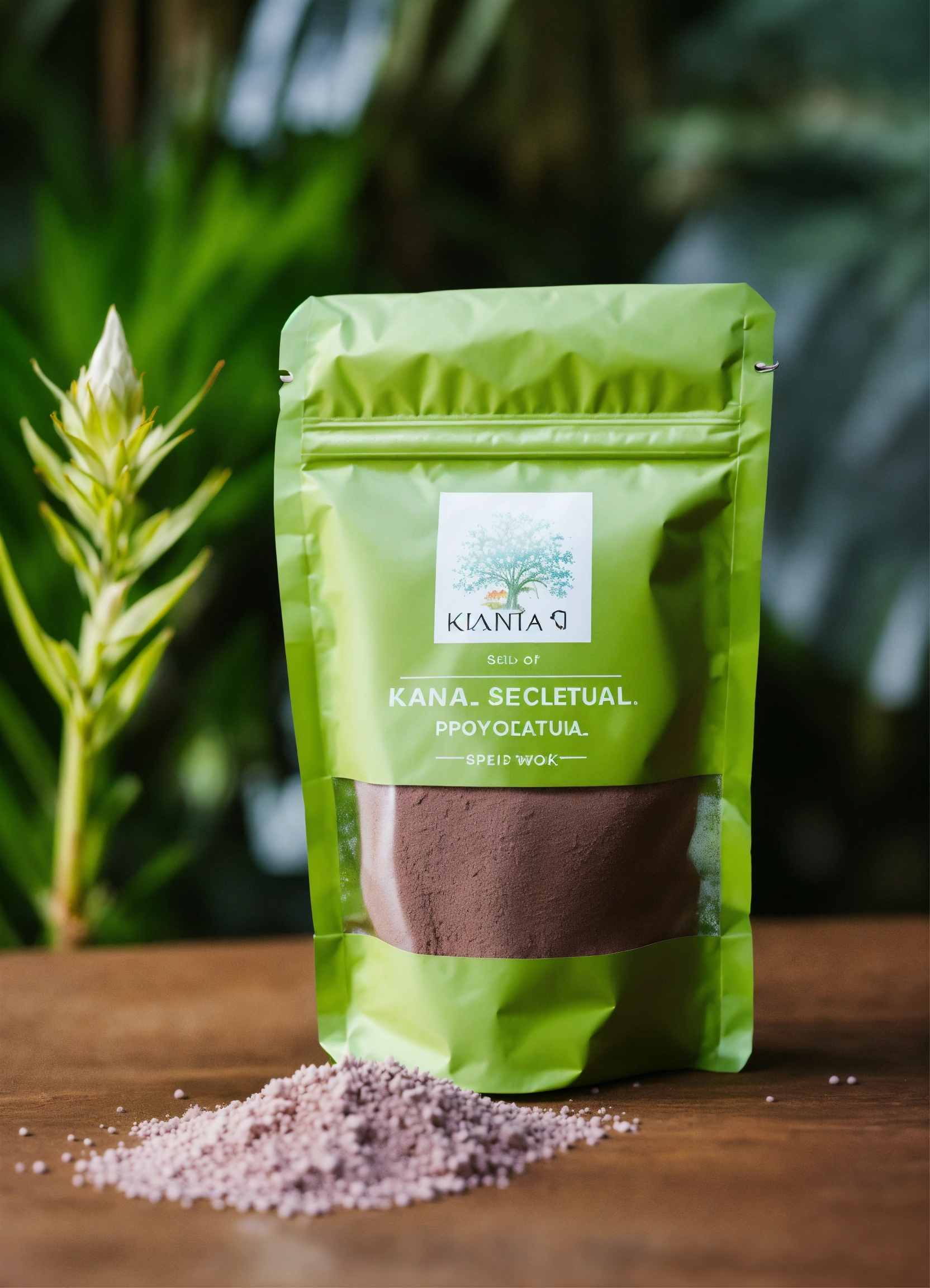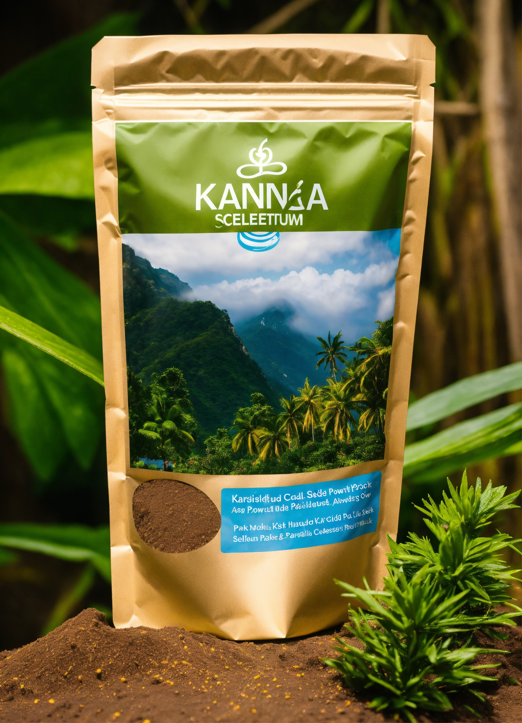 Doypack bag of several set side by side in the foreground, behind a blurred paradisiacal image, and next to doypacks and brown powder from kanna sceletium