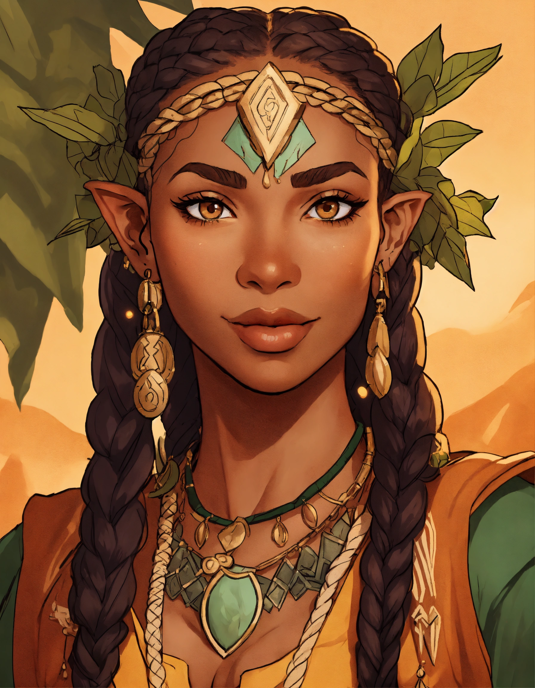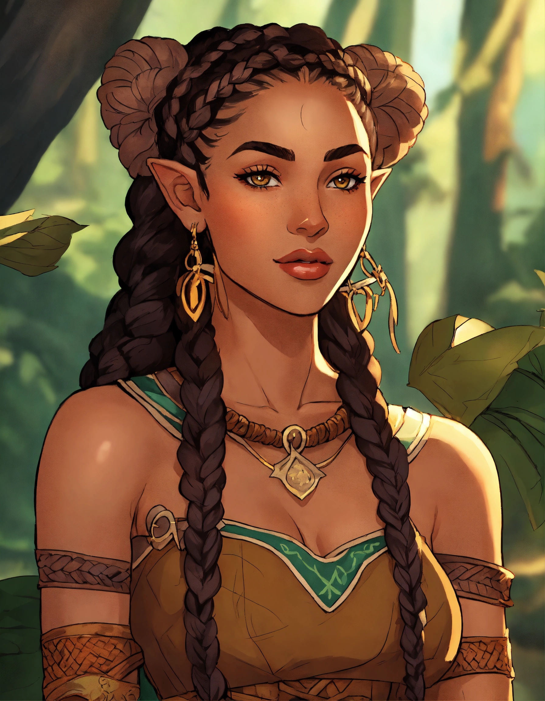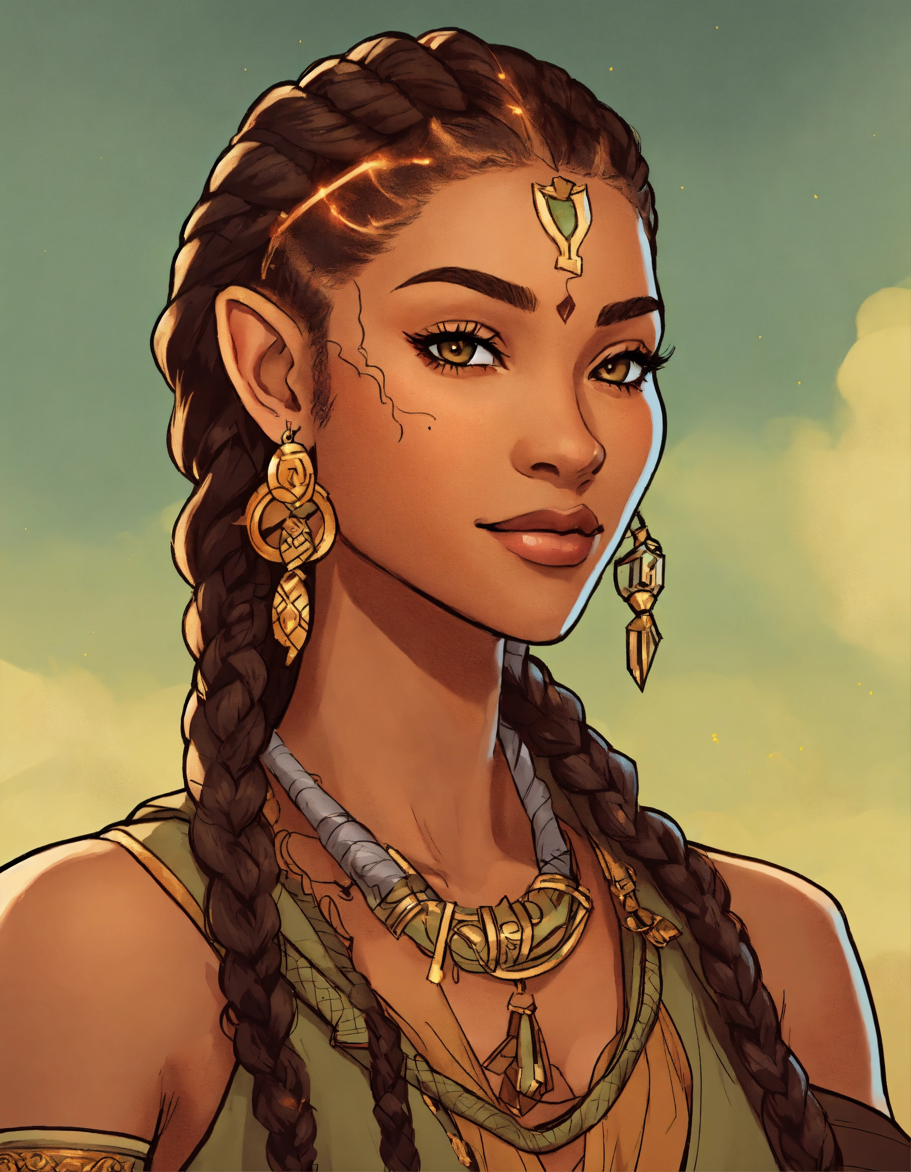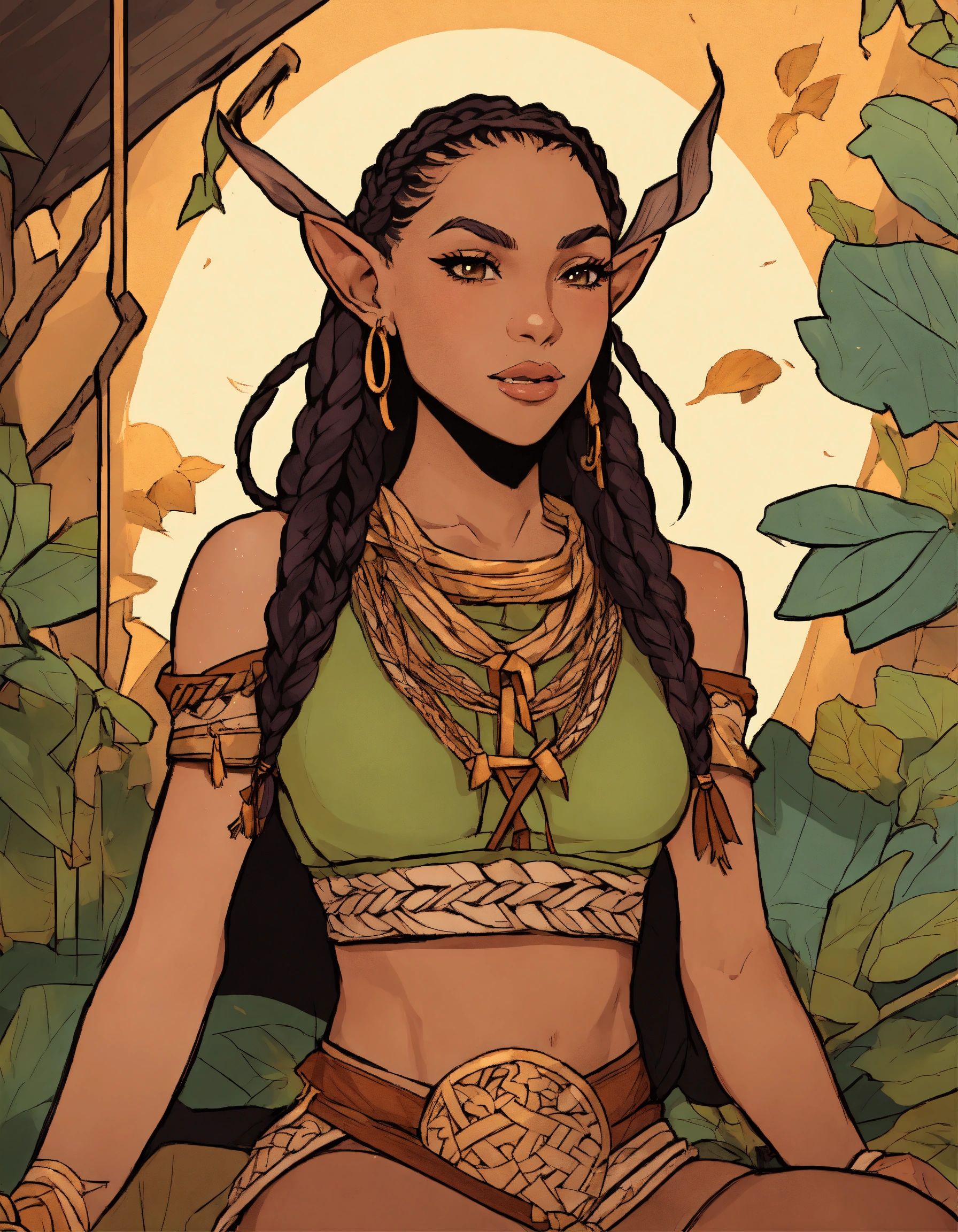 Character art, flat color, bold outlines, a beautiful 30-year-old elf woman, druid, rogue, playful, mischievous, trickster, cornrow hair, braids, tan skin, light brown skin, mixed race, latina and black, high fantasy