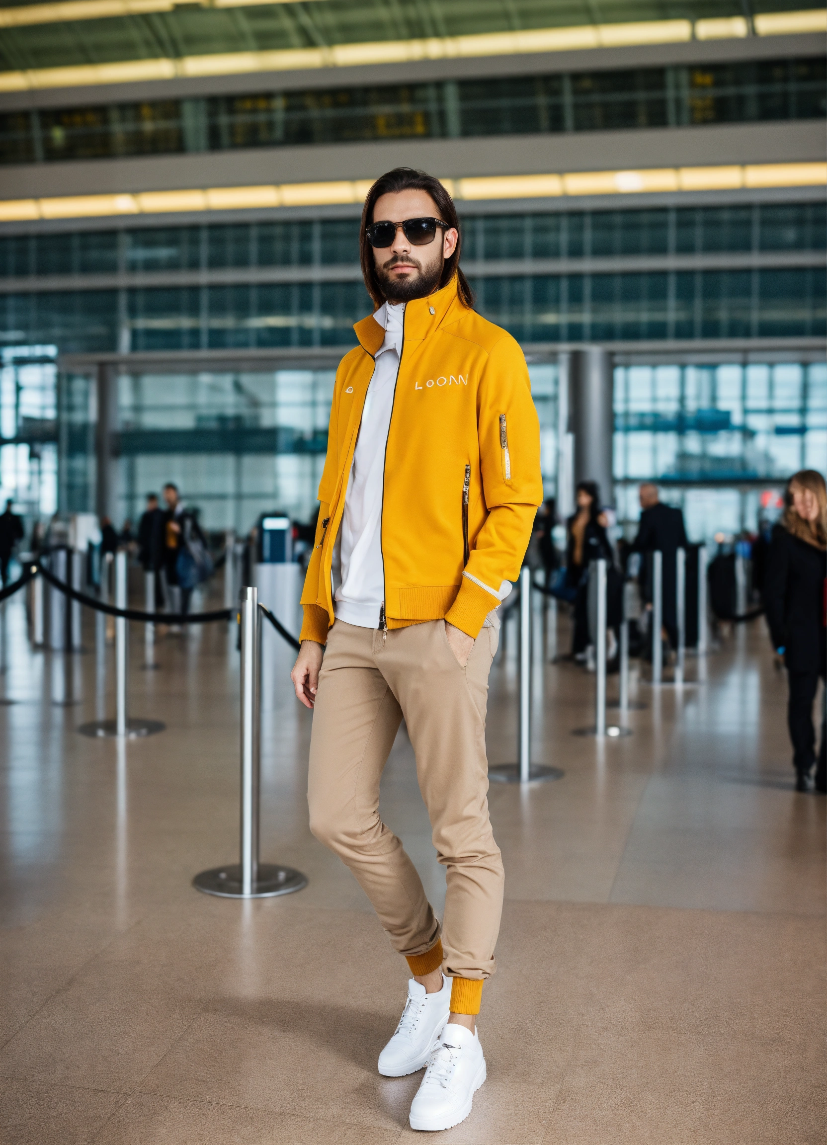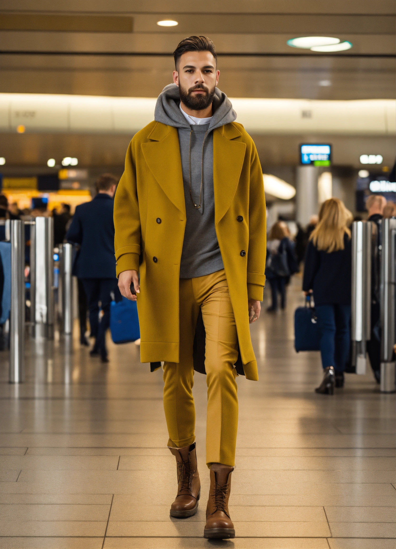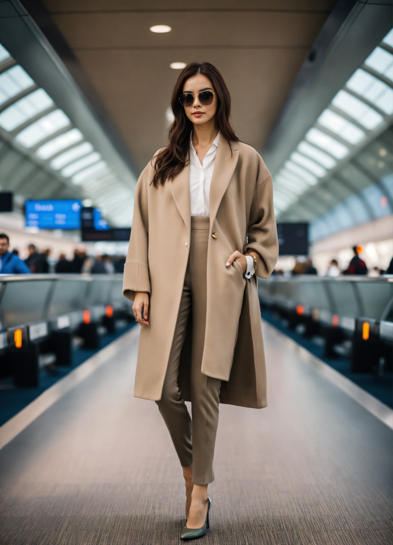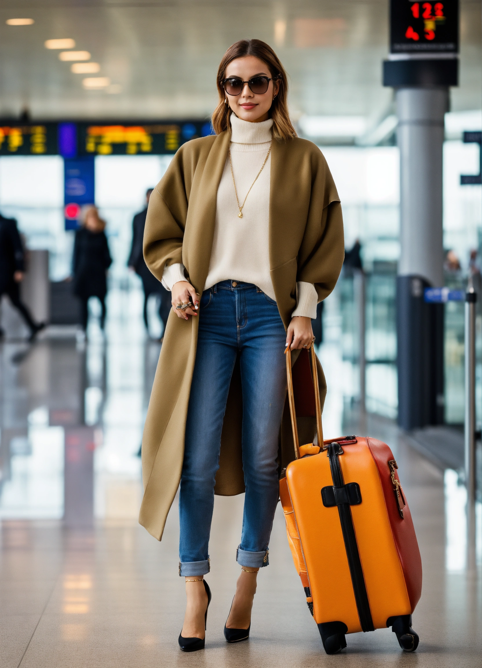 Ultra realistic full body photo of fancy jet setter wearing layered interesting complex unusual upscale expensive rich dolman sleeve comfortable but stylish travel wear outfit at london airport