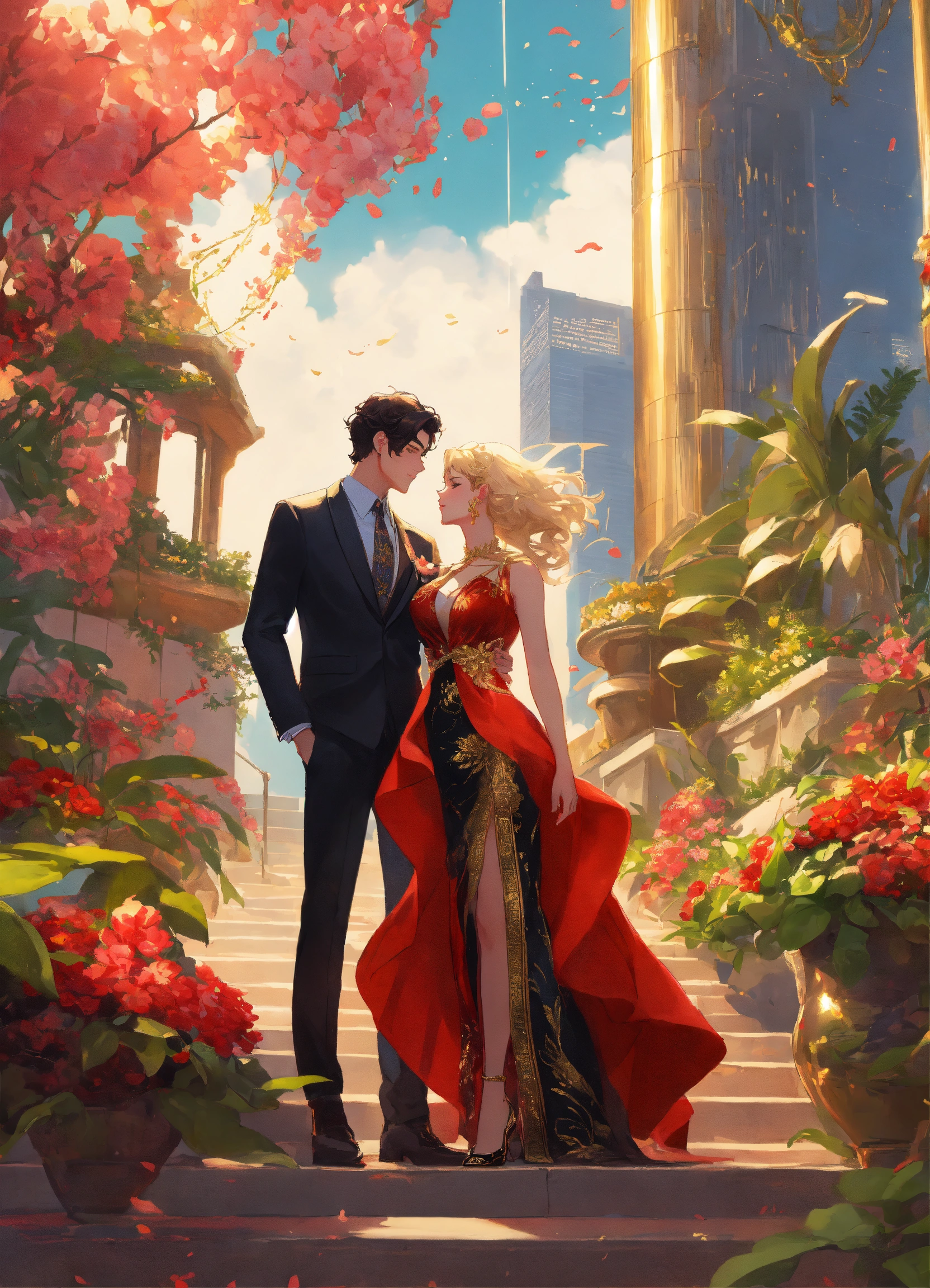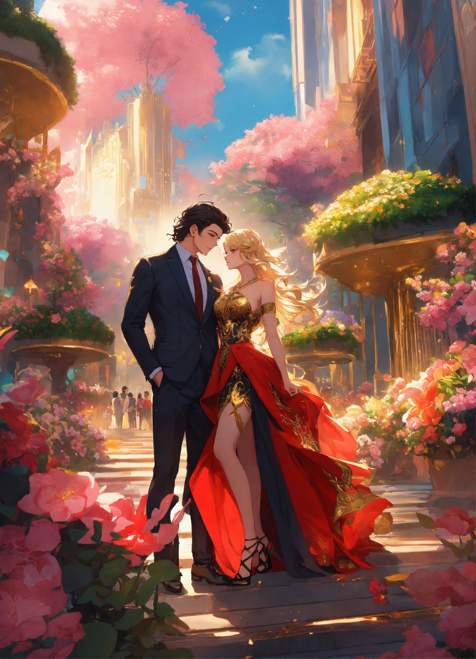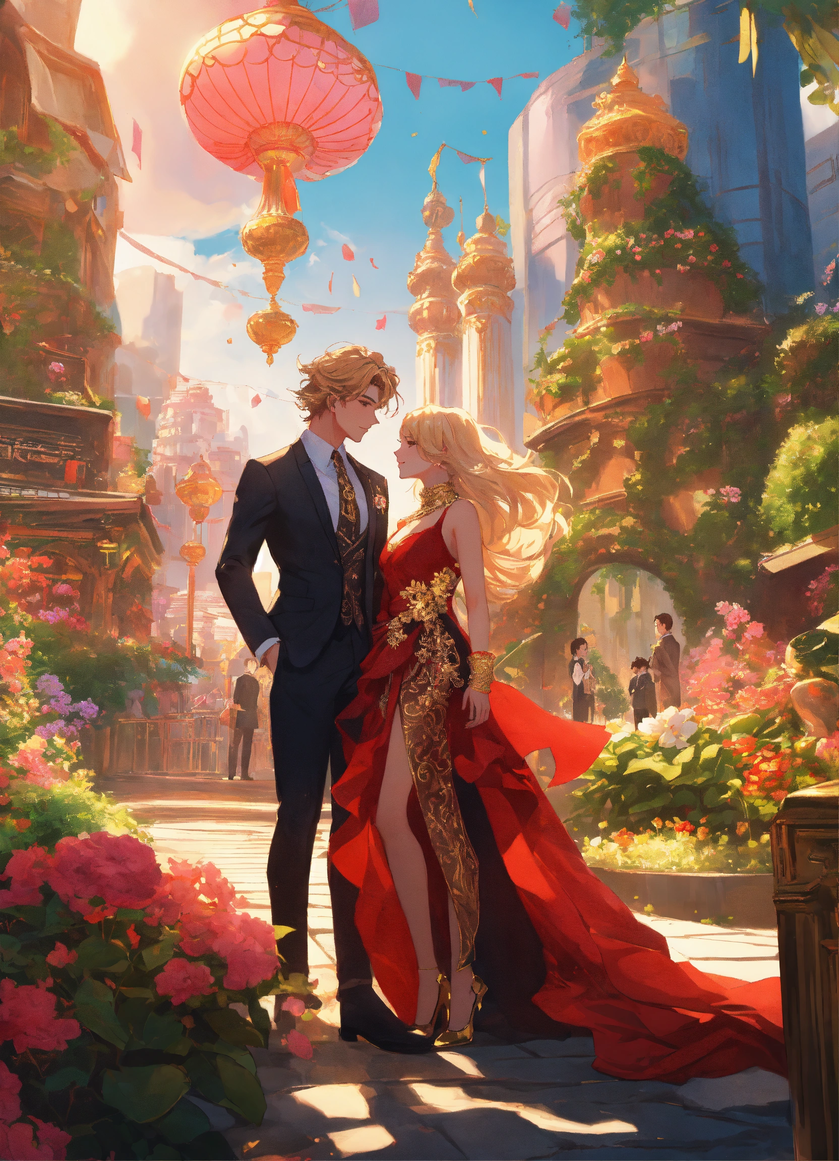 Illustration of beautiful city of towering skyscrapers, islands, vibrant colors, fair skin, the young man wears a intricate black suit with gold ornaments, has wavy black tousled hair, the golden haired woman wears a red intricate dress with gold adornments that shows legs, maximalist, 8k photo, animestyle, by artgerm, by rossdraws, trending on artstation, garden, windy, flowers, circular perspective