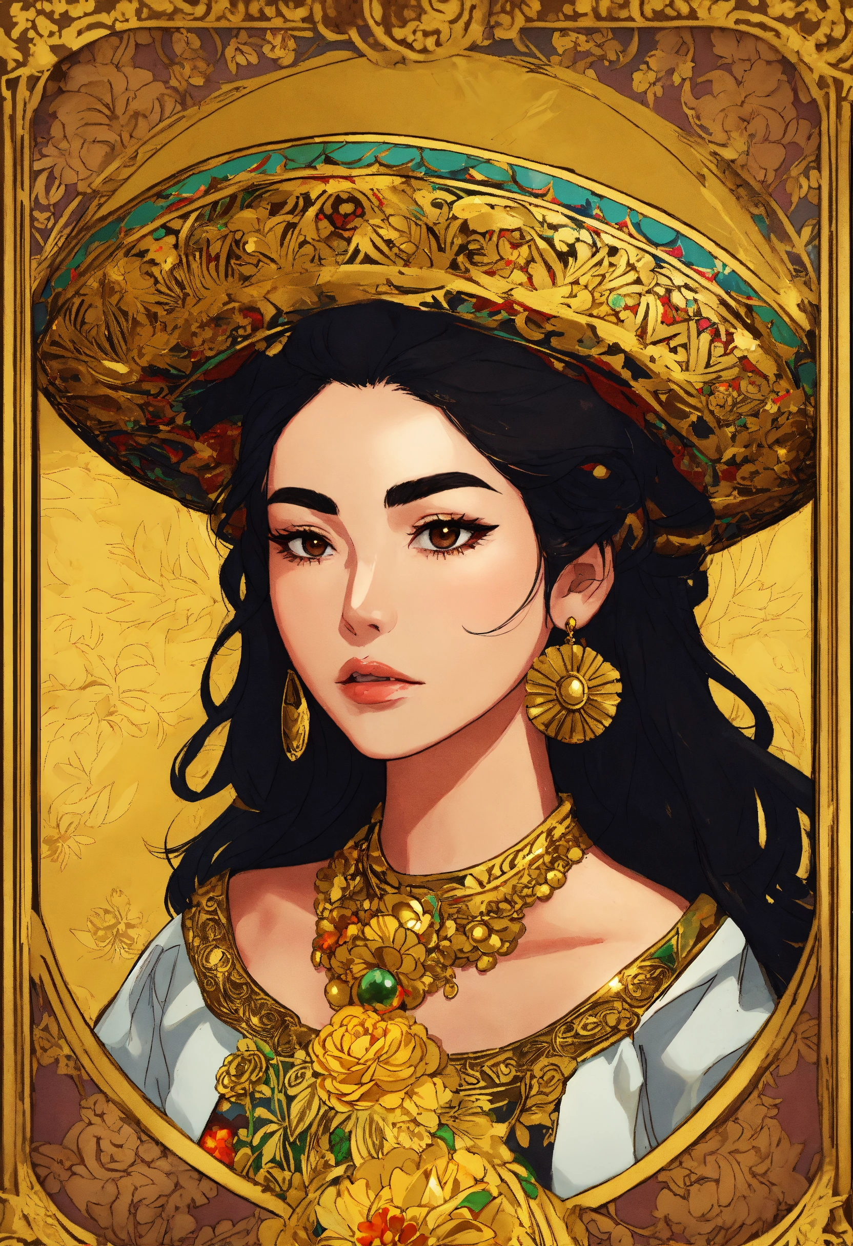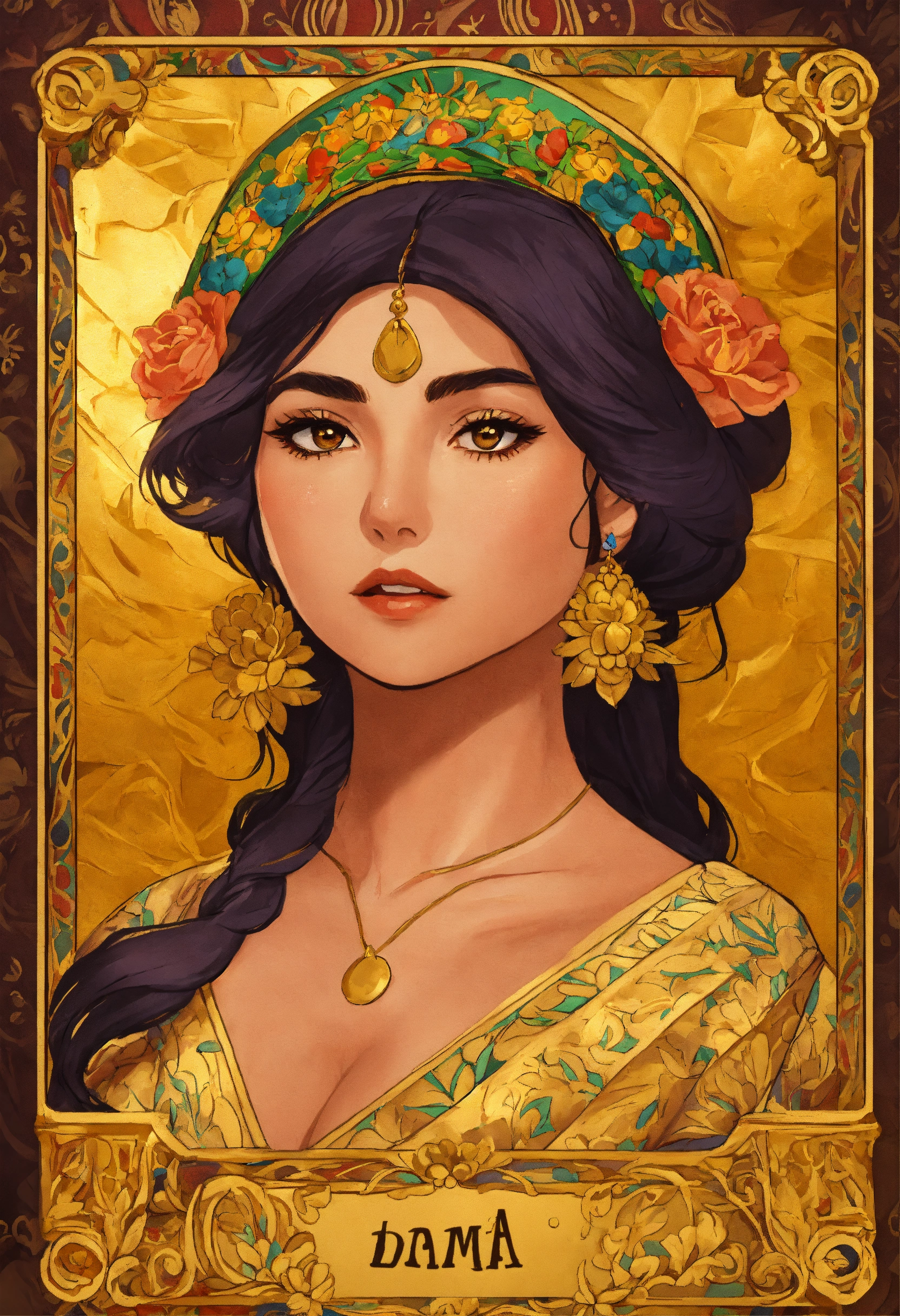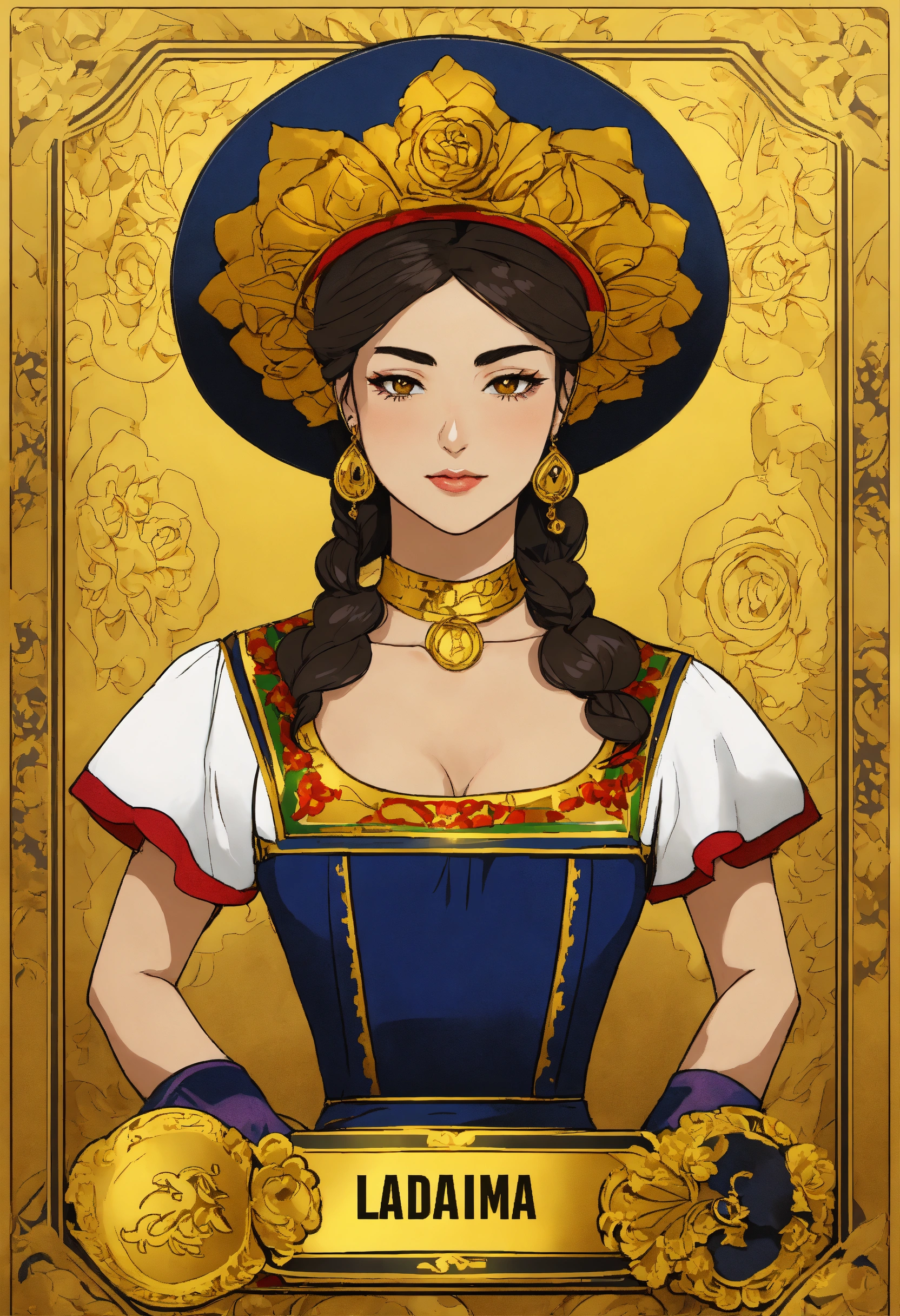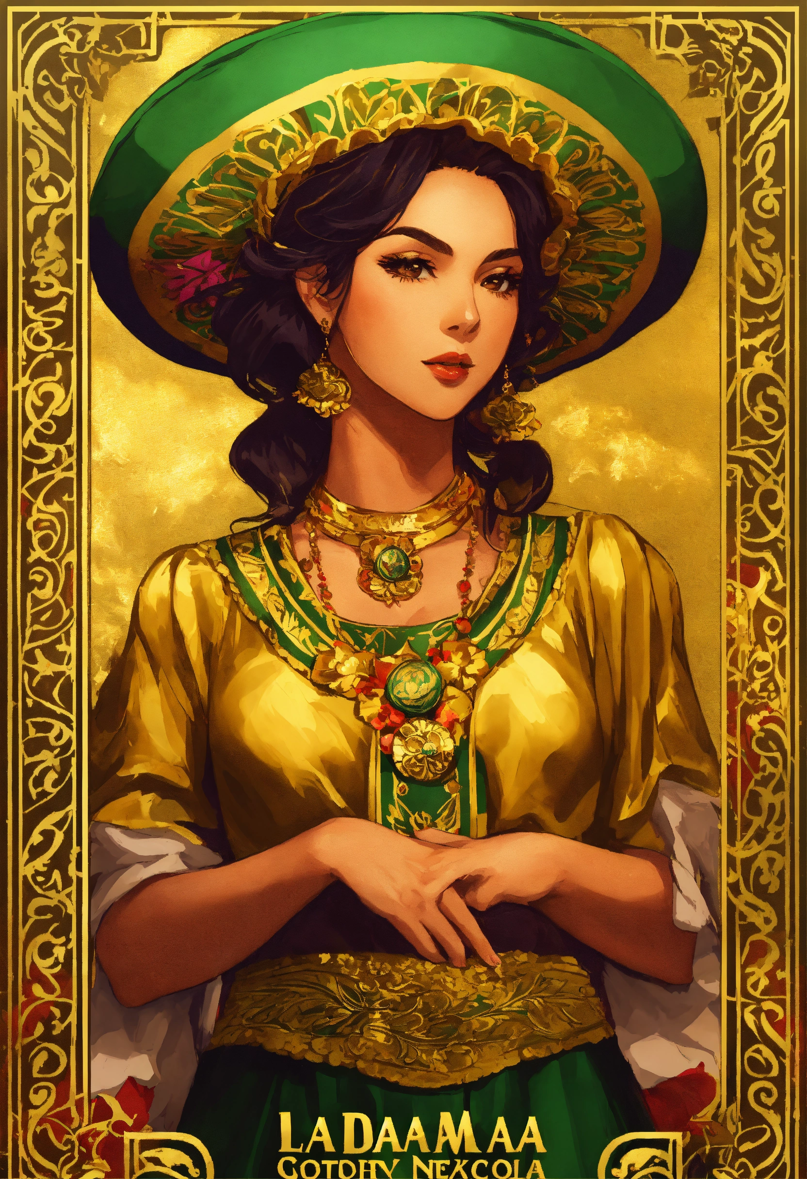 A woman based on the card "la dama" of the mexican lottery deck in anime style, gold background card styled