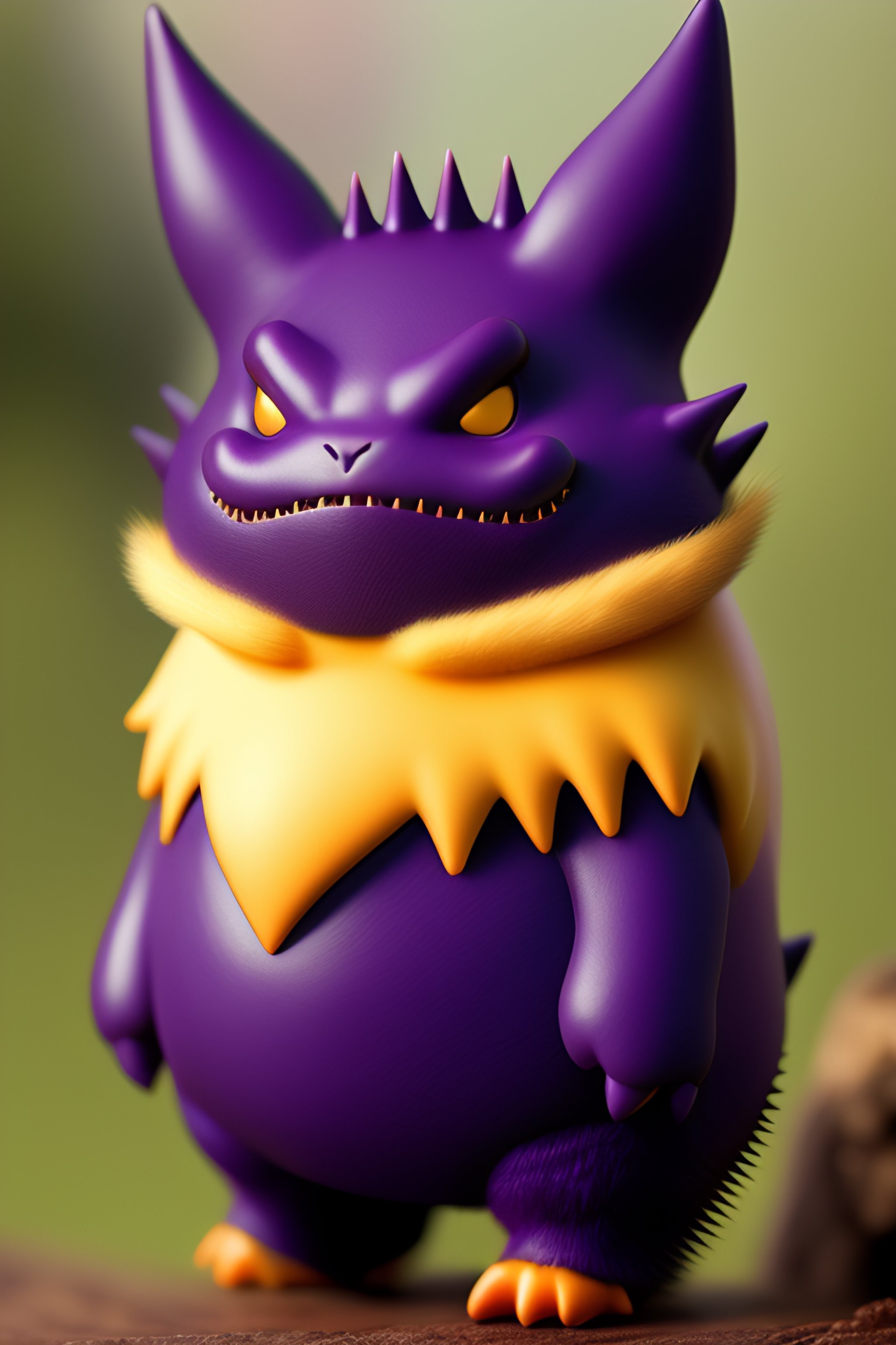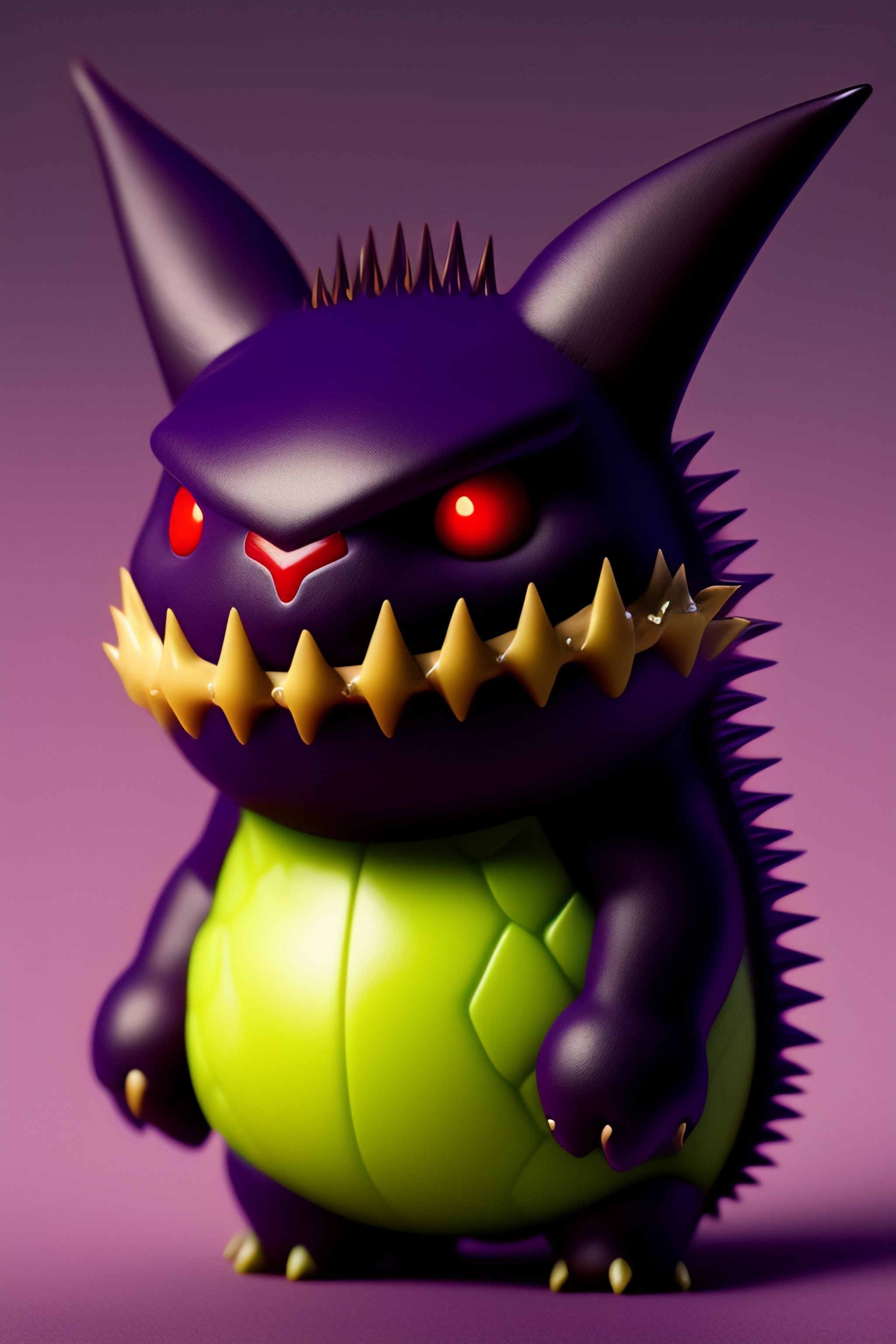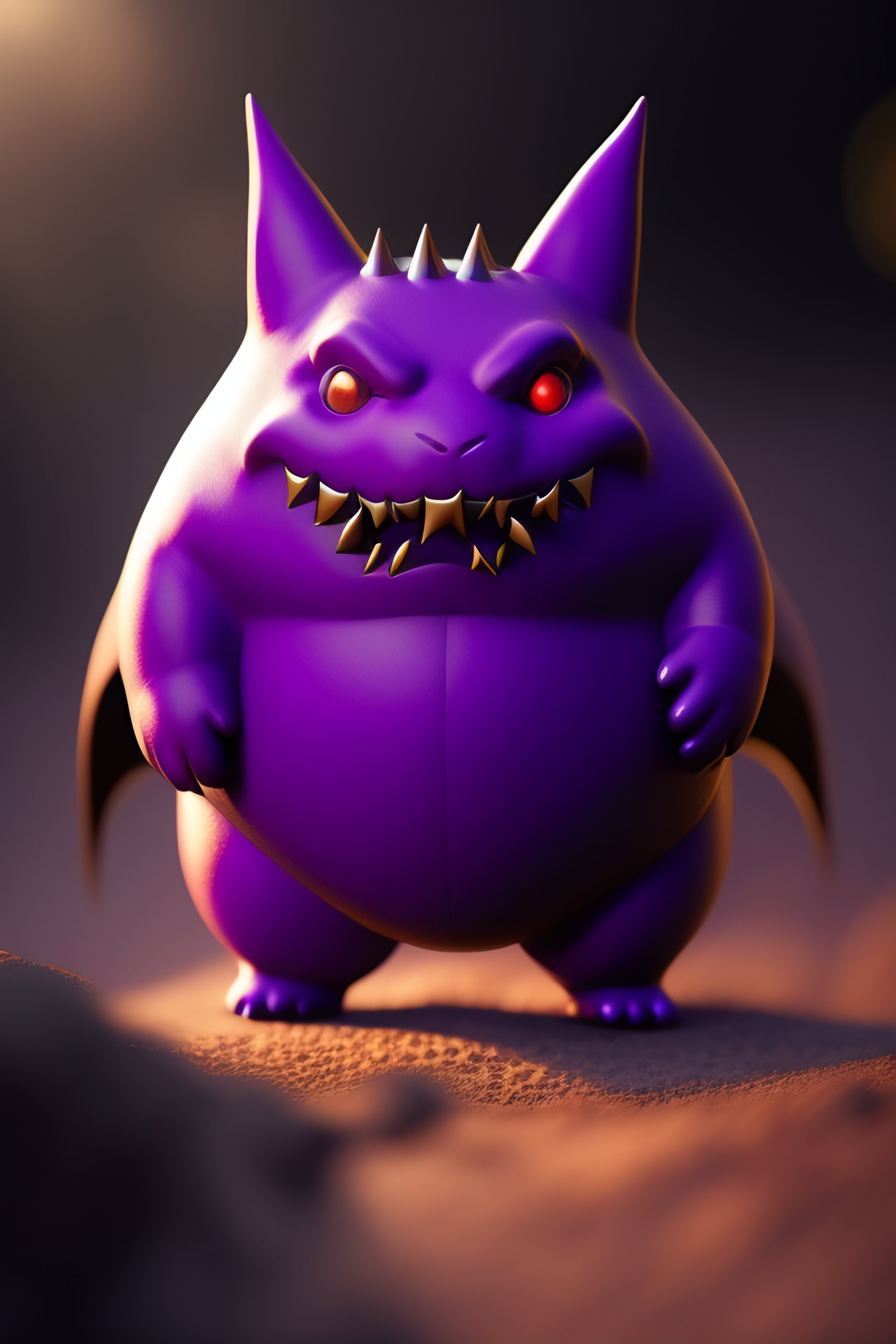 Gengar is a dark purple, bipedal pokémon with a roundish body. it has red eyes, a wide mouth that is usually curled into a sinister grin, and pointed ears. on its back are numerous spikes and it has smaller spikes on top of its head similar to tufty fur. its arms and legs are short with three digits on both its hands and feet. it also has a stubby tail.
