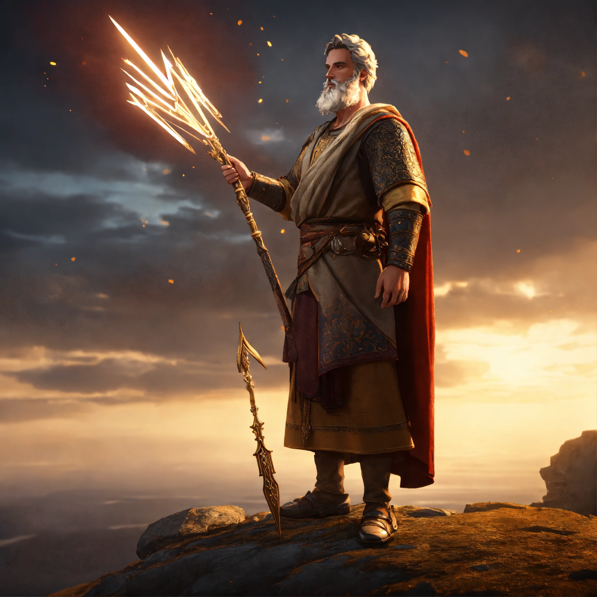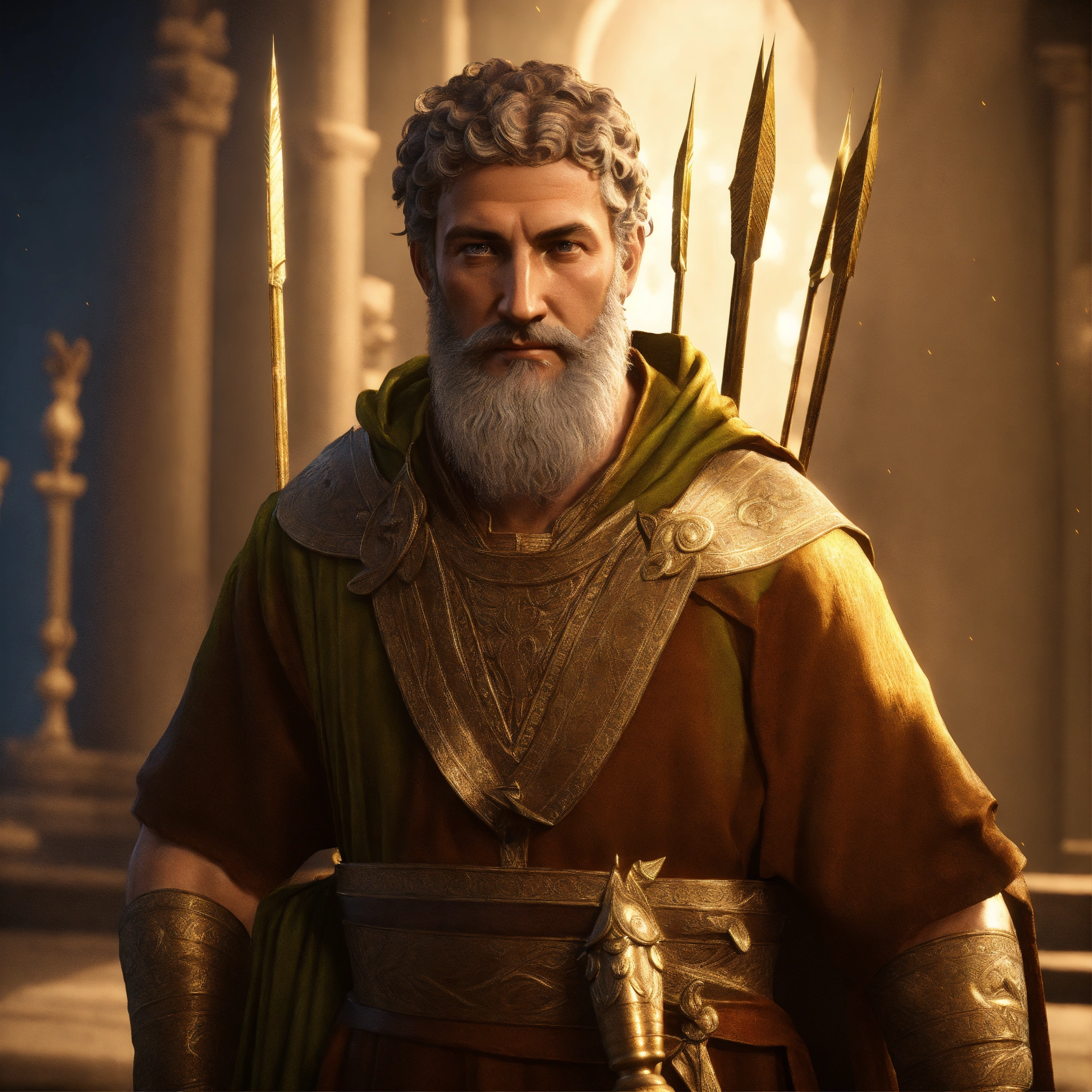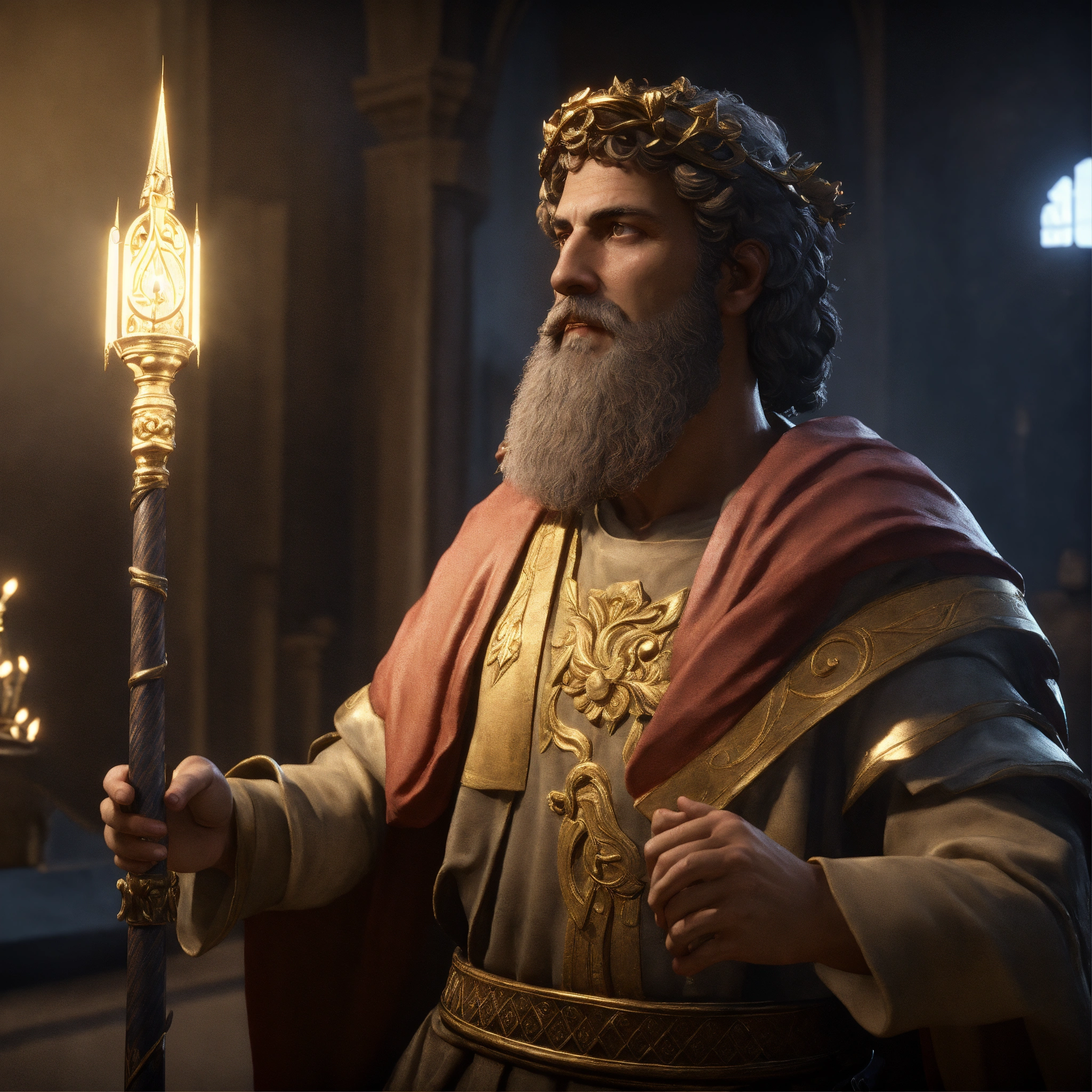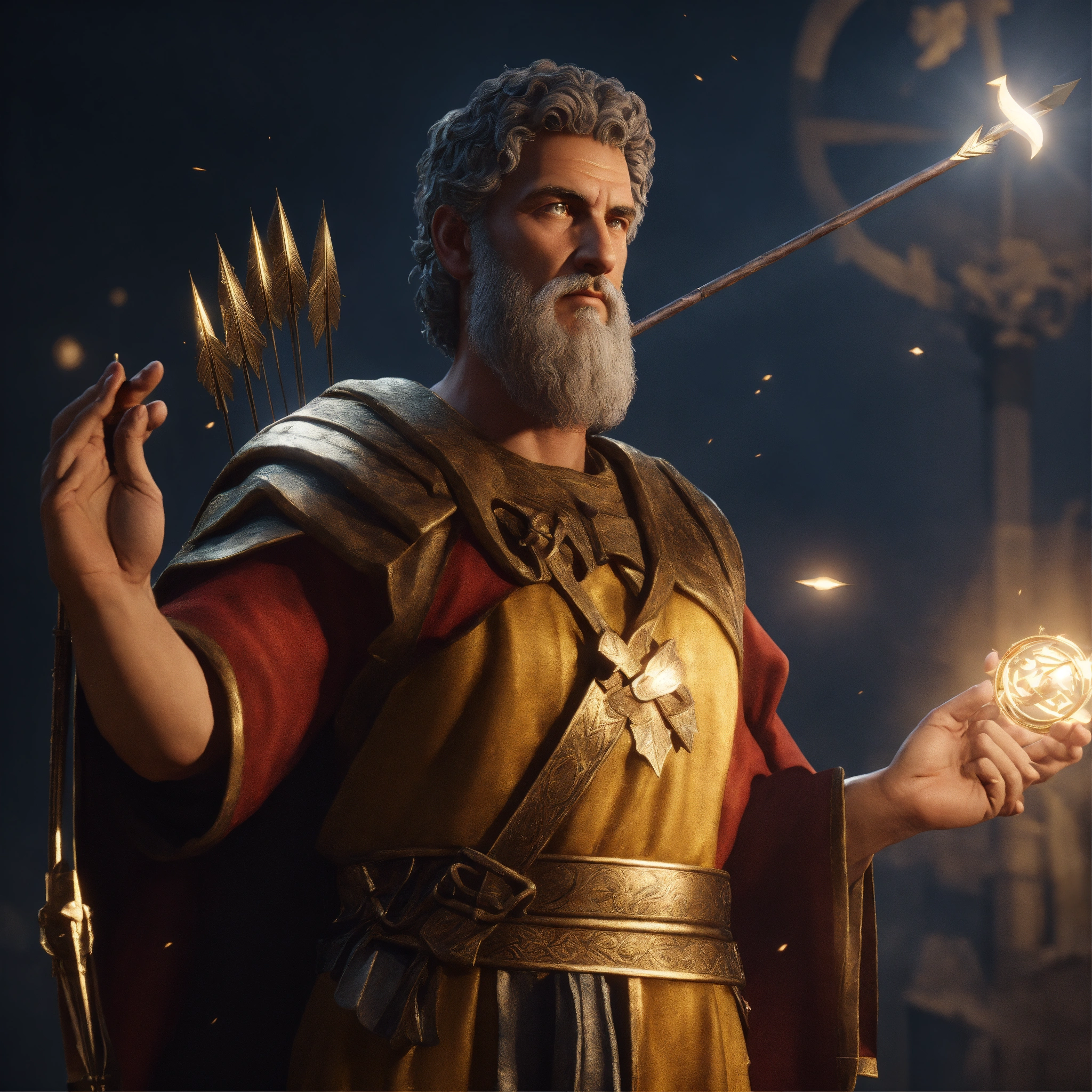 The apostle peter with two light arrows from his head thinks to turn him to the right or to the left, unreal engine