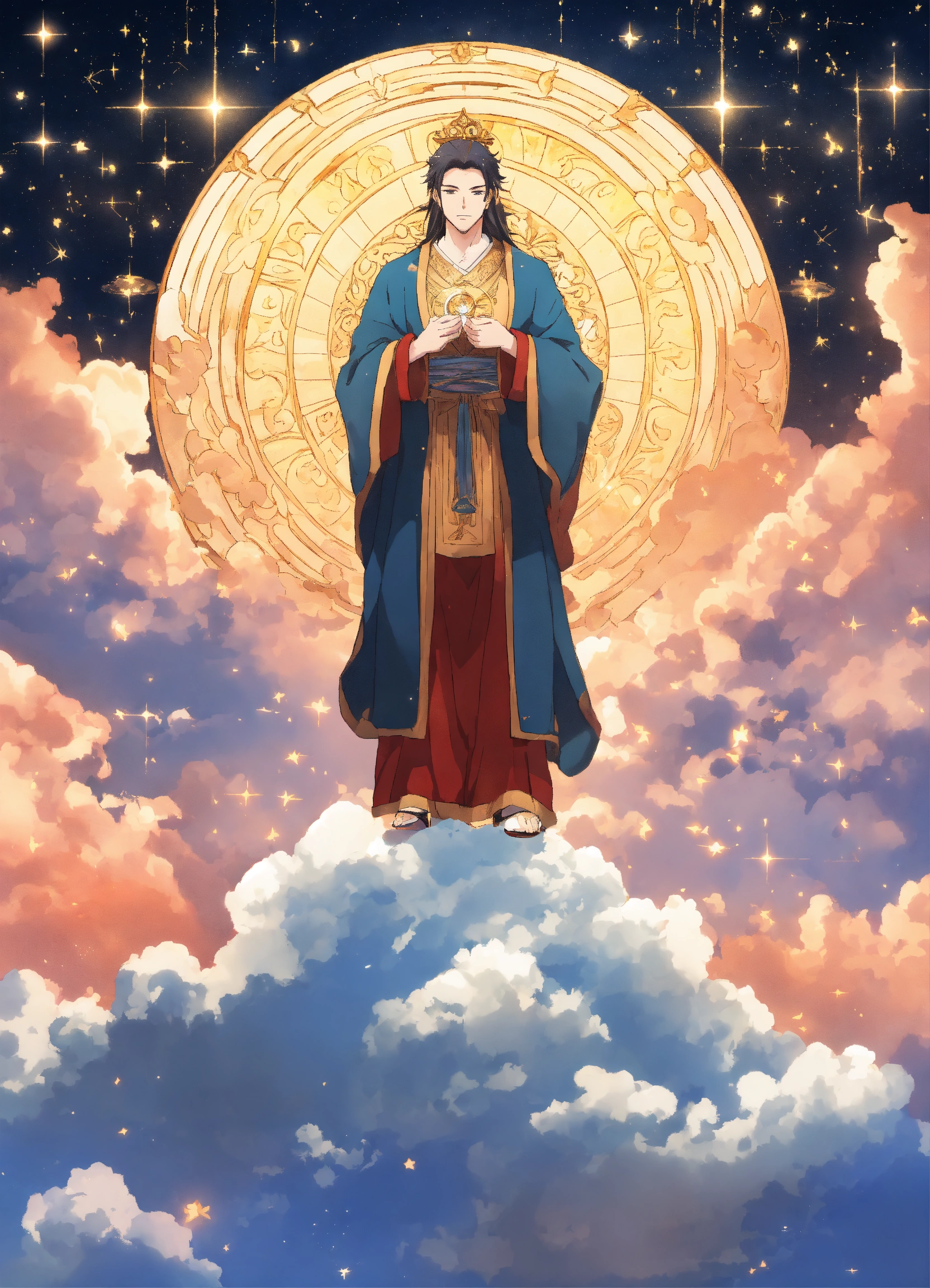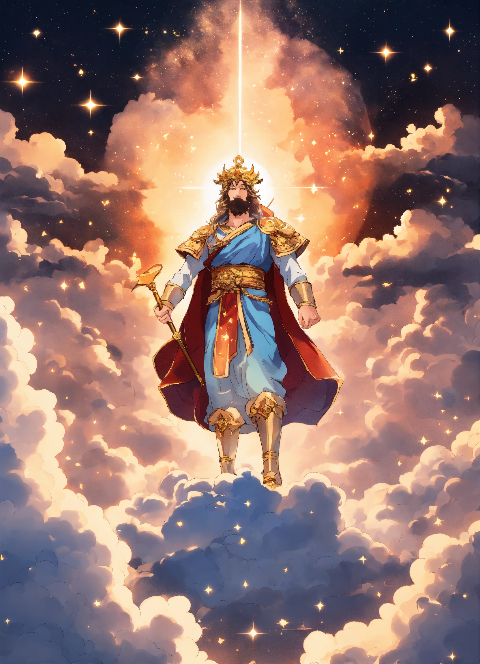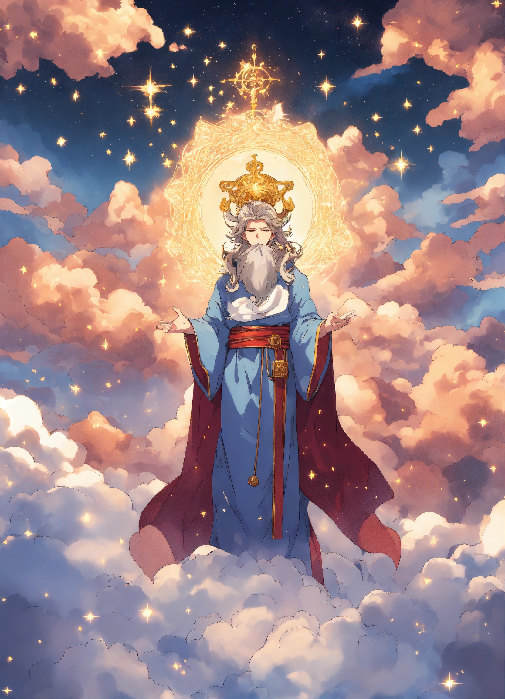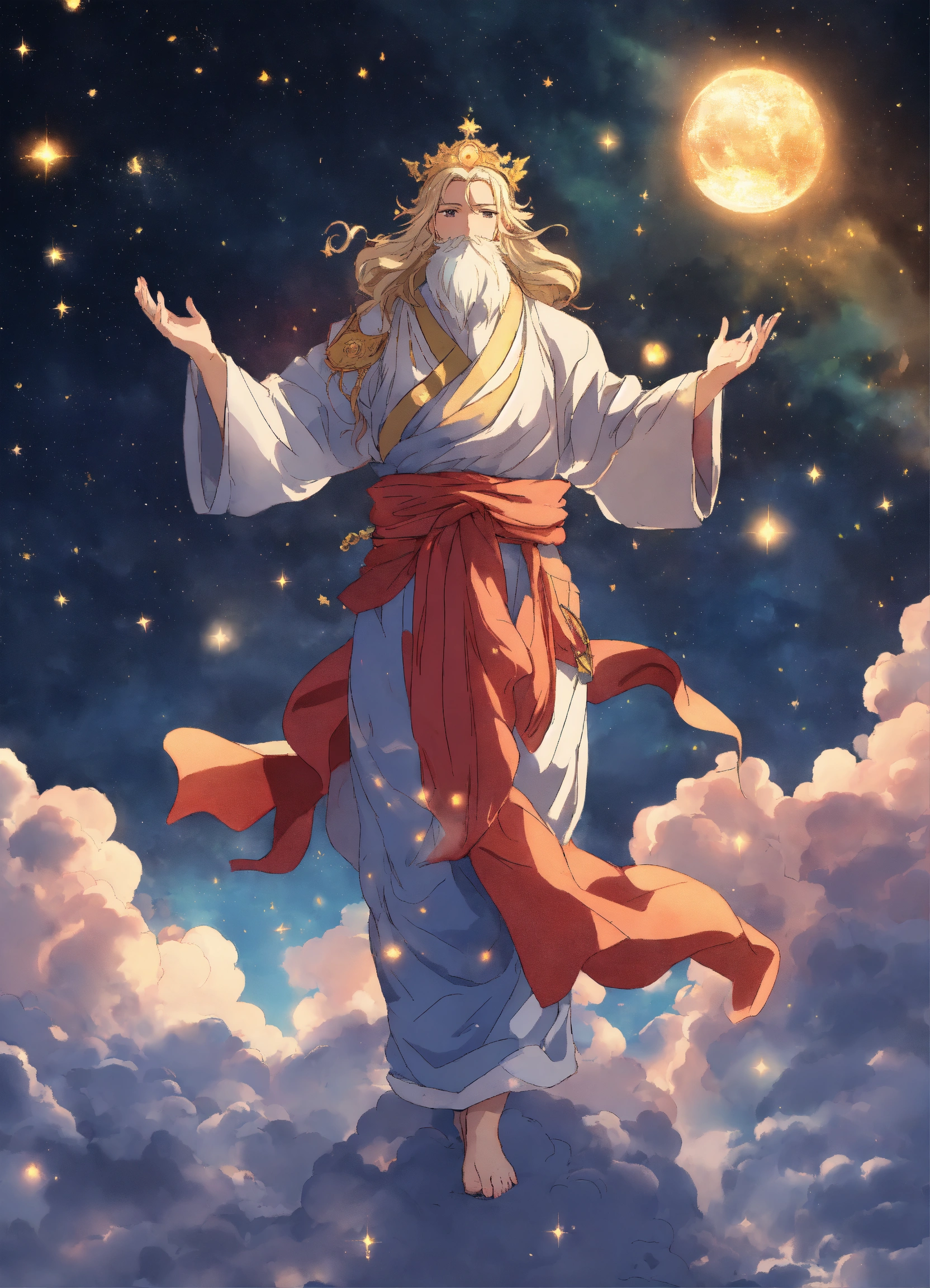 God in anime style. god is depicted in a frontal view, standing on a cloud. the background is filled with stars and clouds.