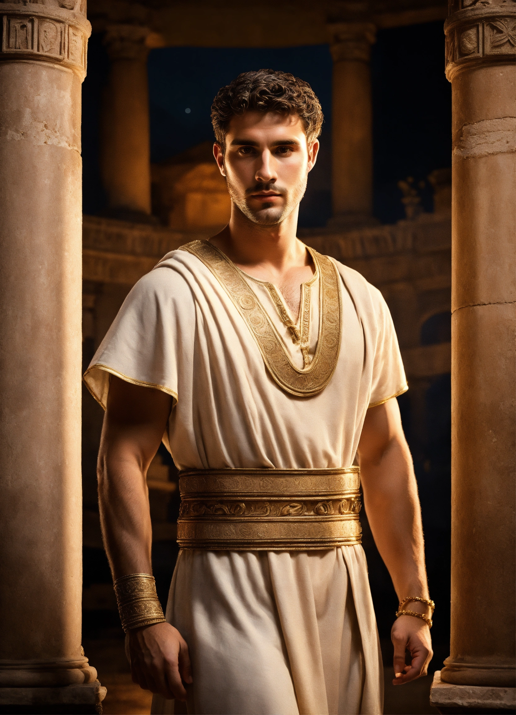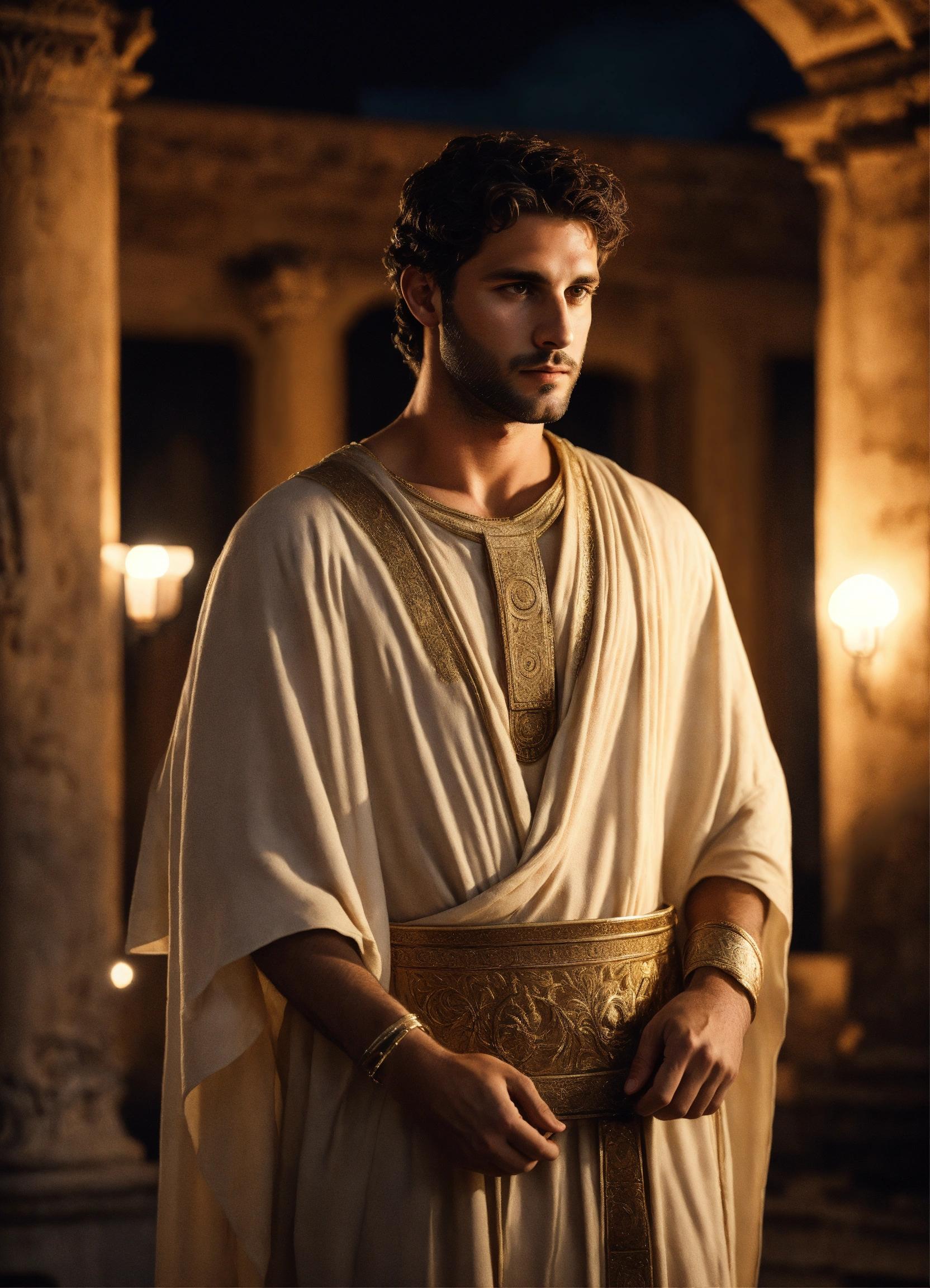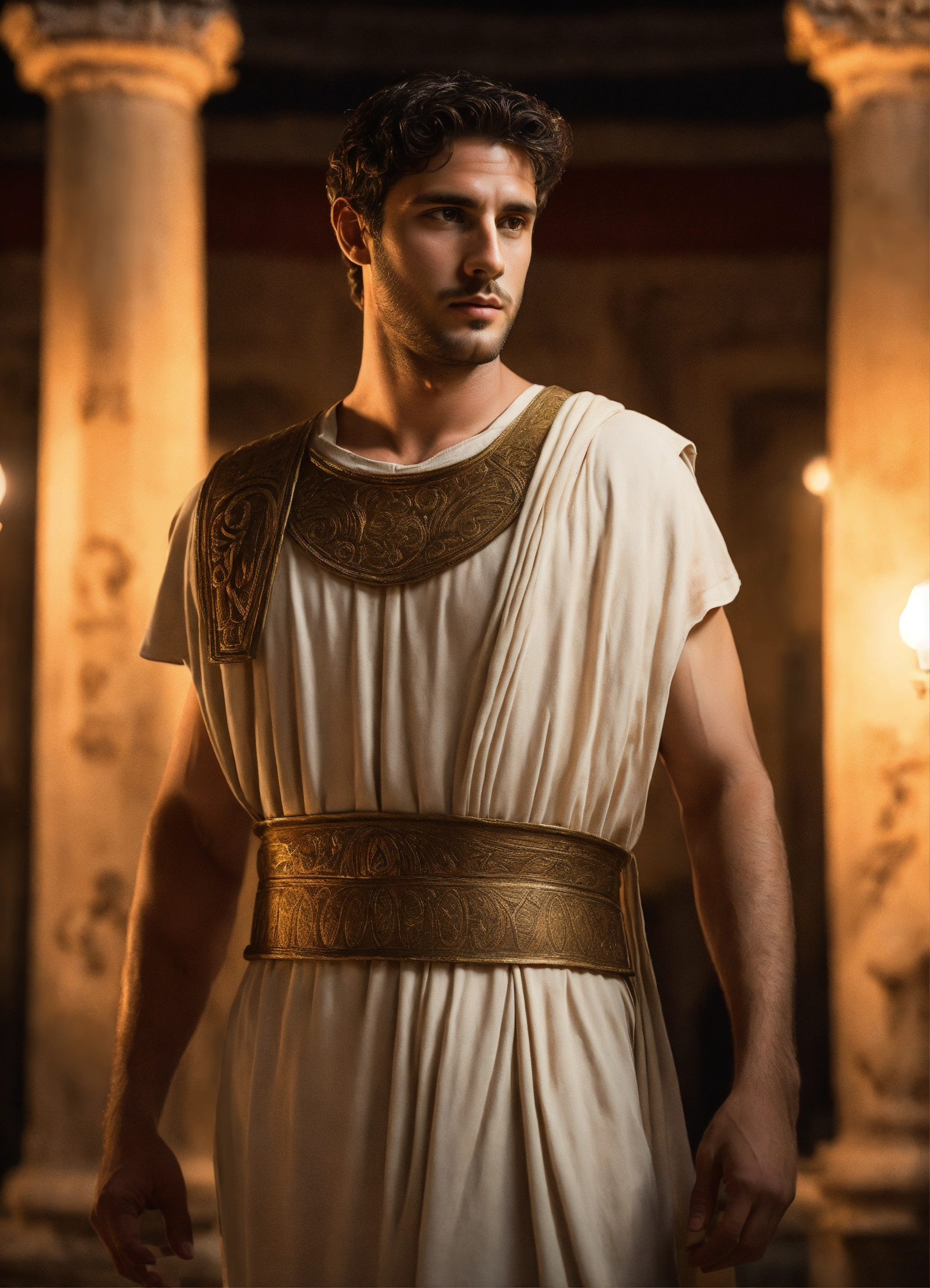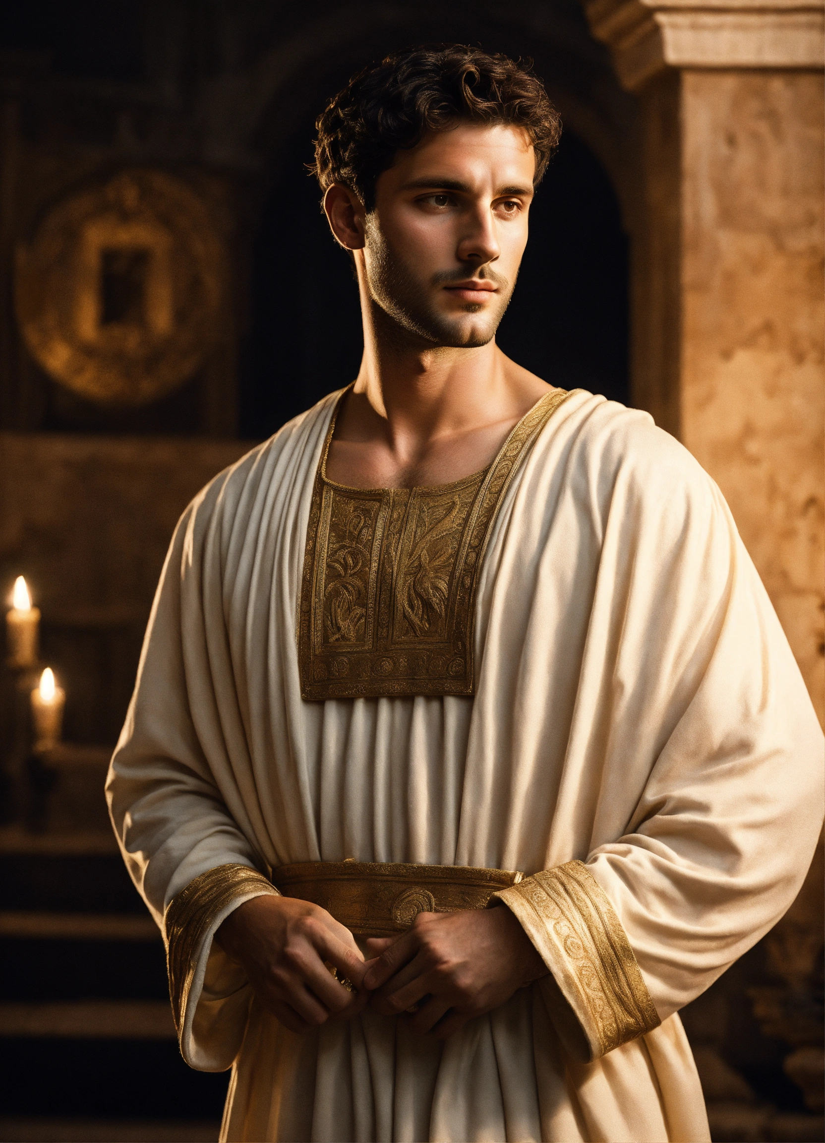 A young rich handsome roman man wearing a light-colored tunic, smart, solemn, 30 years old, charismatic, ancient rome, in his luxurious pompeian villa, detailed decor, at night, photorealistic, hyperdetailed, 8k, no beard