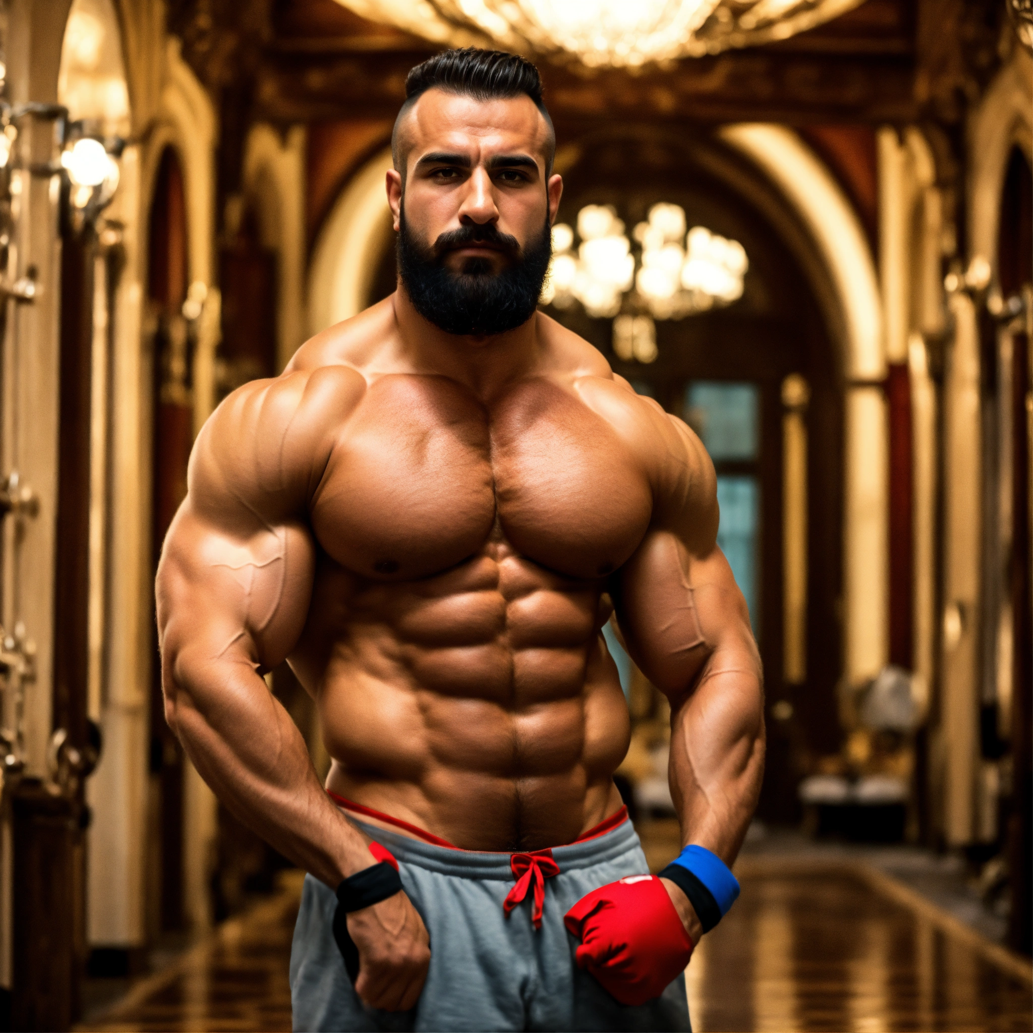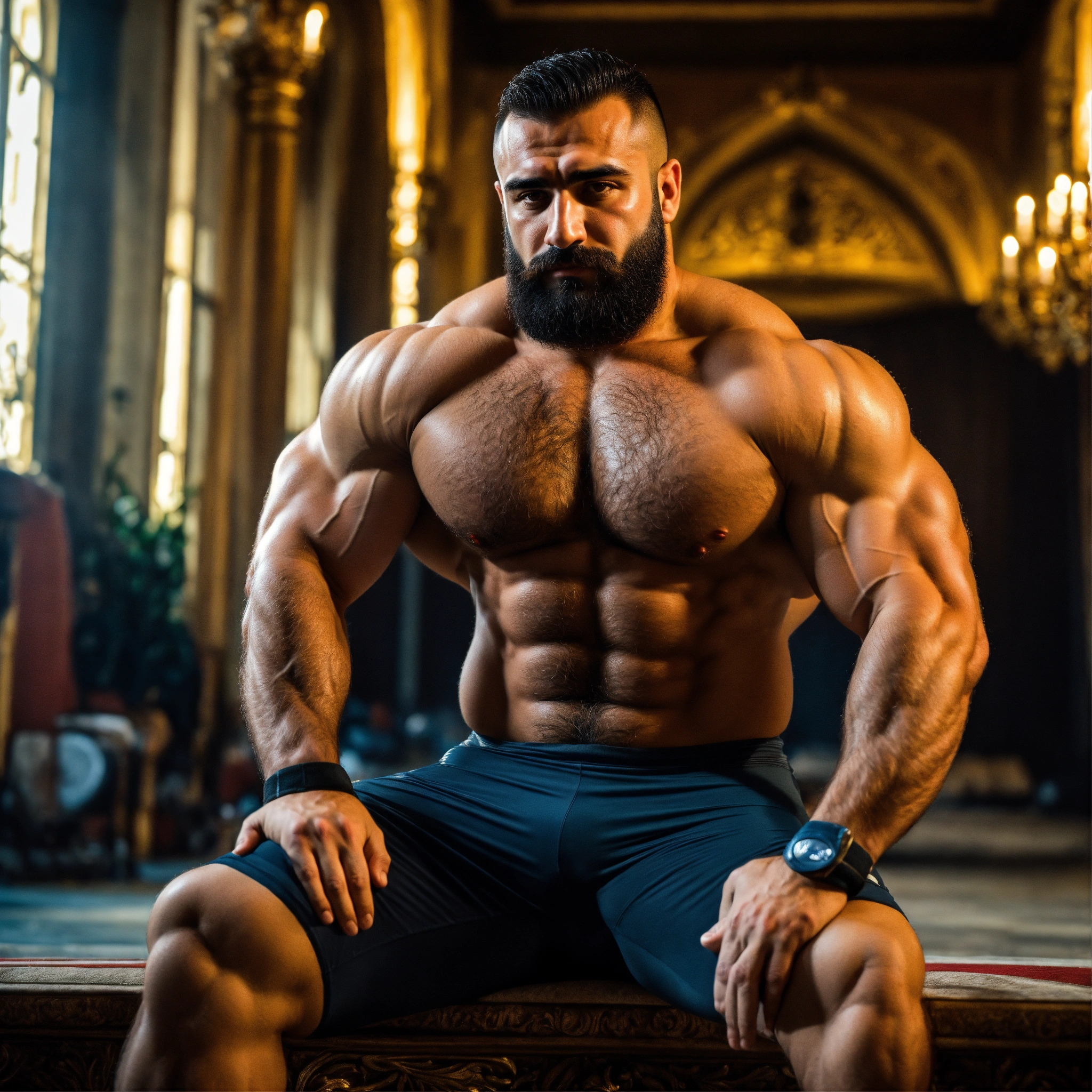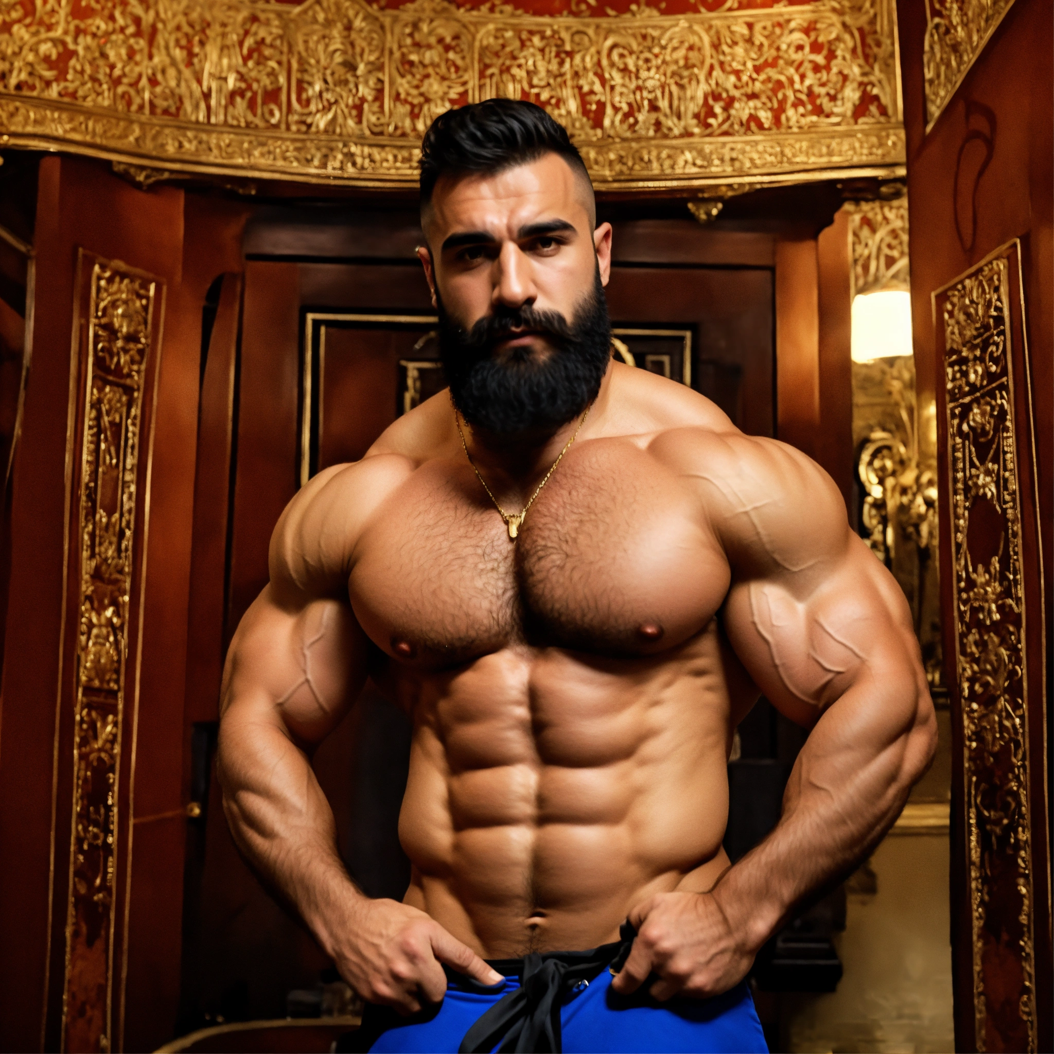 30-year-old hairy turkish man with big muscles, big bodybuilder, body like a wrestler, in a beautiful palace