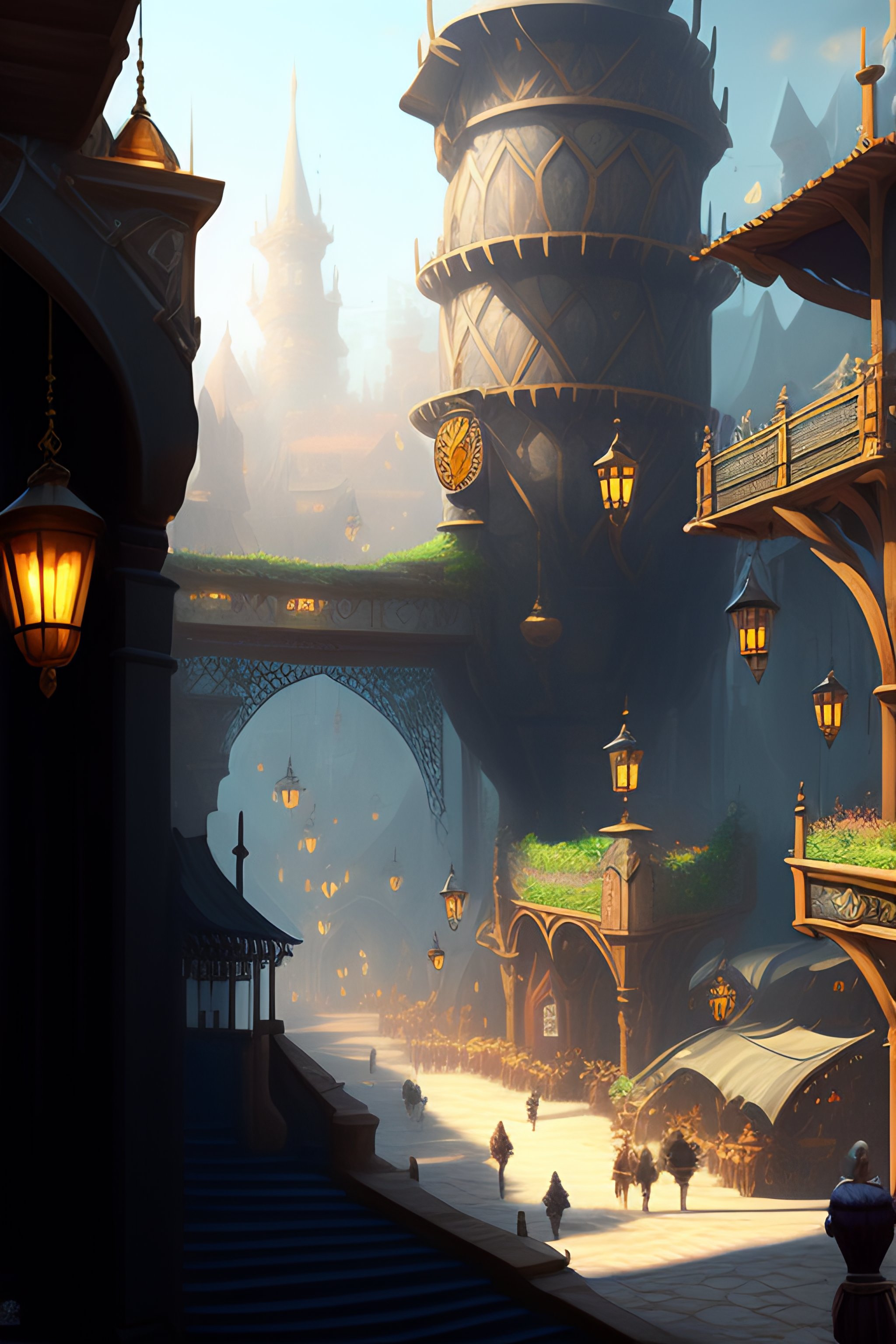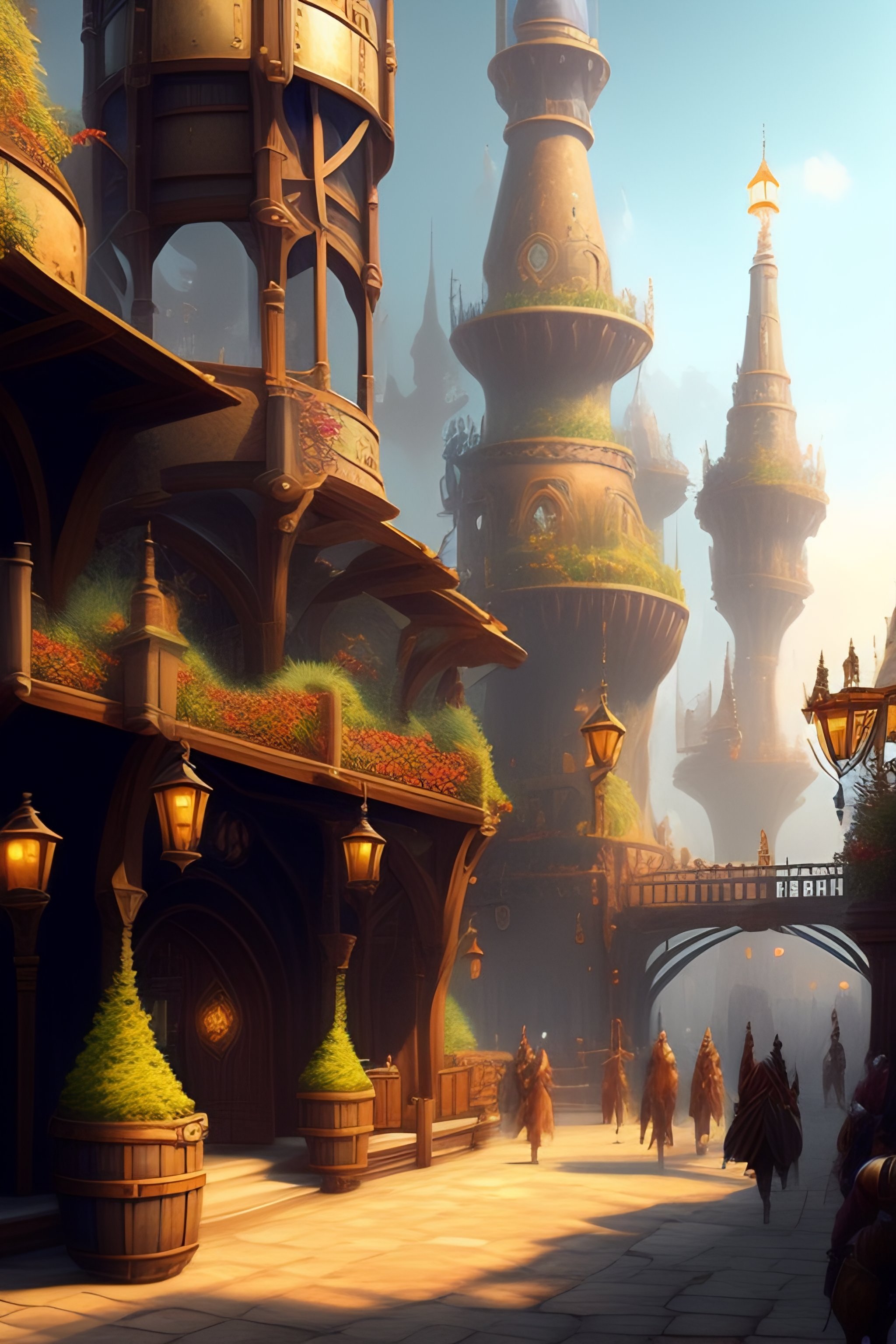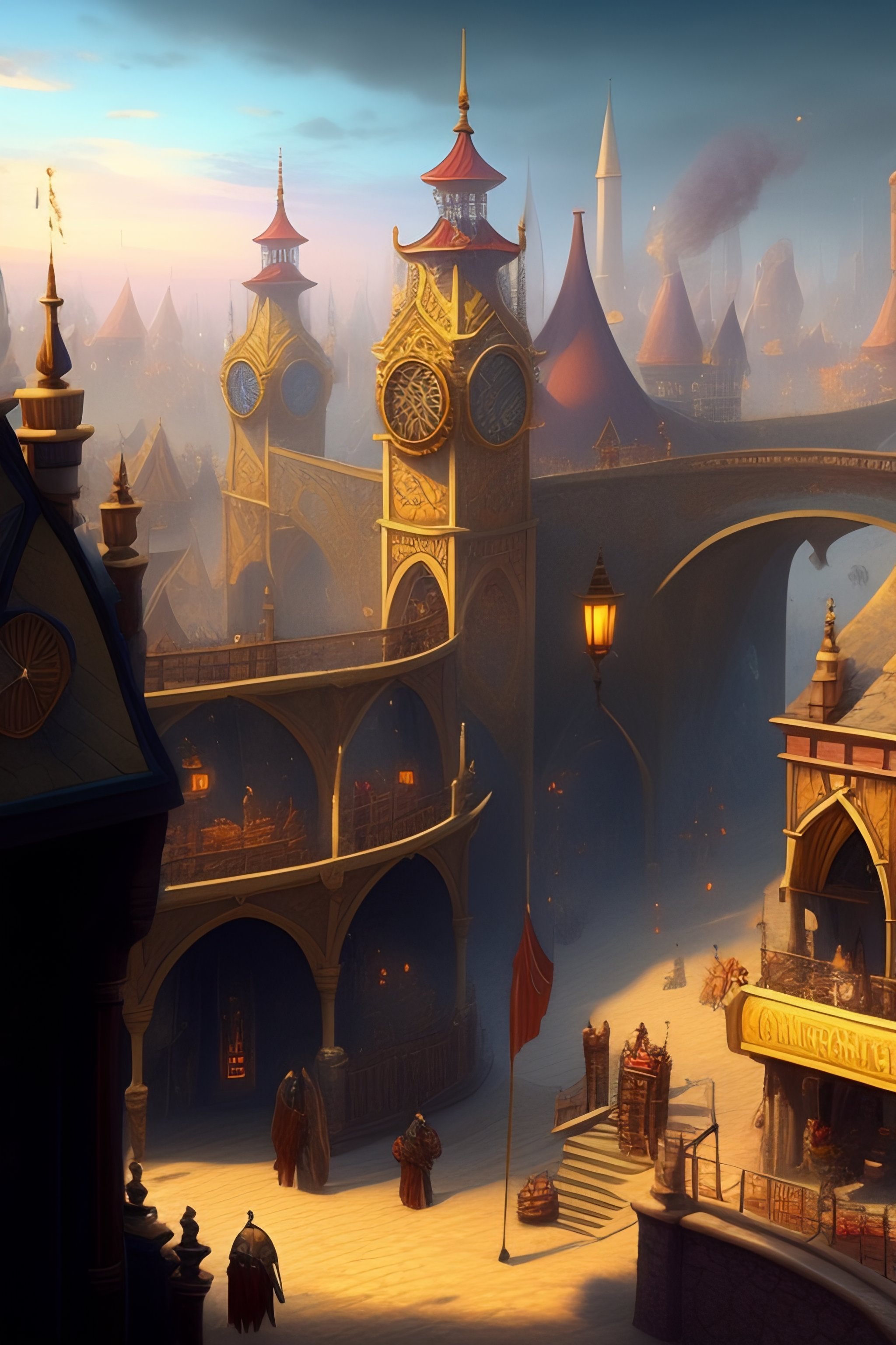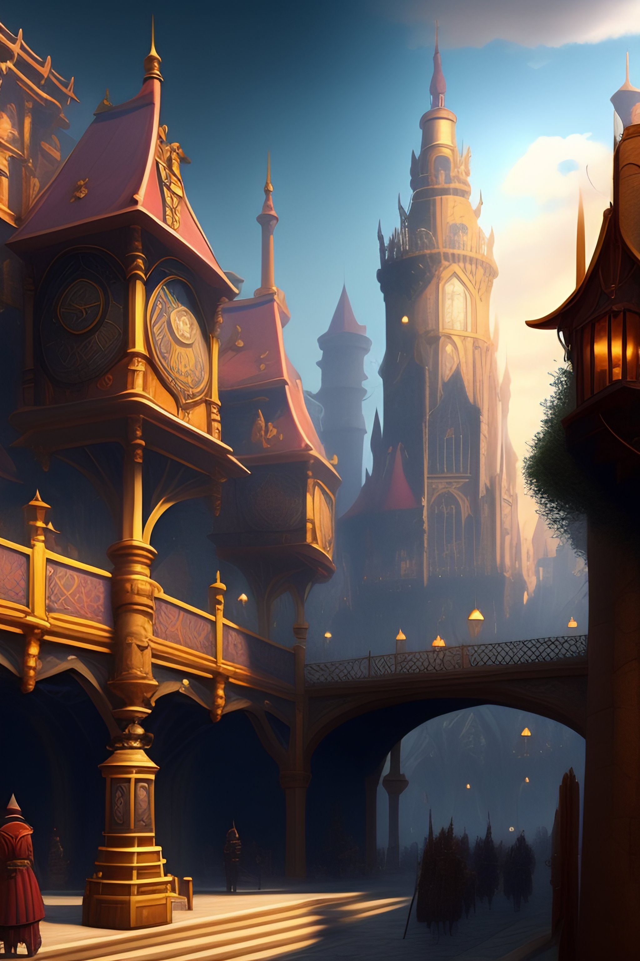 A concept art of a medieval steampunk city