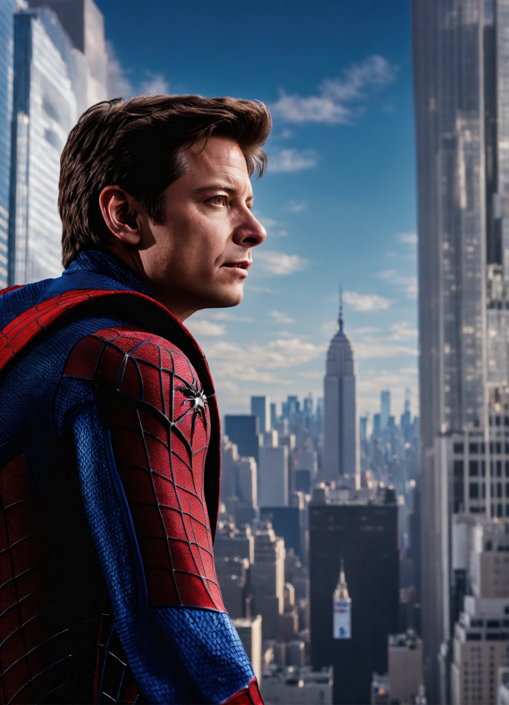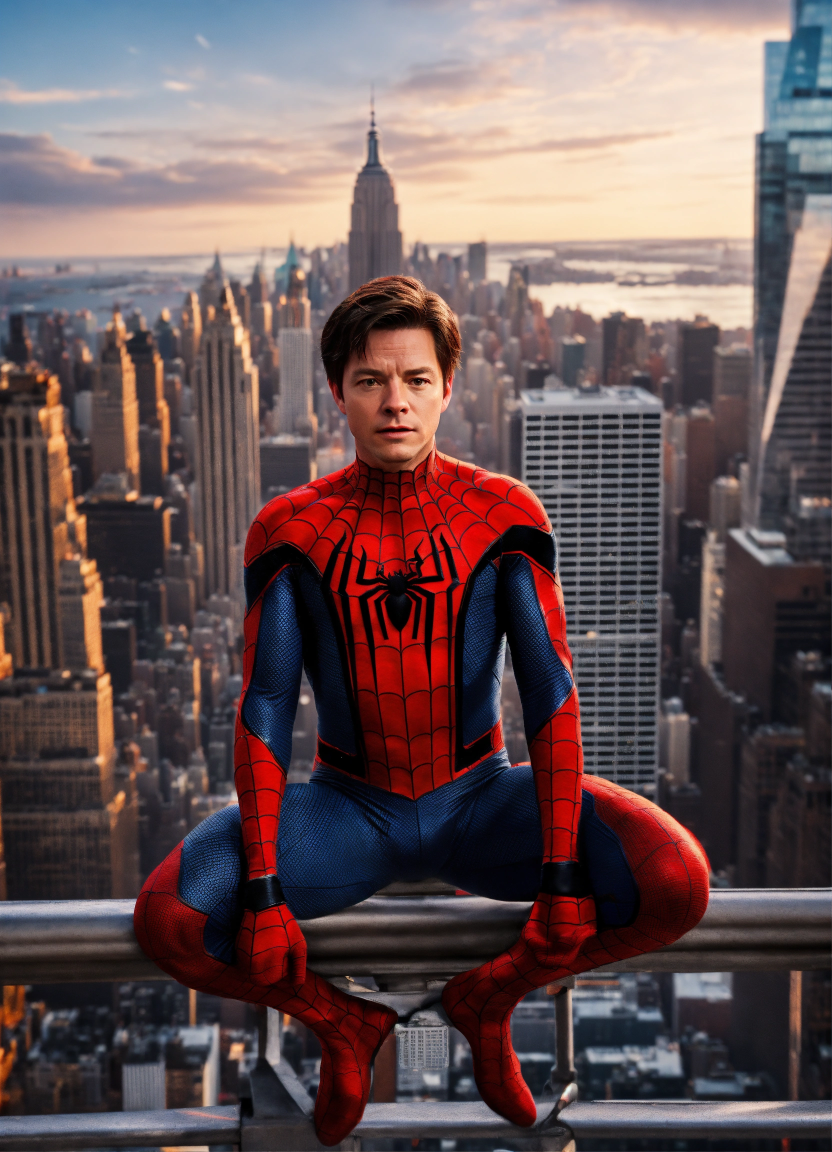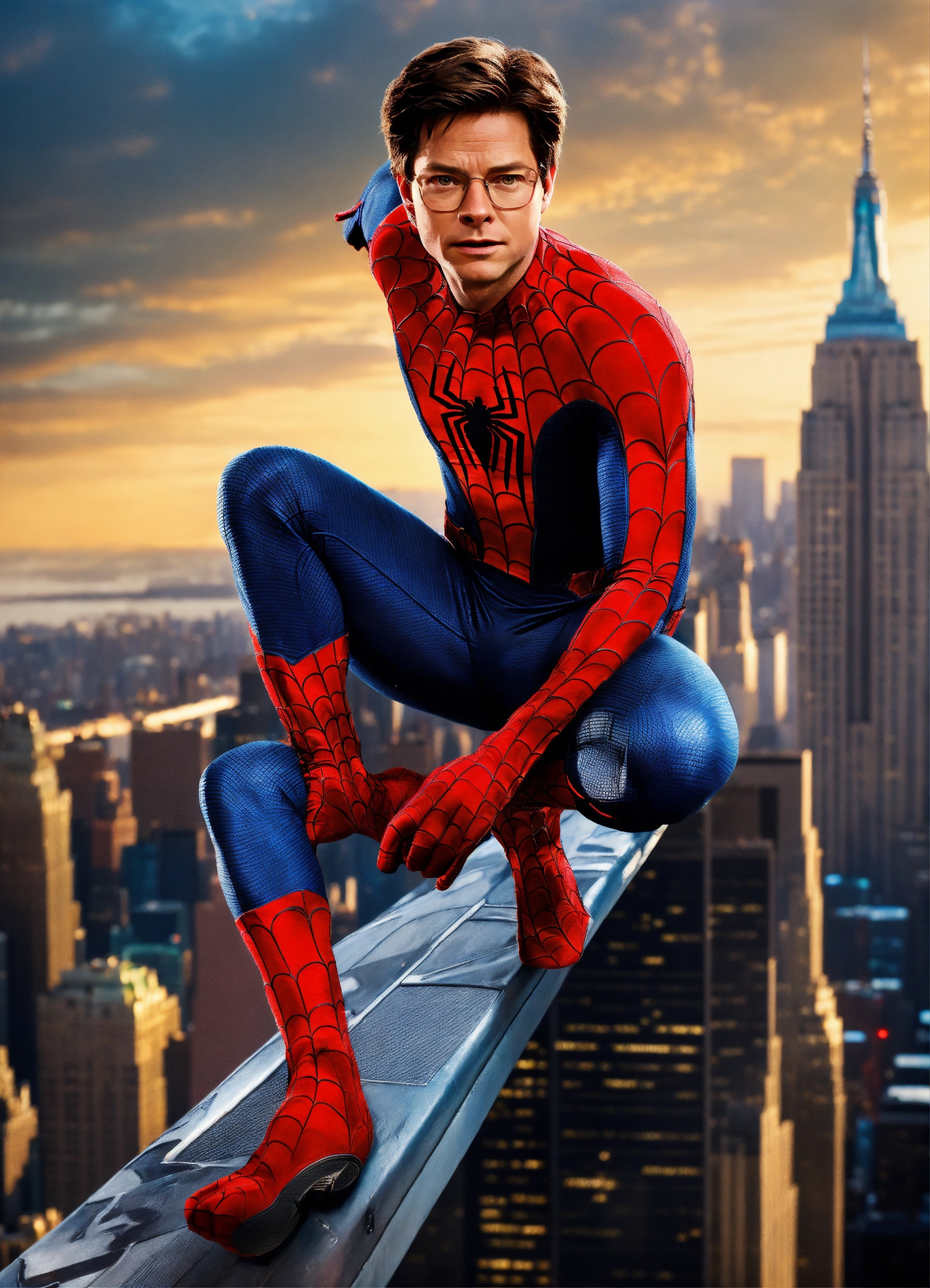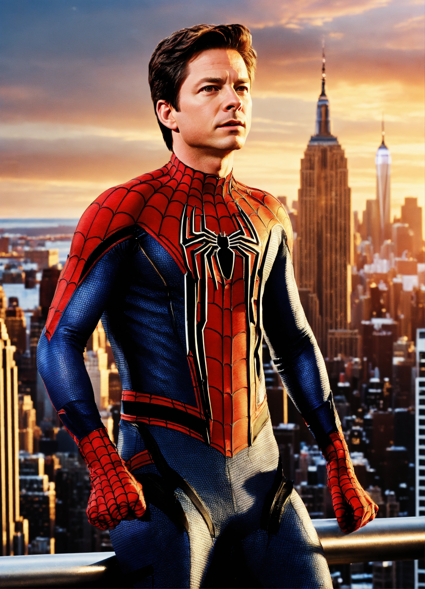 Michael j. fox is peter parker, camera-look, dressed with spider-man suit, new york by a skyscraper in background, 8k resolution, photorealism, highly detailed, epic shot
