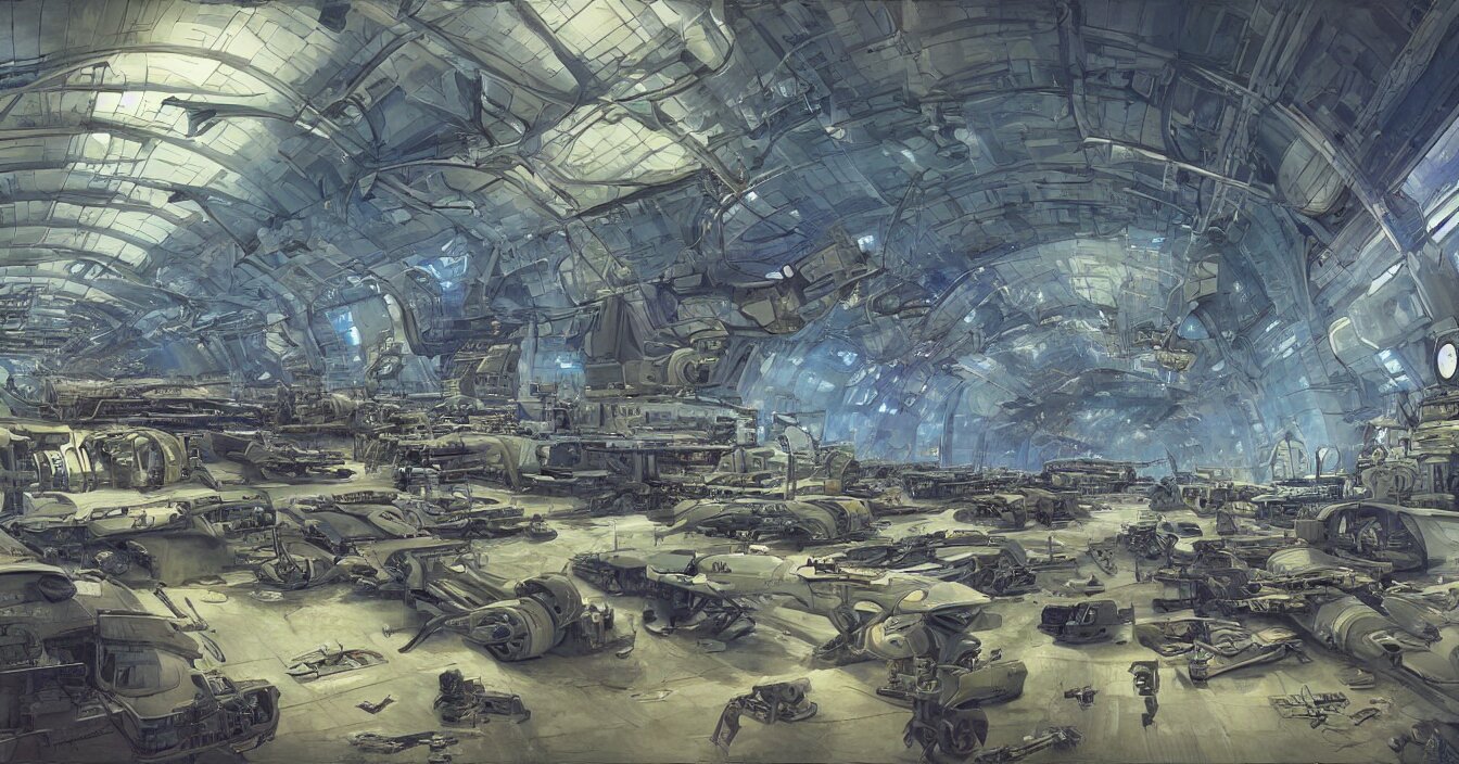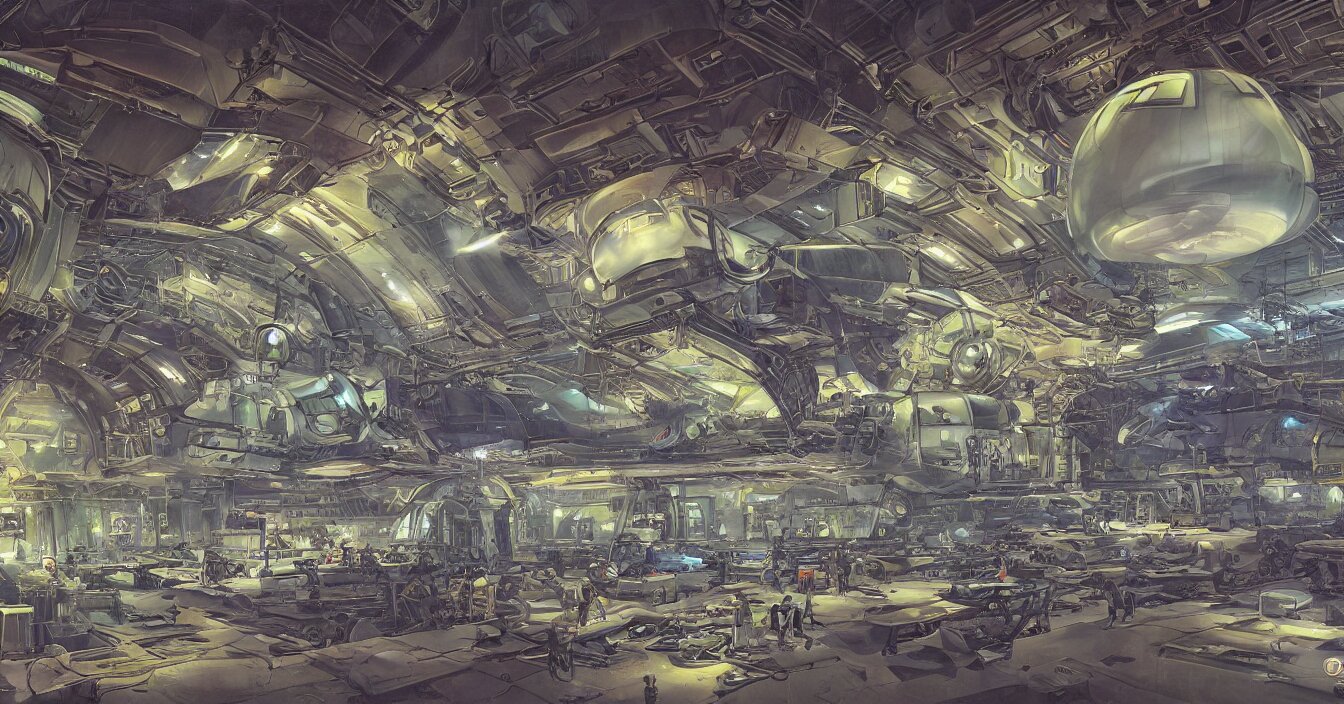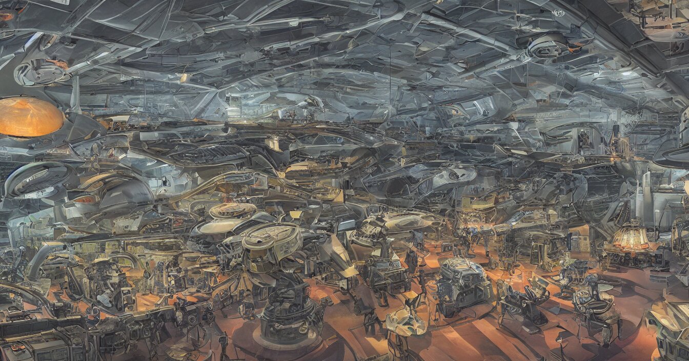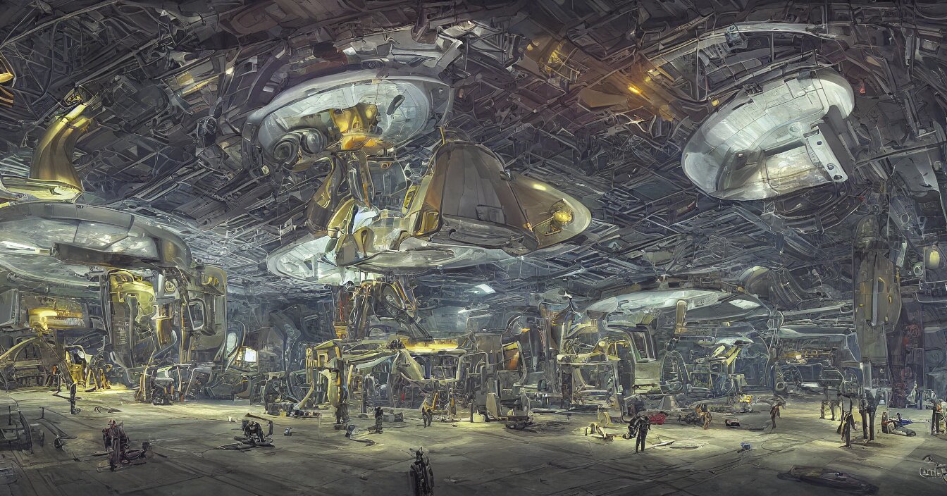 Interior of the hall in area 55, full of alien military equipment, engineers working on flying saucers, high detail, wide perspective, saturated colors, digital art, amazing concept art, by darwin cellis