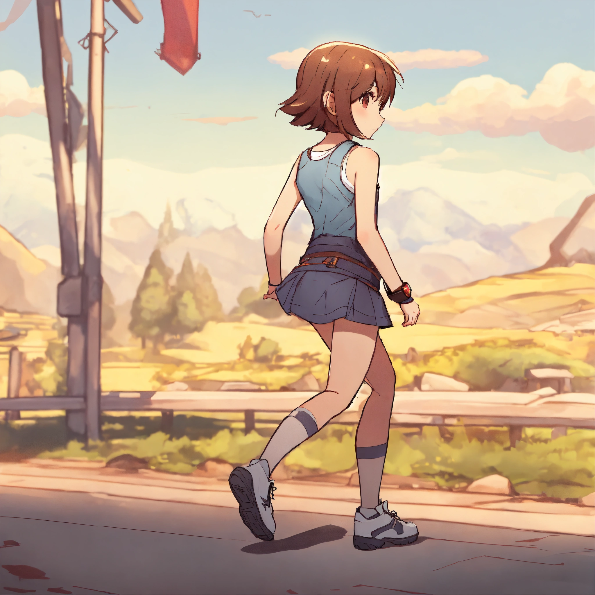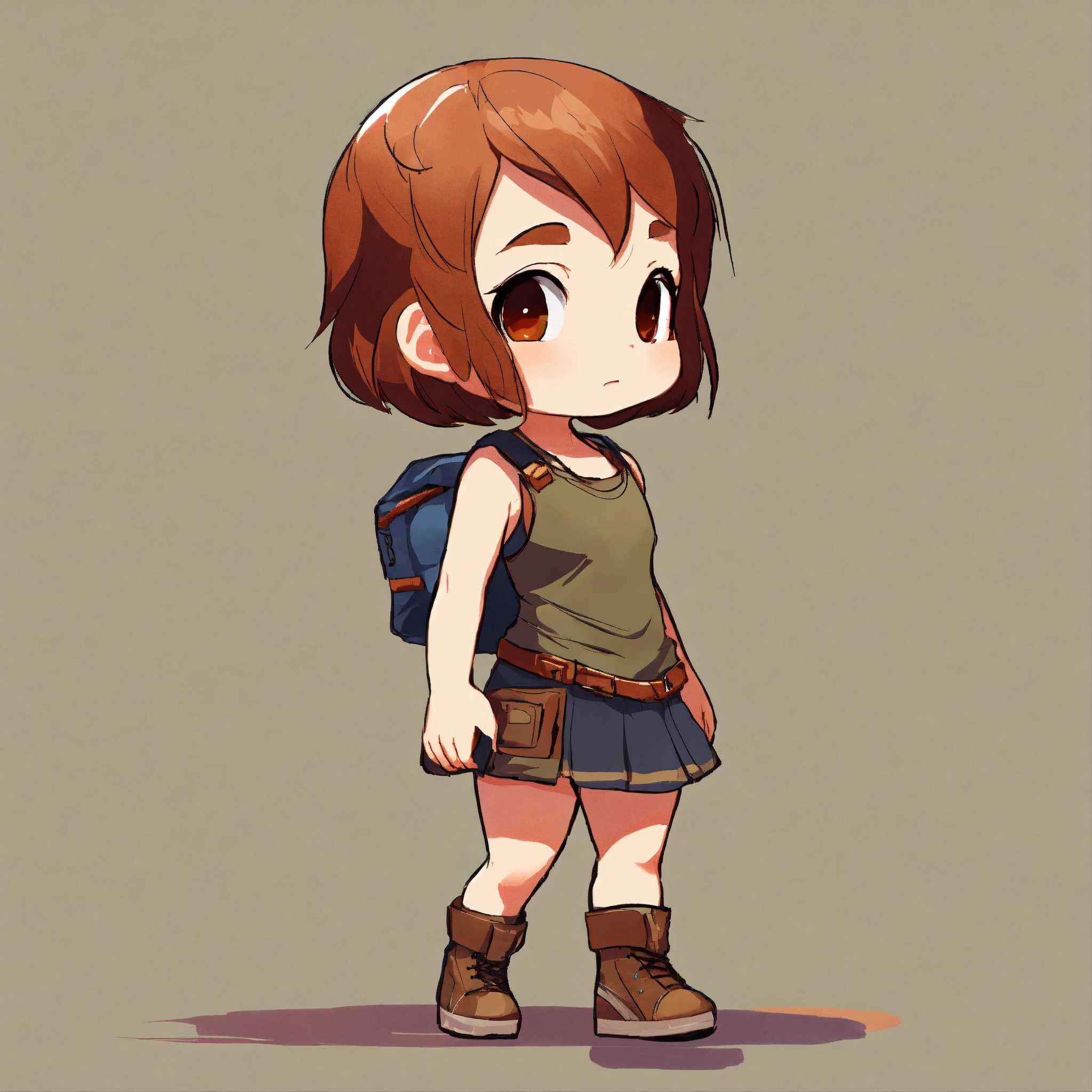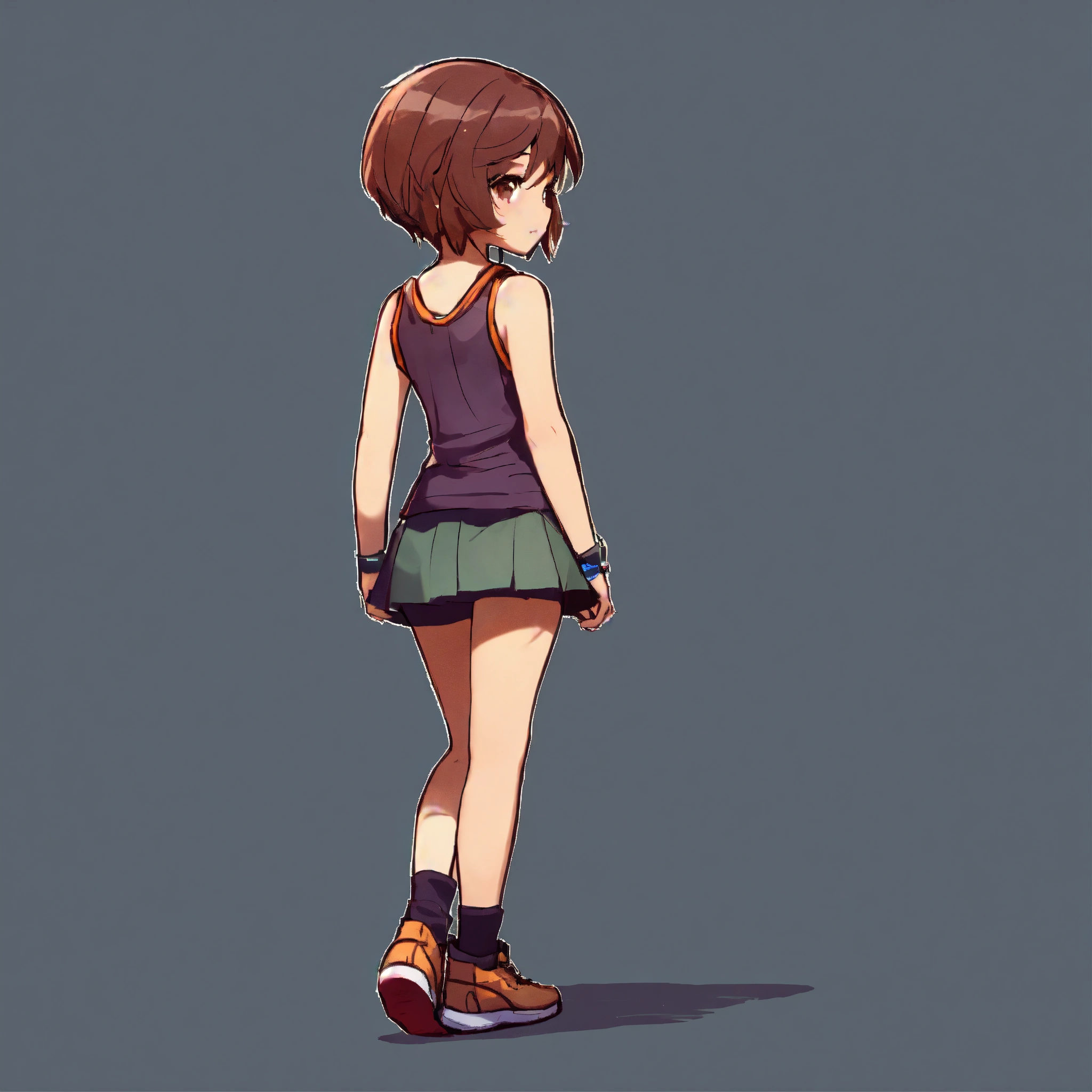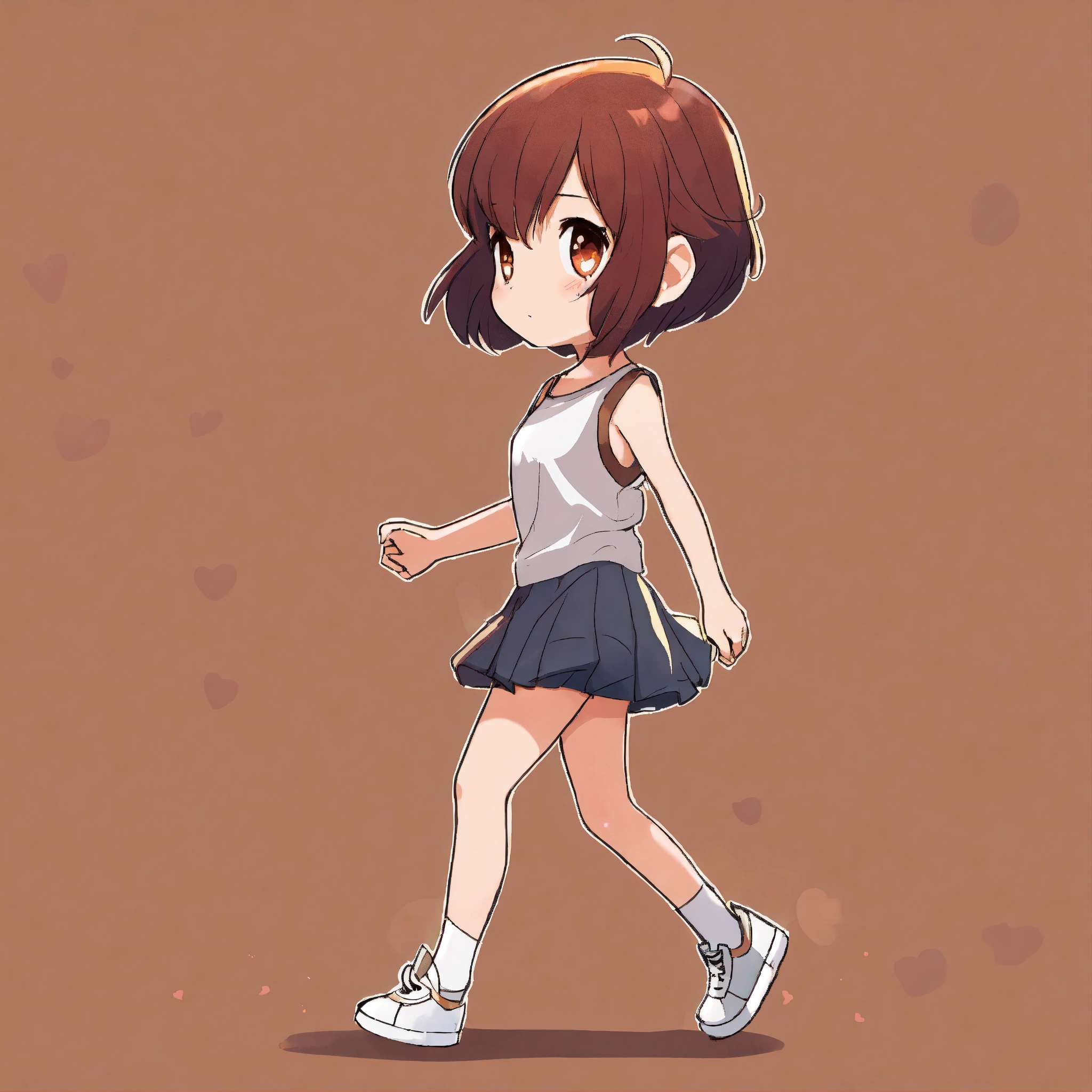 Short haired girl wearing tank top and short skirt, walking, game art, full body view, side view, artstyle from heartstone, chibi proportions, blank background, no line art
