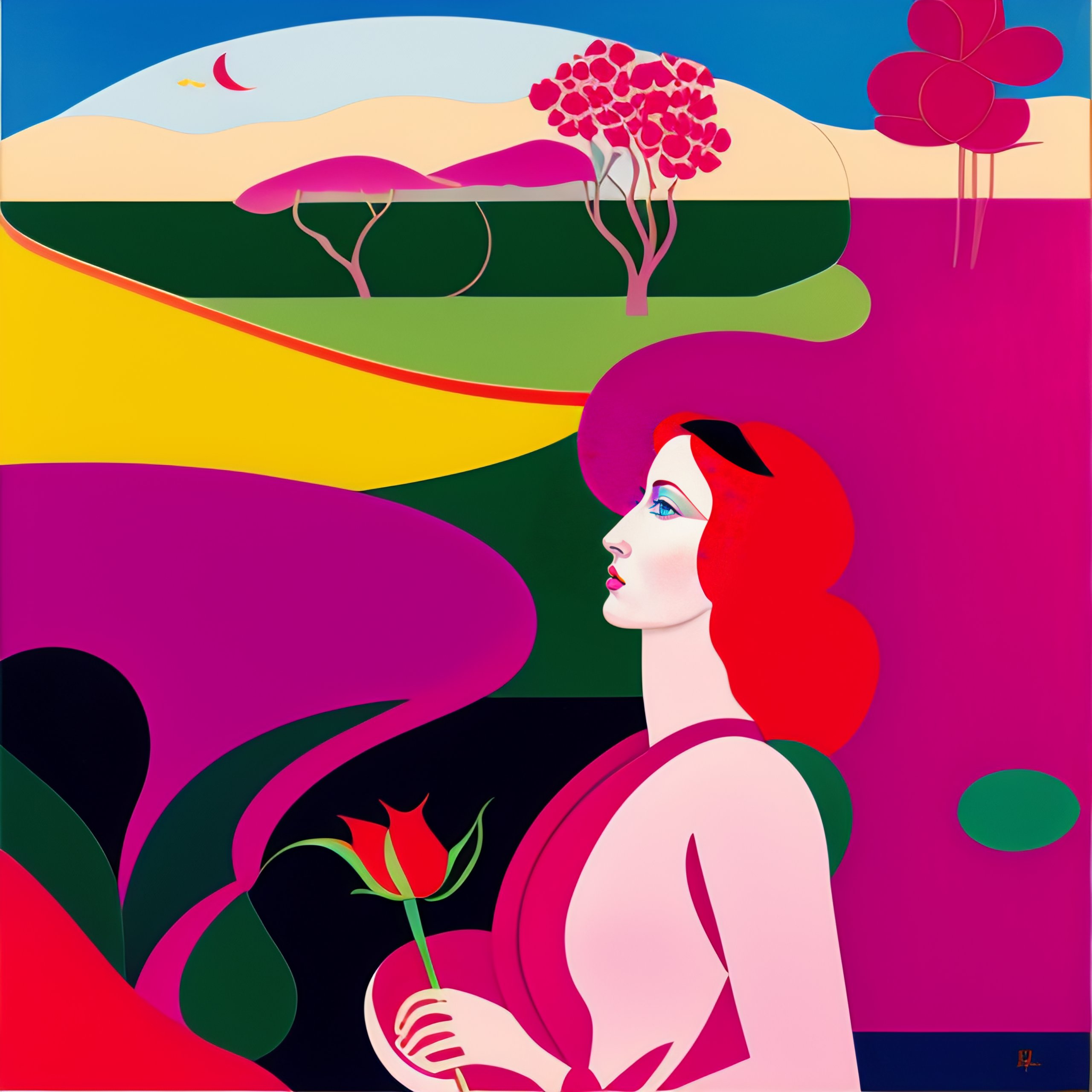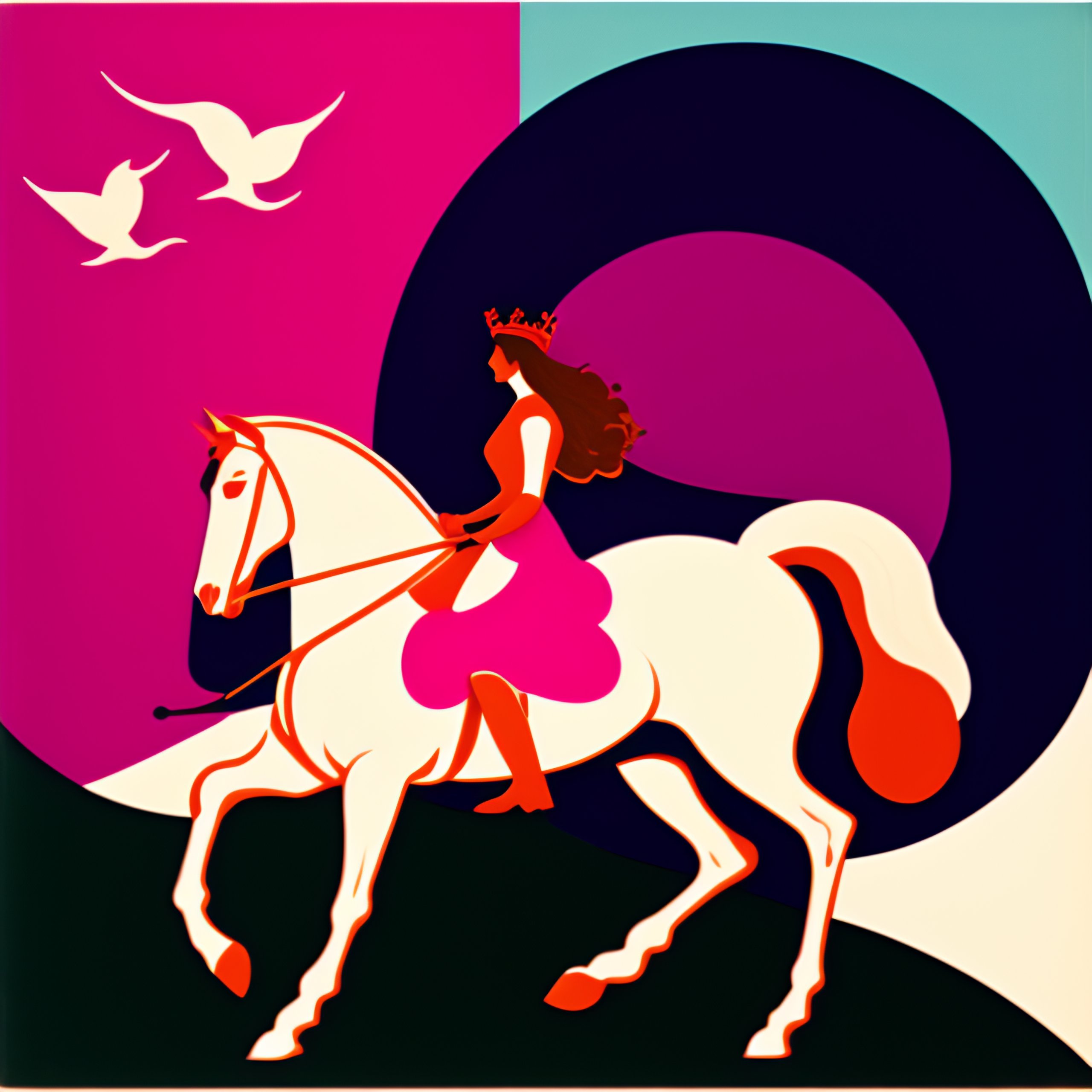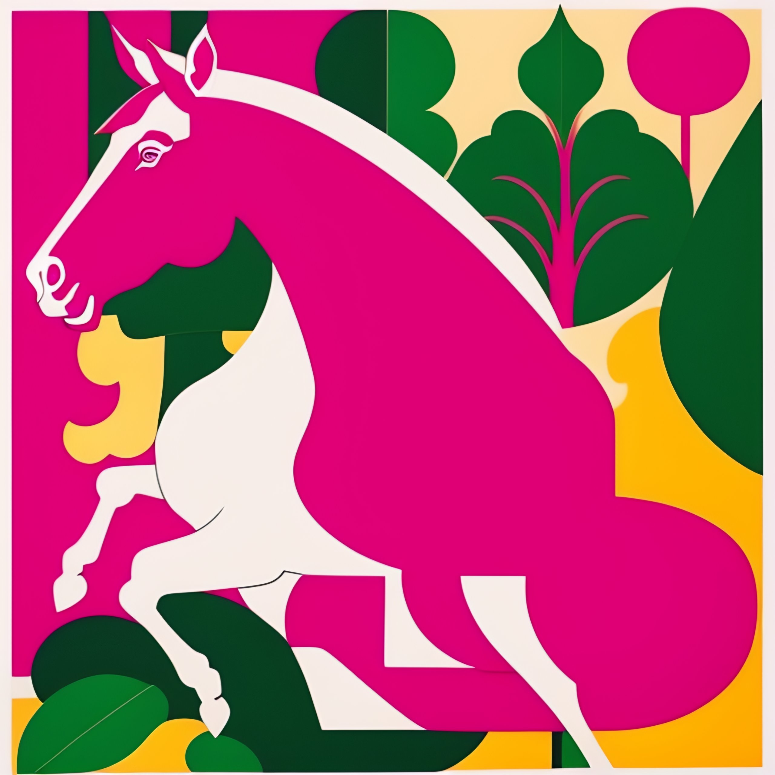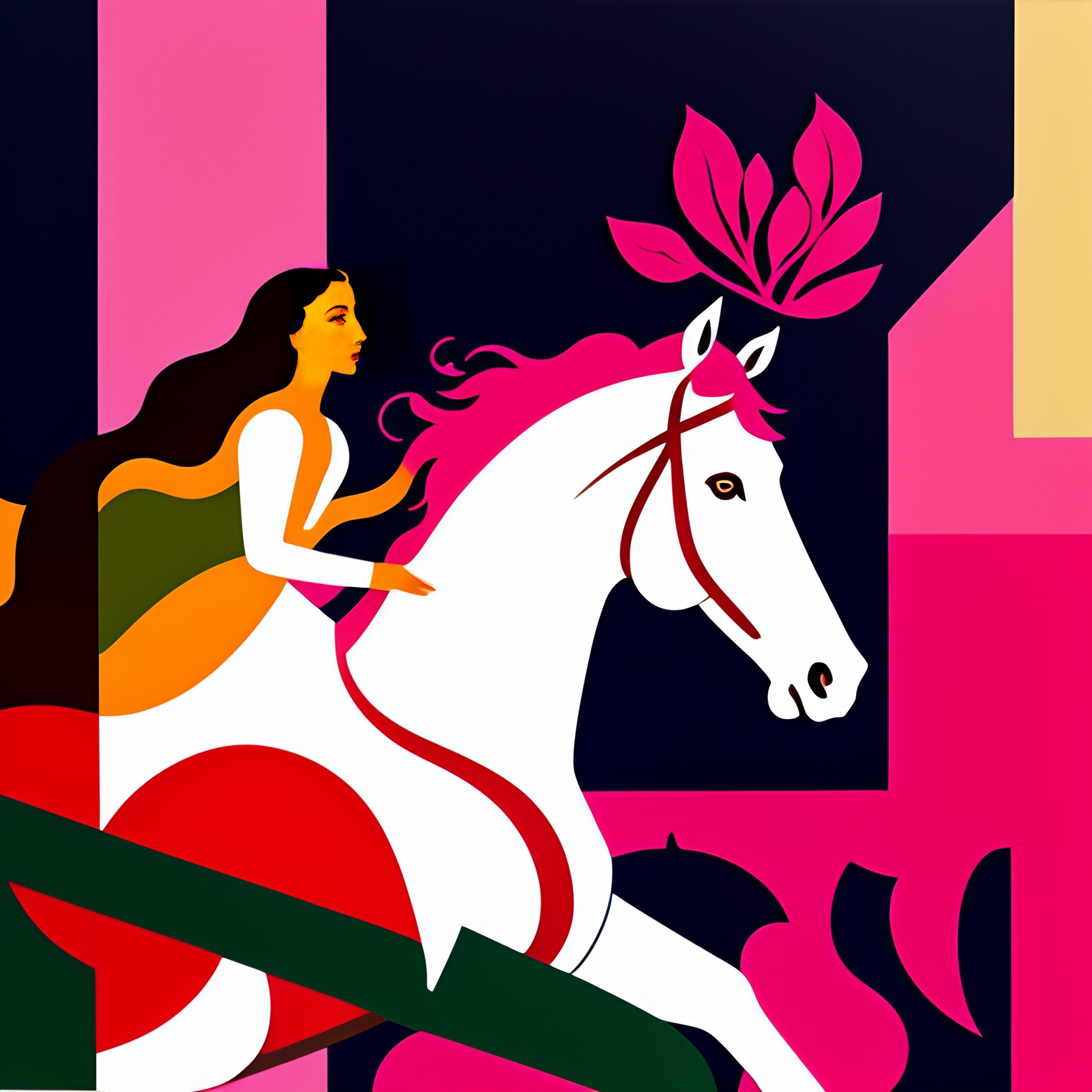 Flat paper collage art by henri matisse of a woman riding a white horse in a magenta dress in a rose garden on fire, horse galloper, deer antlers on her head, white arches in the background