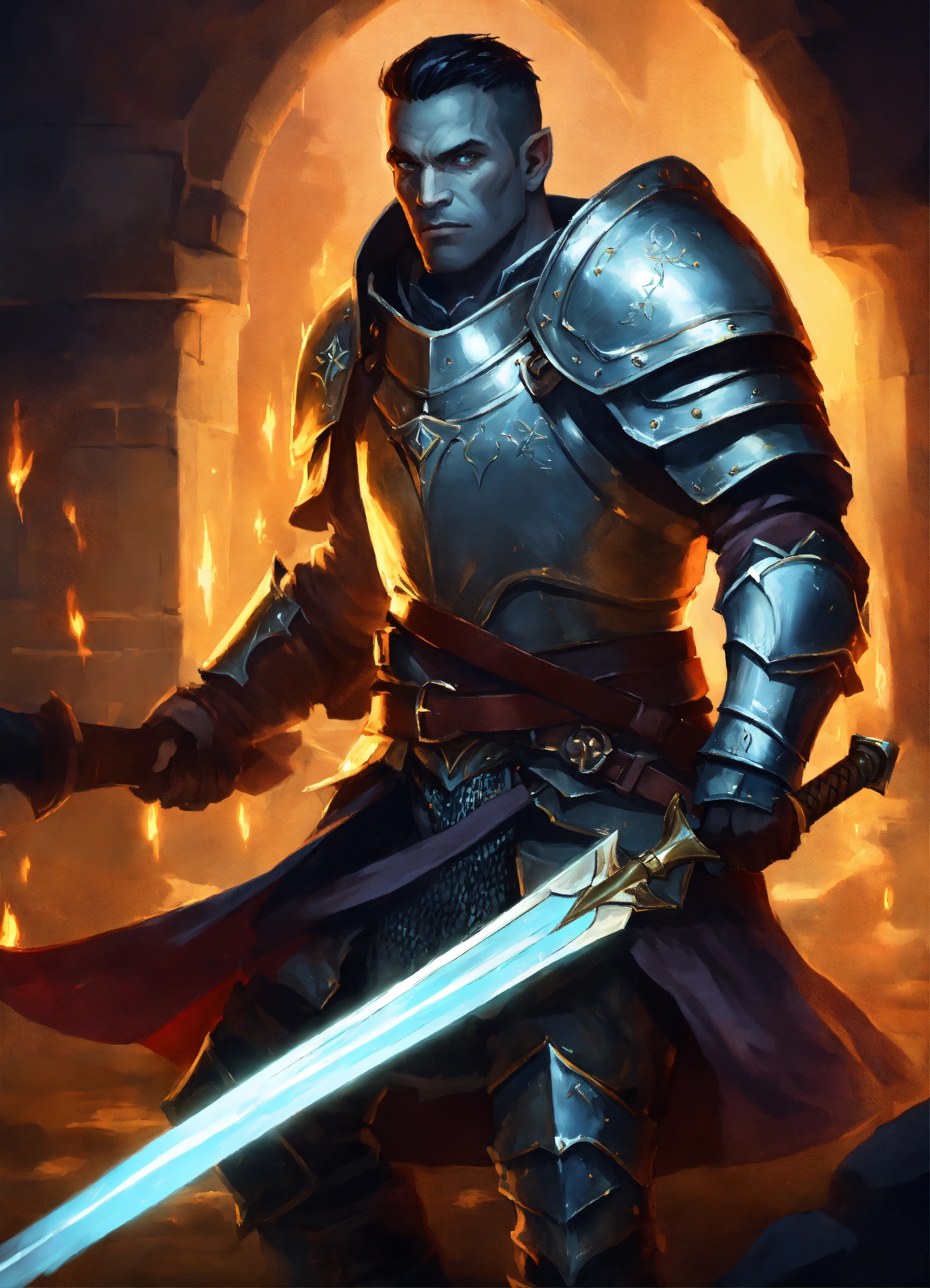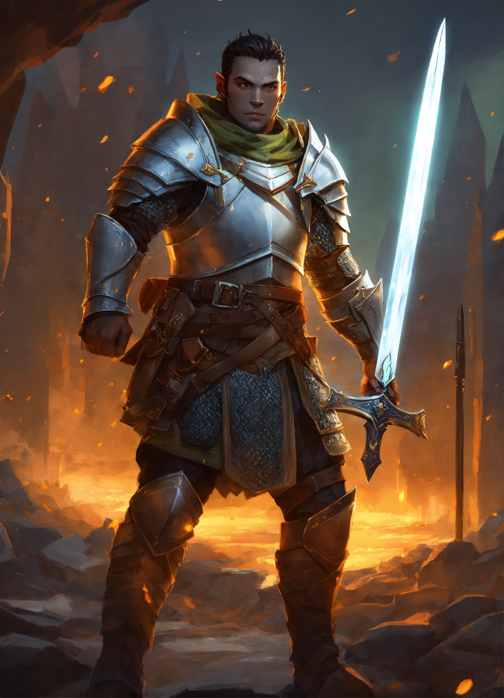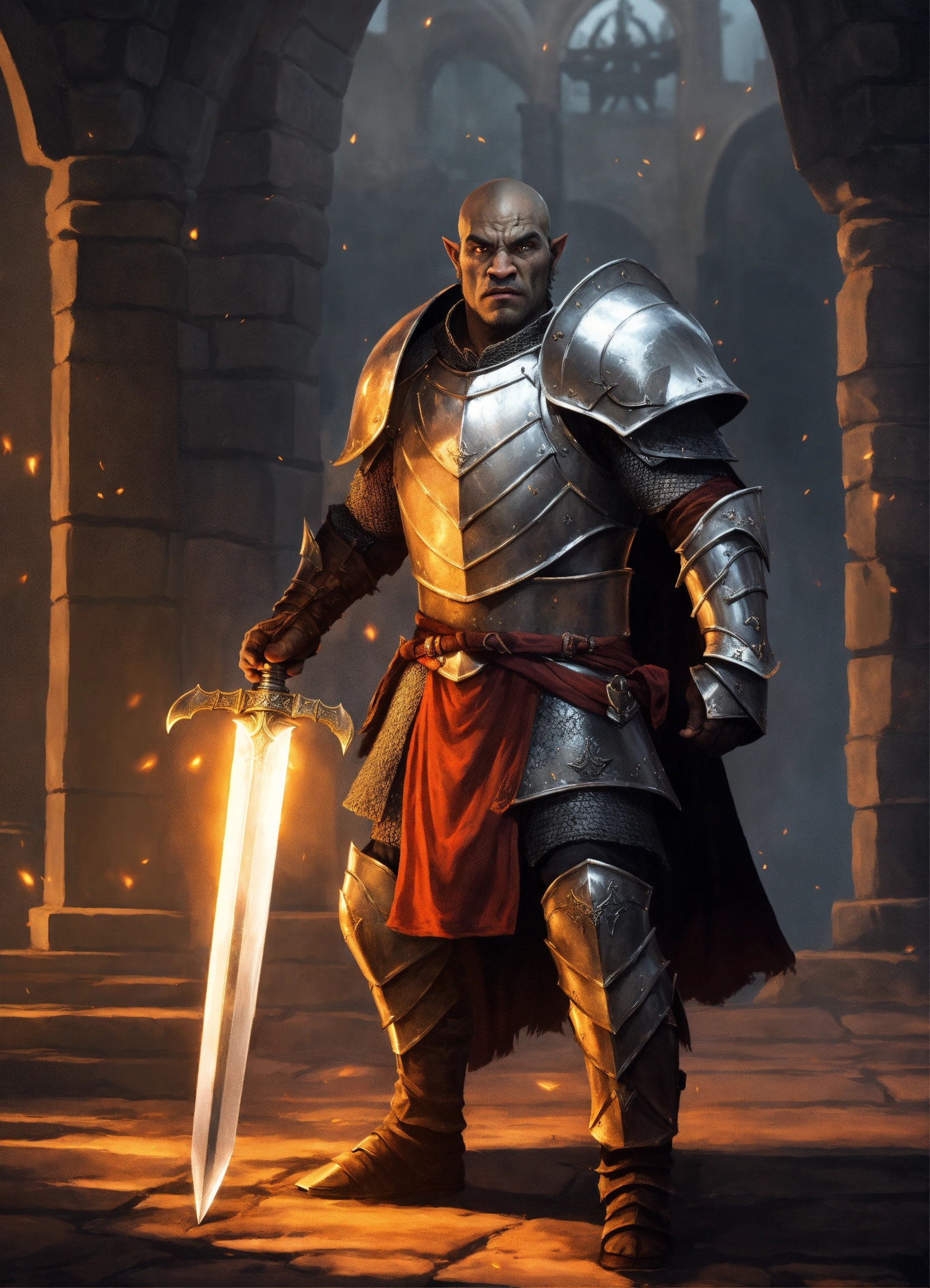 Half-orc paladin, male, grey skin, half-plate armor, holding a glowing sword, medieval battleground background