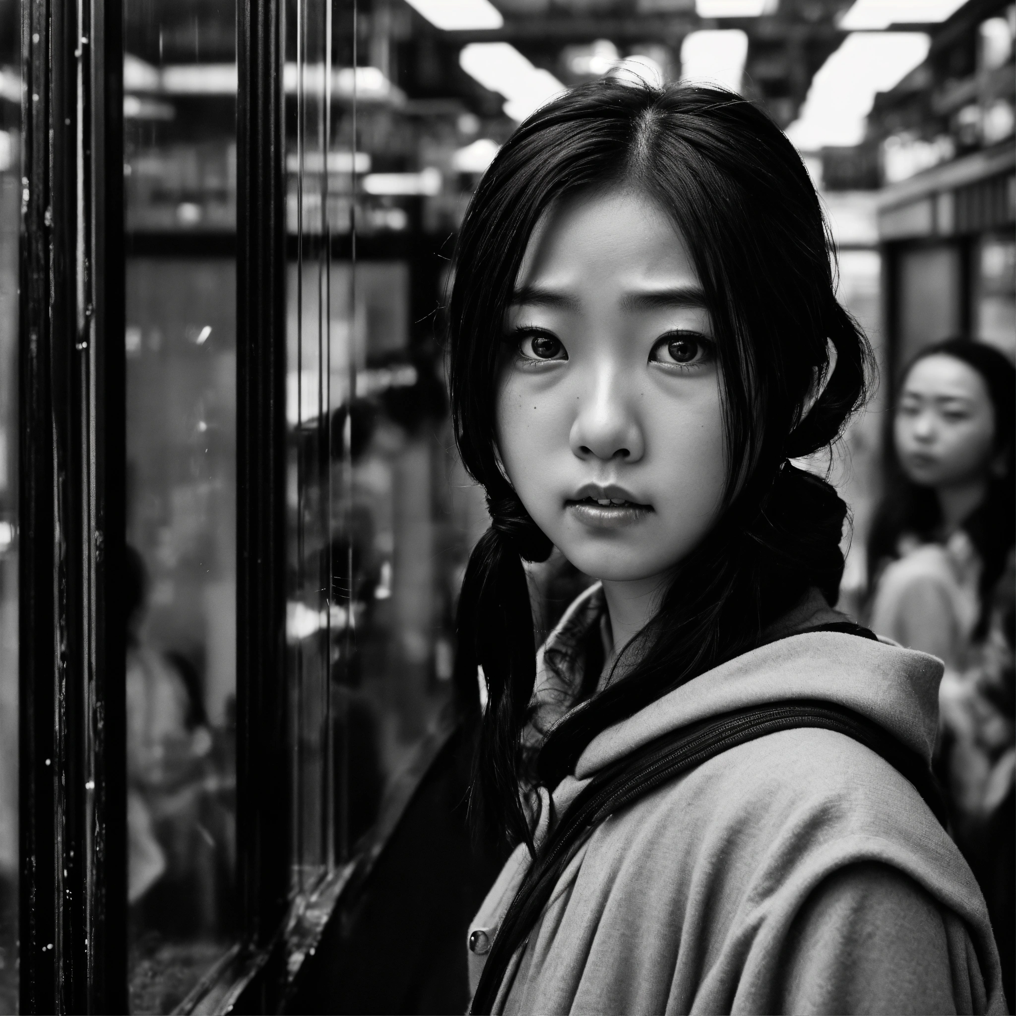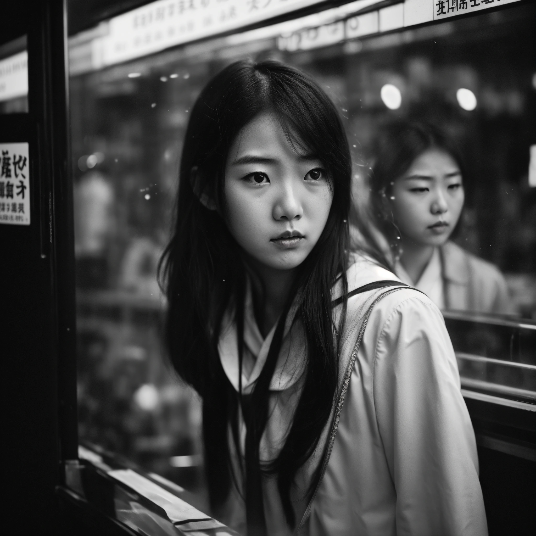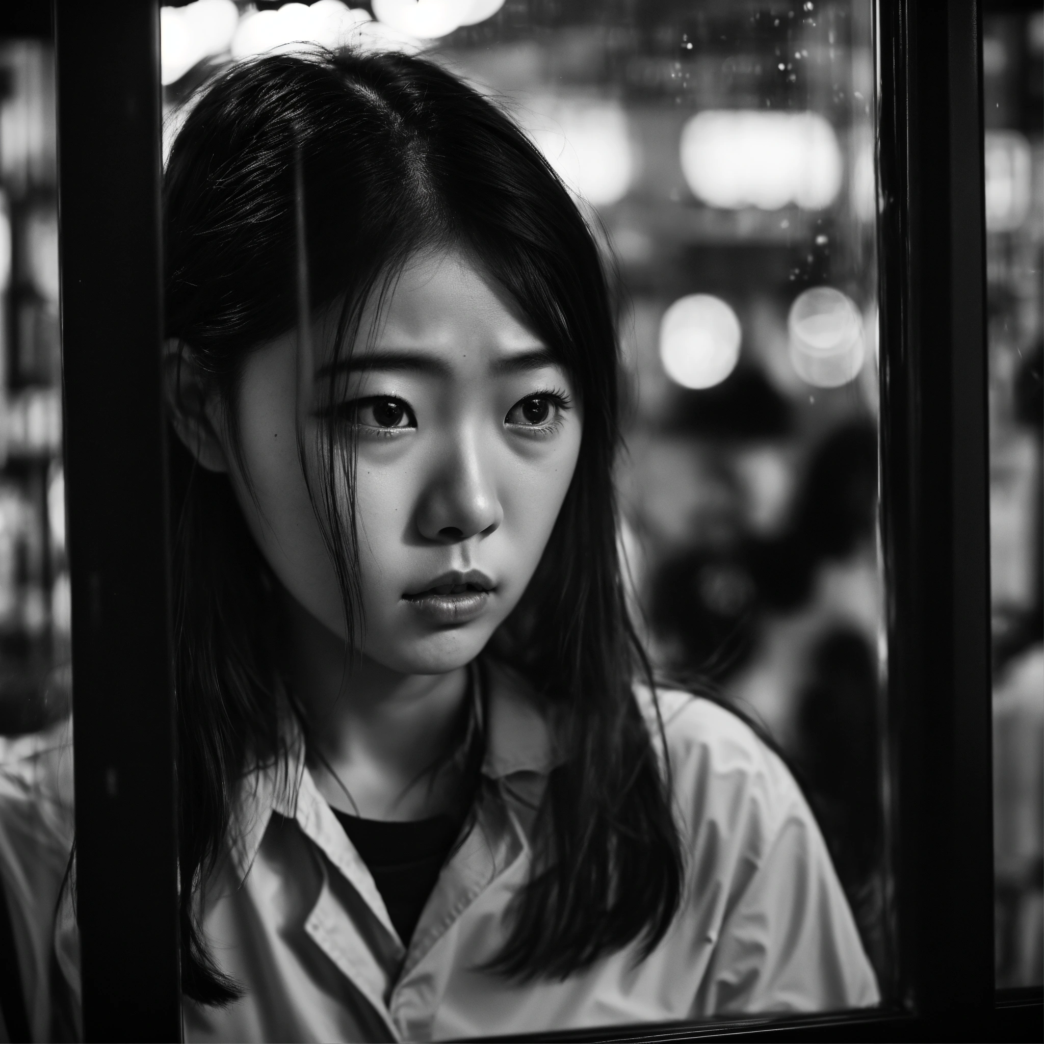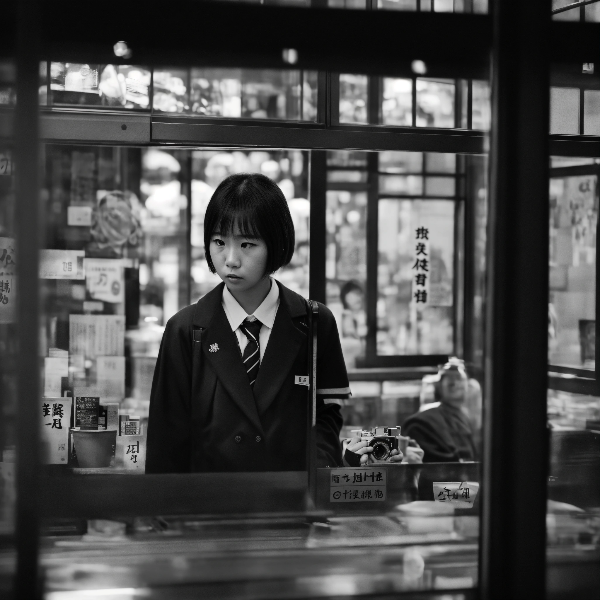 The detailed black-and-white photographs, in the midst of the bustling japanese city, the reflections of the show windows create a unique and special visual effect. beautiful japanese high school girl showing a faint expression of surprise and disgust when suddenly photographed.