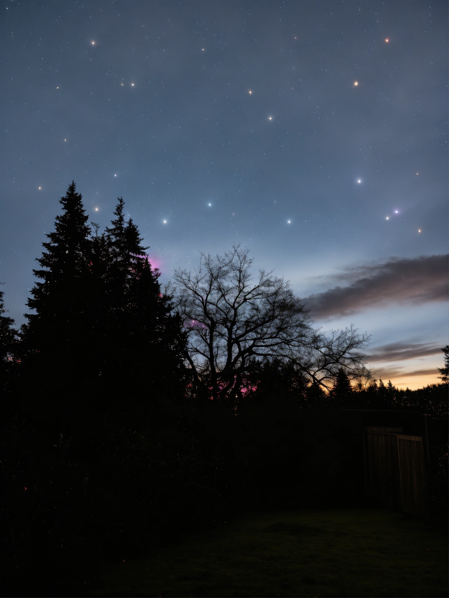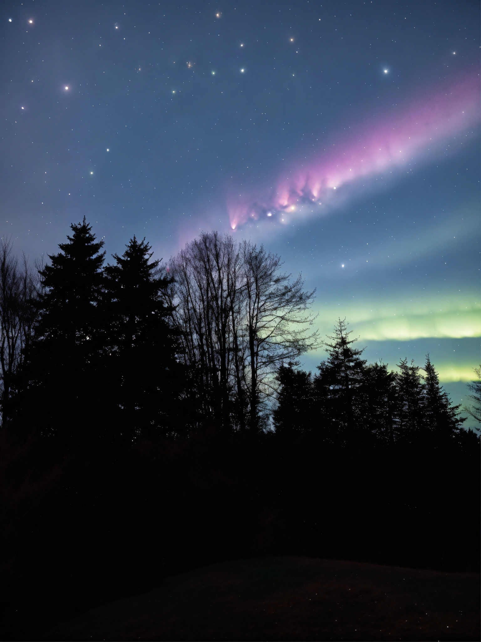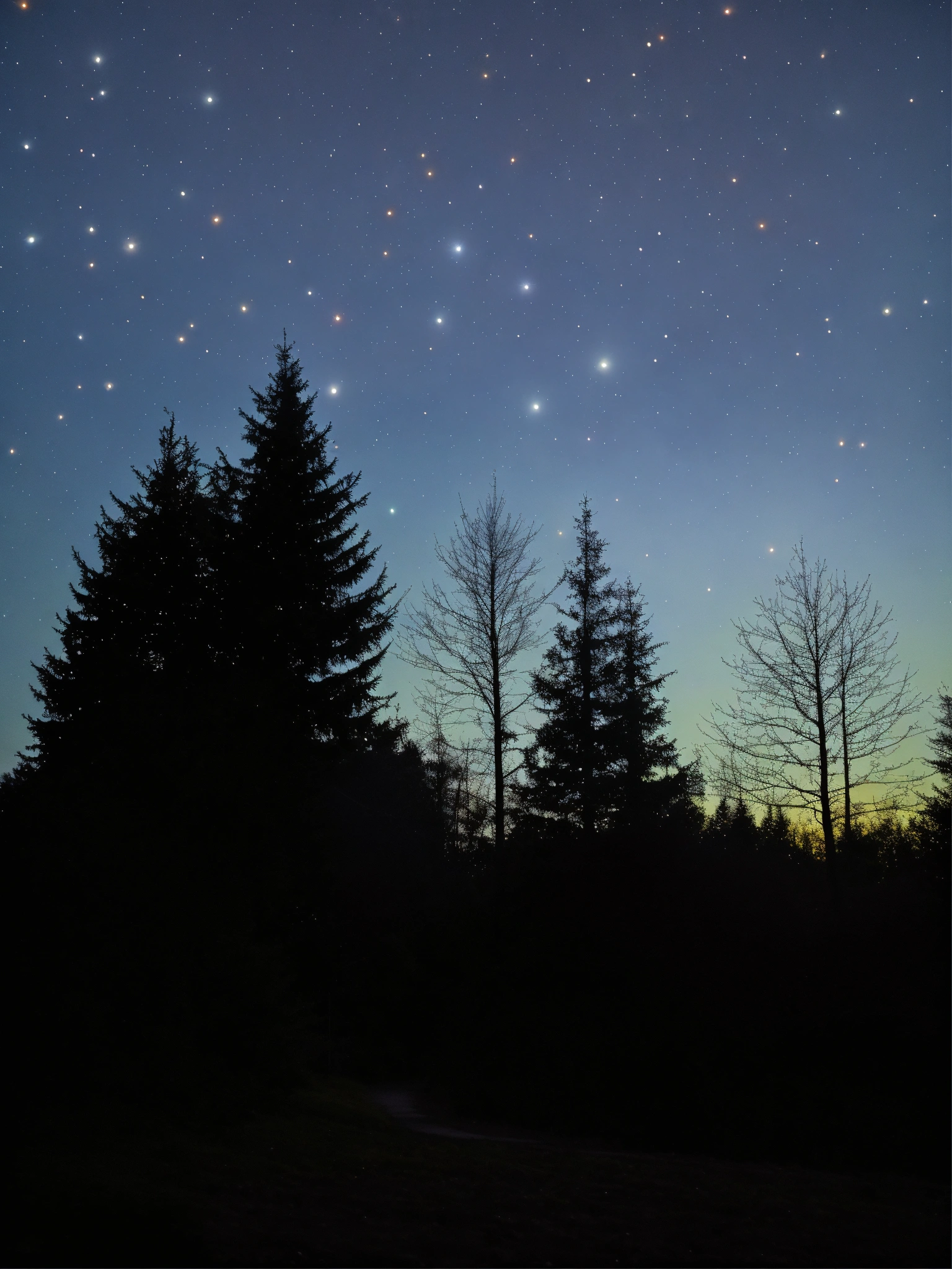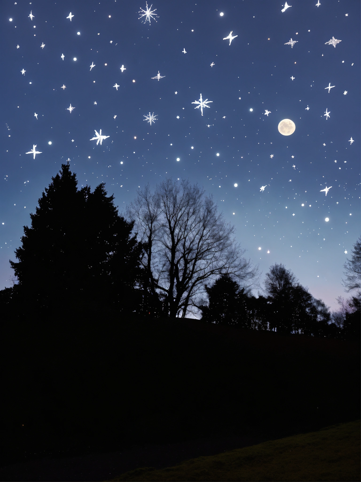 Christmas-coloured night skies with celestial bodies in the sky and silhouettes of trees