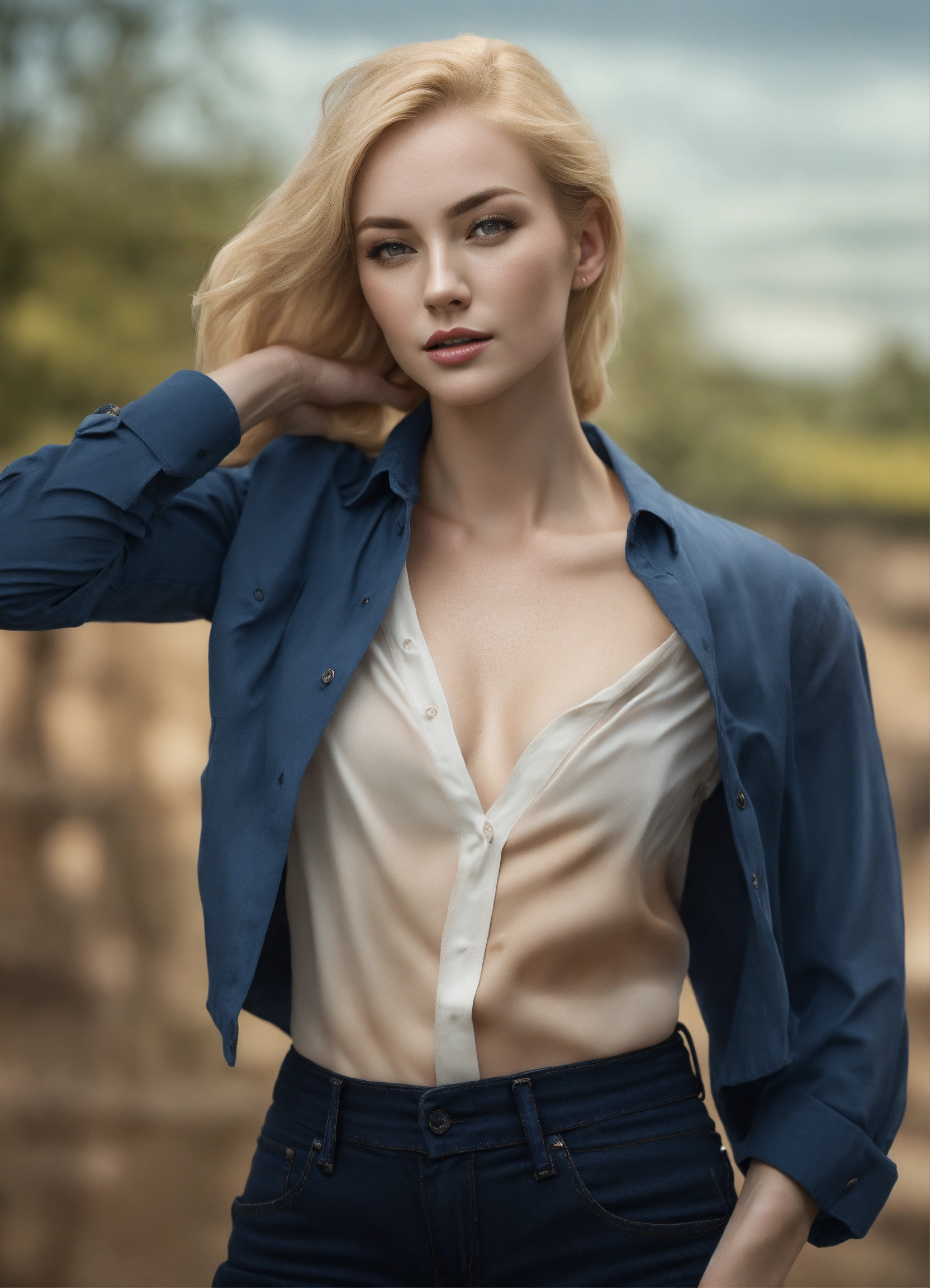 Full body potrait of a women transforming into a tall woman, extreme pale skin, blonde hair, thin muscular midriff with confident face, hyper realistic, highly detailed, open shirt, three quarter pose, 4k, hdr, smooth, sharp focus, high resolution.