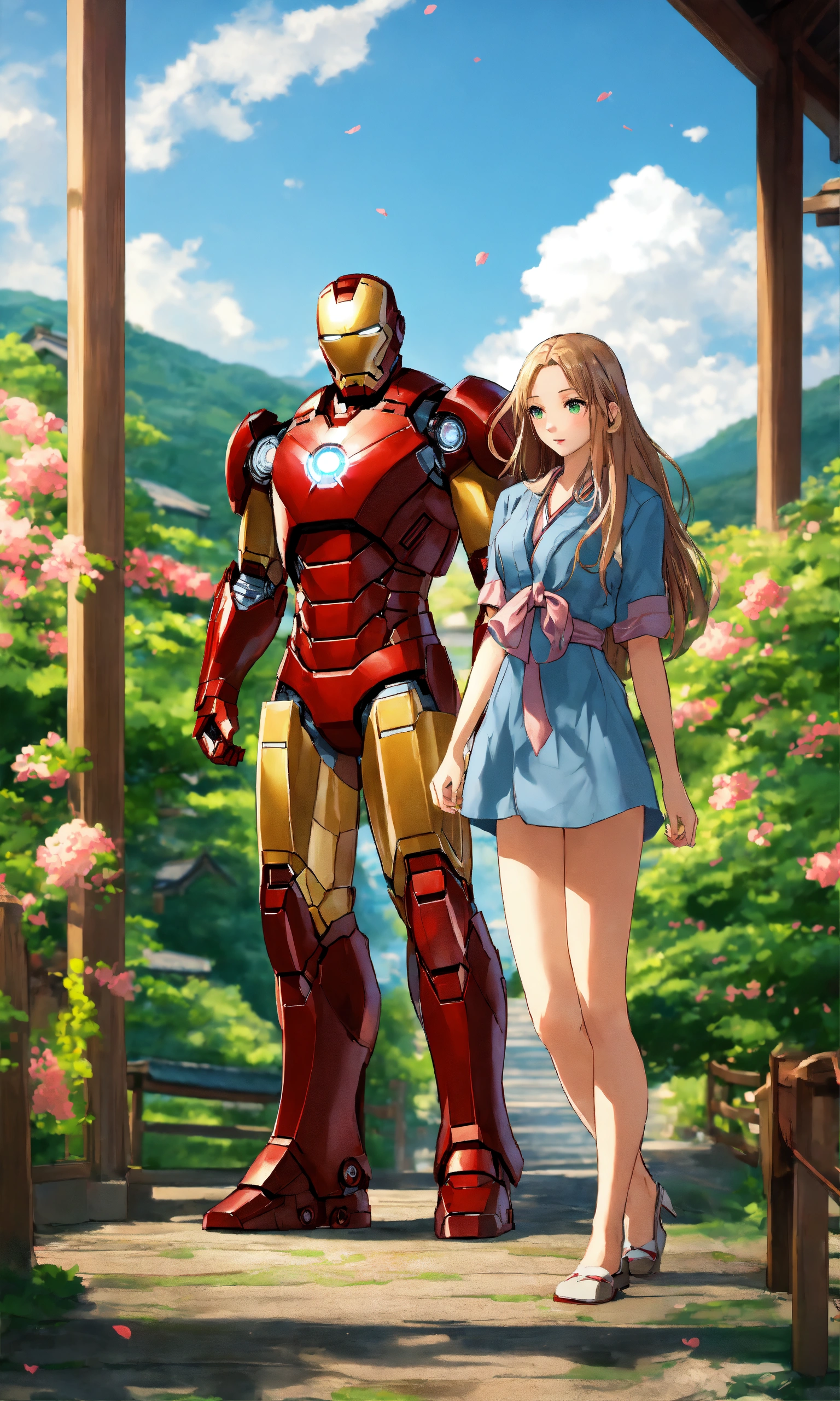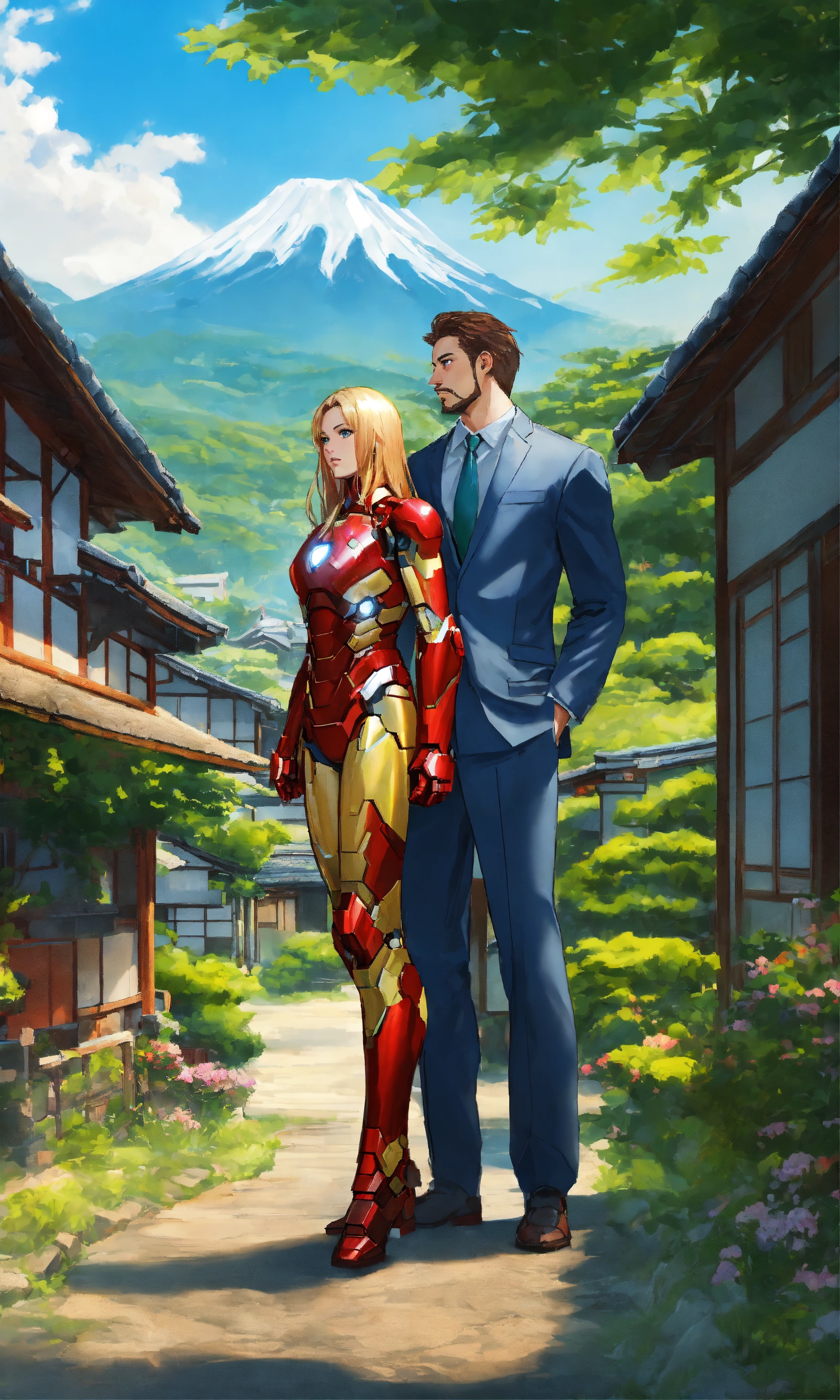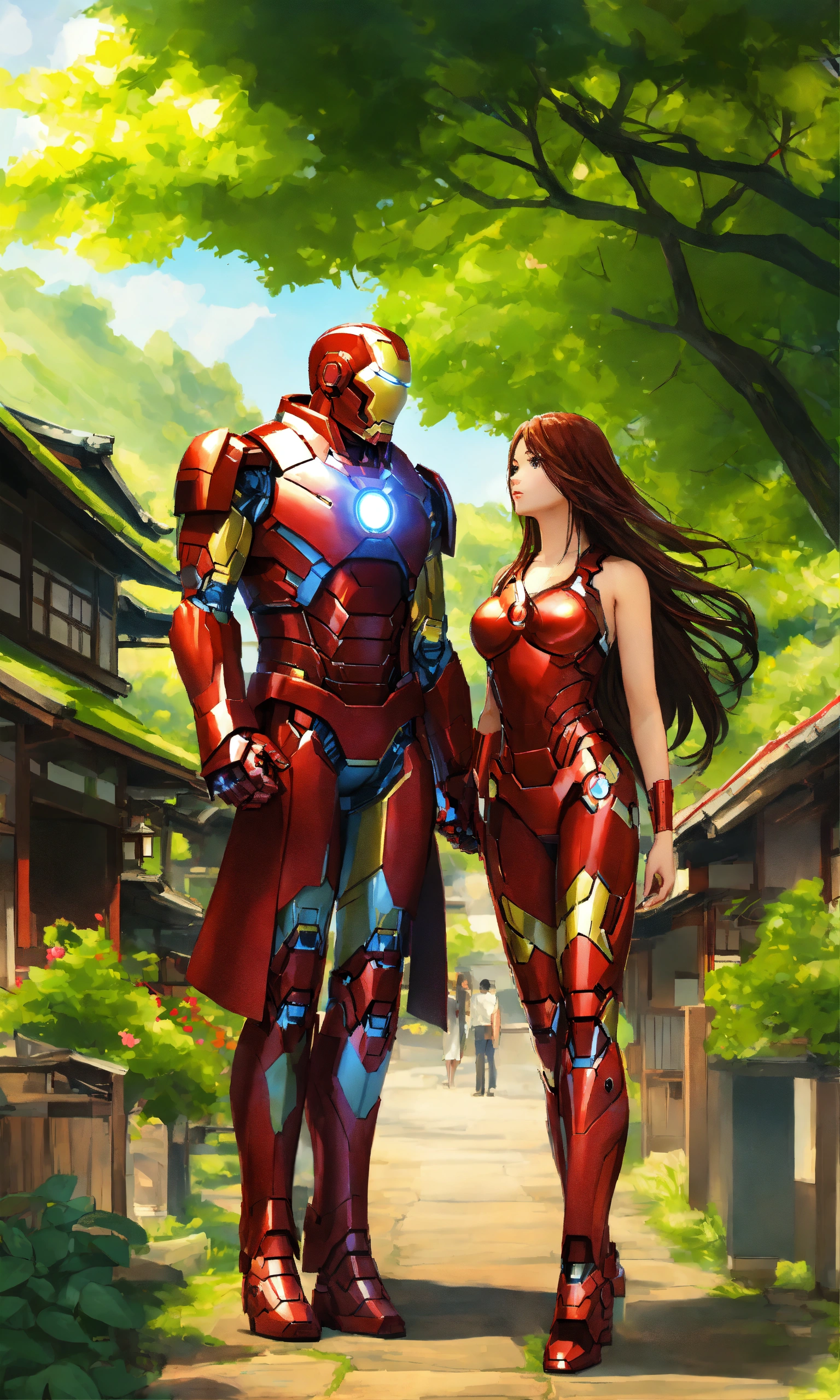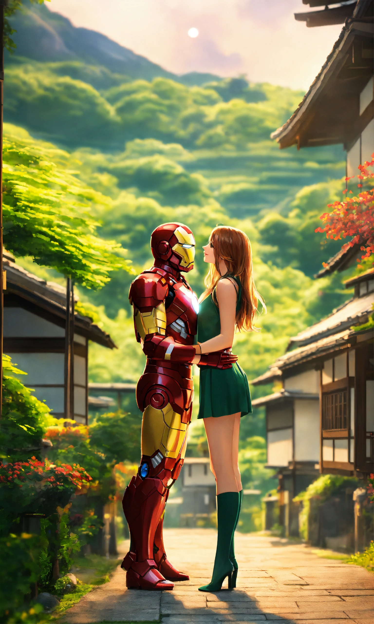 Iron man with his hot girlfriend with long hair in japan beautiful village, 2d render, green nature background, standing, full-body view, both doing romance