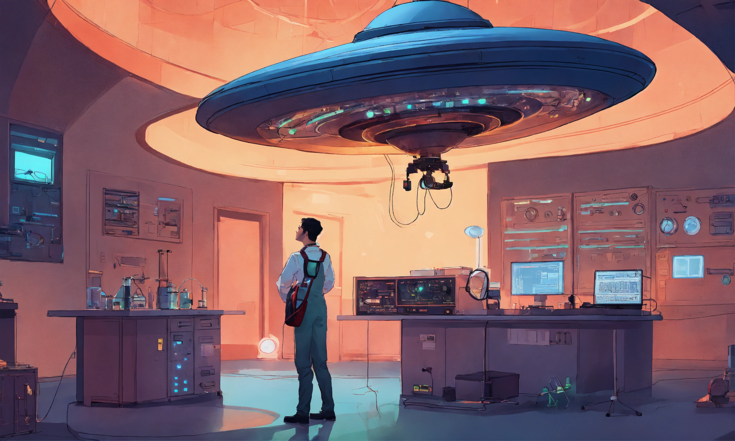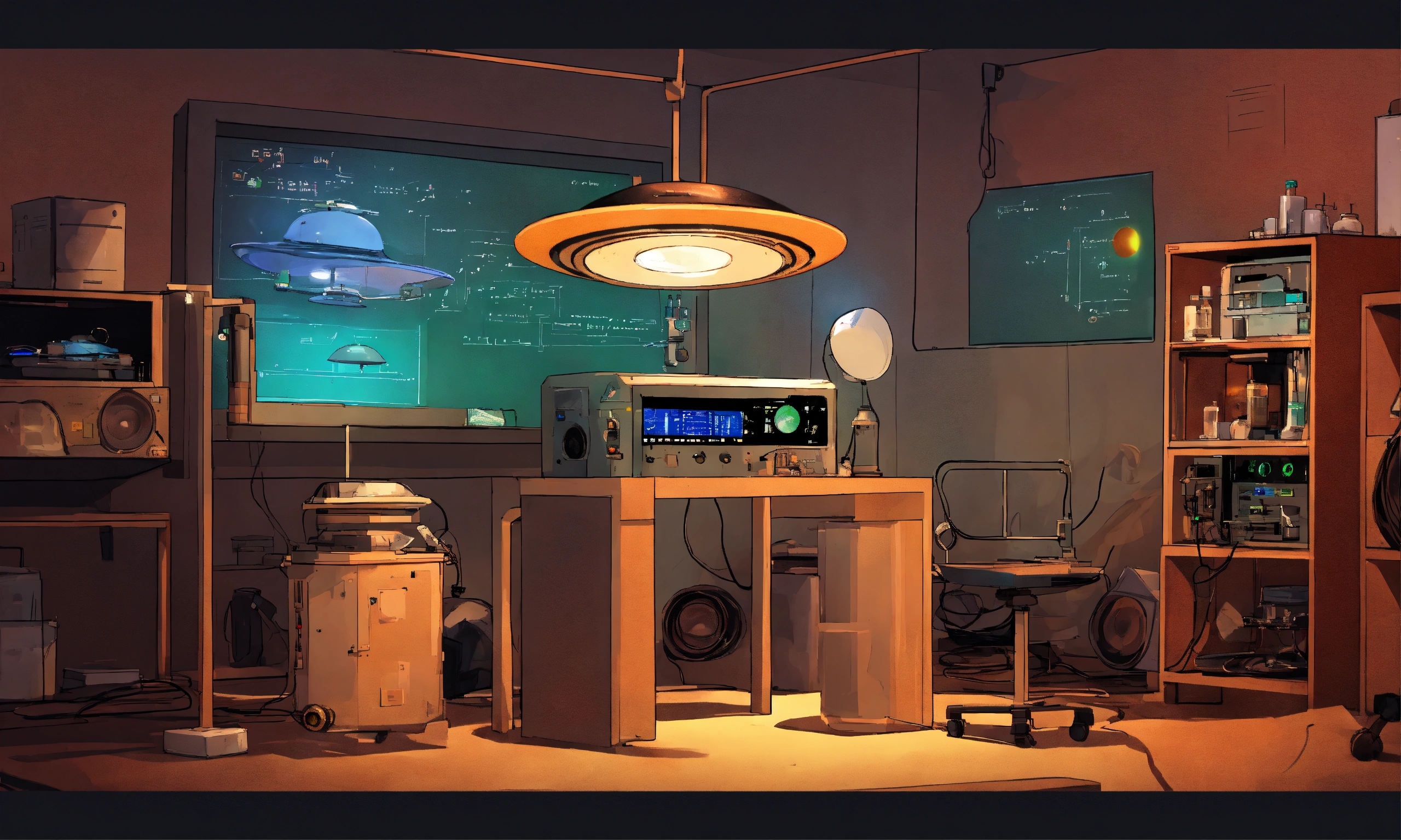 Illustrate a makeshift lab with a scientist experimenting with different speakers. nearby, a small ufo model starts to malfunction when a specific frequency is played.