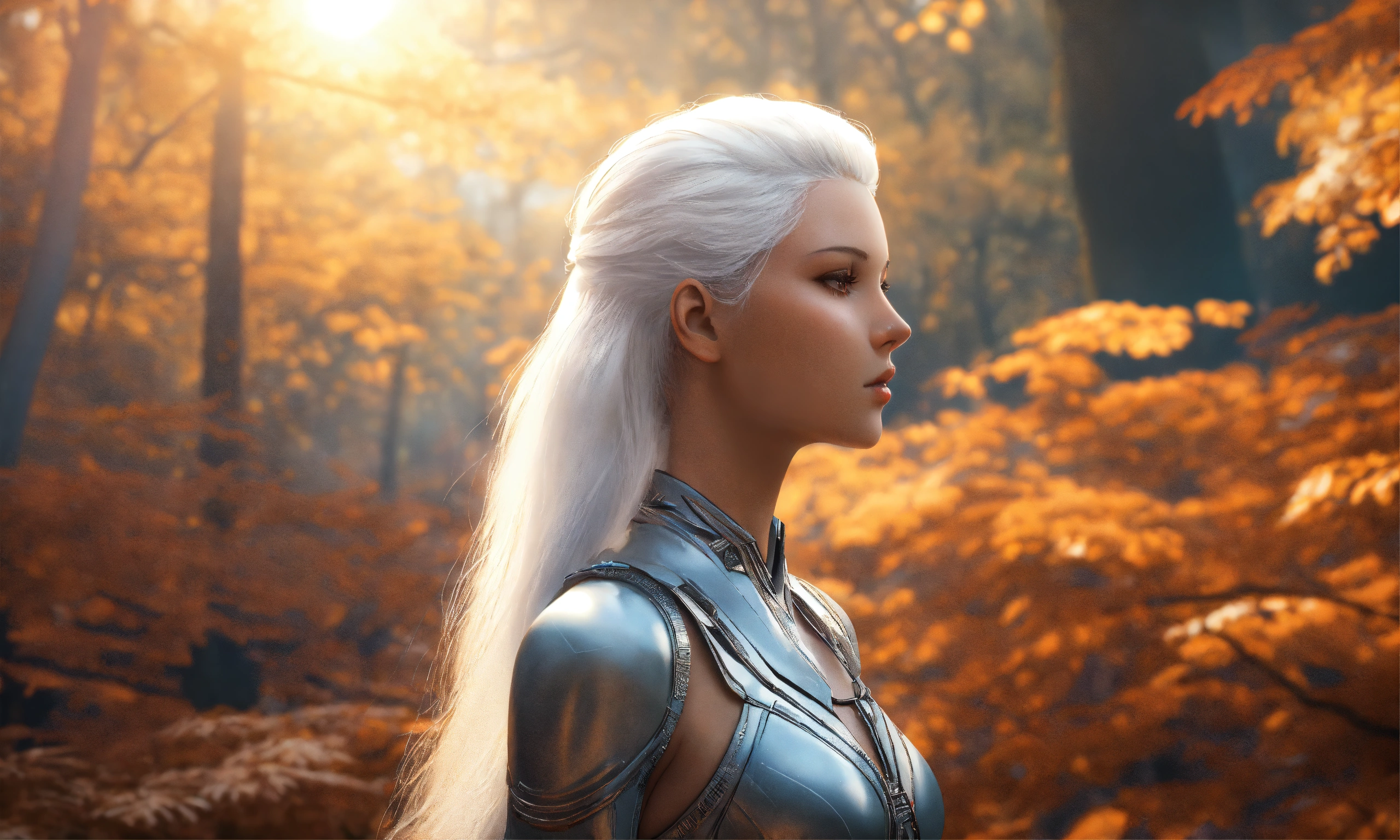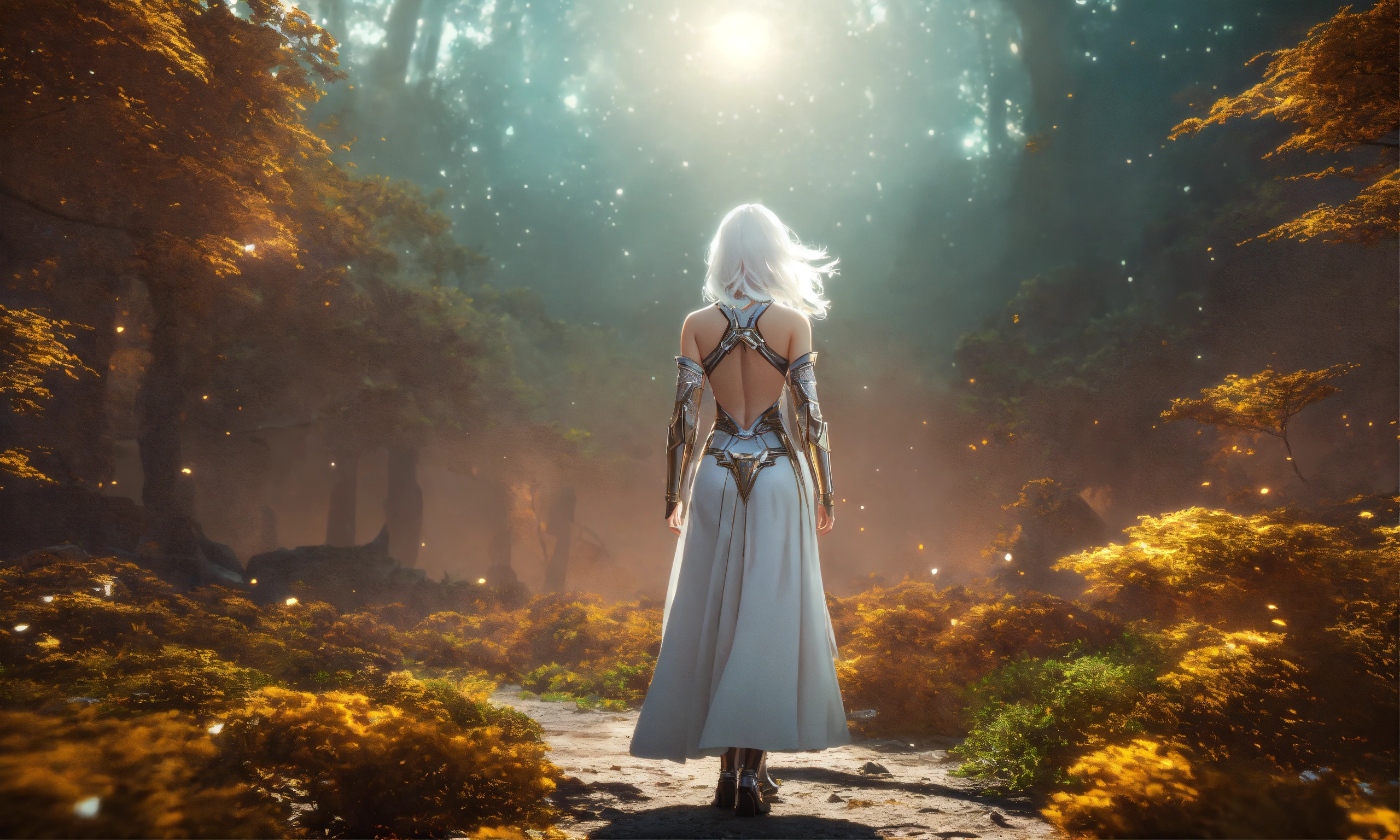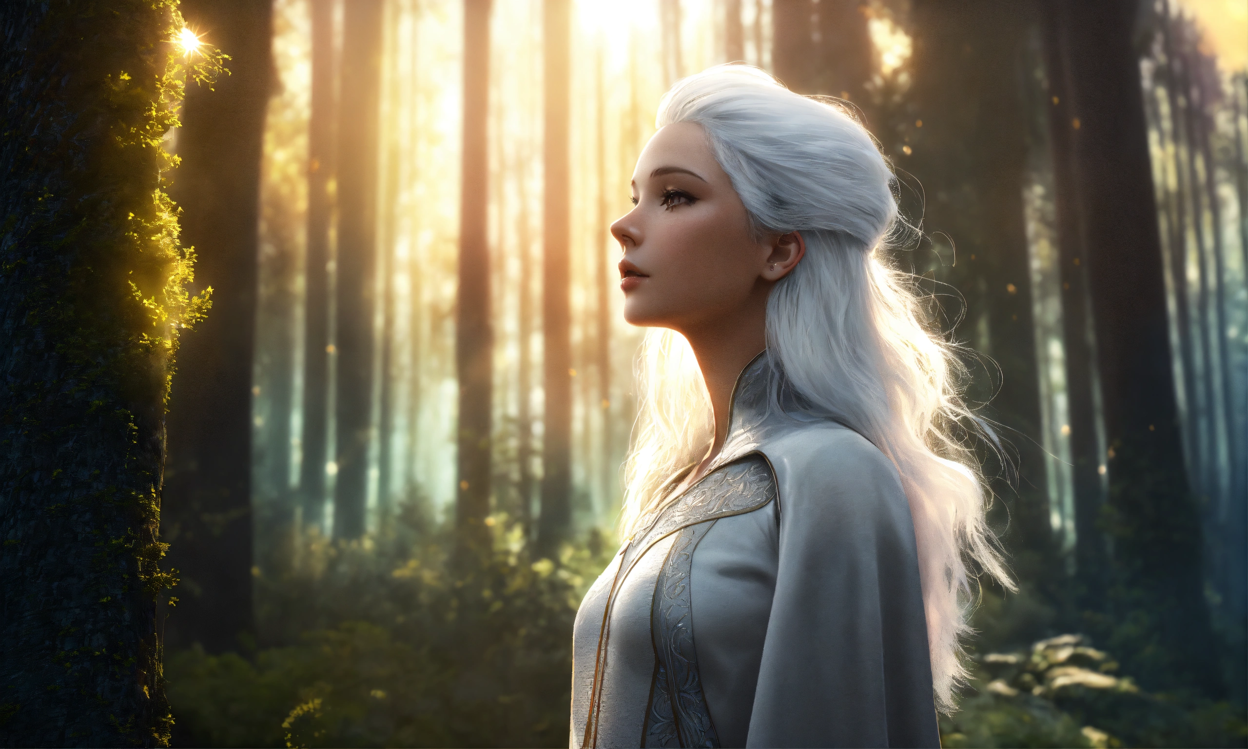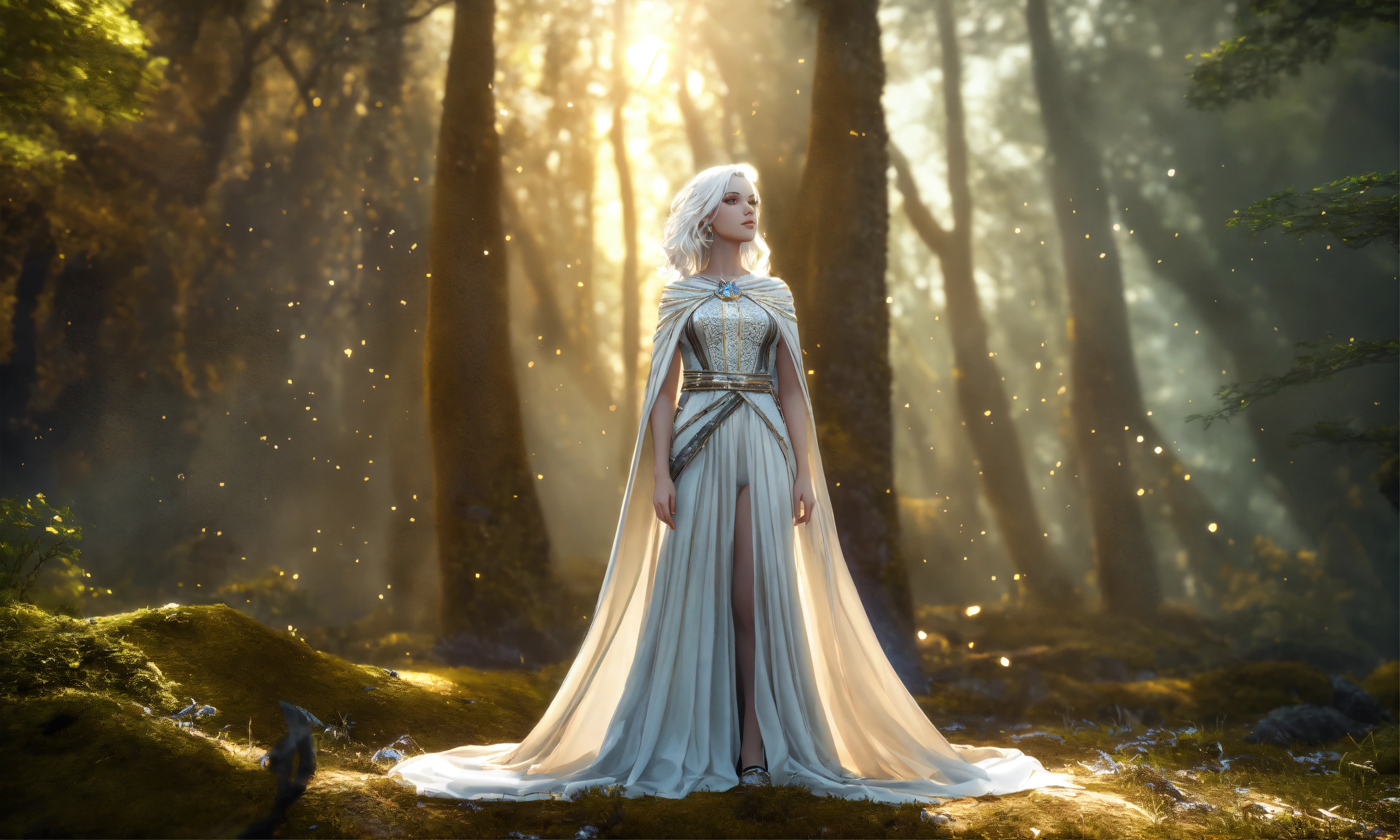 Young woman queen white hair all body, forest nebula, sun backgound, cinema 4d scifi 3d scene of a showing, hyper realism, realistic shading, realistic render, detailed textures, photorealistic, wide shot, landscape