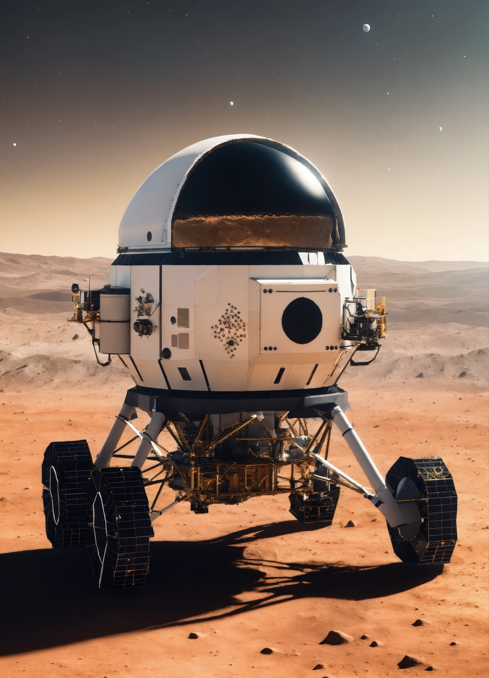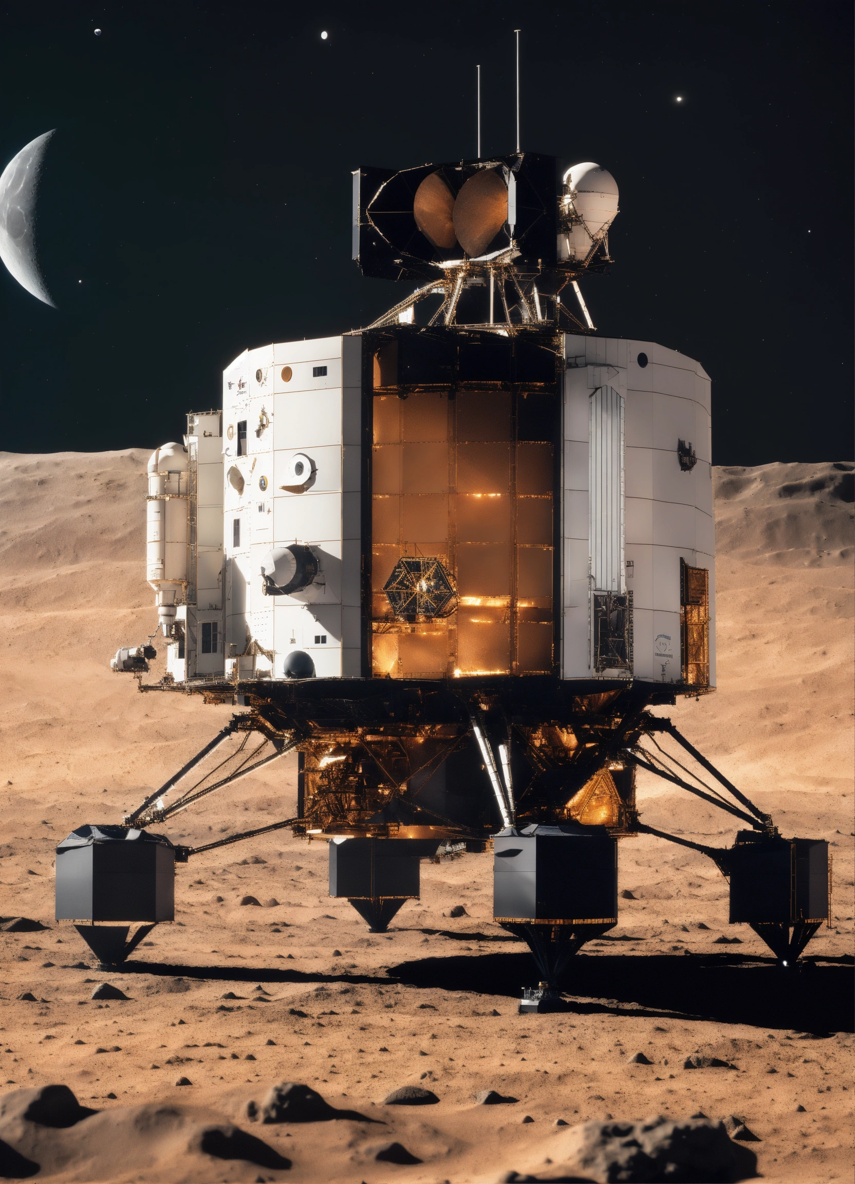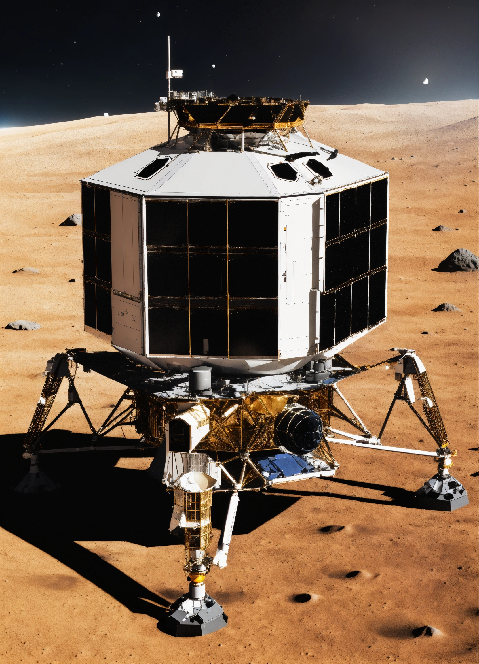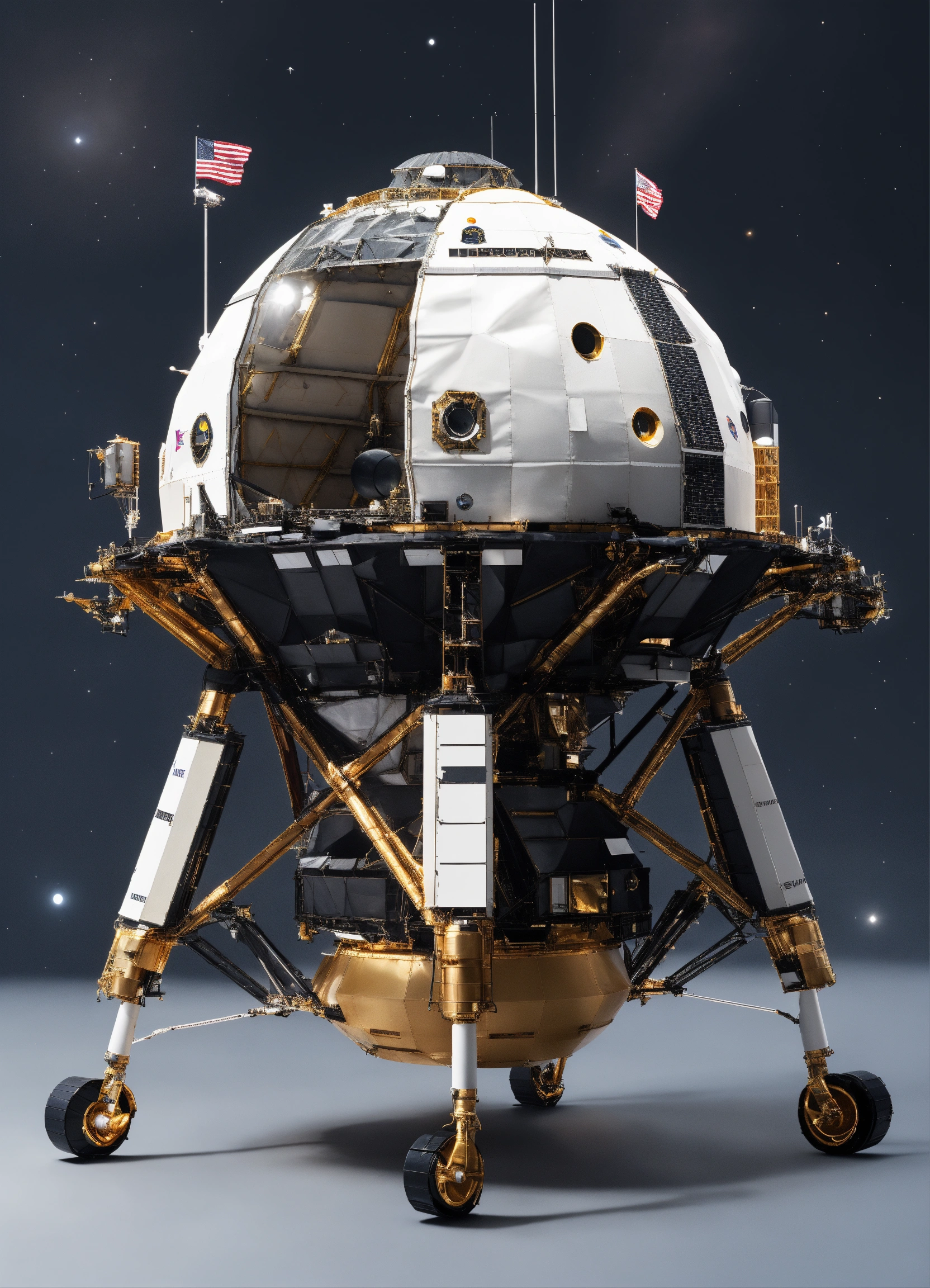 A small moon lander with similar aesthetics to the space shuttle, such as heat shielding and a black and white paint job