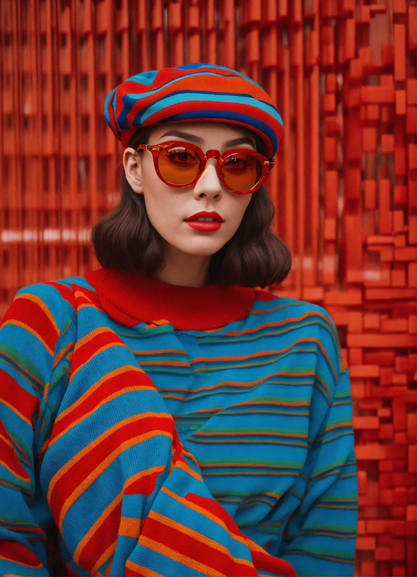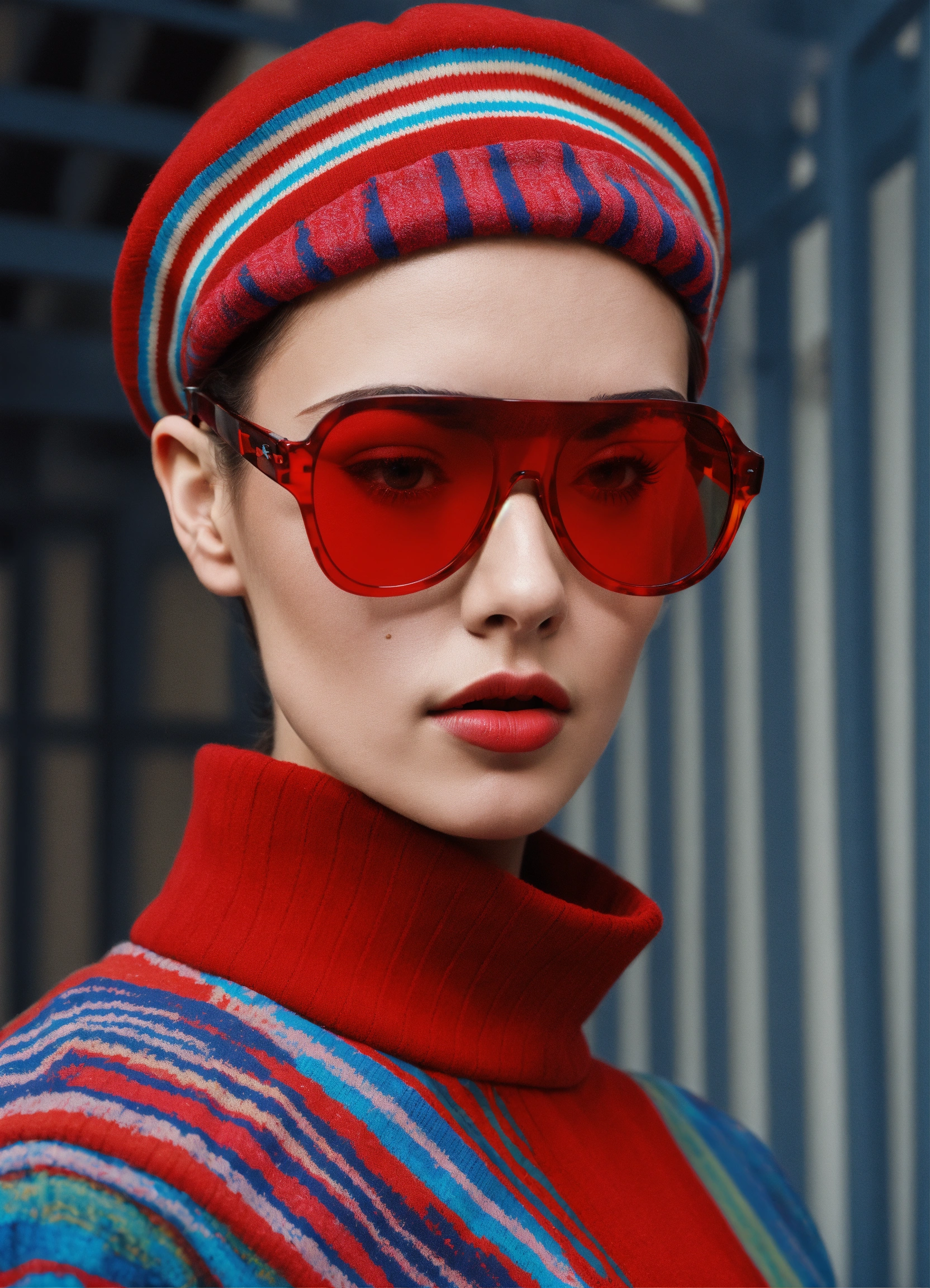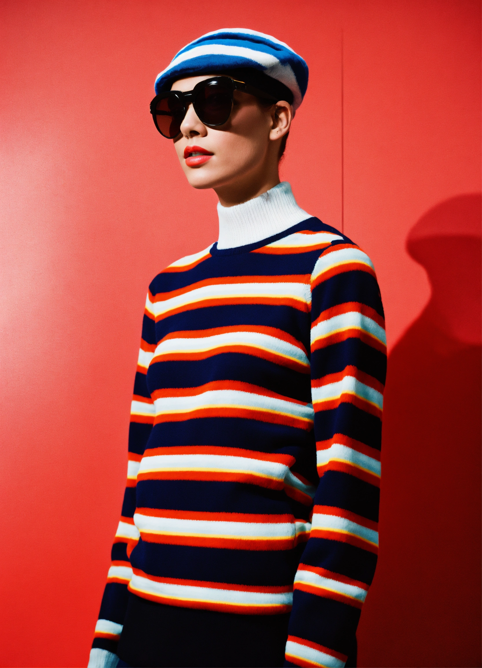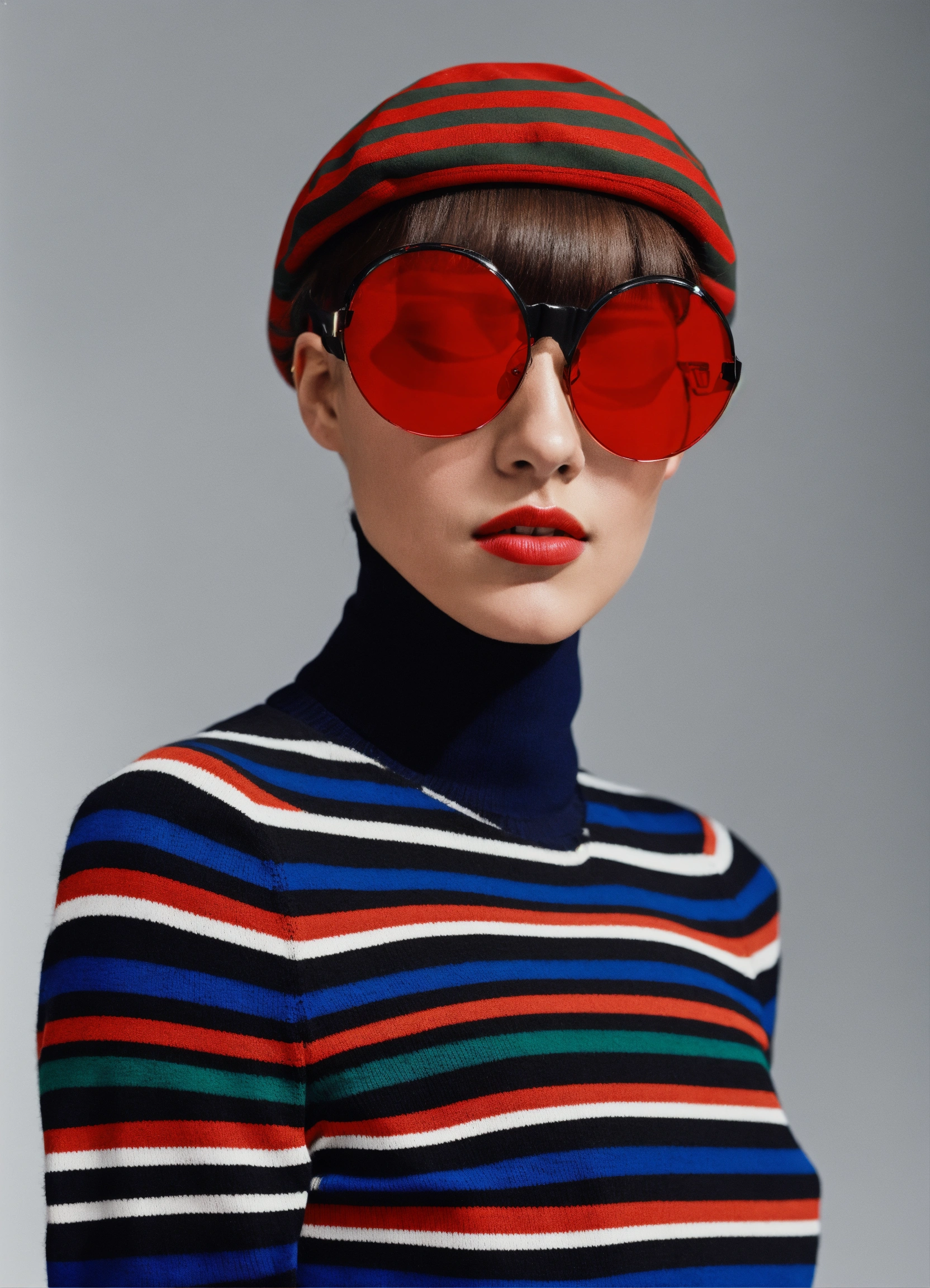 Front profile half body model show photography, in the psicodelic machine, a 50's beret, in a minimal large striped pattern pullover and large red sunglasses, futuris. issey miyake style degree view.